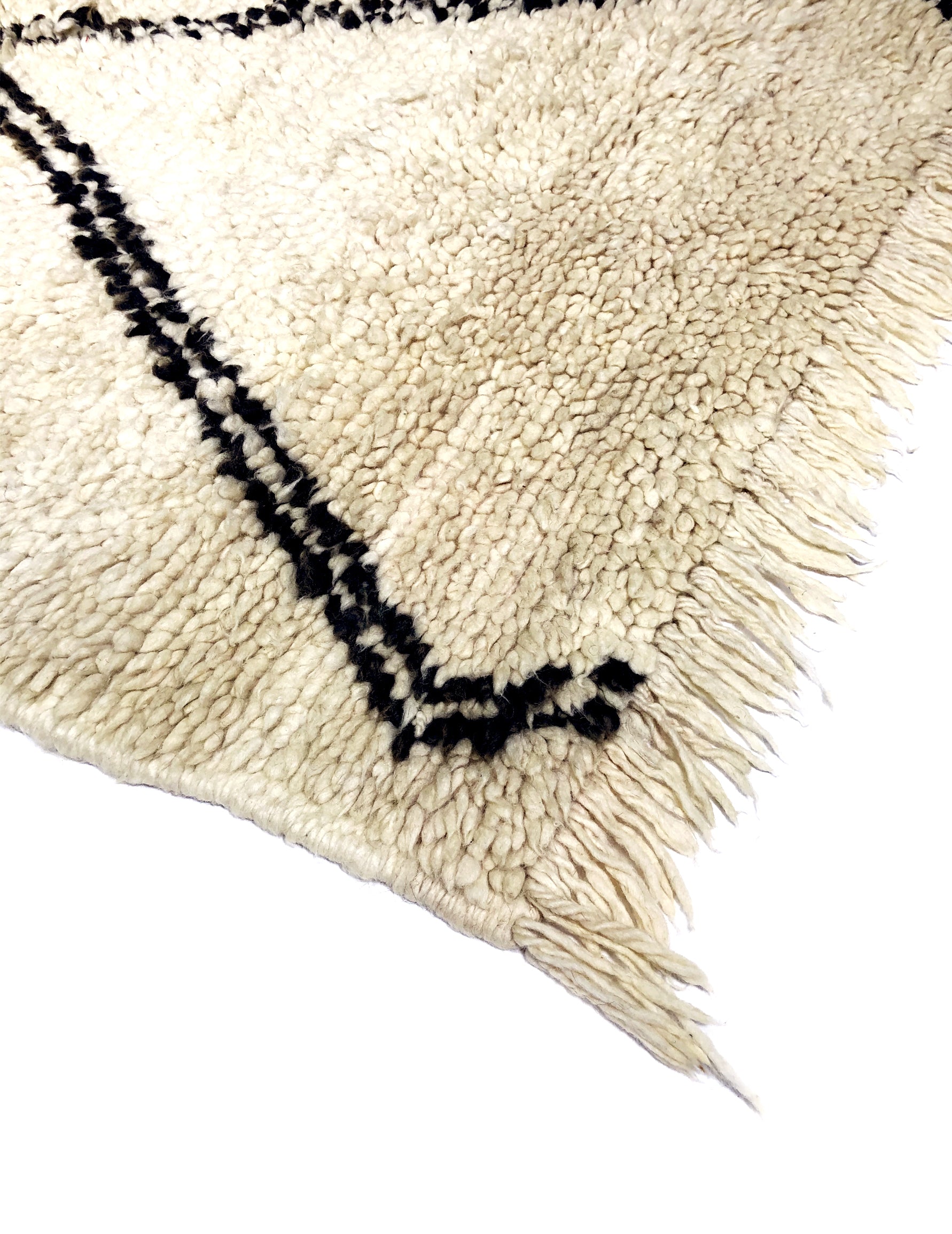 ベニワレンはモロッコのアトラス山脈に住むベルベル人女性によって、一目一目しっかりと結びながら織らているハンドメイドのウールラグです。白を基調とし黒の細いラインで模様が描かれています。触り心地はふわふわと柔らかく長い毛足が特徴です。白を基調としたシンプルなデザインとナチュラルな色合いは、コーディネートの幅も広く他のインテリアとも調和しやすいです。