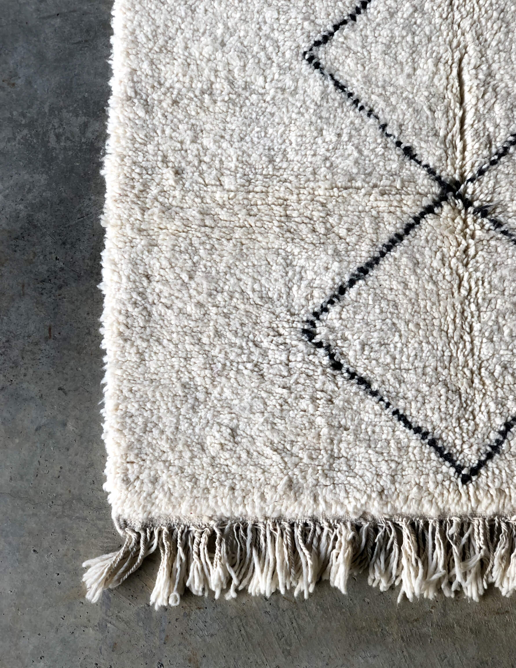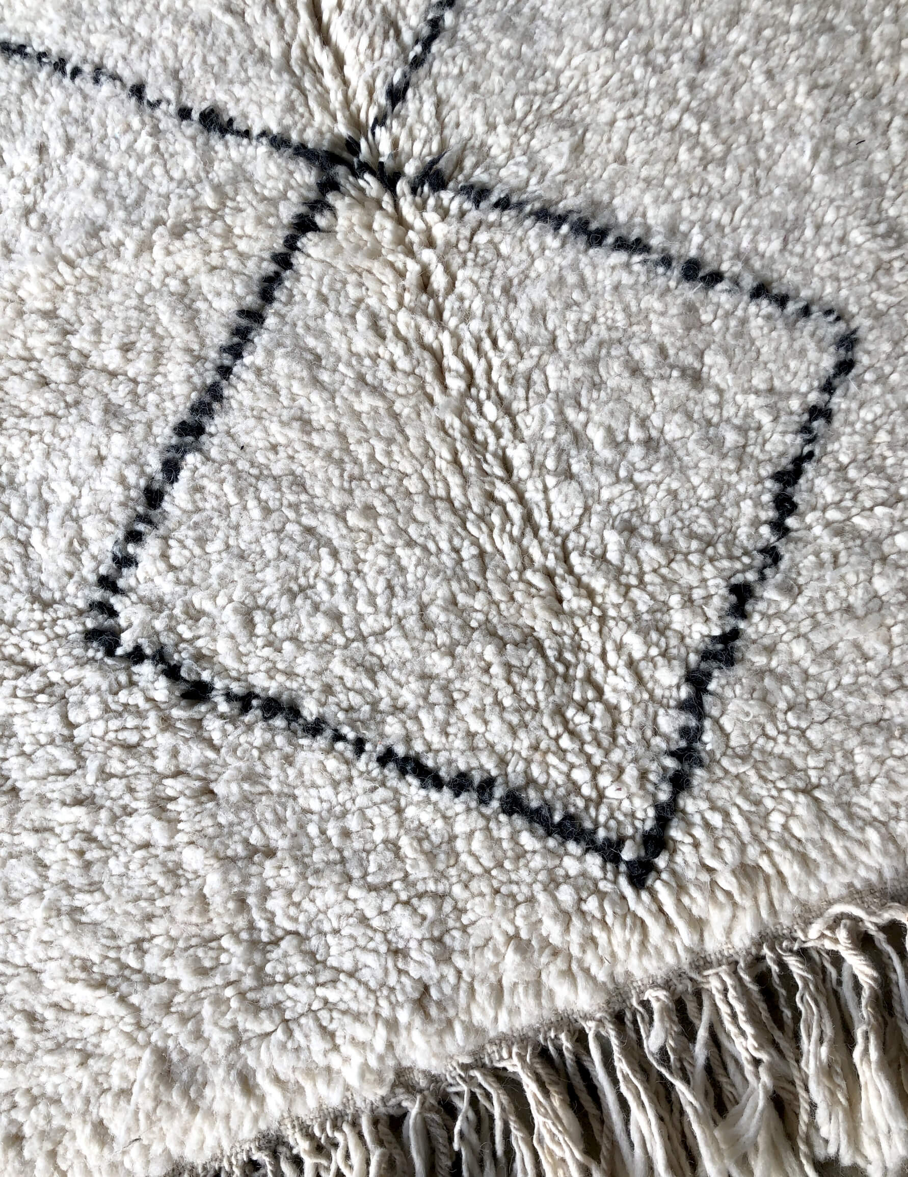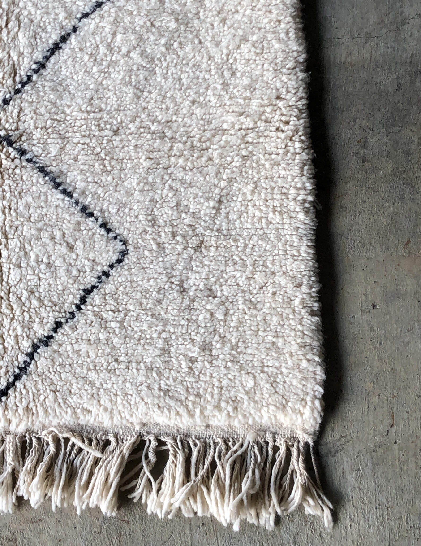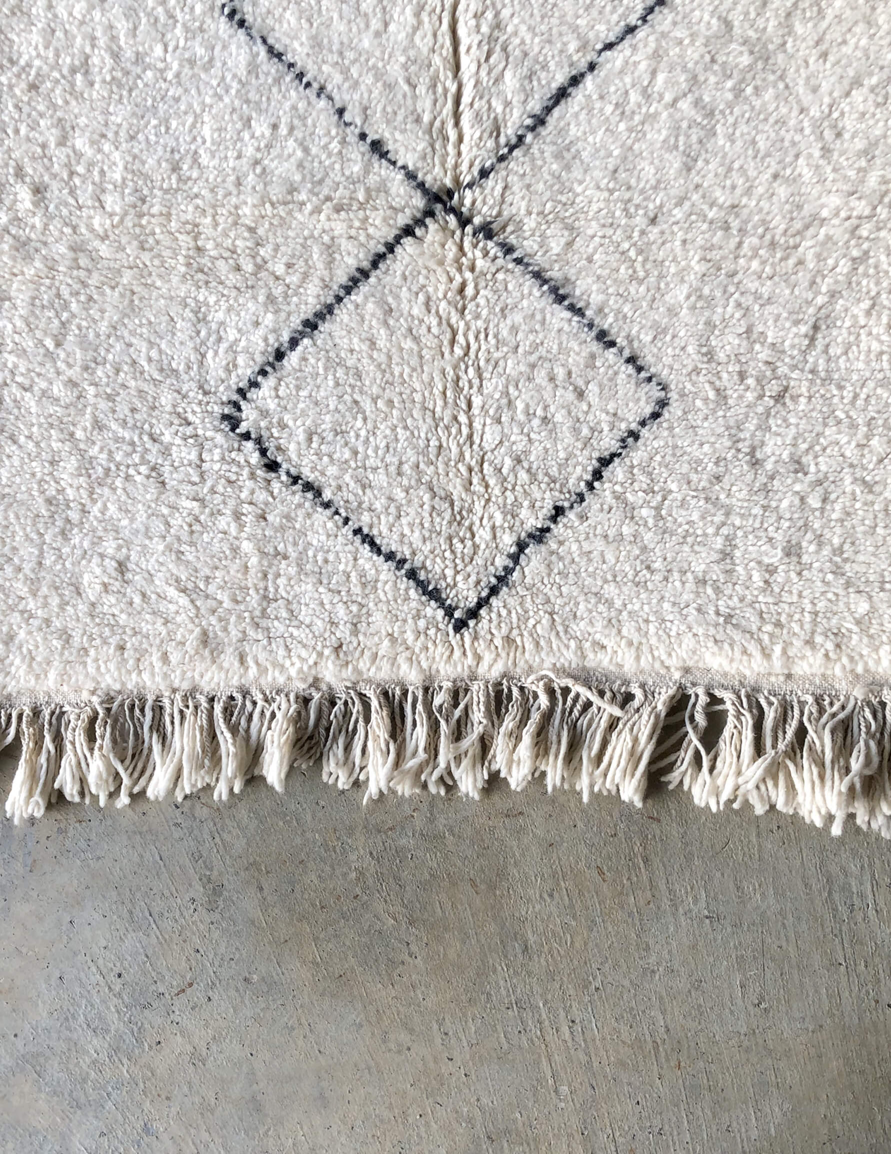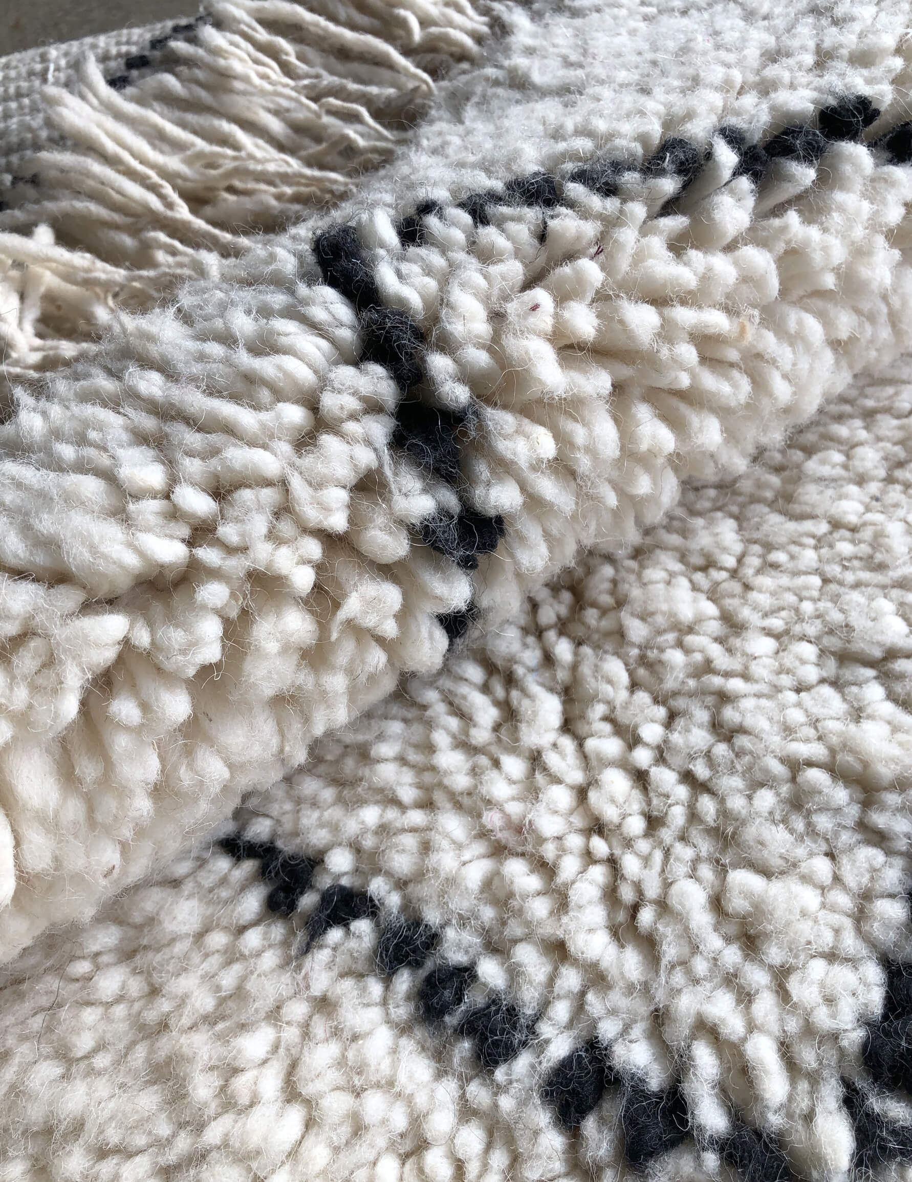 ベニワレンはモロッコのアトラス山脈に住むベルベル人女性によって、一目一目しっかりと結びながら織らているハンドメイドのウールラグです。白を基調とし黒の細いラインで模様が描かれています。触り心地はふわふわと柔らかく長い毛足が特徴です。白を基調としたシンプルなデザインとナチュラルな色合いは、コーディネートの幅も広く他のインテリアとも調和しやすいです。