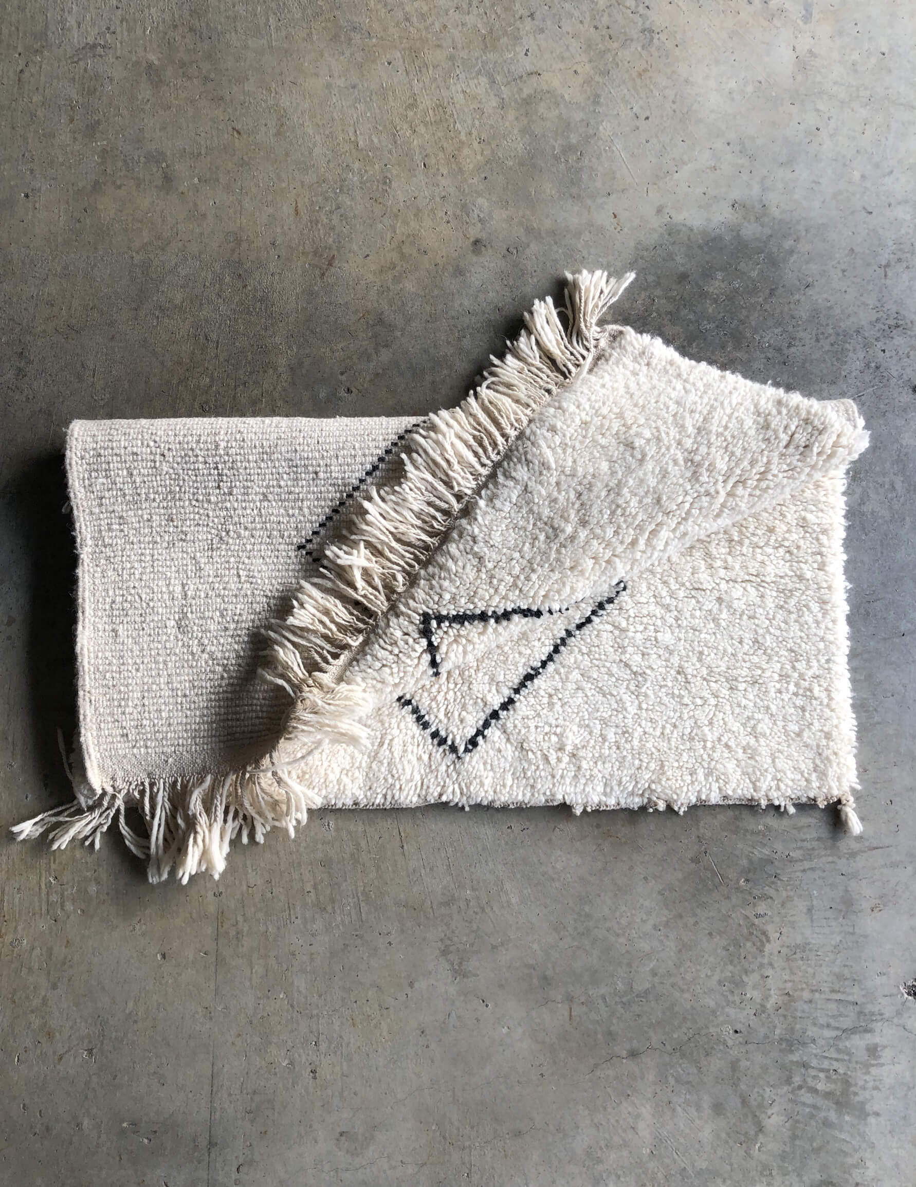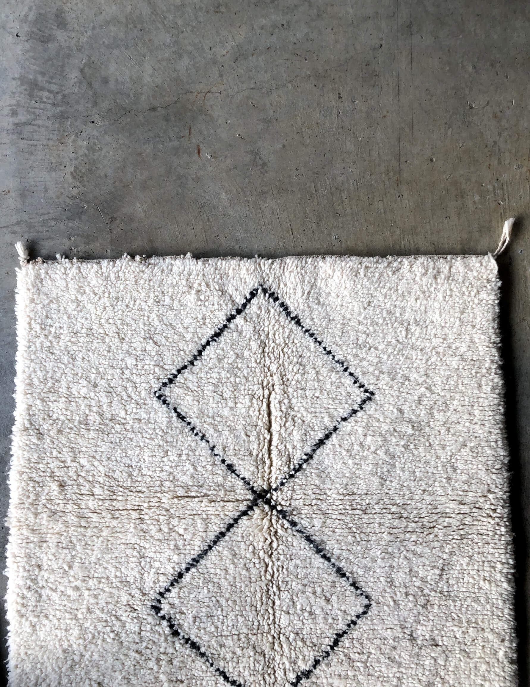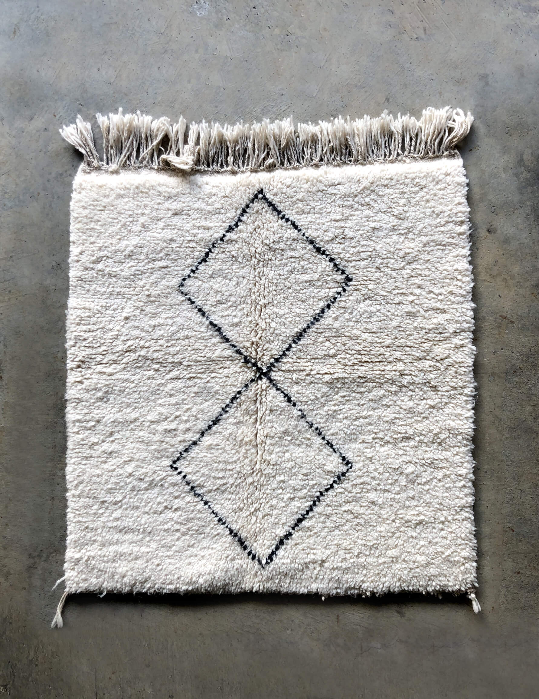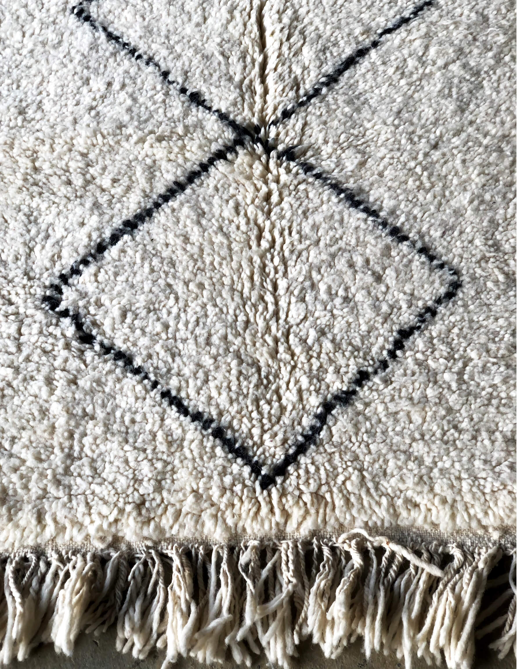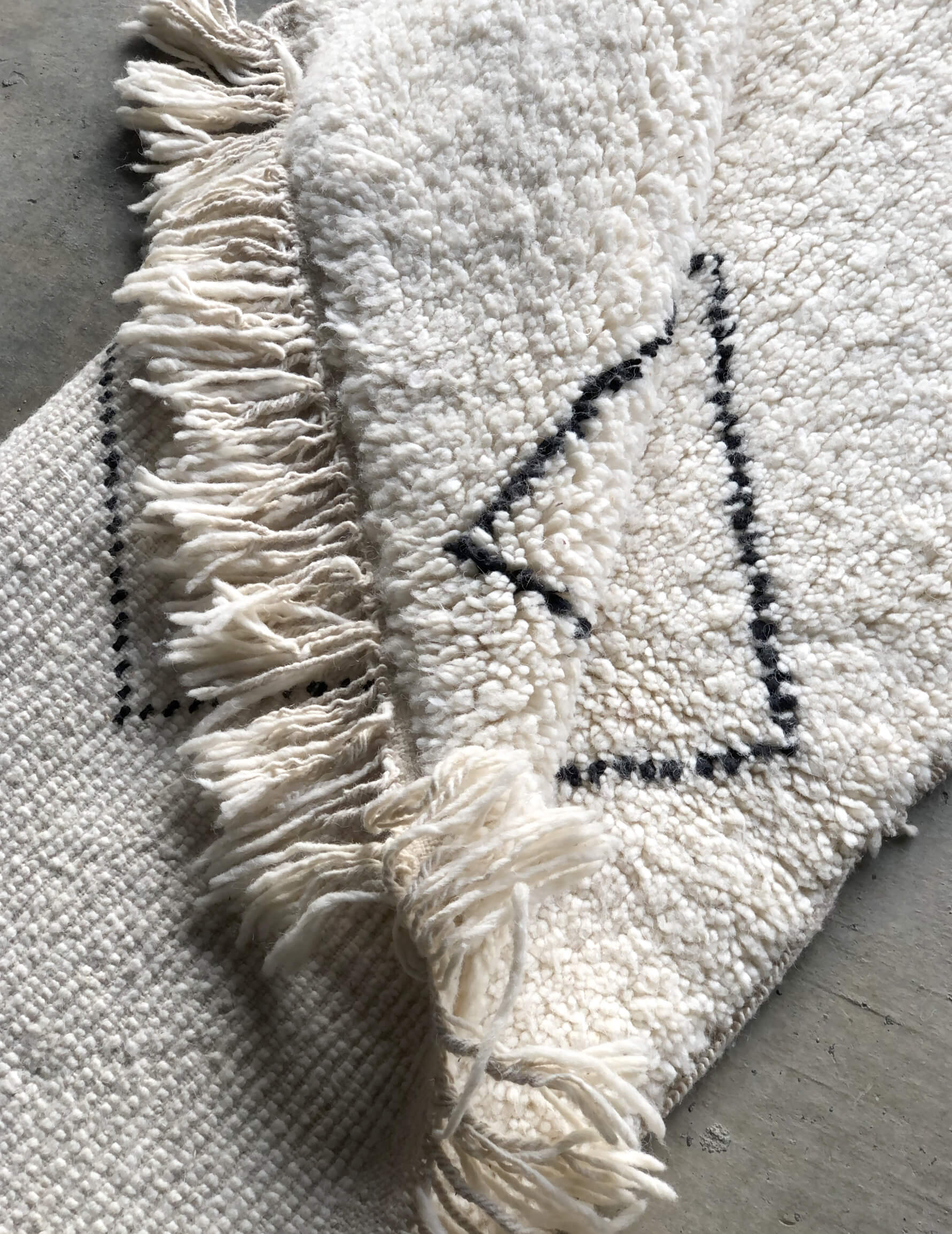ベニワレンはモロッコのアトラス山脈に住むベルベル人女性によって、一目一目しっかりと結びながら織らているハンドメイドのウールラグです。白を基調とし黒の細いラインで模様が描かれています。触り心地はふわふわと柔らかく長い毛足が特徴です。白を基調としたシンプルなデザインとナチュラルな色合いは、コーディネートの幅も広く他のインテリアとも調和しやすいです。
