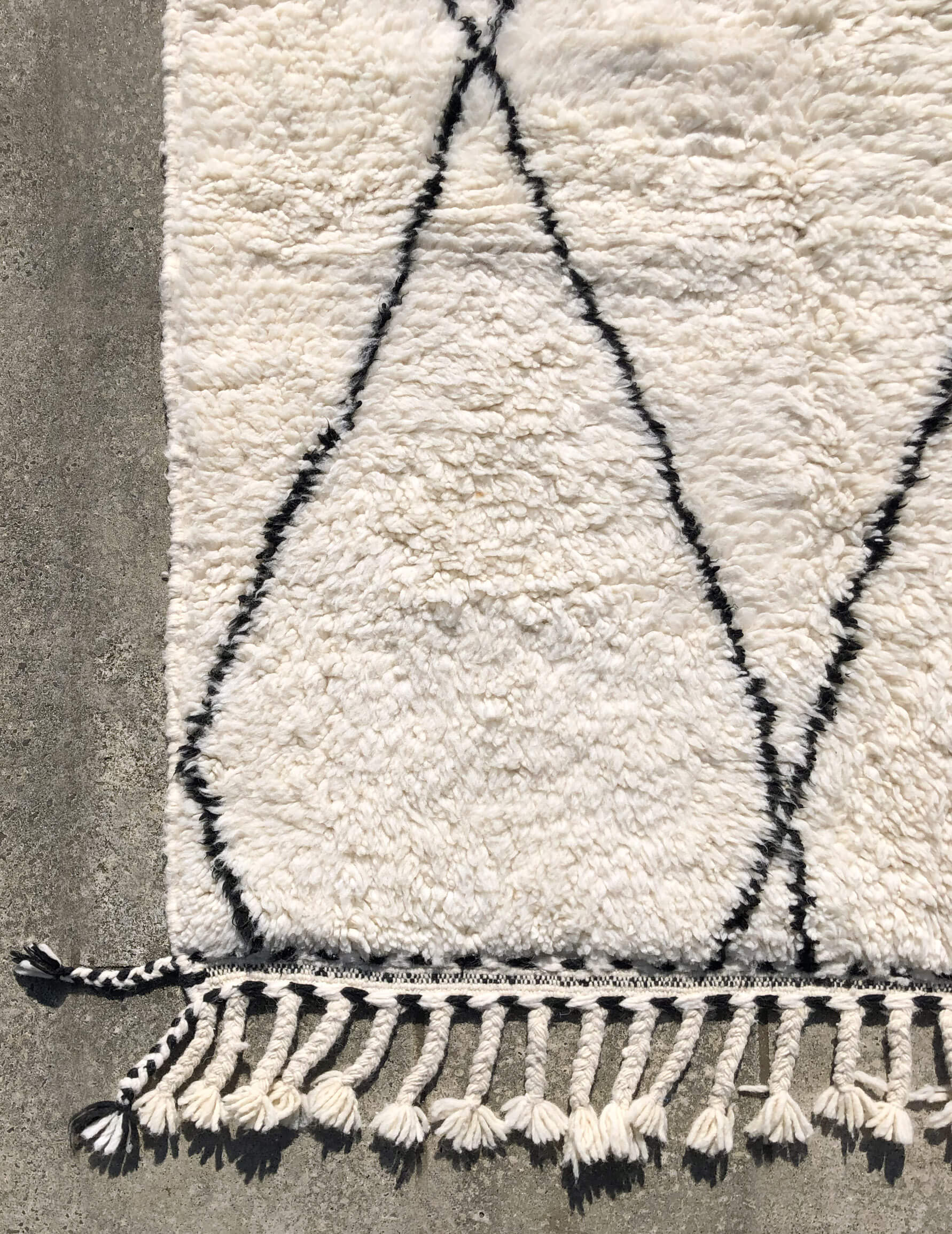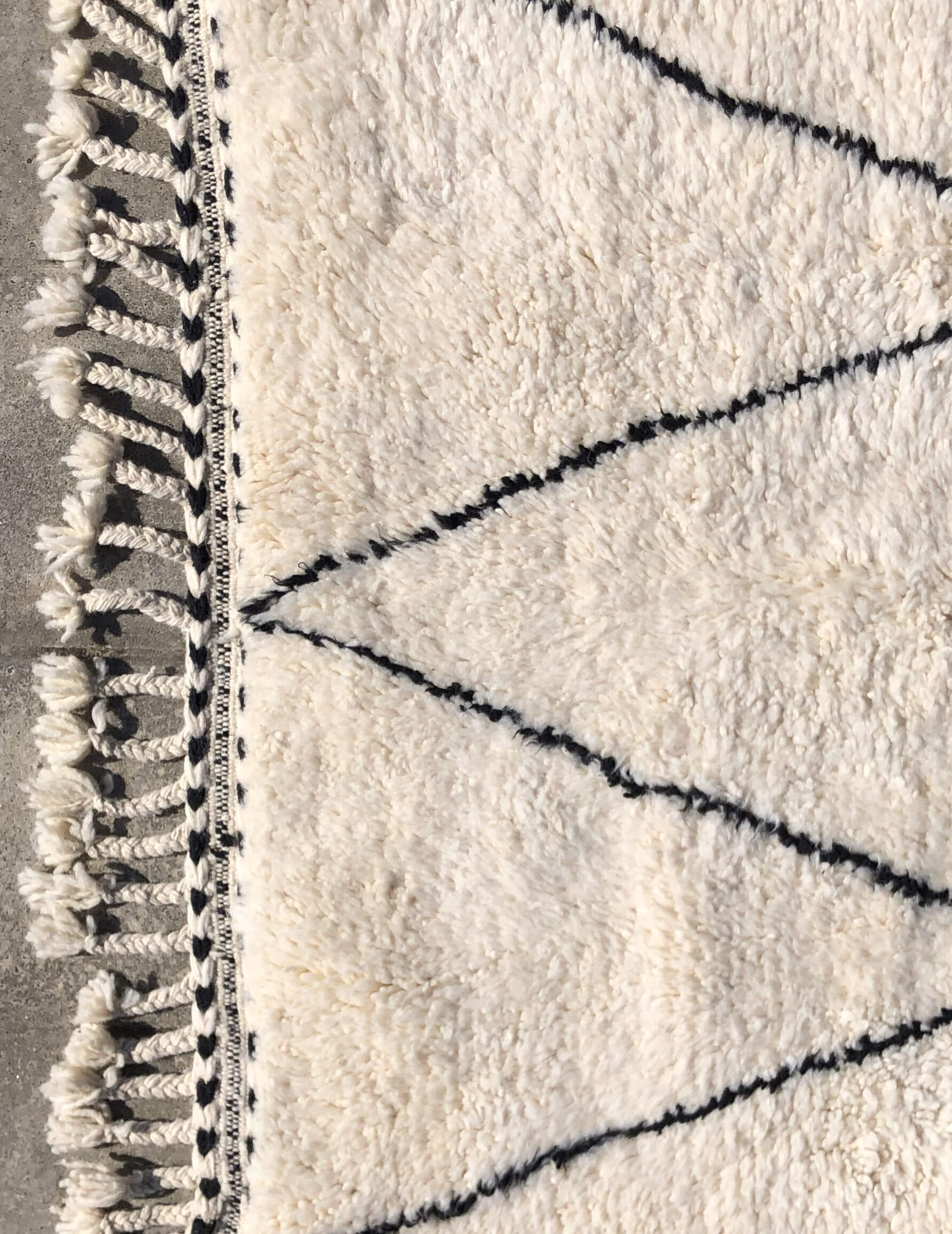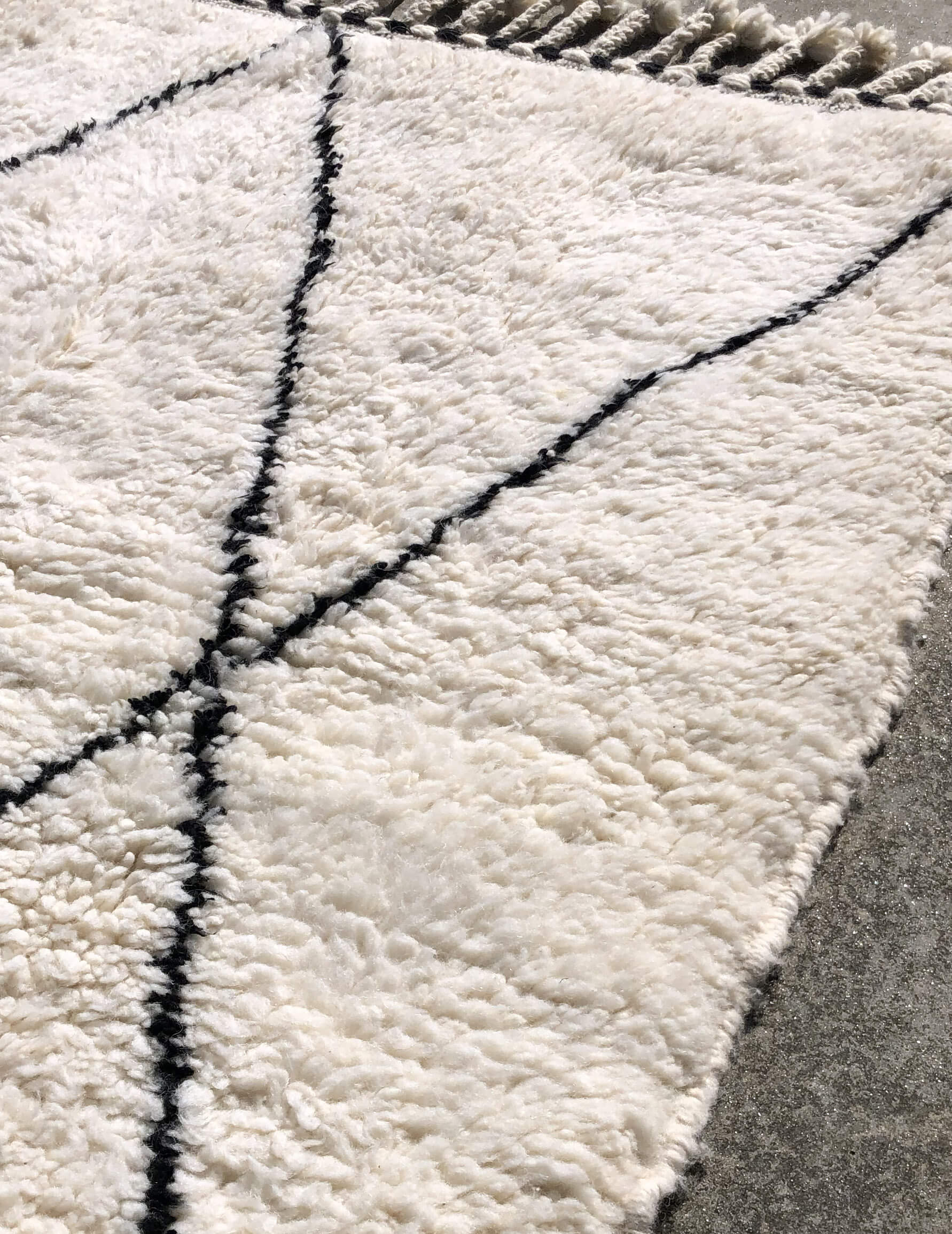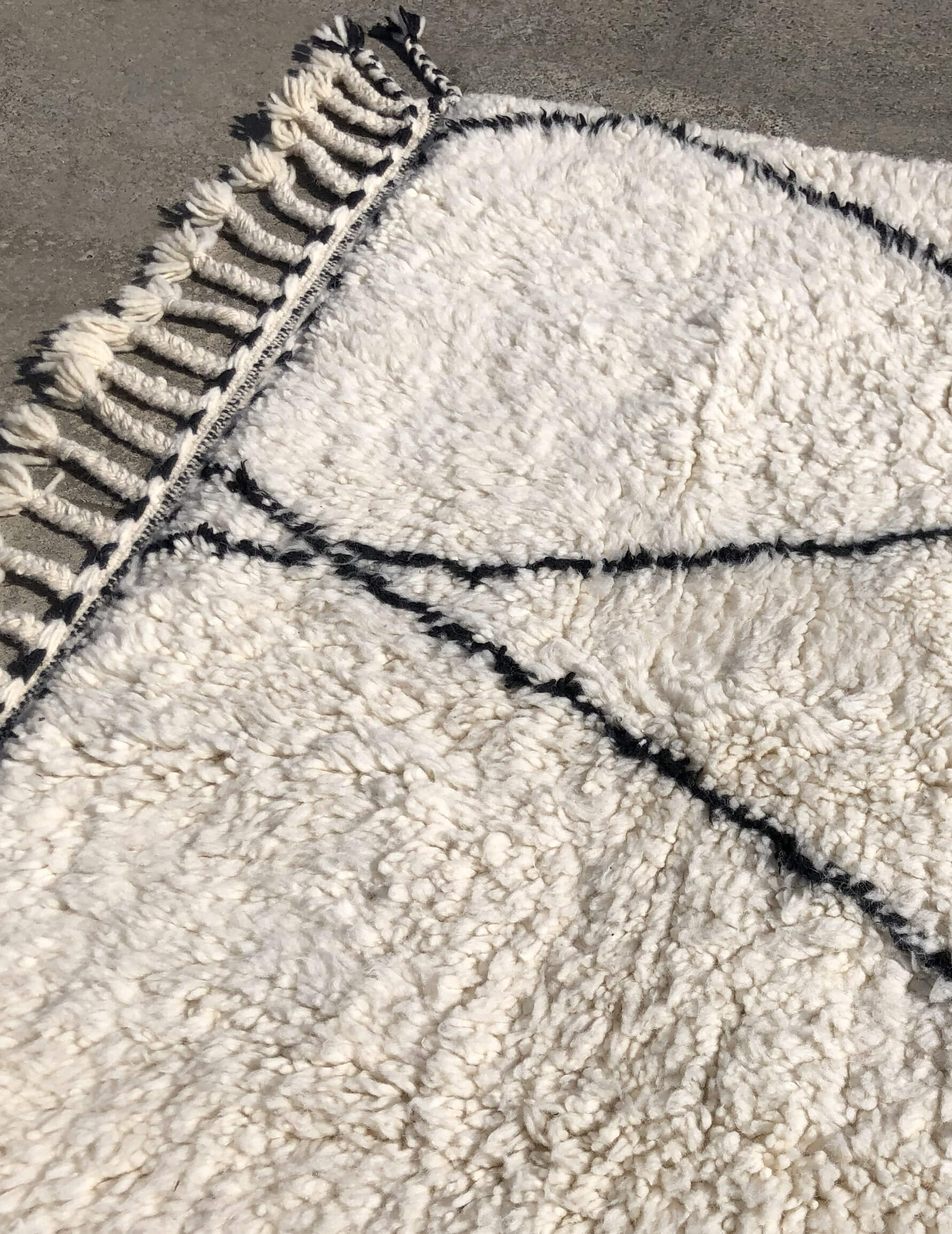 ベニワレンはモロッコのアトラス山脈に住むベルベル人女性によって、一目一目しっかりと結びながら織らているハンドメイドのウールラグです。白を基調とし黒の細いラインで模様が描かれています。触り心地はふわふわと柔らかく長い毛足が特徴です。白を基調としたシンプルなデザインとナチュラルな色合いは、コーディネートの幅も広く他のインテリアとも調和しやすいです。