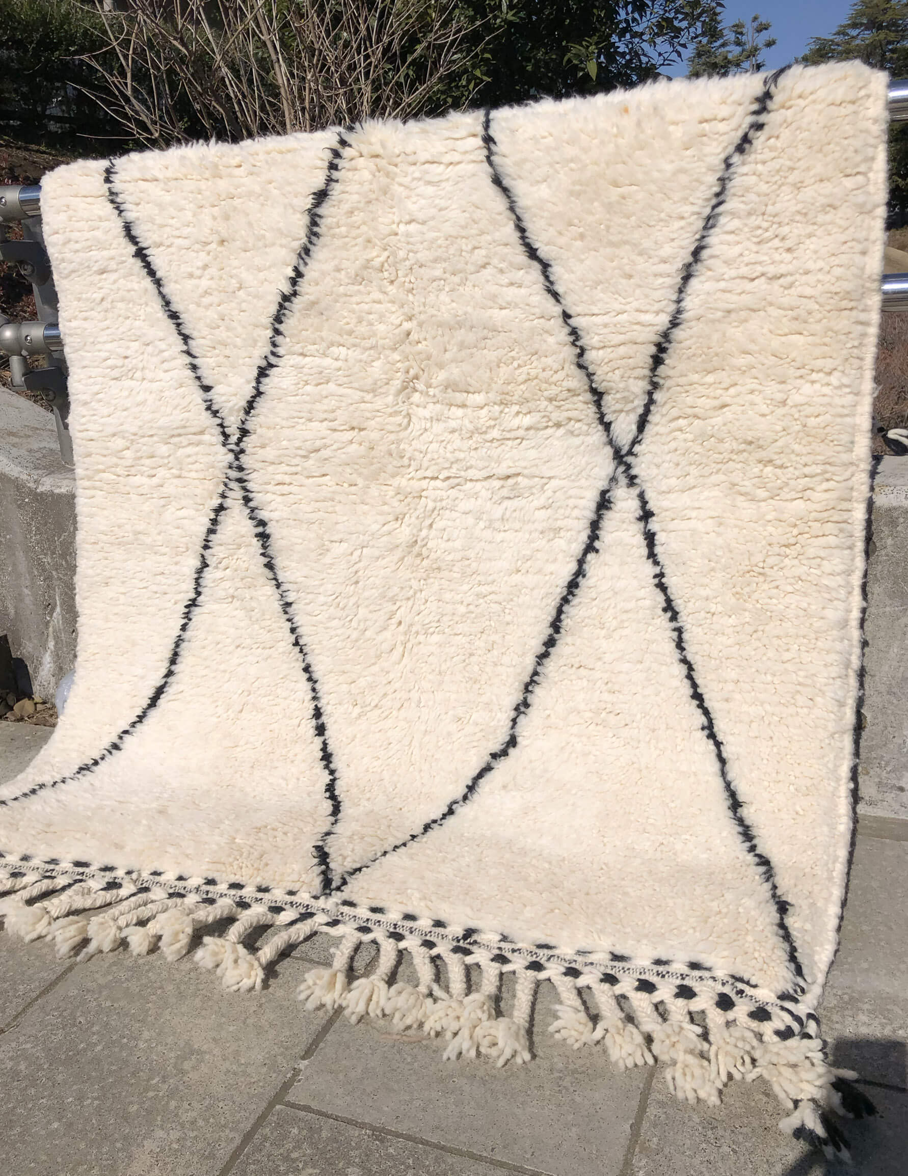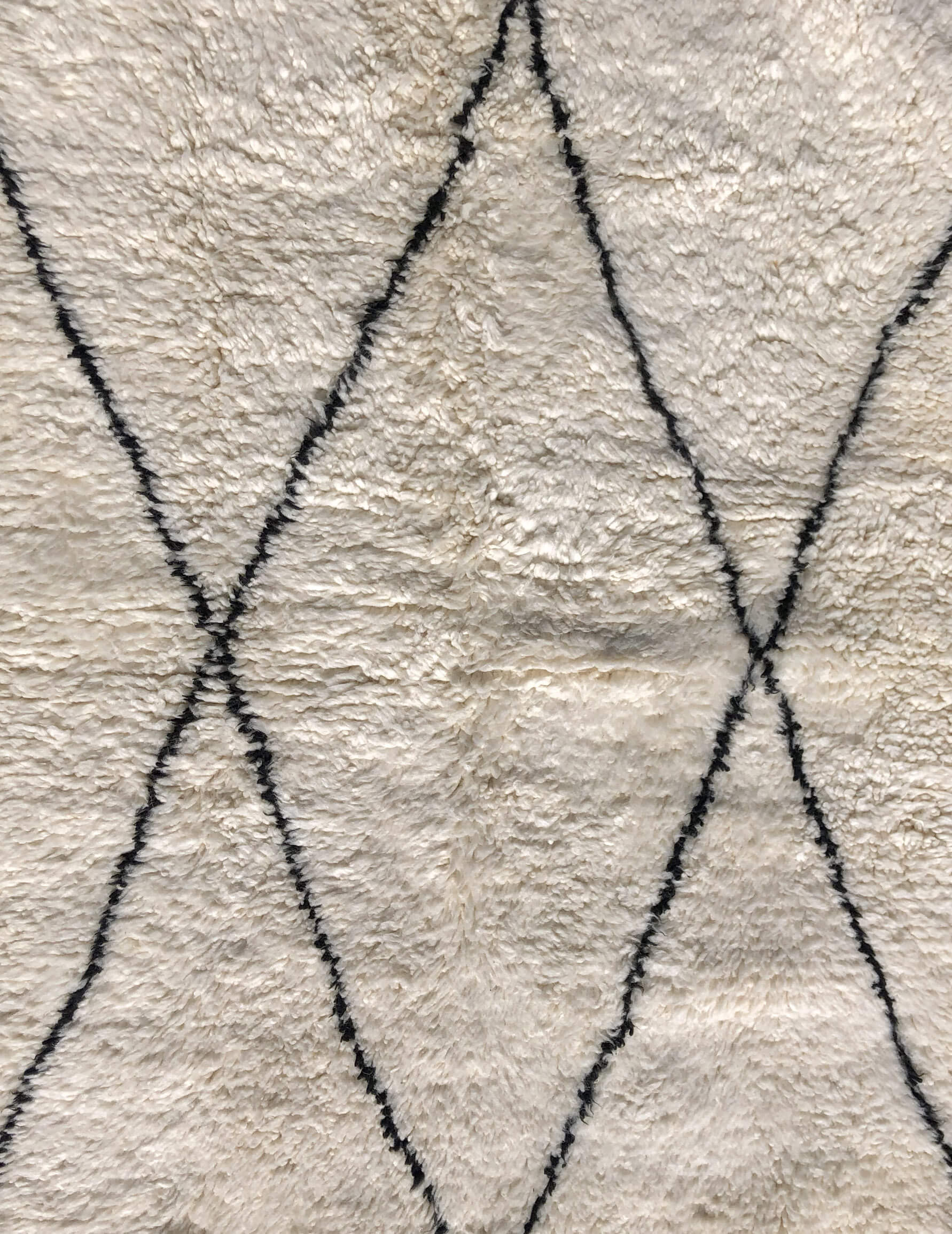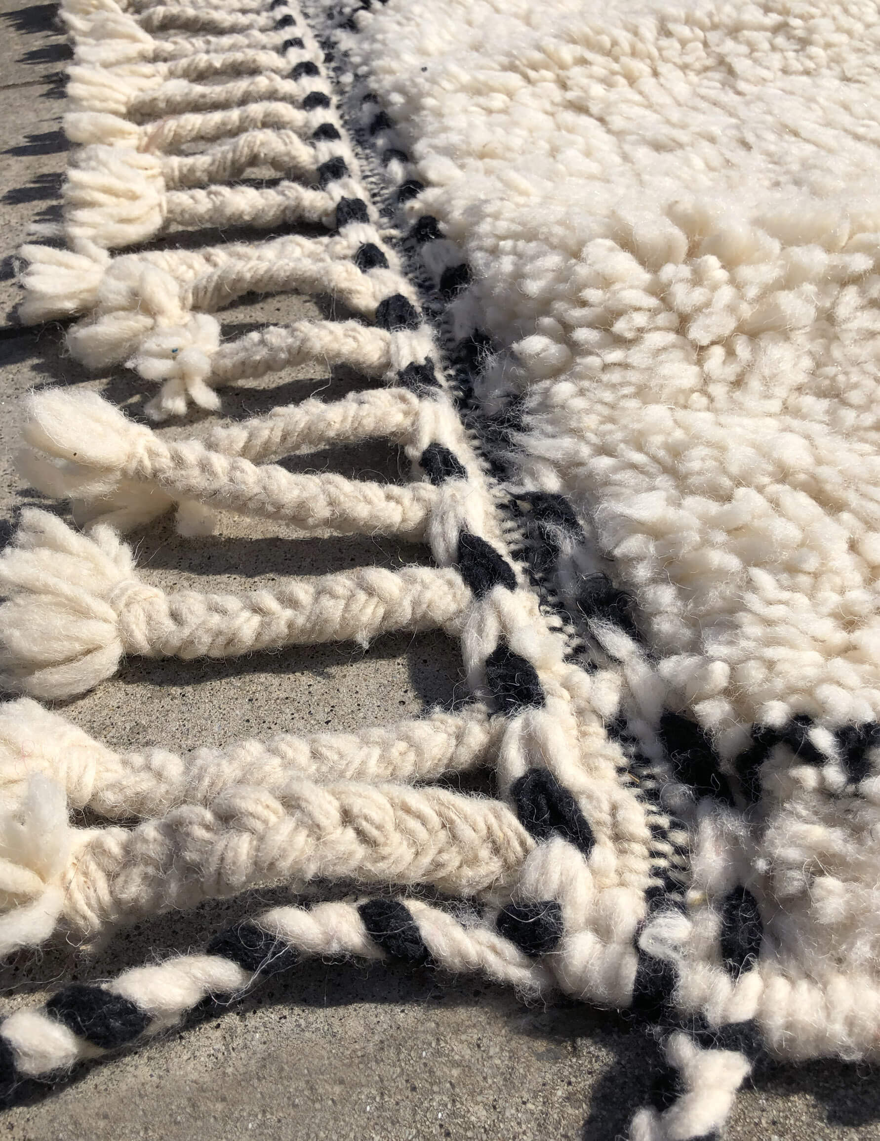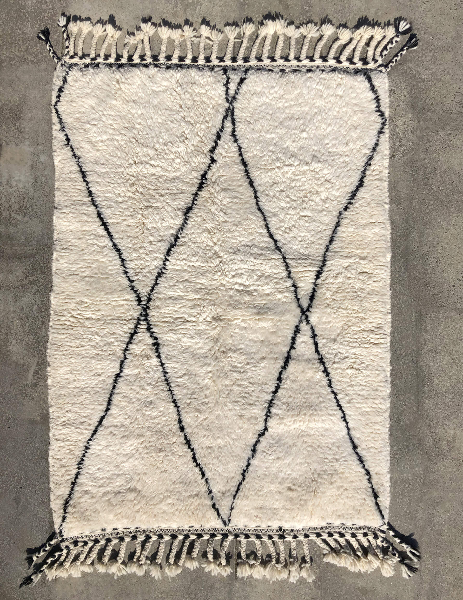 ベニワレンはモロッコのアトラス山脈に住むベルベル人女性によって、一目一目しっかりと結びながら織らているハンドメイドのウールラグです。白を基調とし黒の細いラインで模様が描かれています。触り心地はふわふわと柔らかく長い毛足が特徴です。白を基調としたシンプルなデザインとナチュラルな色合いは、コーディネートの幅も広く他のインテリアとも調和しやすいです。
