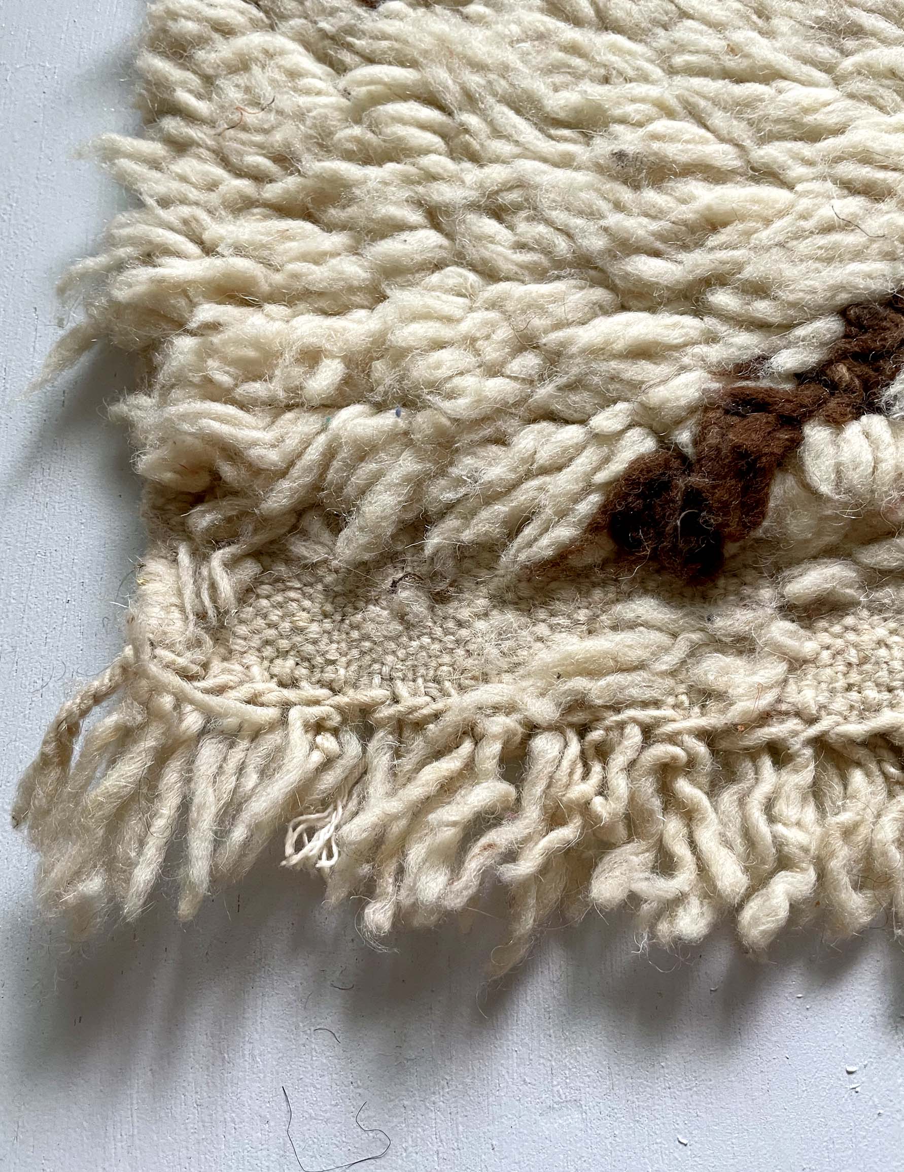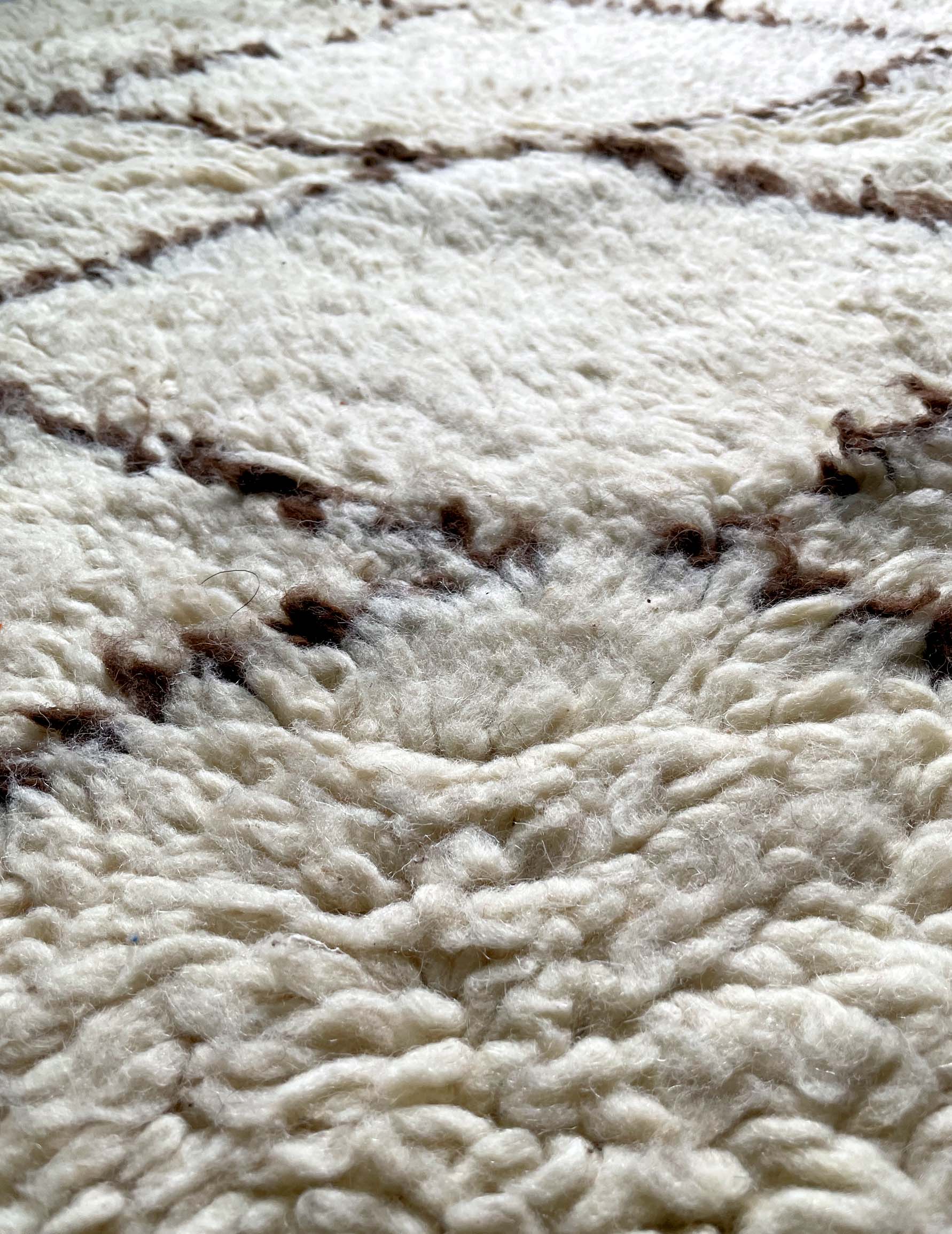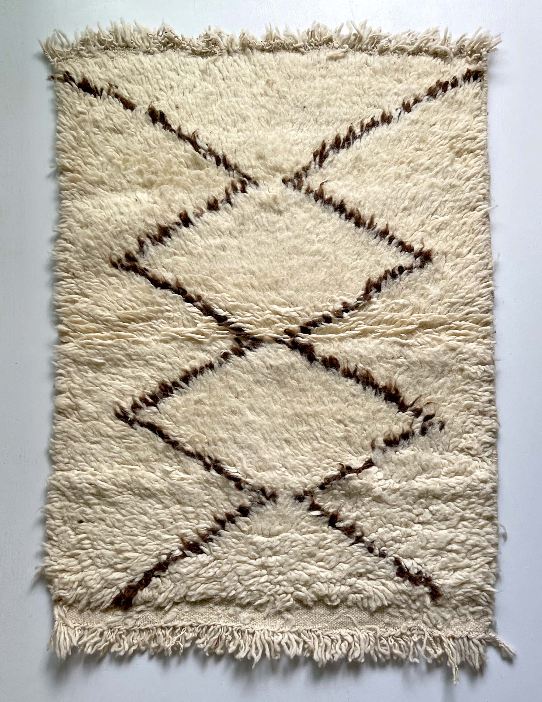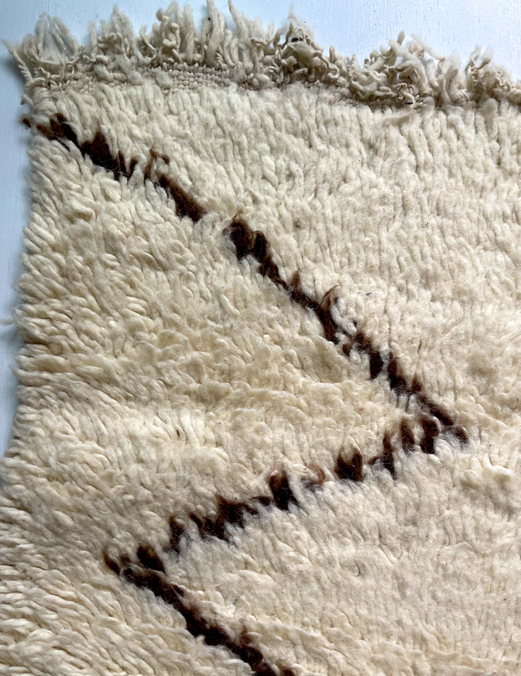 ベニワレンはモロッコのアトラス山脈に住むベルベル人女性によって、一目一目しっかりと結びながら織らているハンドメイドのウールラグです。白を基調とし黒の細いラインで模様が描かれています。触り心地はふわふわと柔らかく長い毛足が特徴です。白を基調としたシンプルなデザインとナチュラルな色合いは、コーディネートの幅も広く他のインテリアとも調和しやすいです。