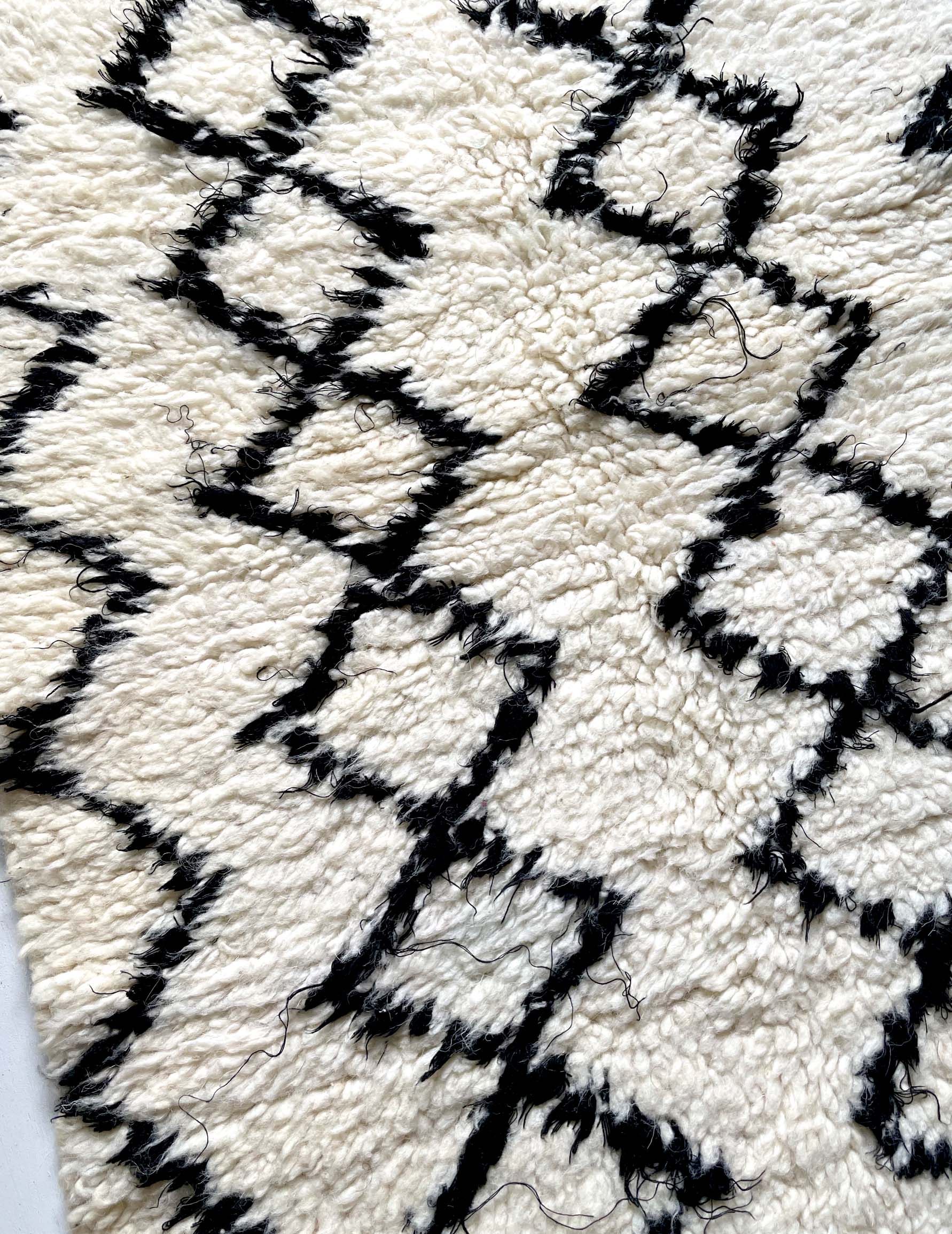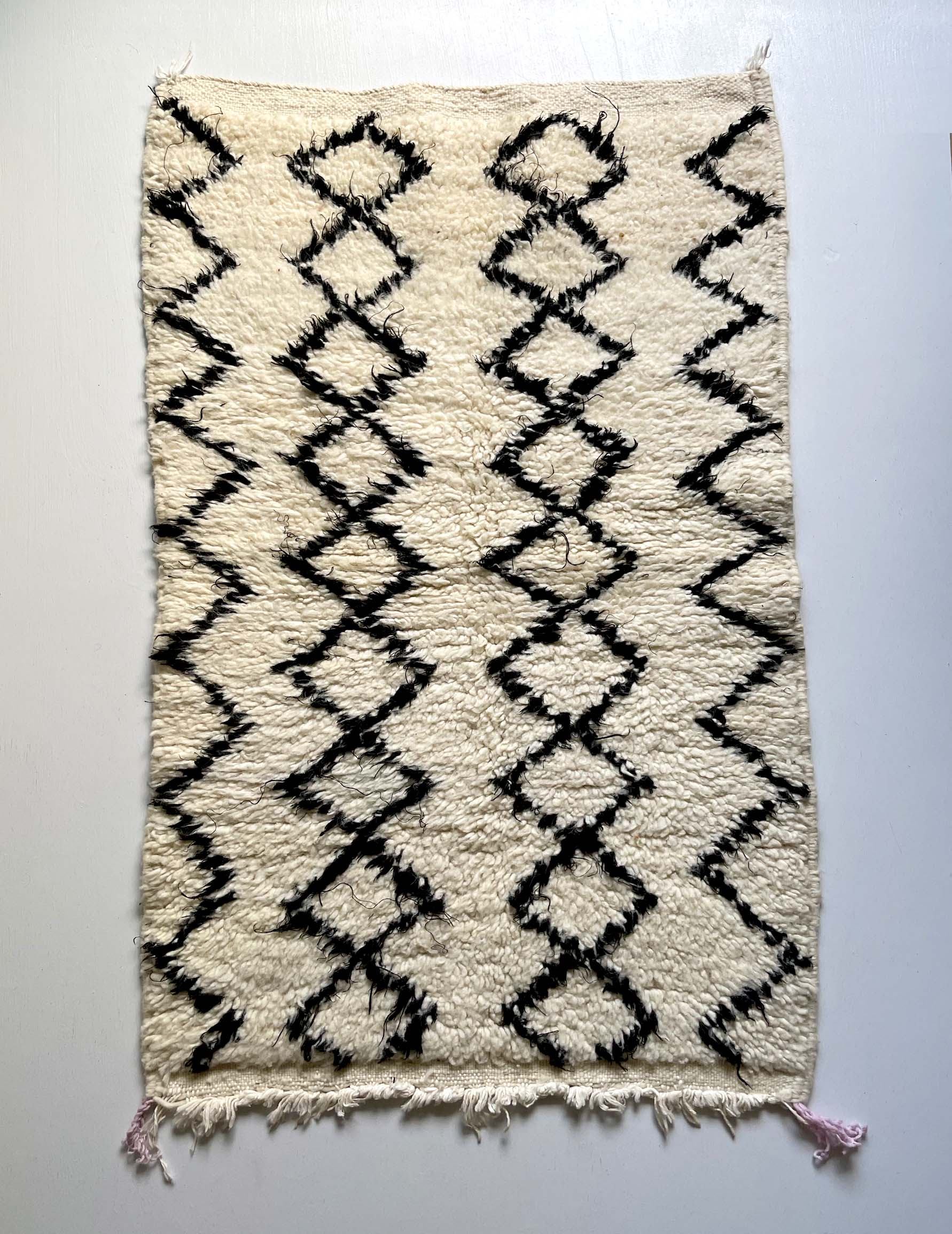 ベニワレンはモロッコのアトラス山脈に住むベルベル人女性によって、一目一目しっかりと結びながら織らているハンドメイドのウールラグです。白を基調とし黒の細いラインで模様が描かれています。触り心地はふわふわと柔らかく長い毛足が特徴です。白を基調としたシンプルなデザインとナチュラルな色合いは、コーディネートの幅も広く他のインテリアとも調和しやすいです。