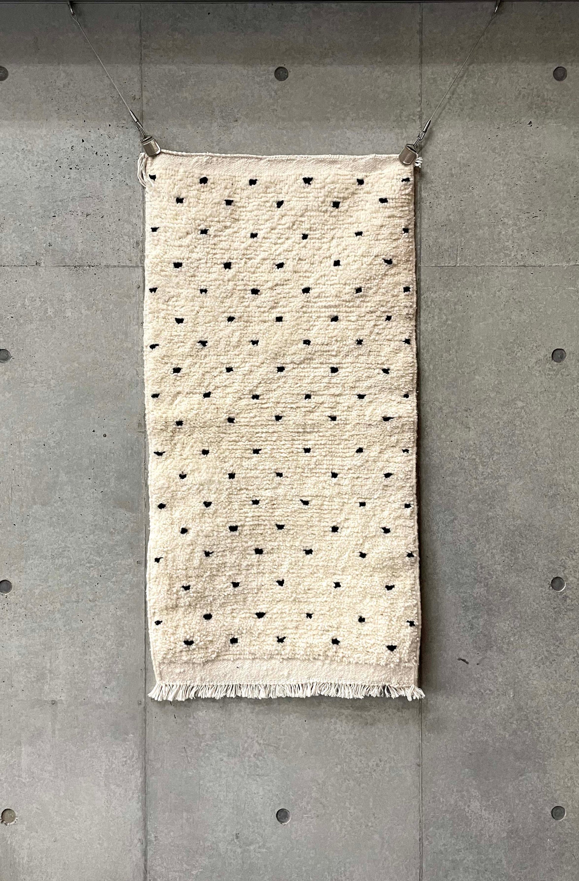 ベニワレンはモロッコのアトラス山脈に住むベルベル人女性によって、一目一目しっかりと結びながら織らているハンドメイドのウールラグです。白を基調とし黒の細いラインで模様が描かれています。触り心地はふわふわと柔らかく長い毛足が特徴です。白を基調としたシンプルなデザインとナチュラルな色合いは、コーディネートの幅も広く他のインテリアとも調和しやすいです。