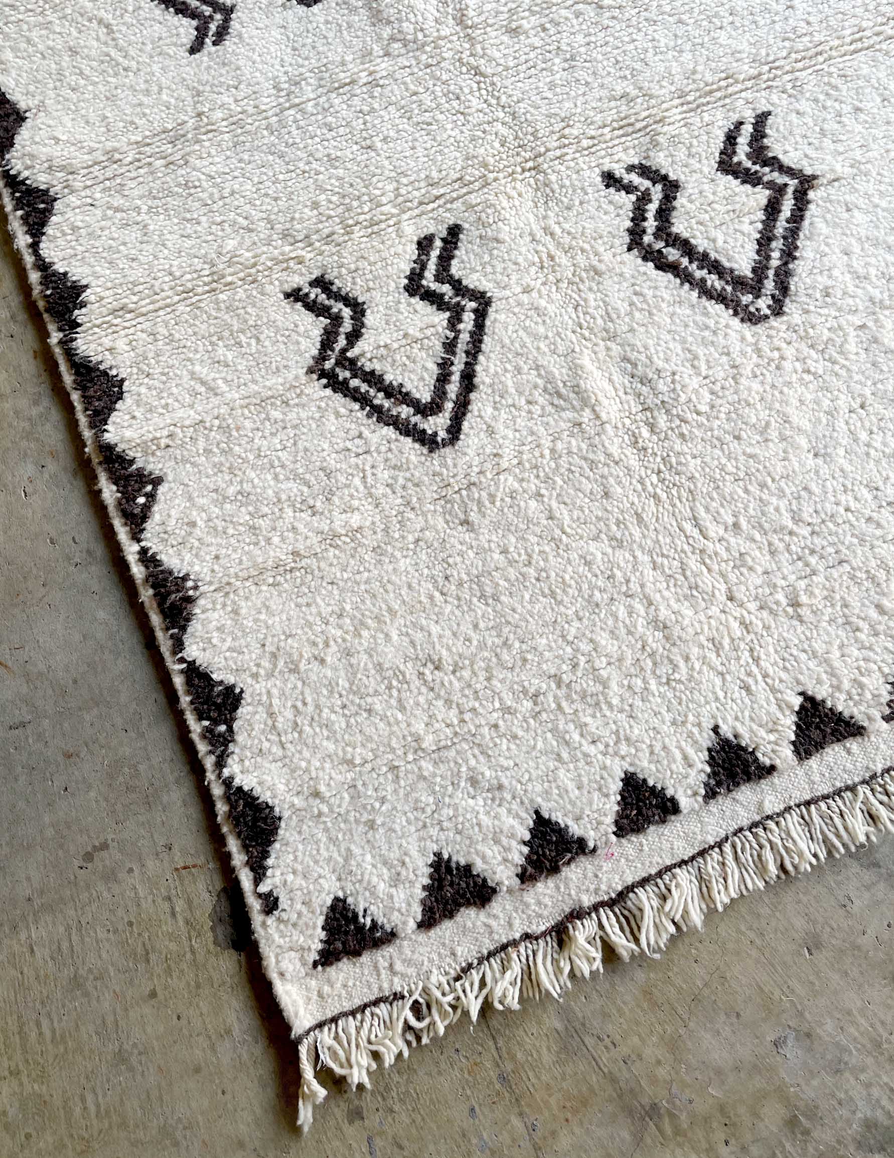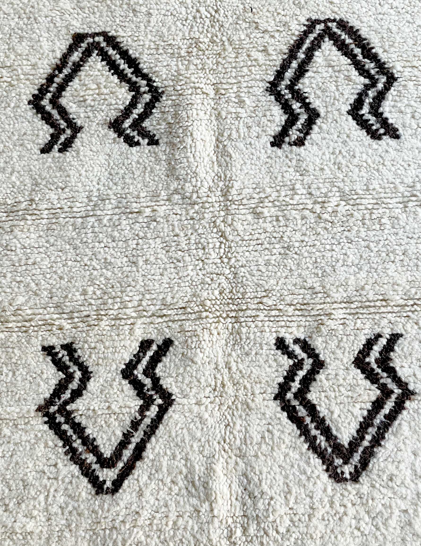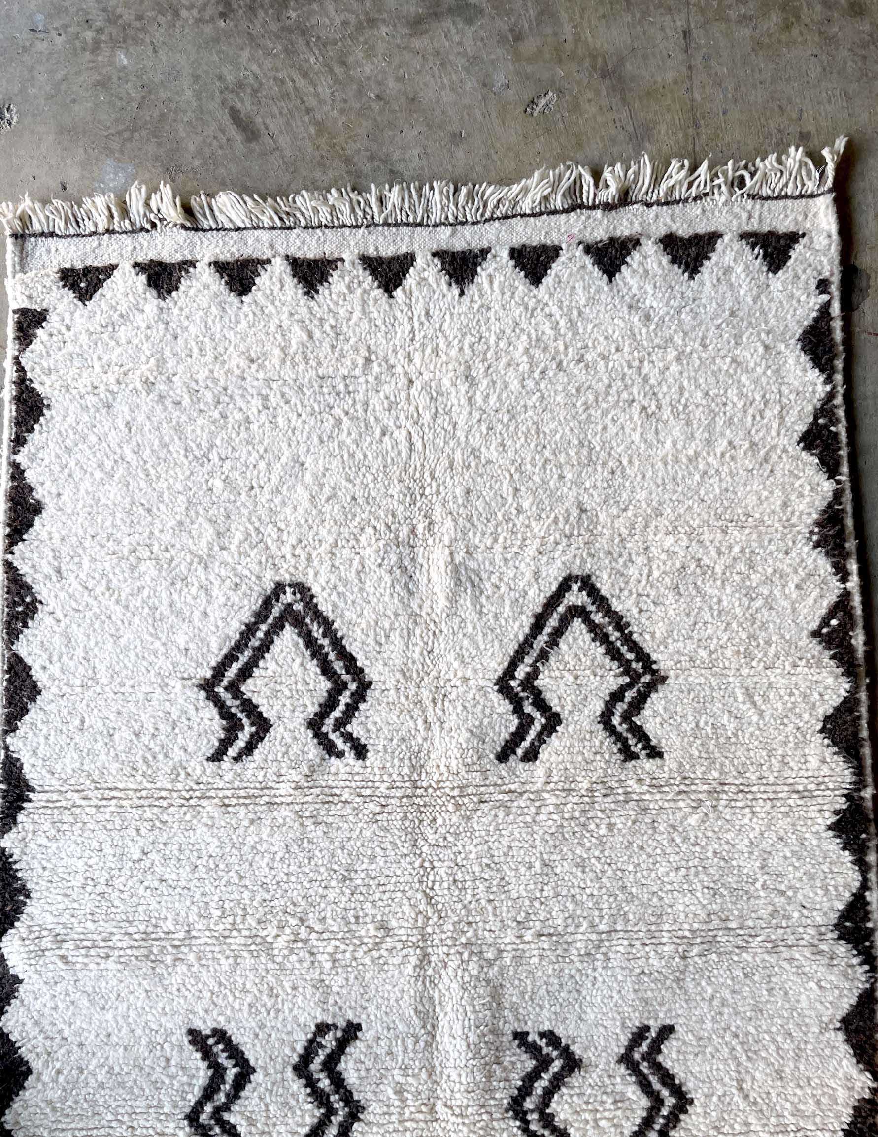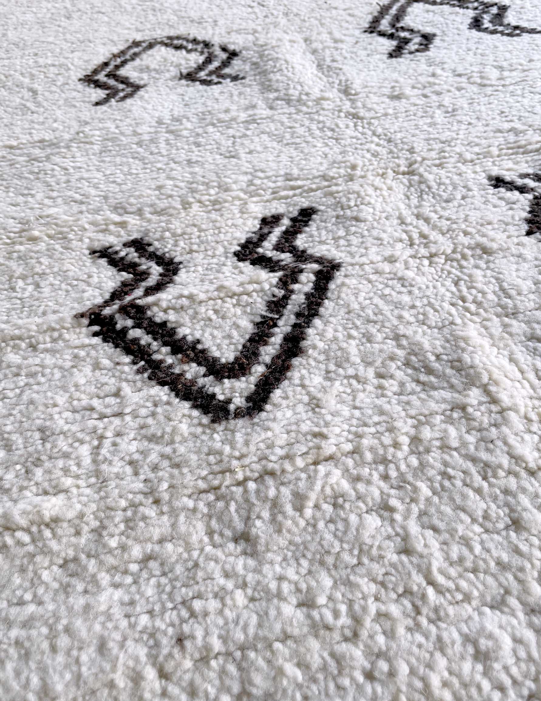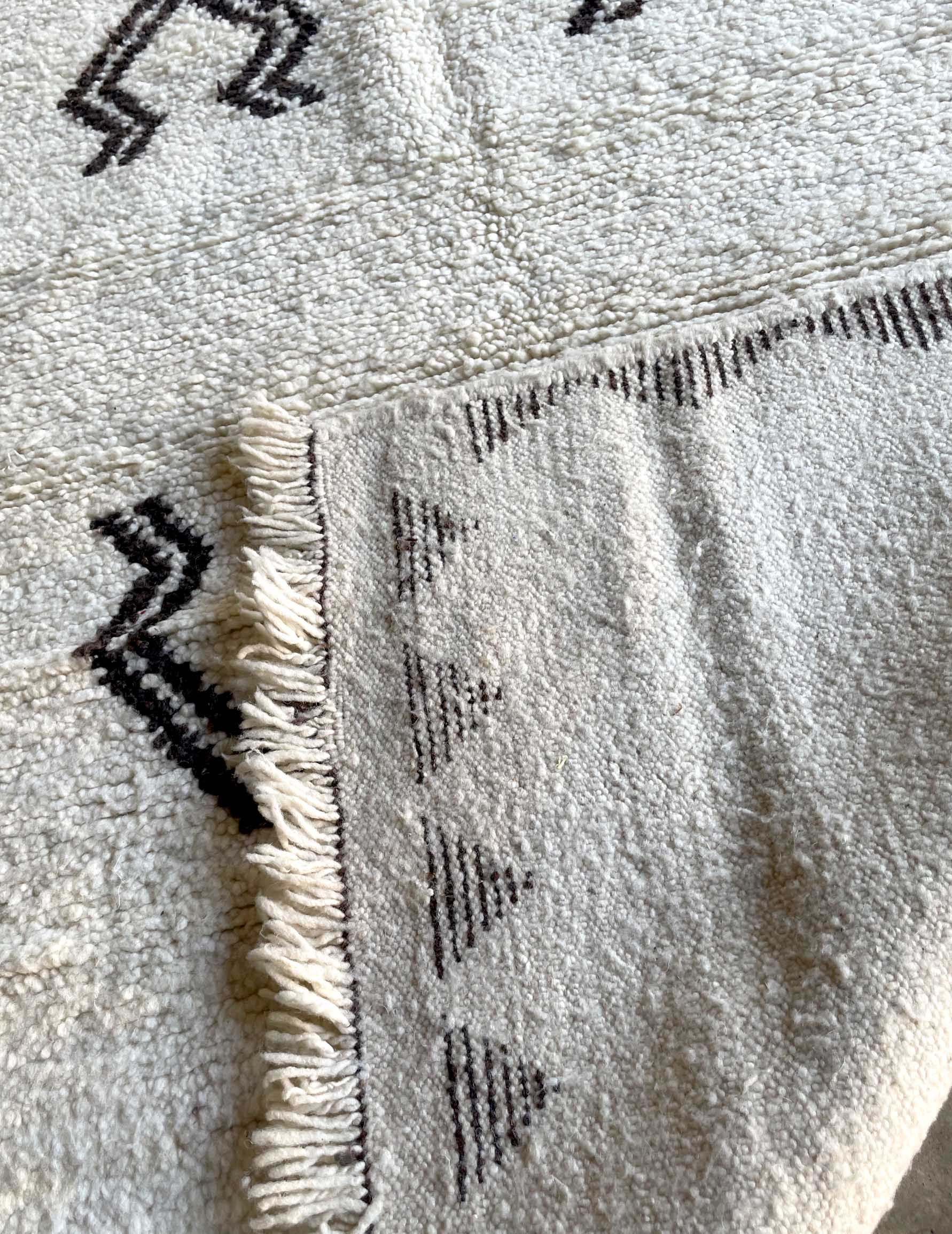 ベニワレンはモロッコのアトラス山脈に住むベルベル人女性によって、一目一目しっかりと結びながら織らているハンドメイドのウールラグです。白を基調とし黒の細いラインで模様が描かれています。触り心地はふわふわと柔らかく長い毛足が特徴です。白を基調としたシンプルなデザインとナチュラルな色合いは、コーディネートの幅も広く他のインテリアとも調和しやすいです。