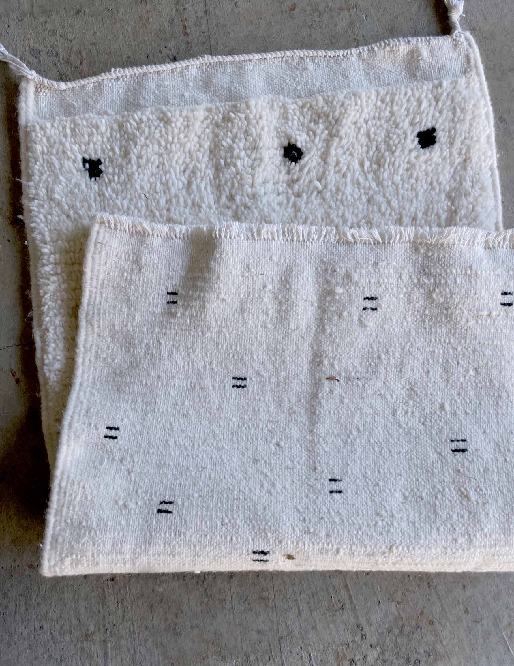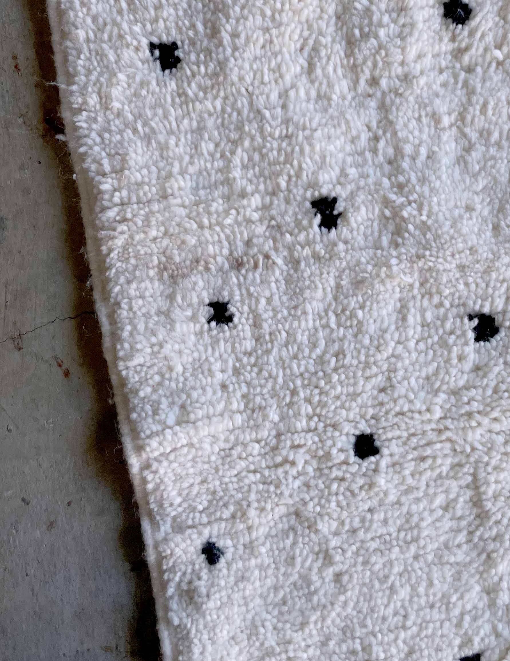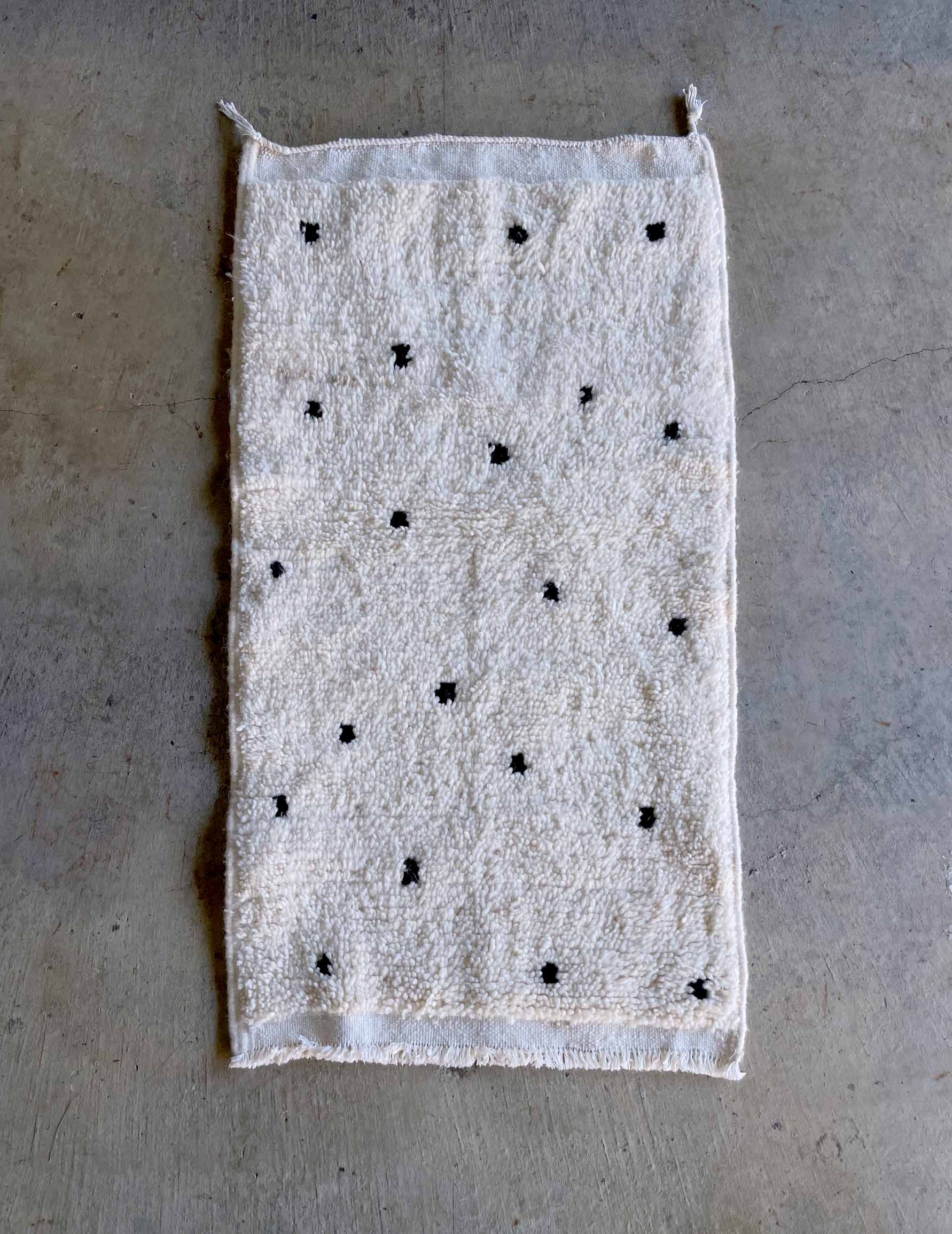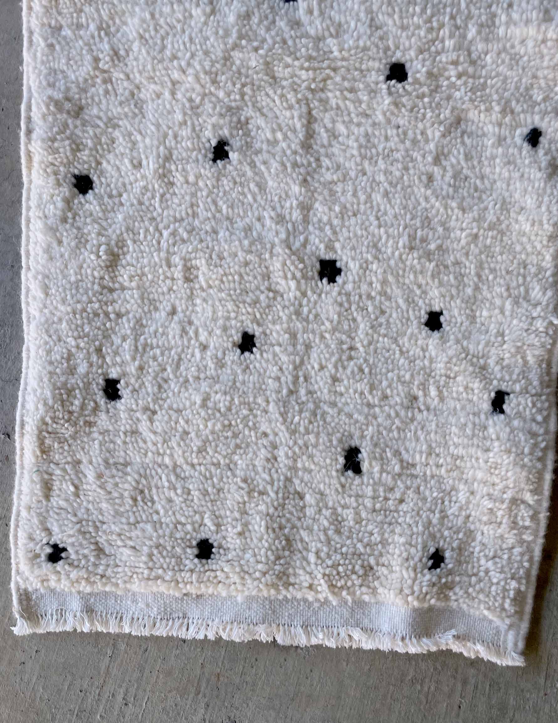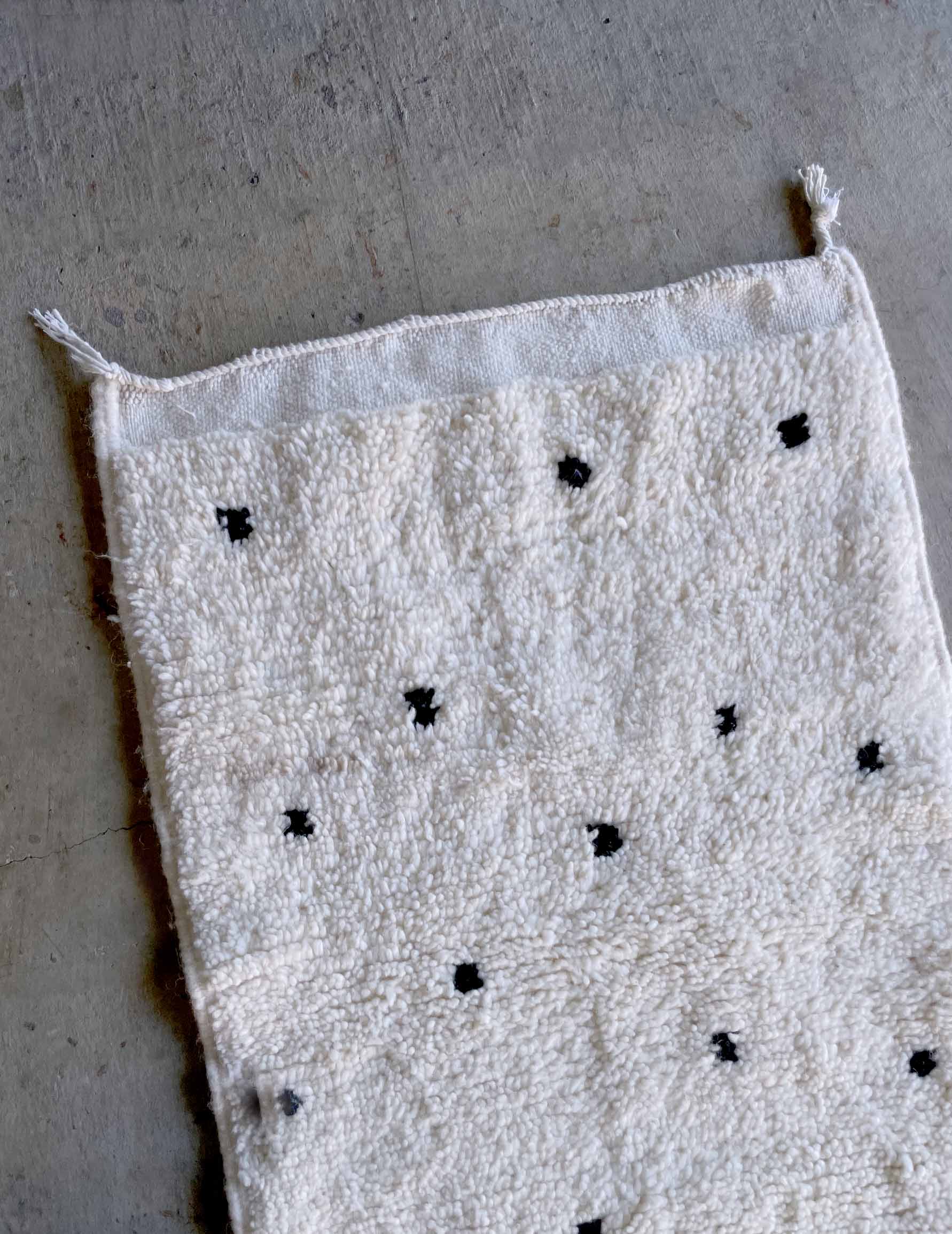 ベニワレンはモロッコのアトラス山脈に住むベルベル人女性によって、一目一目しっかりと結びながら織らているハンドメイドのウールラグです。白を基調とし黒の細いラインで模様が描かれています。触り心地はふわふわと柔らかく長い毛足が特徴です。白を基調としたシンプルなデザインとナチュラルな色合いは、コーディネートの幅も広く他のインテリアとも調和しやすいです。