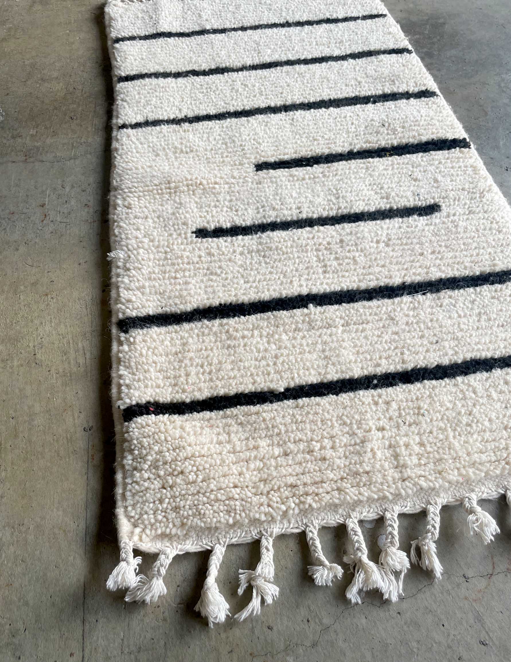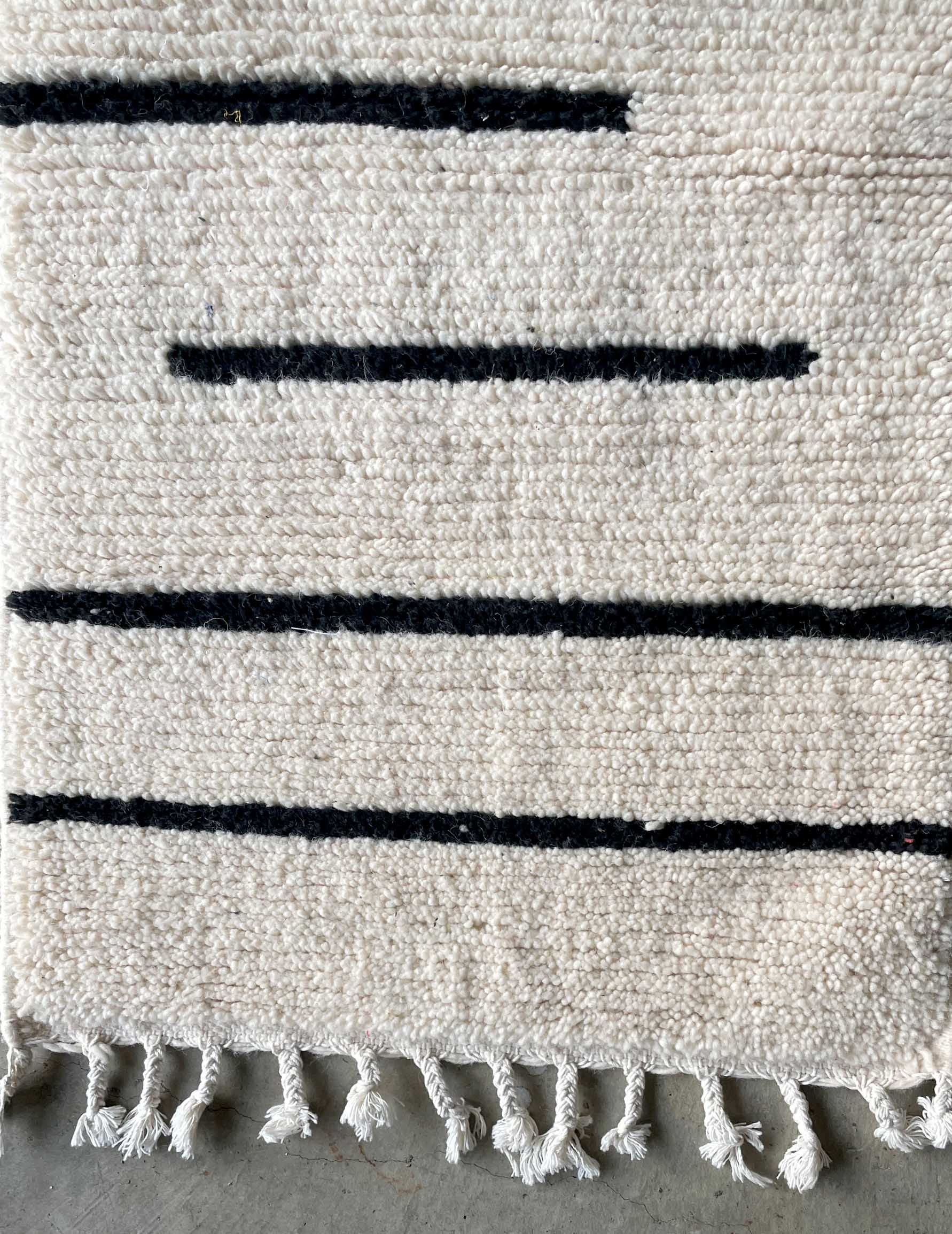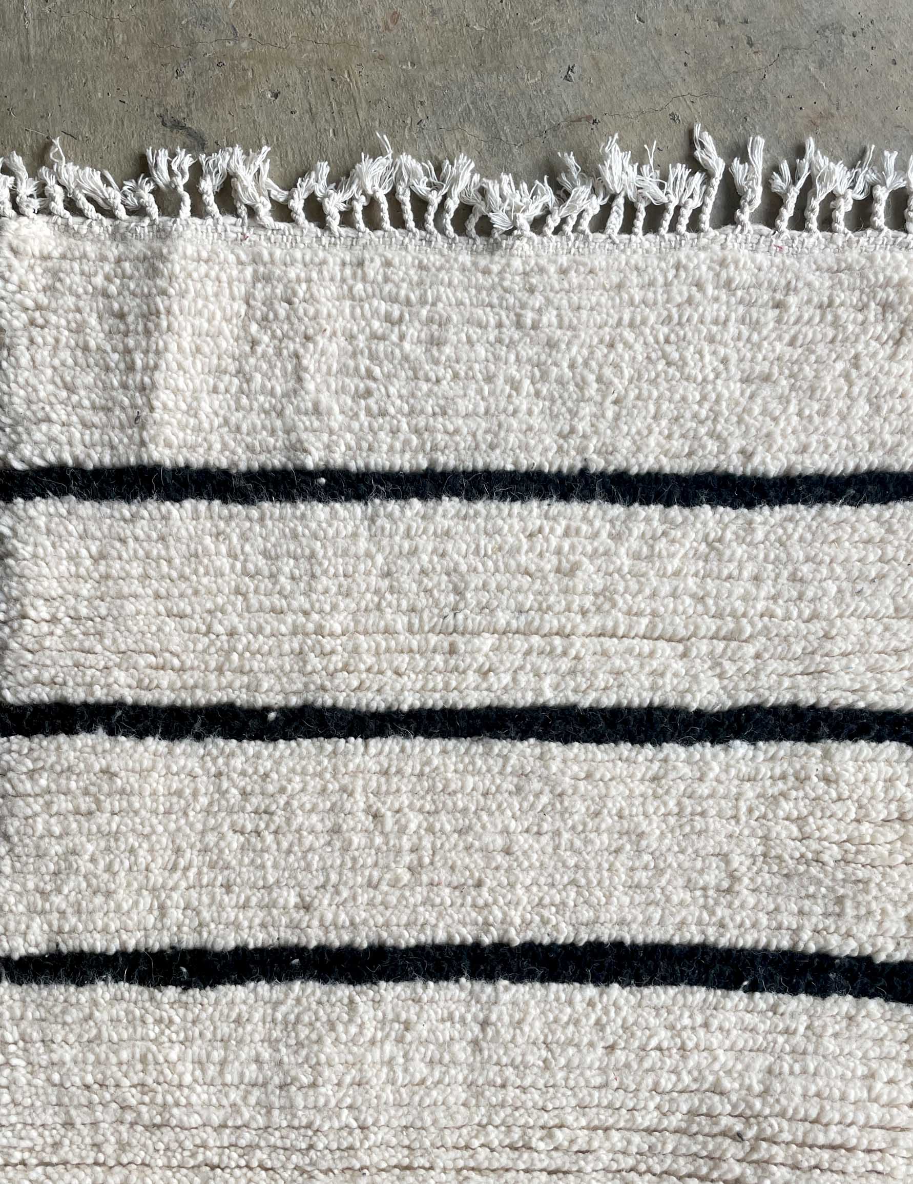 ベニワレンはモロッコのアトラス山脈に住むベルベル人女性によって、一目一目しっかりと結びながら織らているハンドメイドのウールラグです。白を基調とし黒の細いラインで模様が描かれています。触り心地はふわふわと柔らかく長い毛足が特徴です。白を基調としたシンプルなデザインとナチュラルな色合いは、コーディネートの幅も広く他のインテリアとも調和しやすいです。
