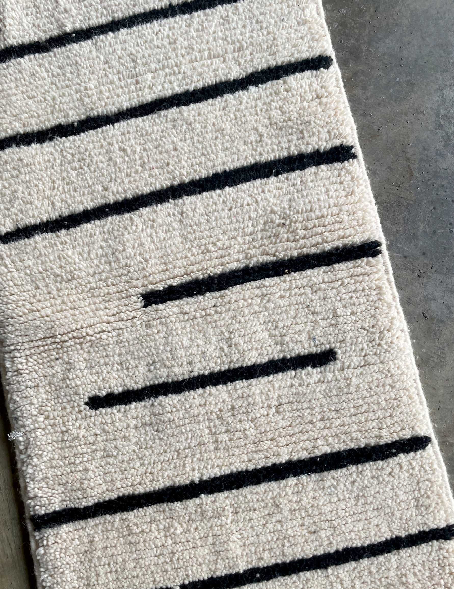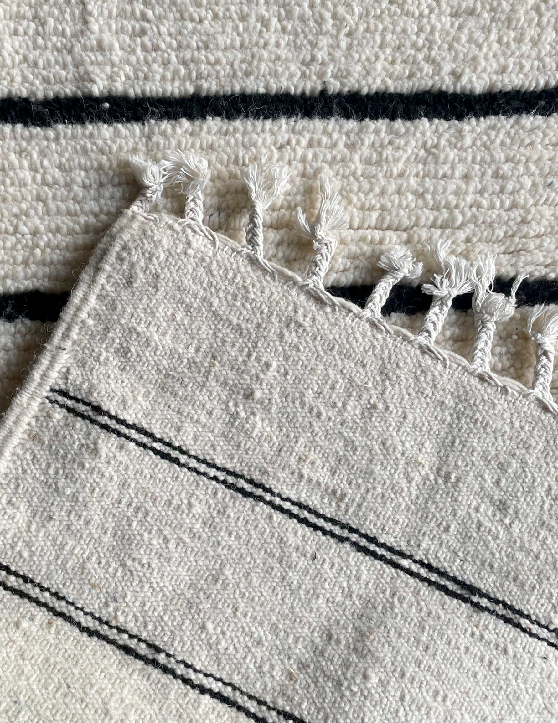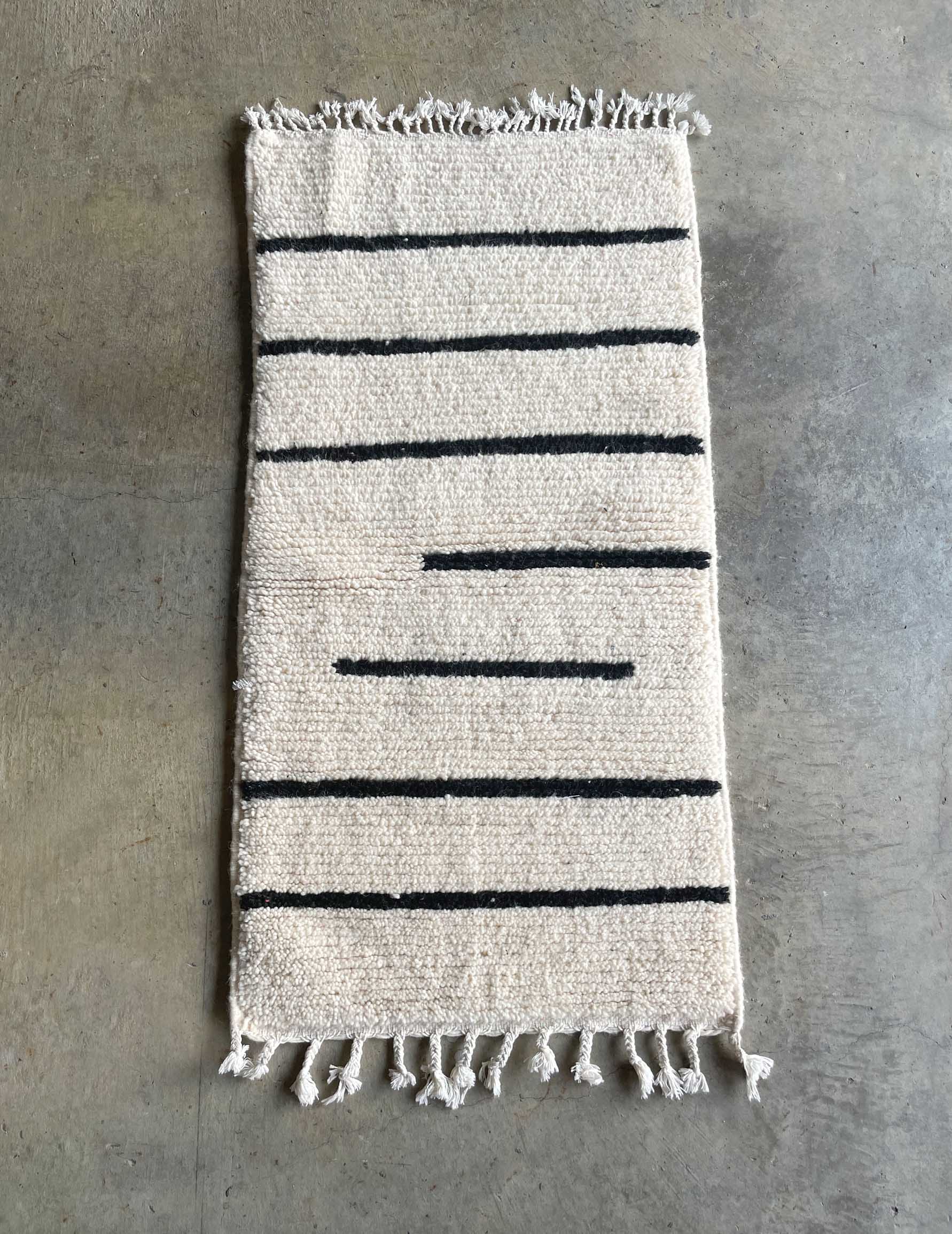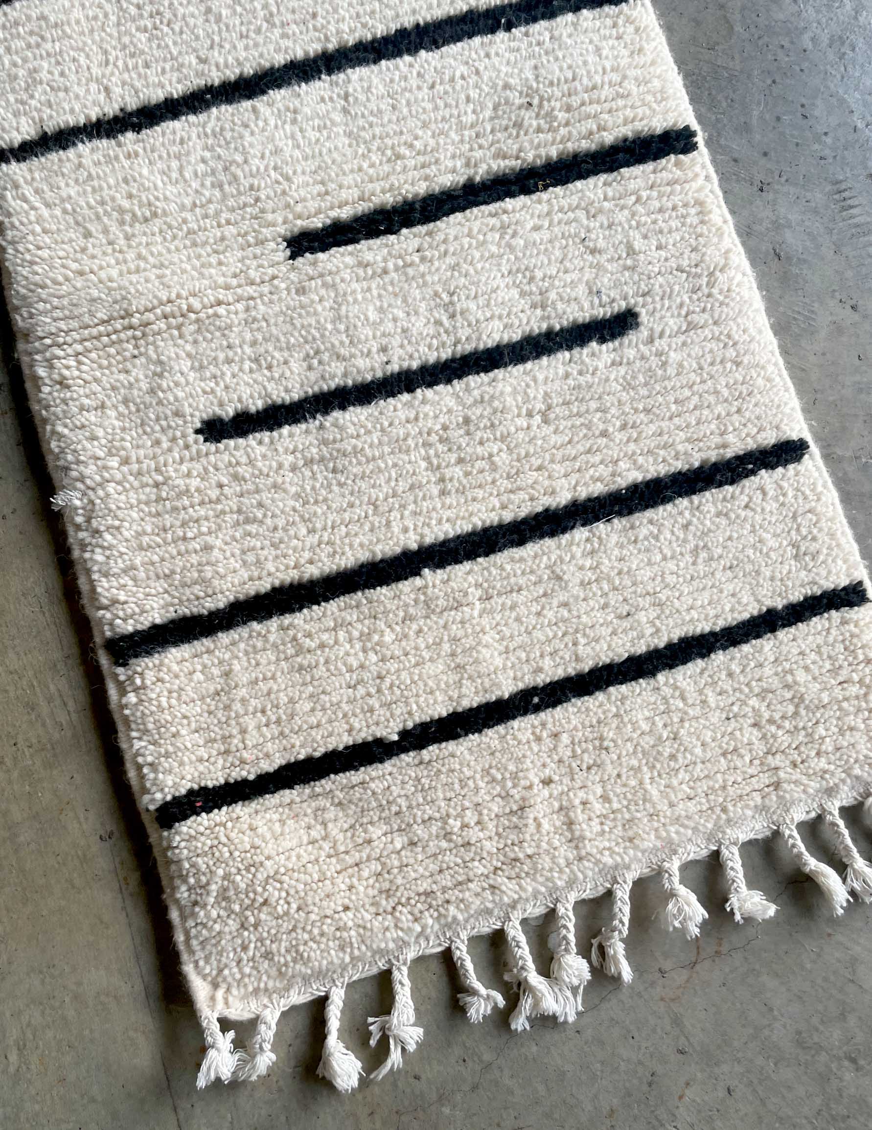 ベニワレンはモロッコのアトラス山脈に住むベルベル人女性によって、一目一目しっかりと結びながら織らているハンドメイドのウールラグです。白を基調とし黒の細いラインで模様が描かれています。触り心地はふわふわと柔らかく長い毛足が特徴です。白を基調としたシンプルなデザインとナチュラルな色合いは、コーディネートの幅も広く他のインテリアとも調和しやすいです。