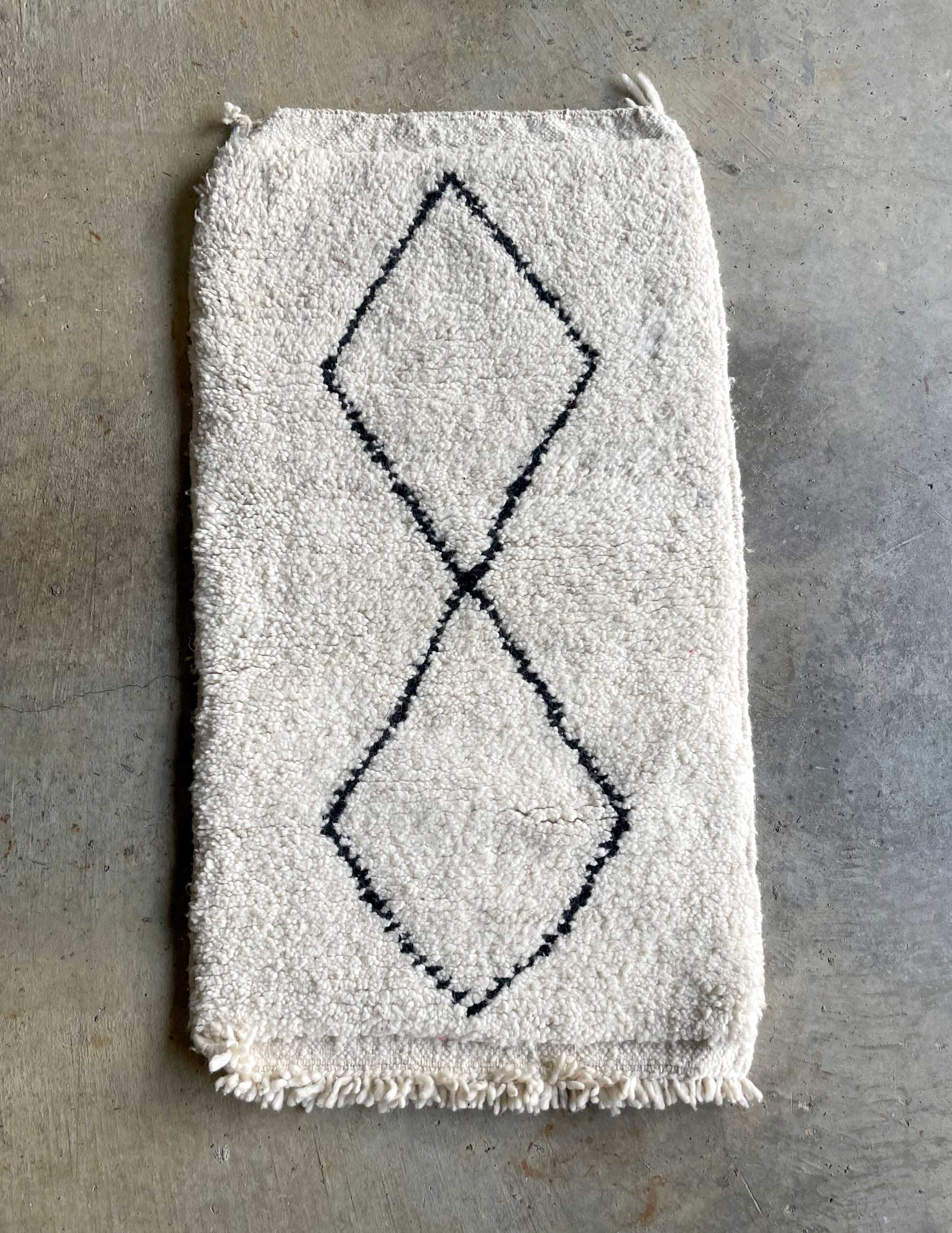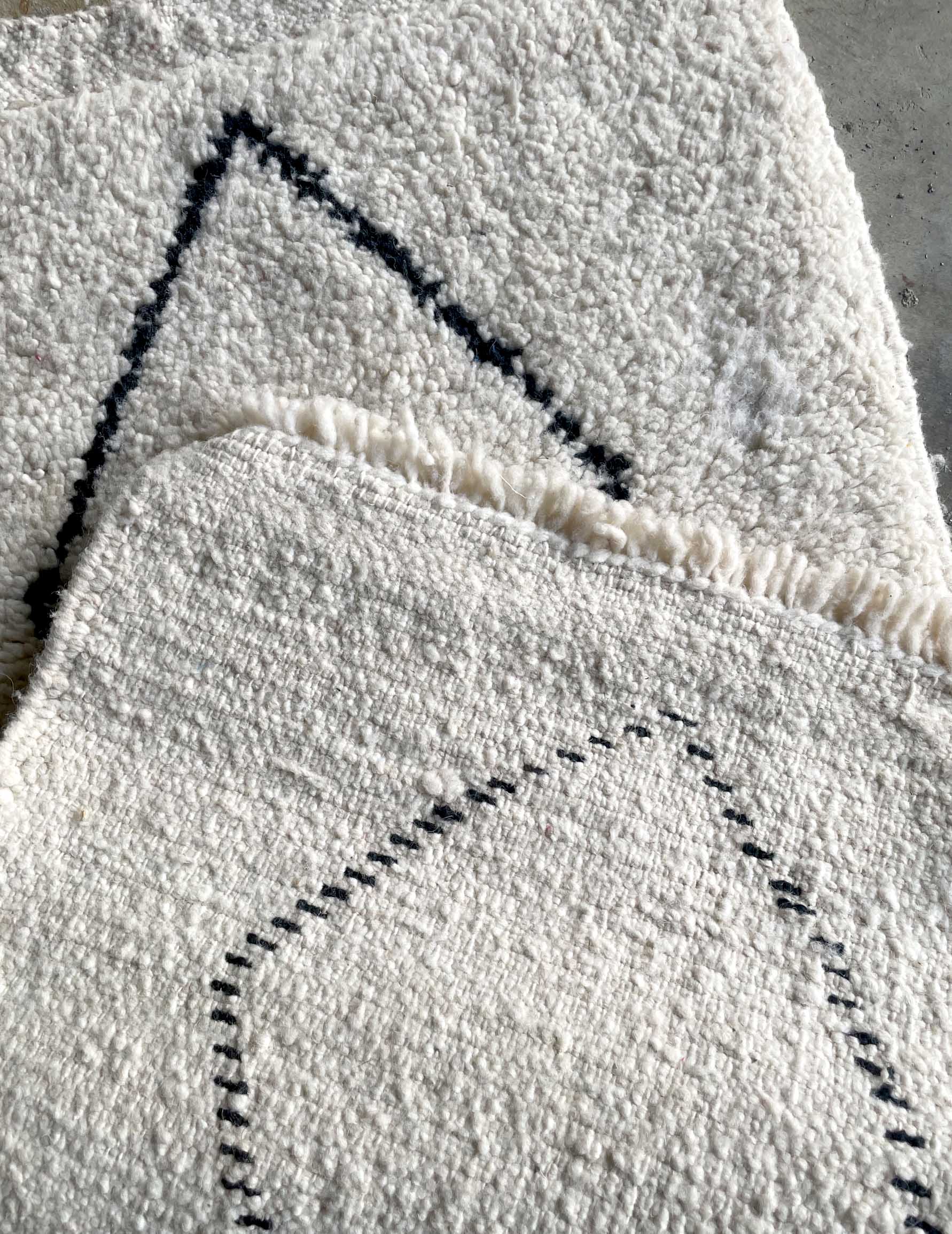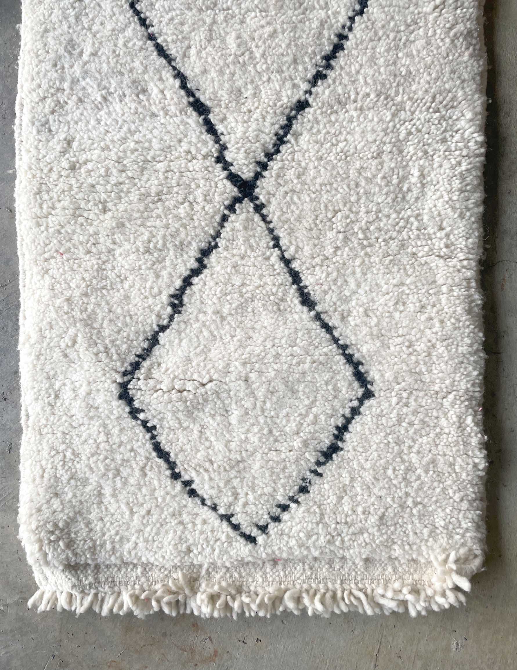 ベニワレンはモロッコのアトラス山脈に住むベルベル人女性によって、一目一目しっかりと結びながら織らているハンドメイドのウールラグです。白を基調とし黒の細いラインで模様が描かれています。触り心地はふわふわと柔らかく長い毛足が特徴です。白を基調としたシンプルなデザインとナチュラルな色合いは、コーディネートの幅も広く他のインテリアとも調和しやすいです。