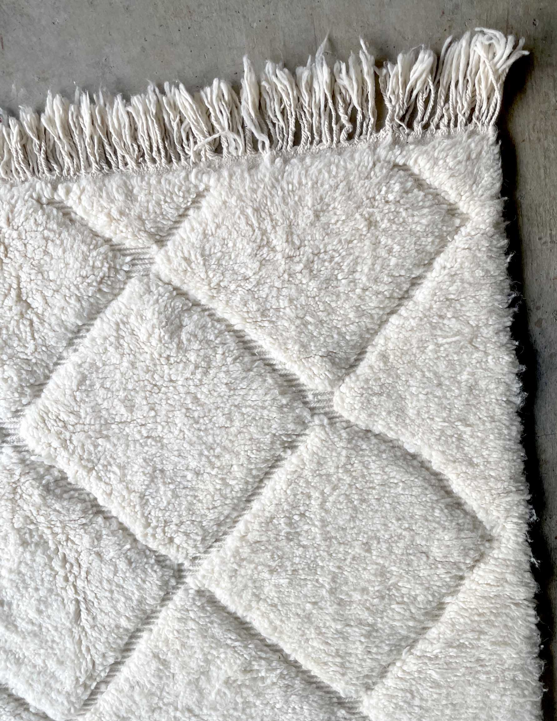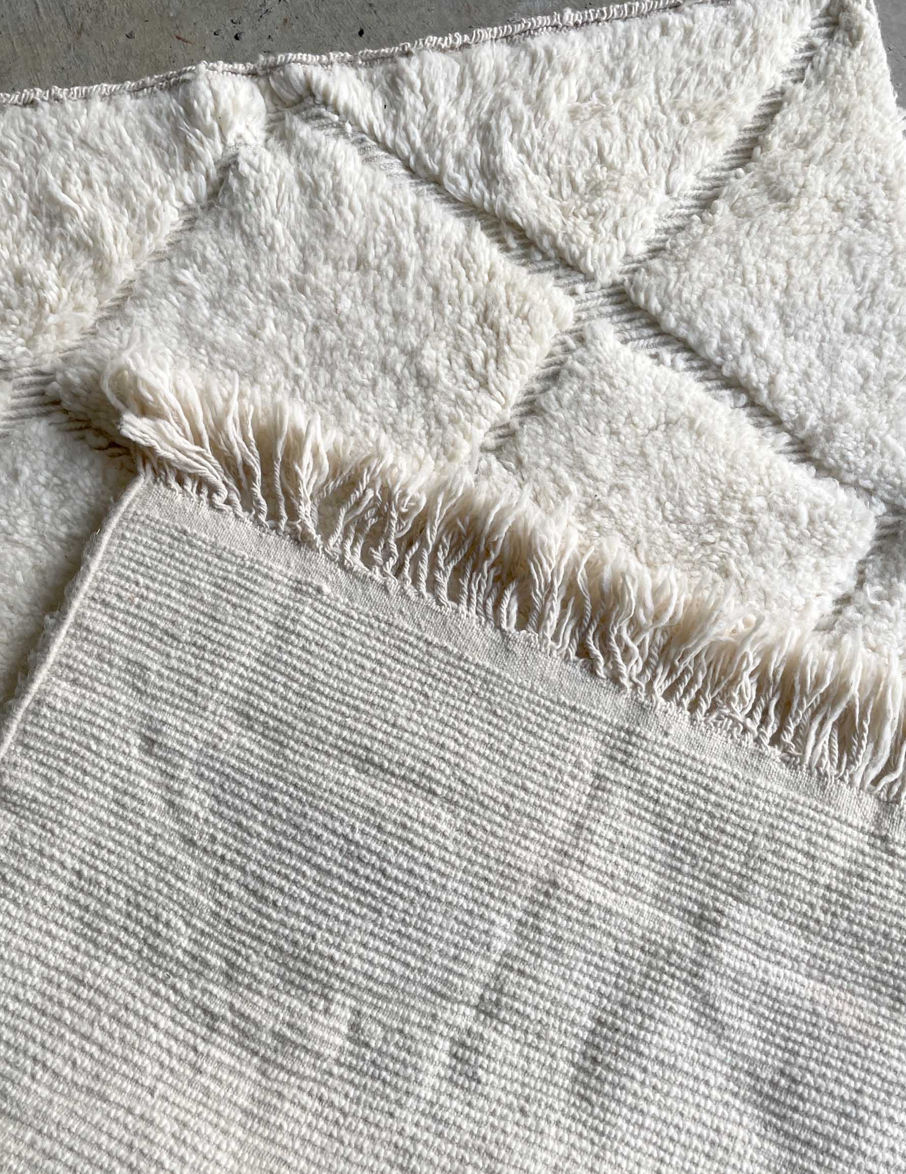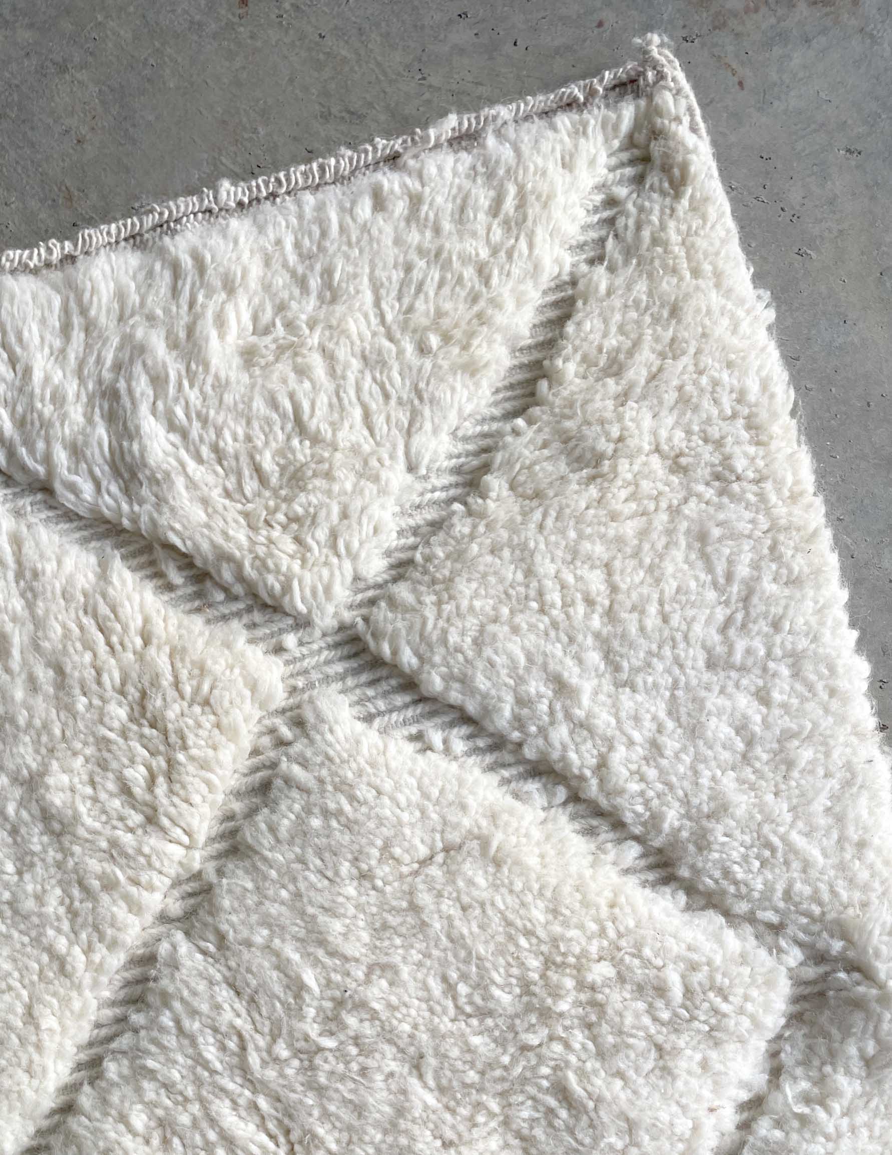 ベニワレンはモロッコのアトラス山脈に住むベルベル人女性によって、一目一目しっかりと結びながら織らているハンドメイドのウールラグです。白を基調とし黒の細いラインで模様が描かれています。触り心地はふわふわと柔らかく長い毛足が特徴です。白を基調としたシンプルなデザインとナチュラルな色合いは、コーディネートの幅も広く他のインテリアとも調和しやすいです。