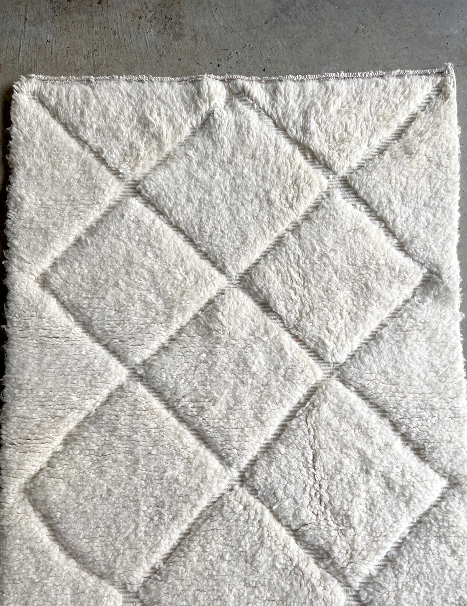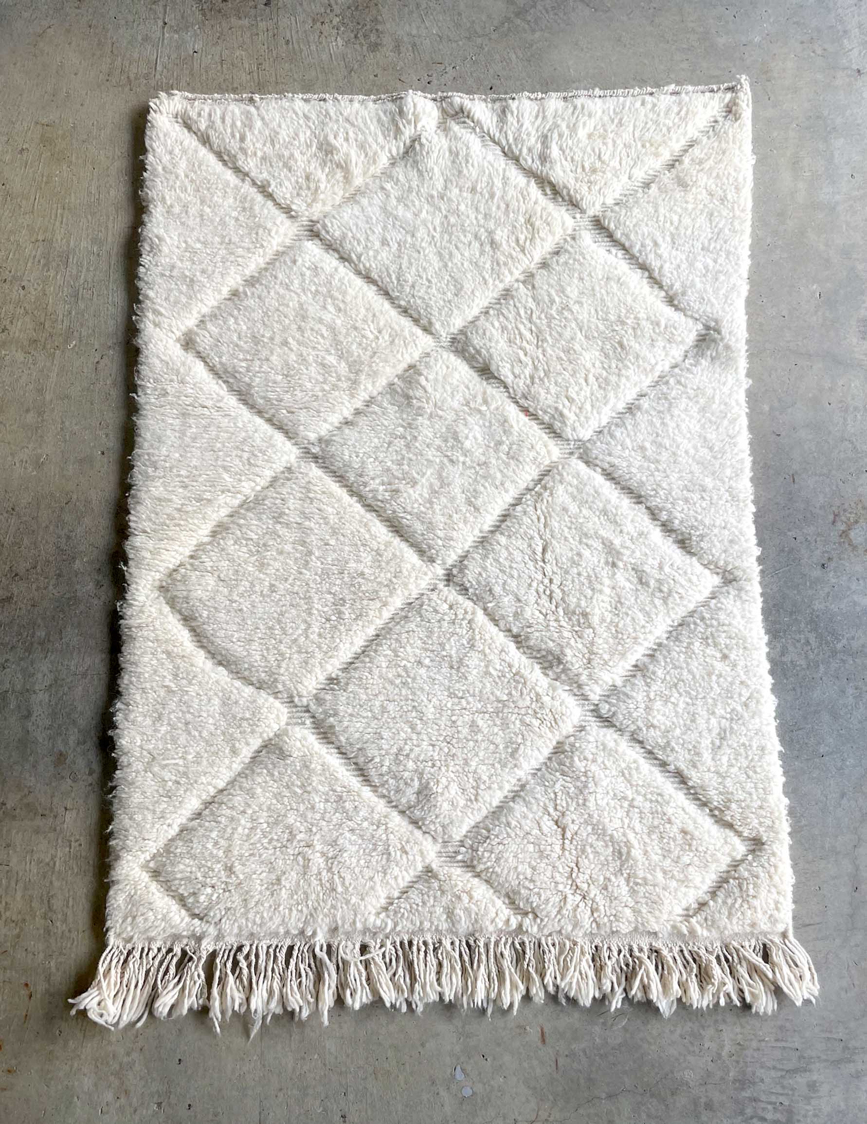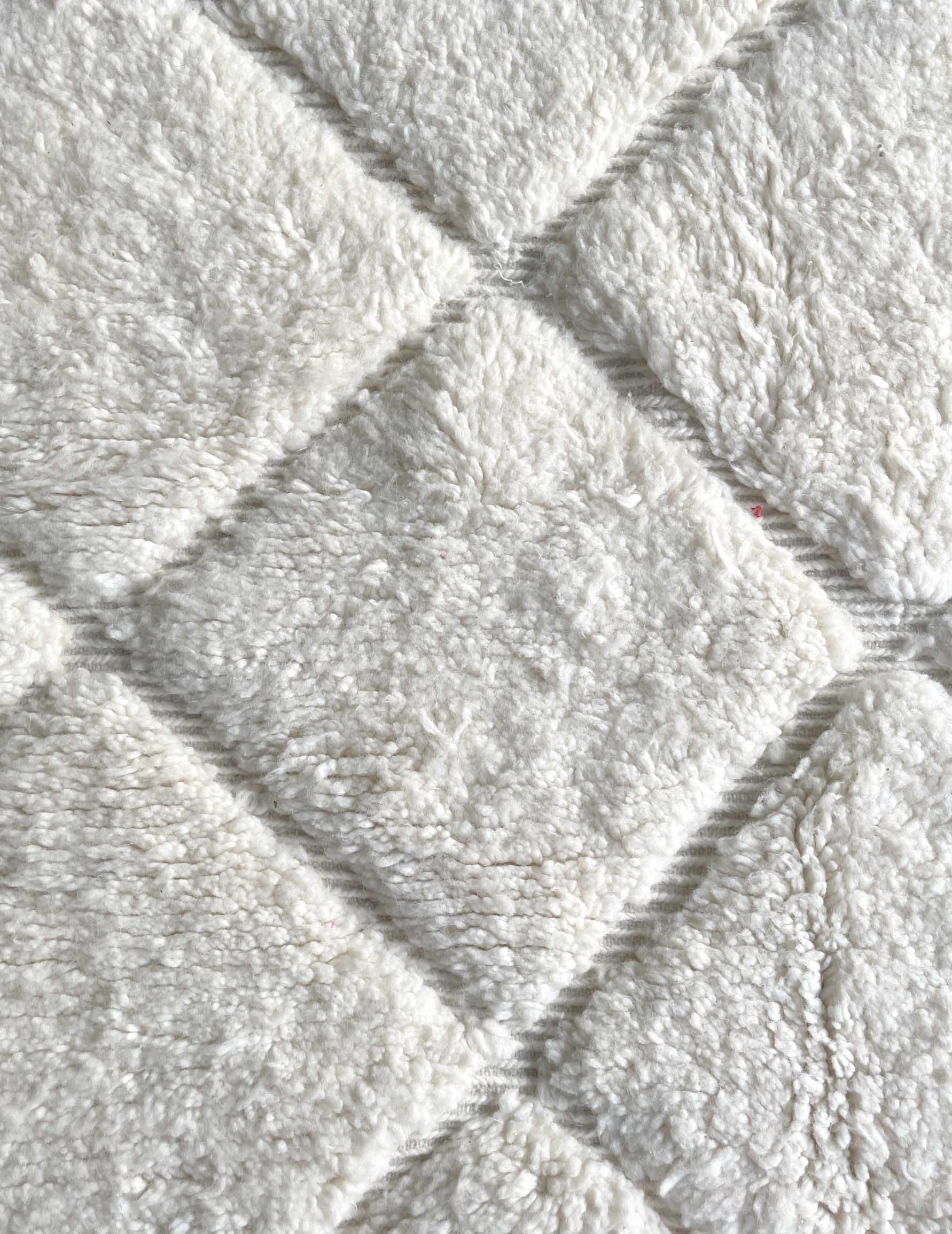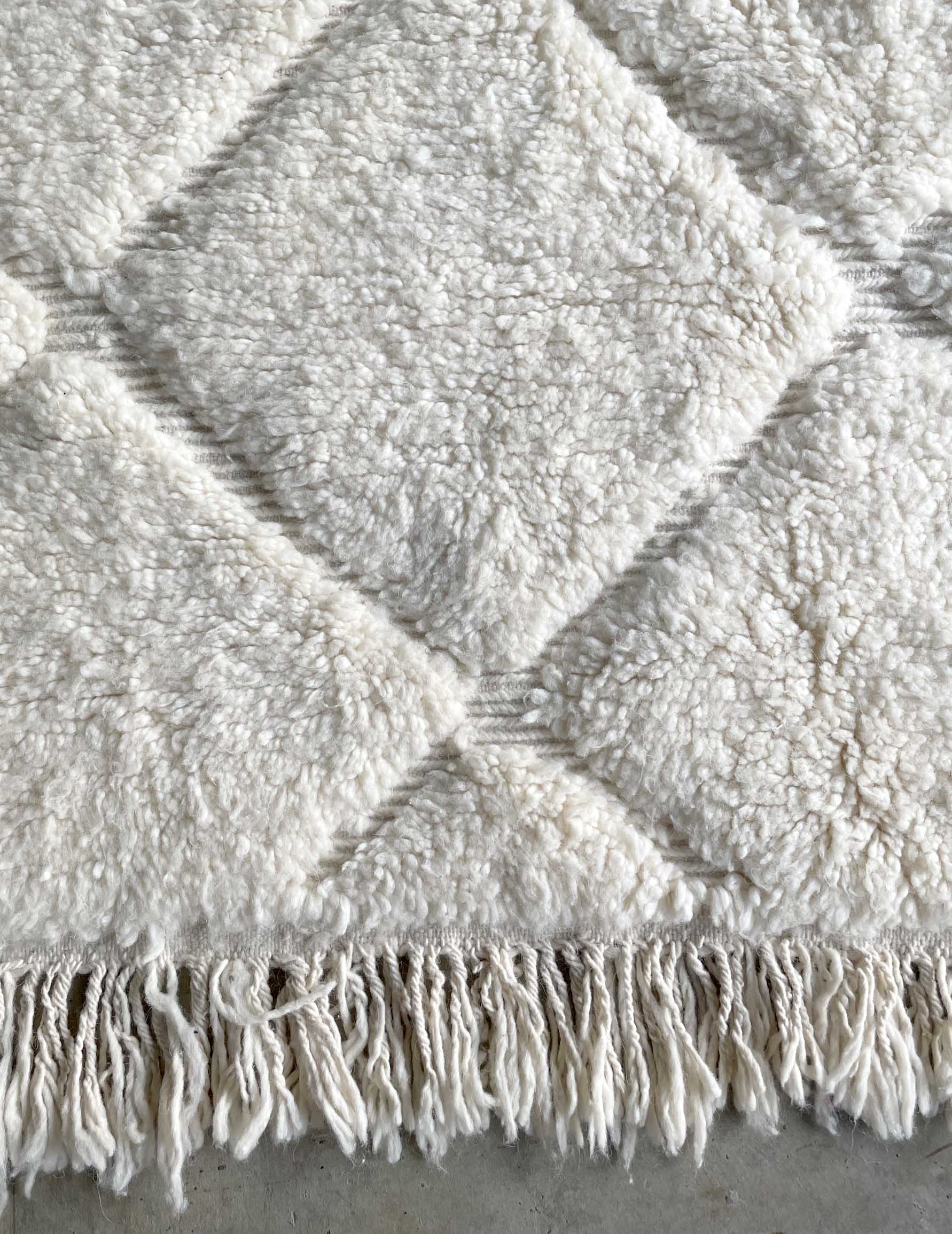 ベニワレンはモロッコのアトラス山脈に住むベルベル人女性によって、一目一目しっかりと結びながら織らているハンドメイドのウールラグです。白を基調とし黒の細いラインで模様が描かれています。触り心地はふわふわと柔らかく長い毛足が特徴です。白を基調としたシンプルなデザインとナチュラルな色合いは、コーディネートの幅も広く他のインテリアとも調和しやすいです。