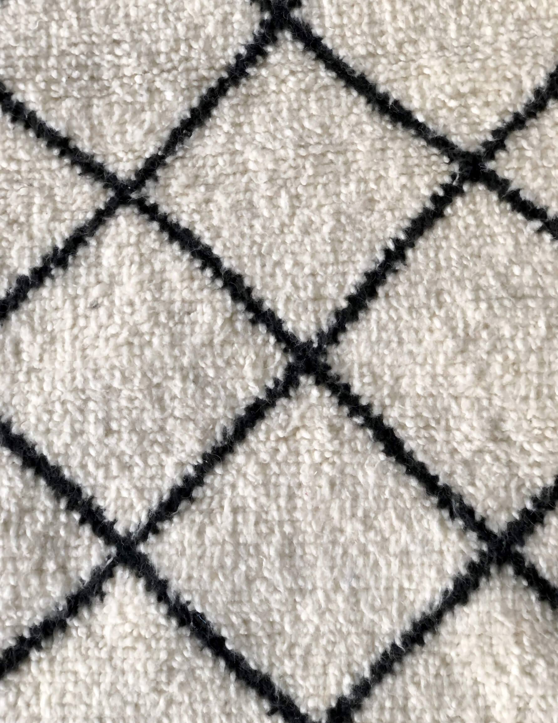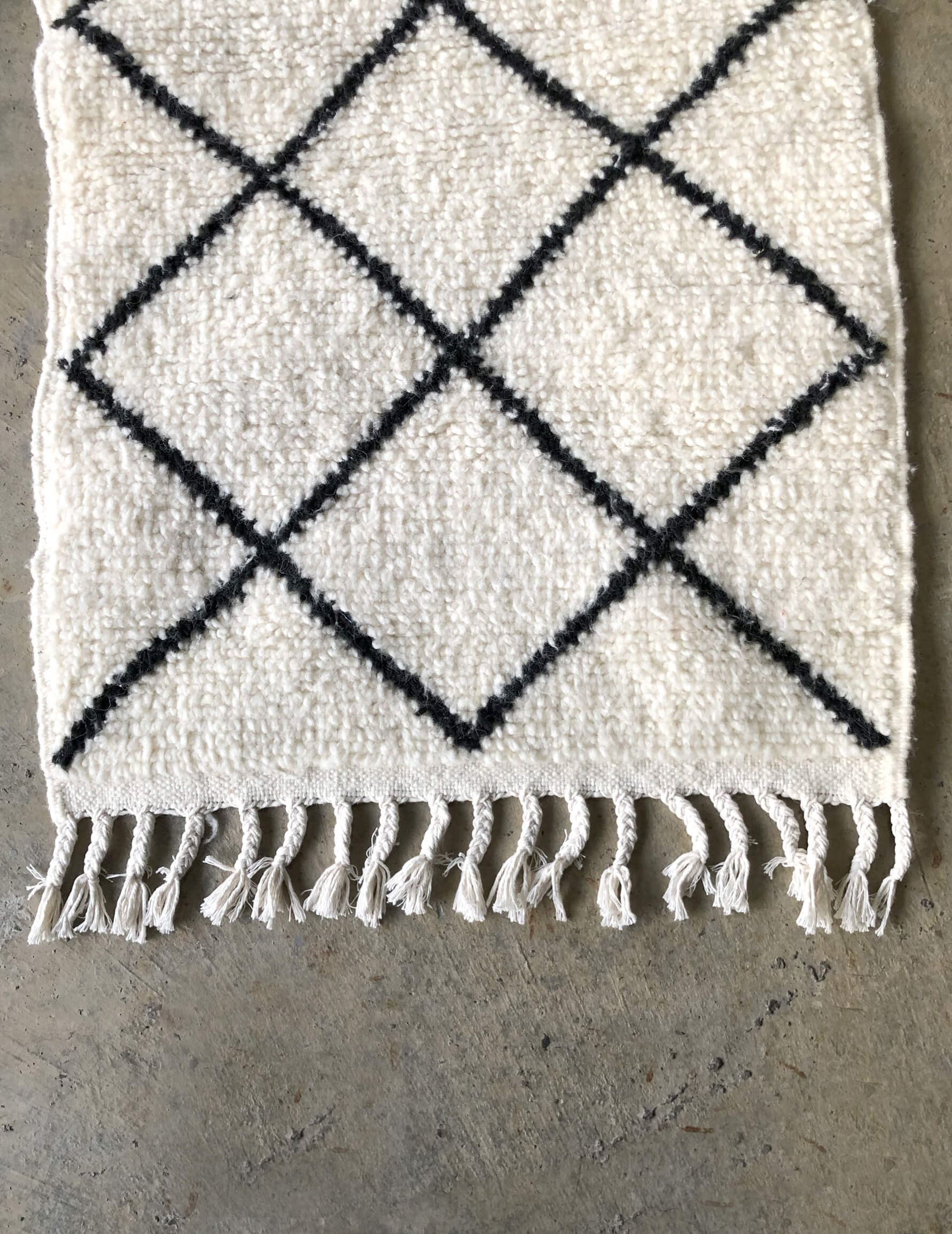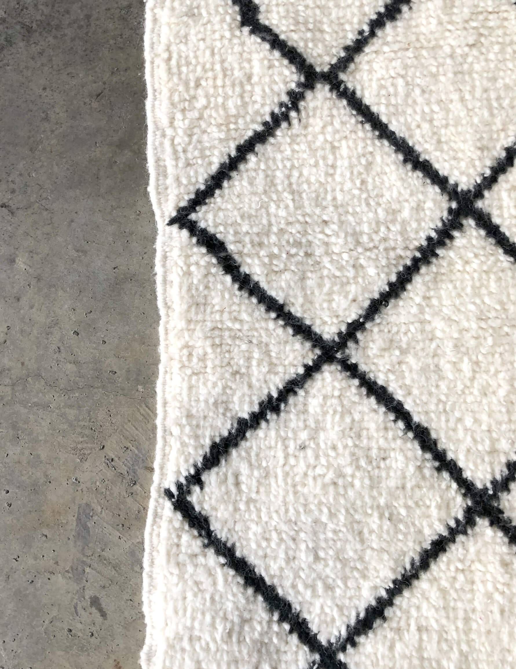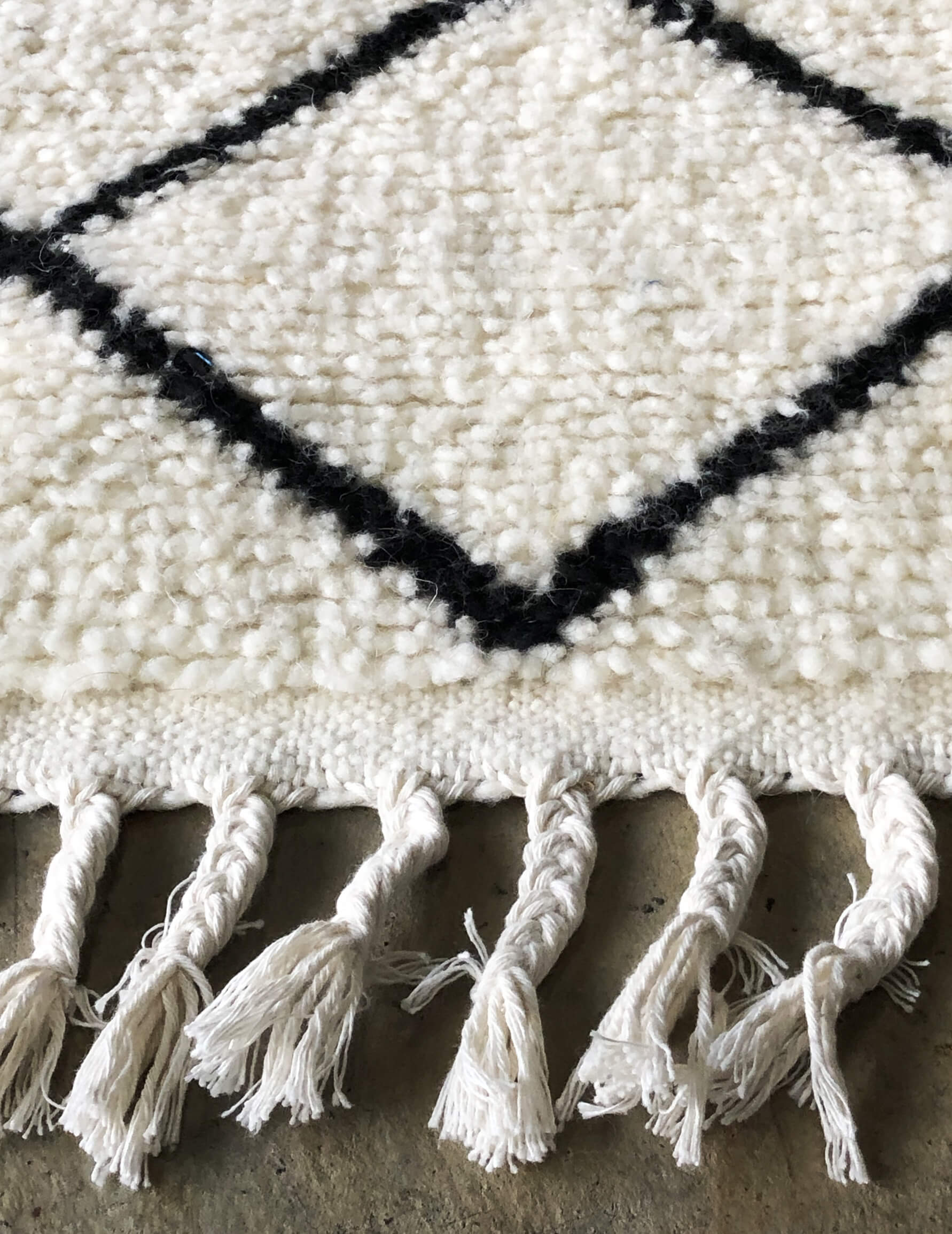 ベニワレンはモロッコのアトラス山脈に住むベルベル人女性によって、一目一目しっかりと結びながら織らているハンドメイドのウールラグです。白を基調とし黒の細いラインで模様が描かれています。触り心地はふわふわと柔らかく長い毛足が特徴です。白を基調としたシンプルなデザインとナチュラルな色合いは、コーディネートの幅も広く他のインテリアとも調和しやすいです。
