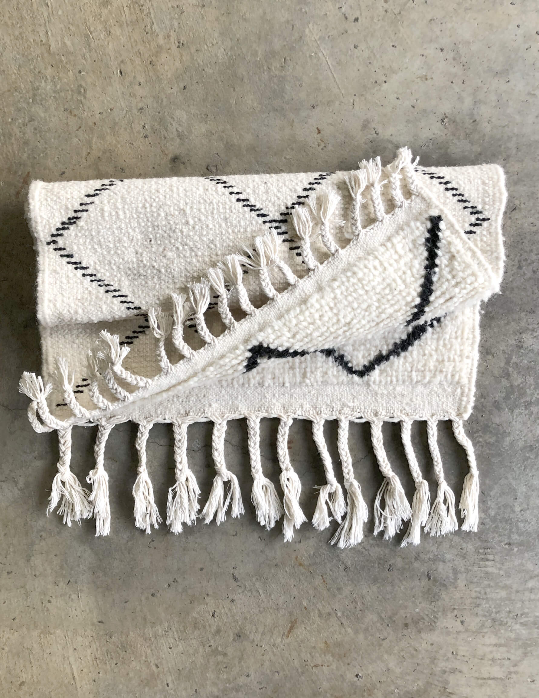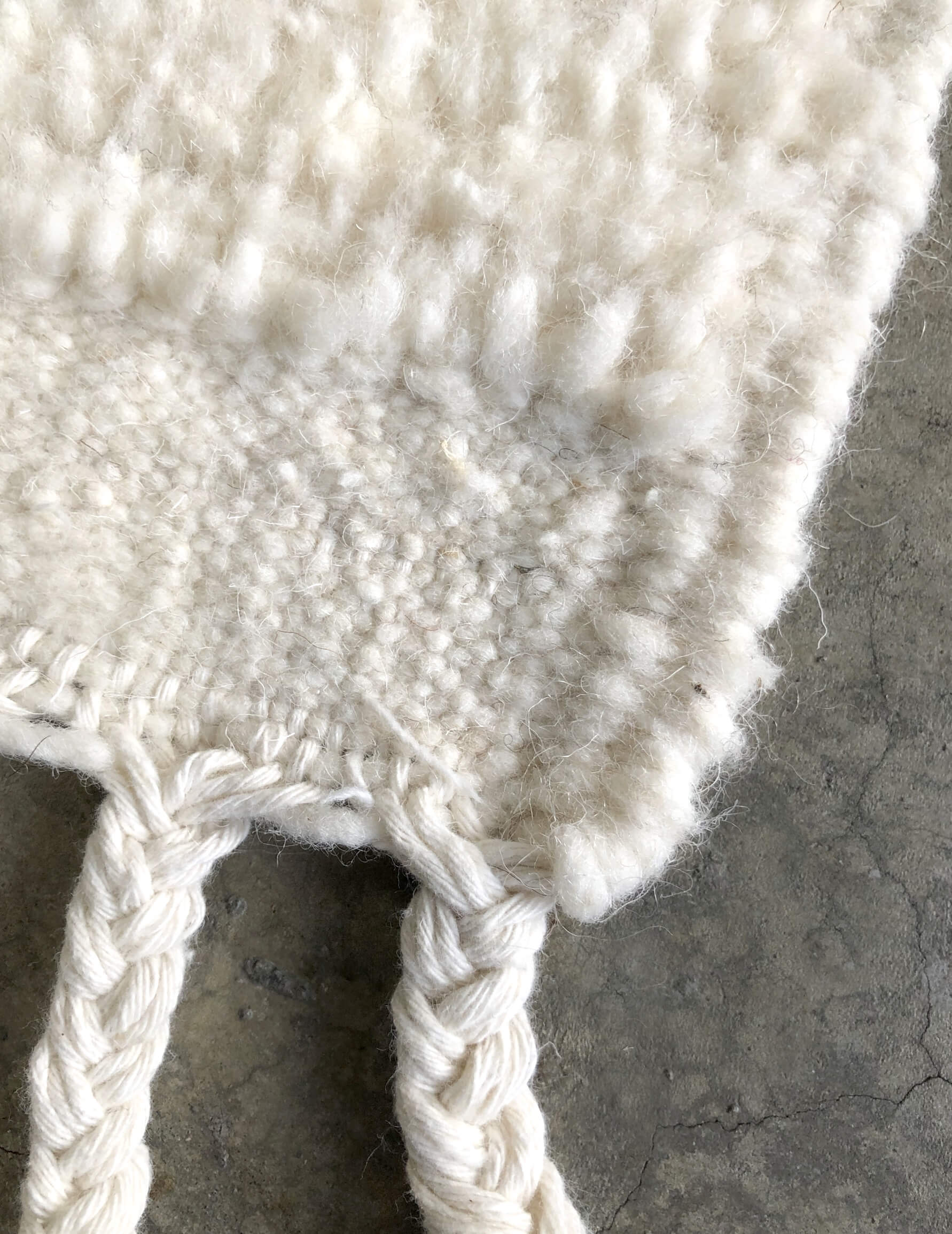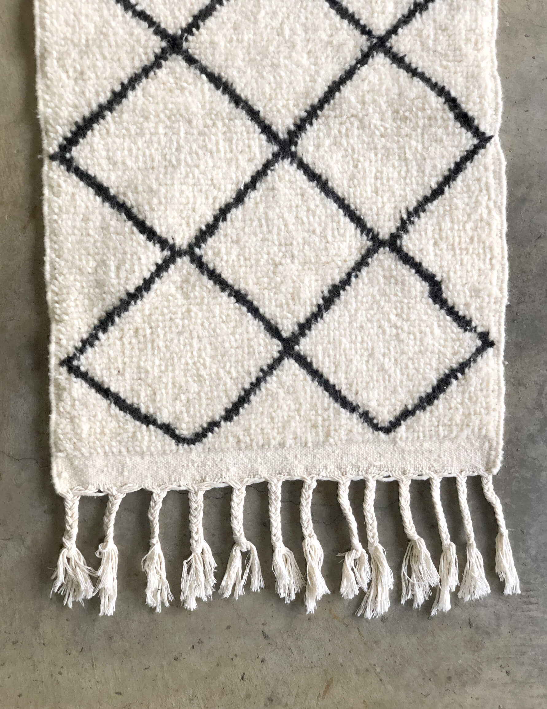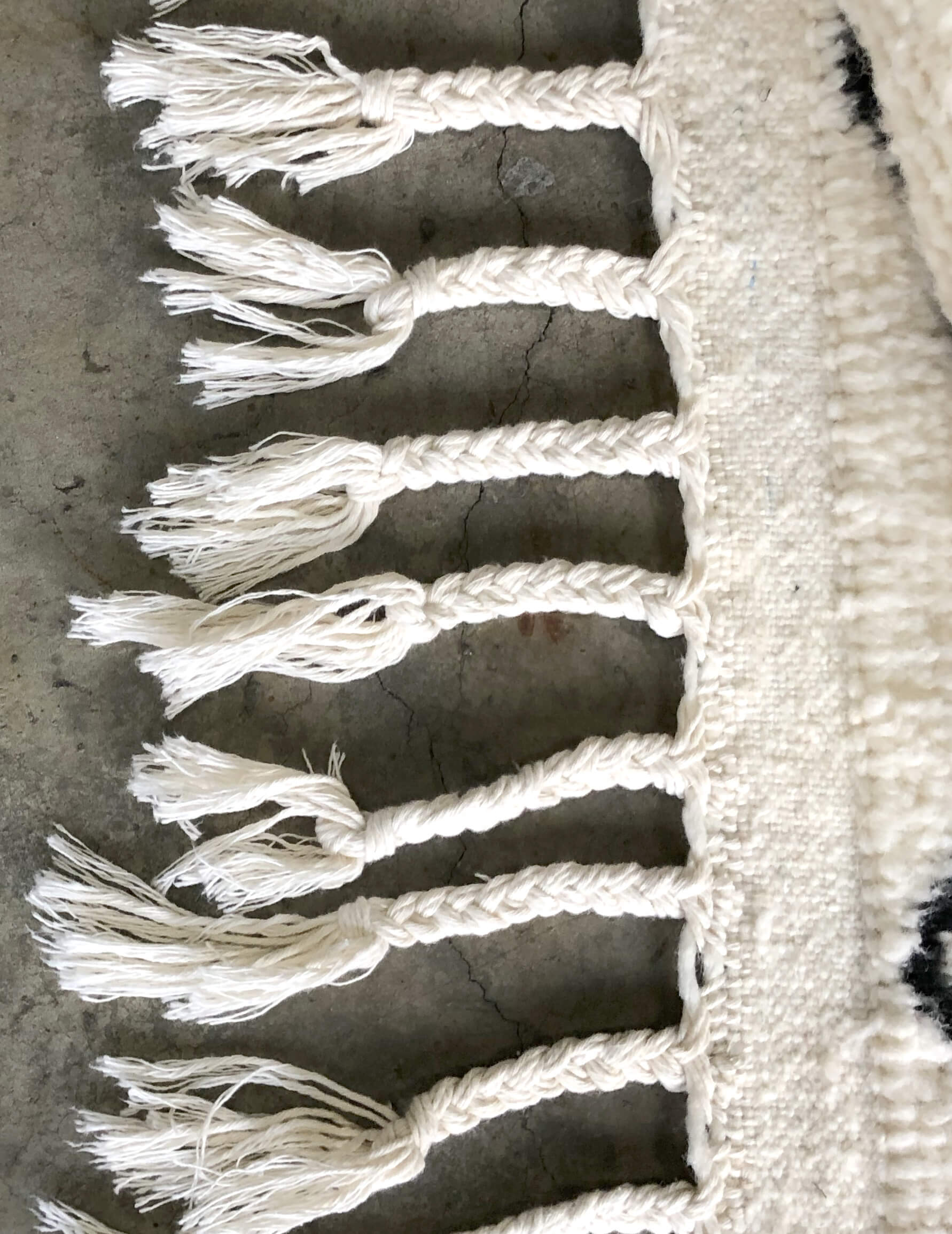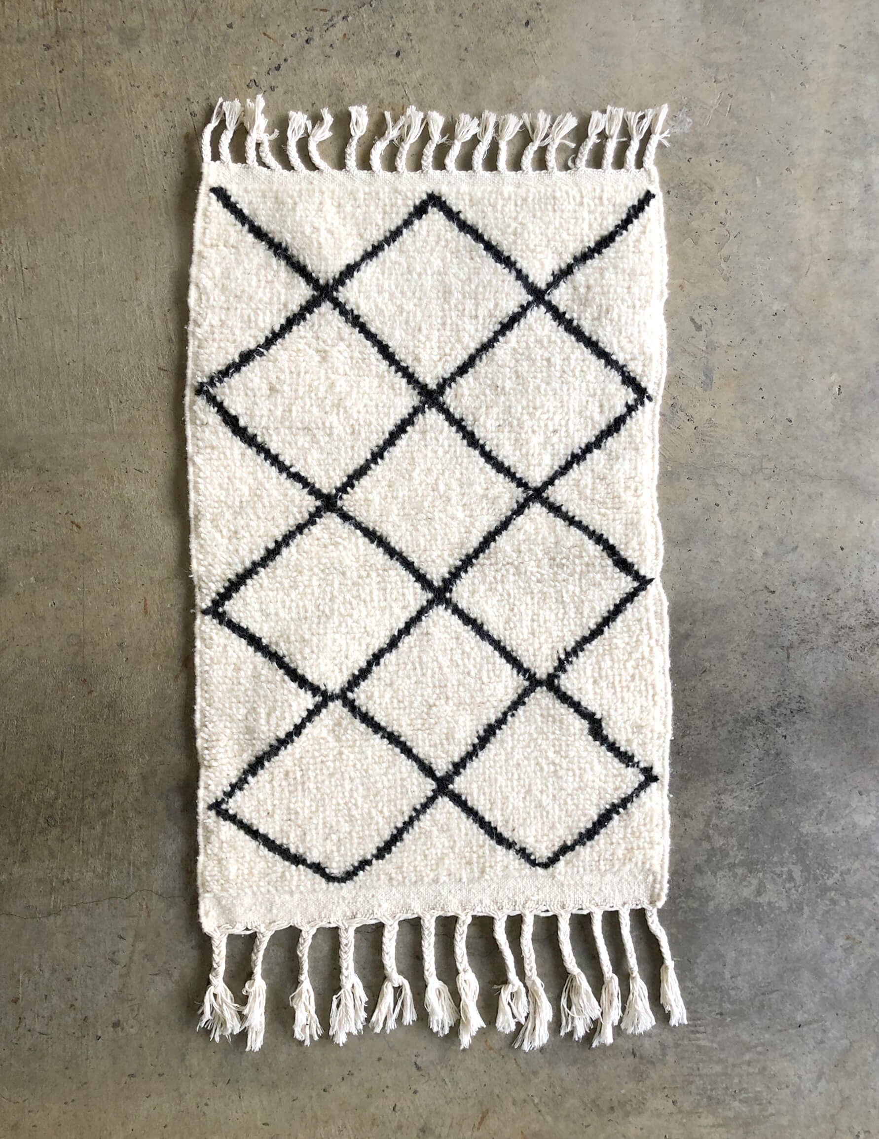 ベニワレンはモロッコのアトラス山脈に住むベルベル人女性によって、一目一目しっかりと結びながら織らているハンドメイドのウールラグです。白を基調とし黒の細いラインで模様が描かれています。触り心地はふわふわと柔らかく長い毛足が特徴です。白を基調としたシンプルなデザインとナチュラルな色合いは、コーディネートの幅も広く他のインテリアとも調和しやすいです。