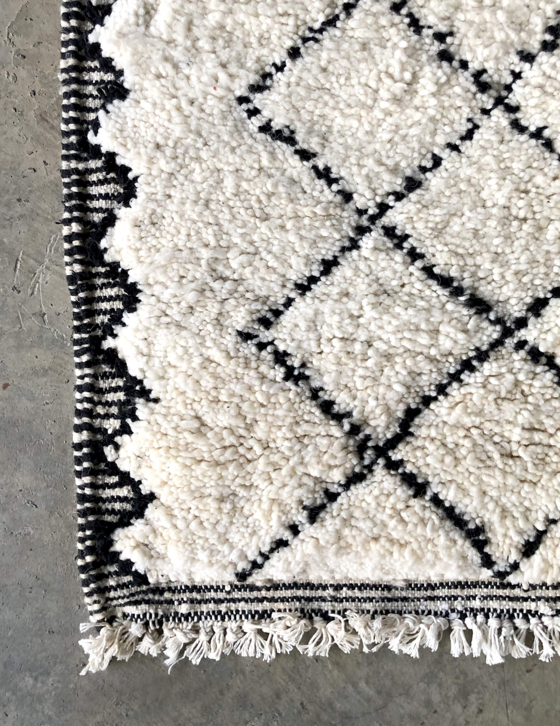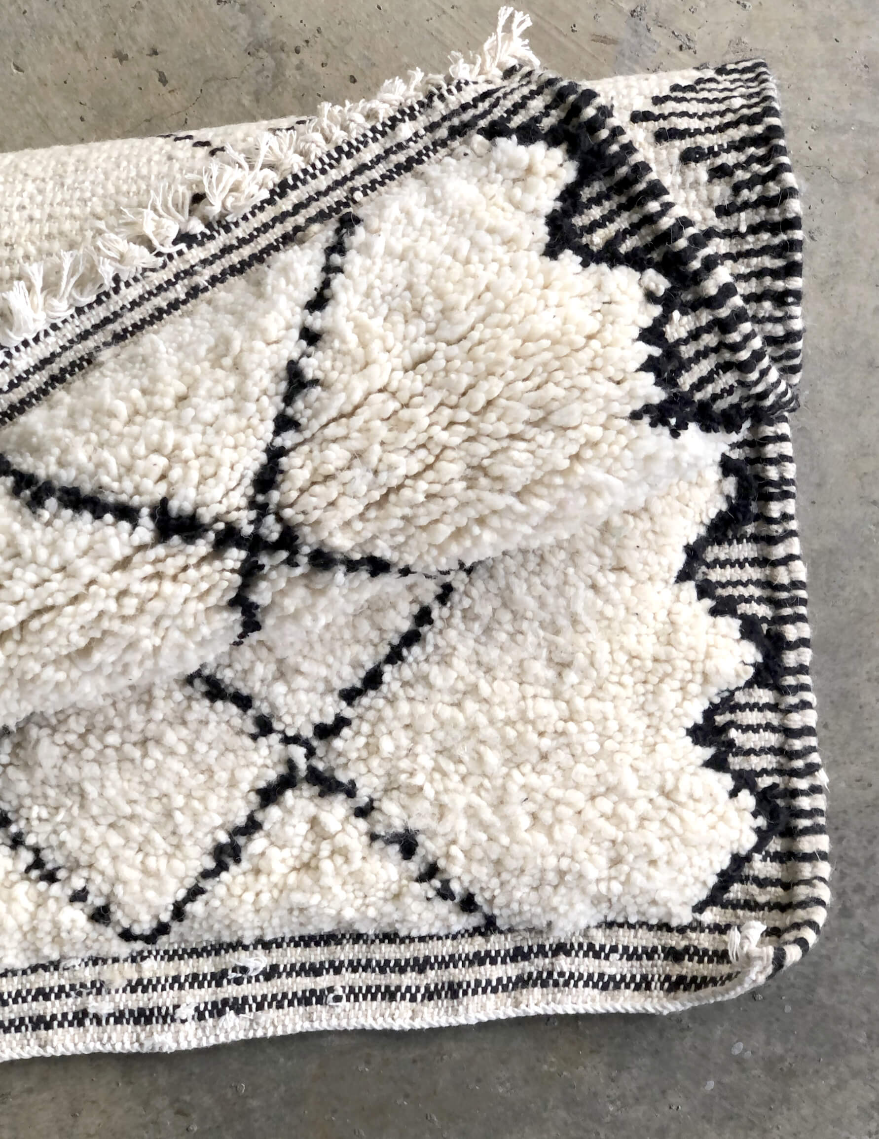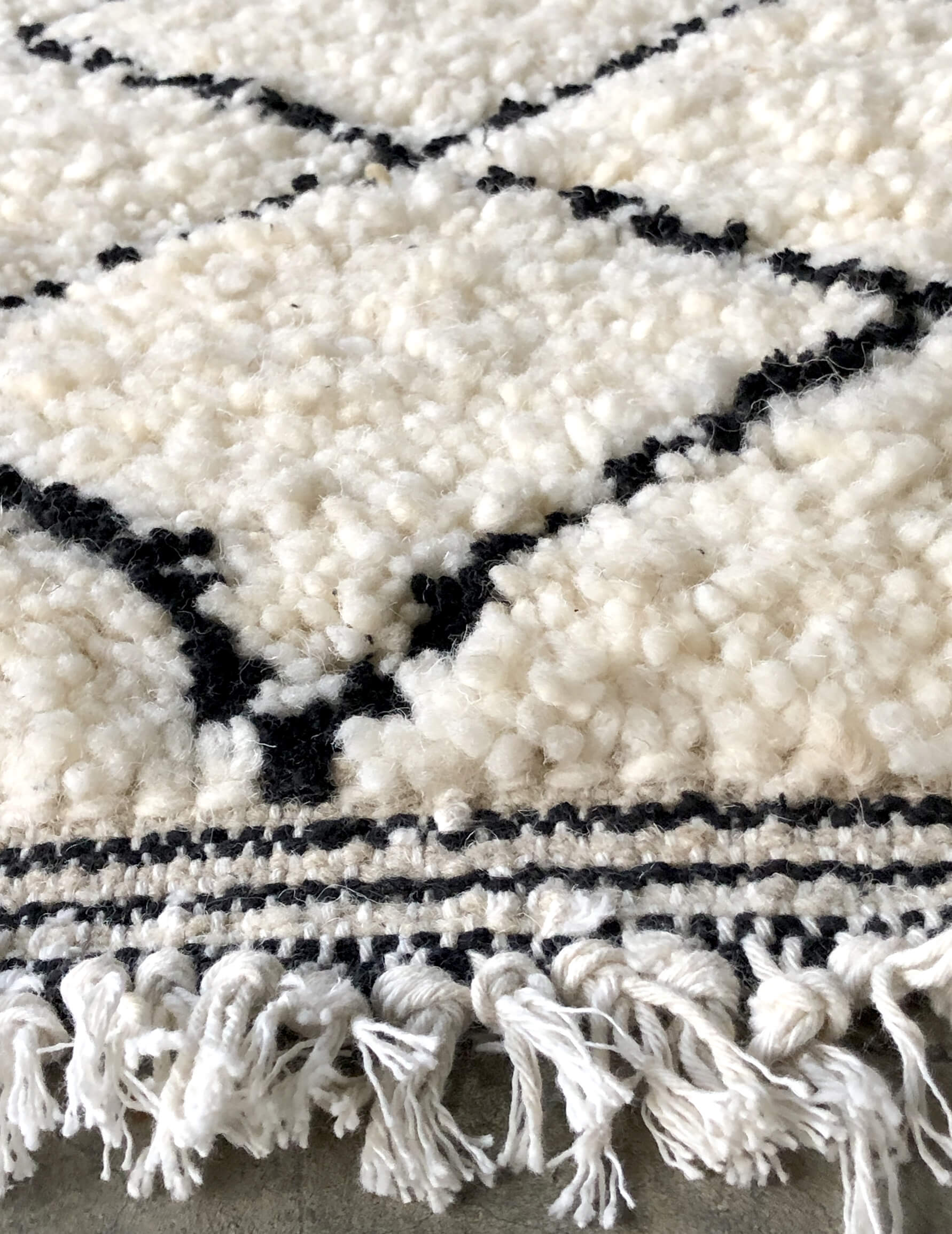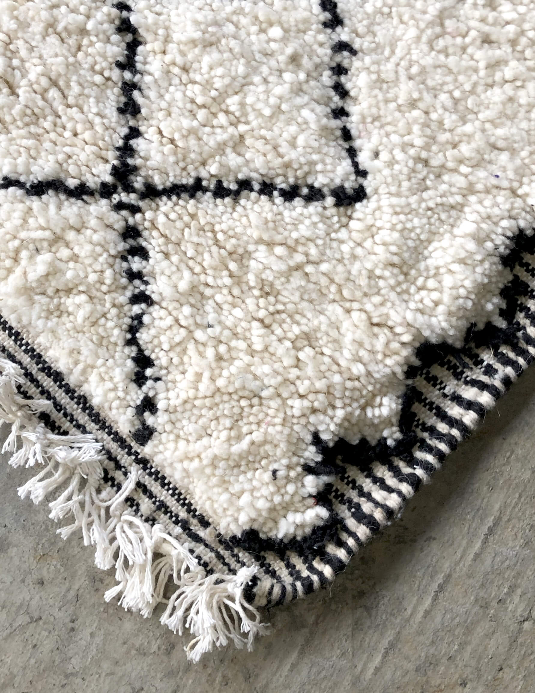 ベニワレンはモロッコのアトラス山脈に住むベルベル人女性によって、一目一目しっかりと結びながら織らているハンドメイドのウールラグです。白を基調とし黒の細いラインで模様が描かれています。触り心地はふわふわと柔らかく長い毛足が特徴です。白を基調としたシンプルなデザインとナチュラルな色合いは、コーディネートの幅も広く他のインテリアとも調和しやすいです。