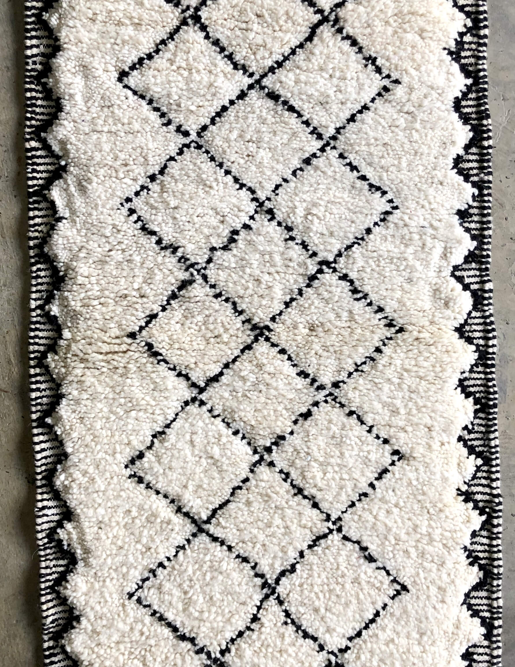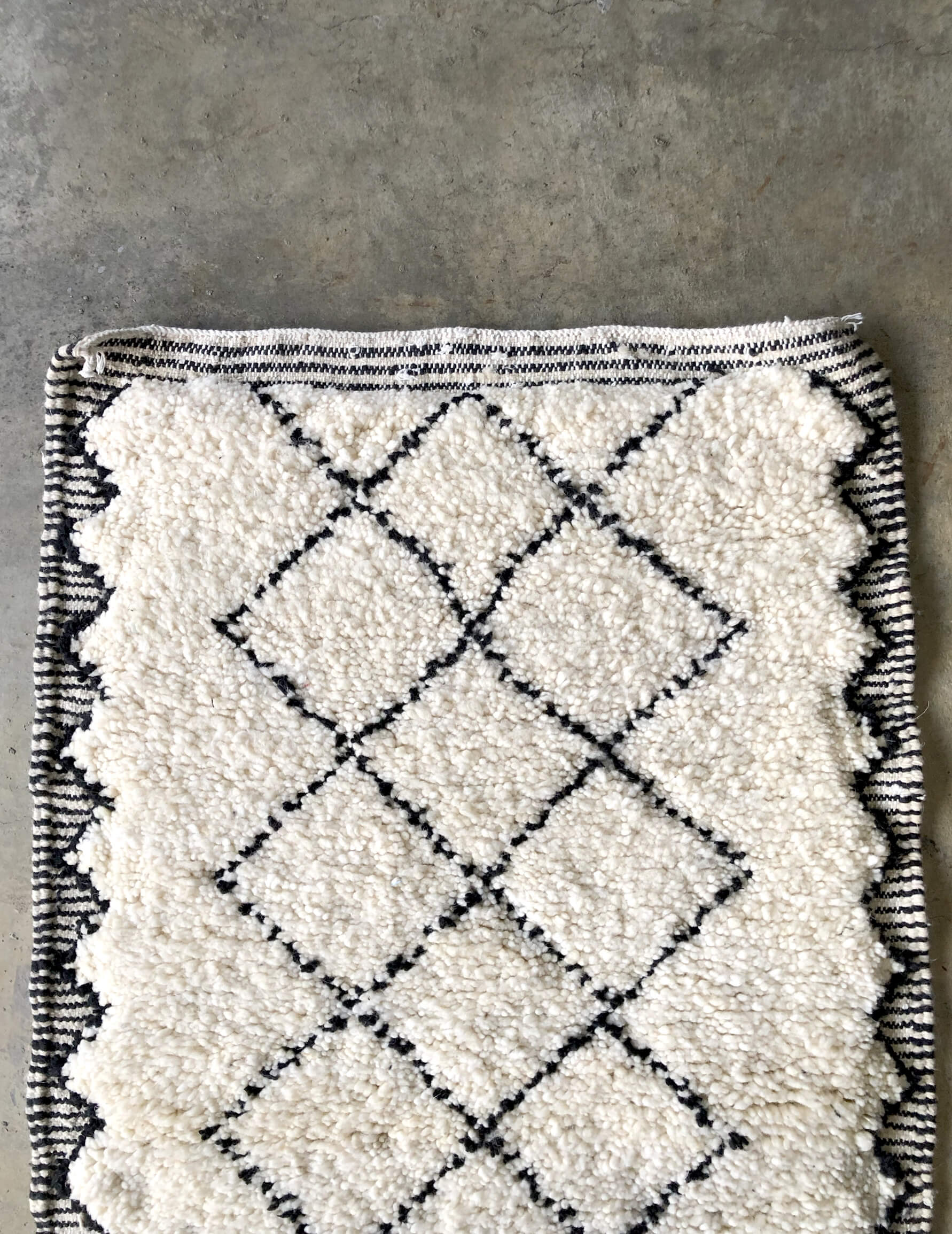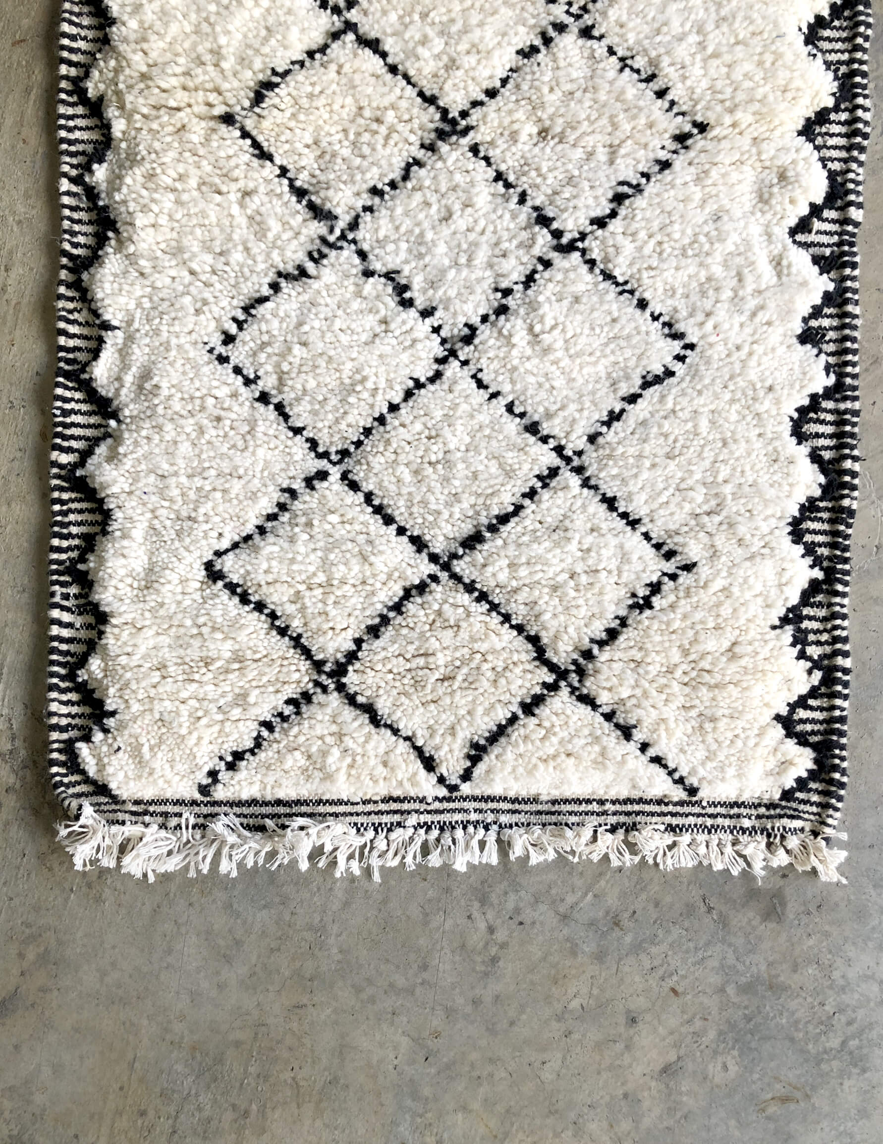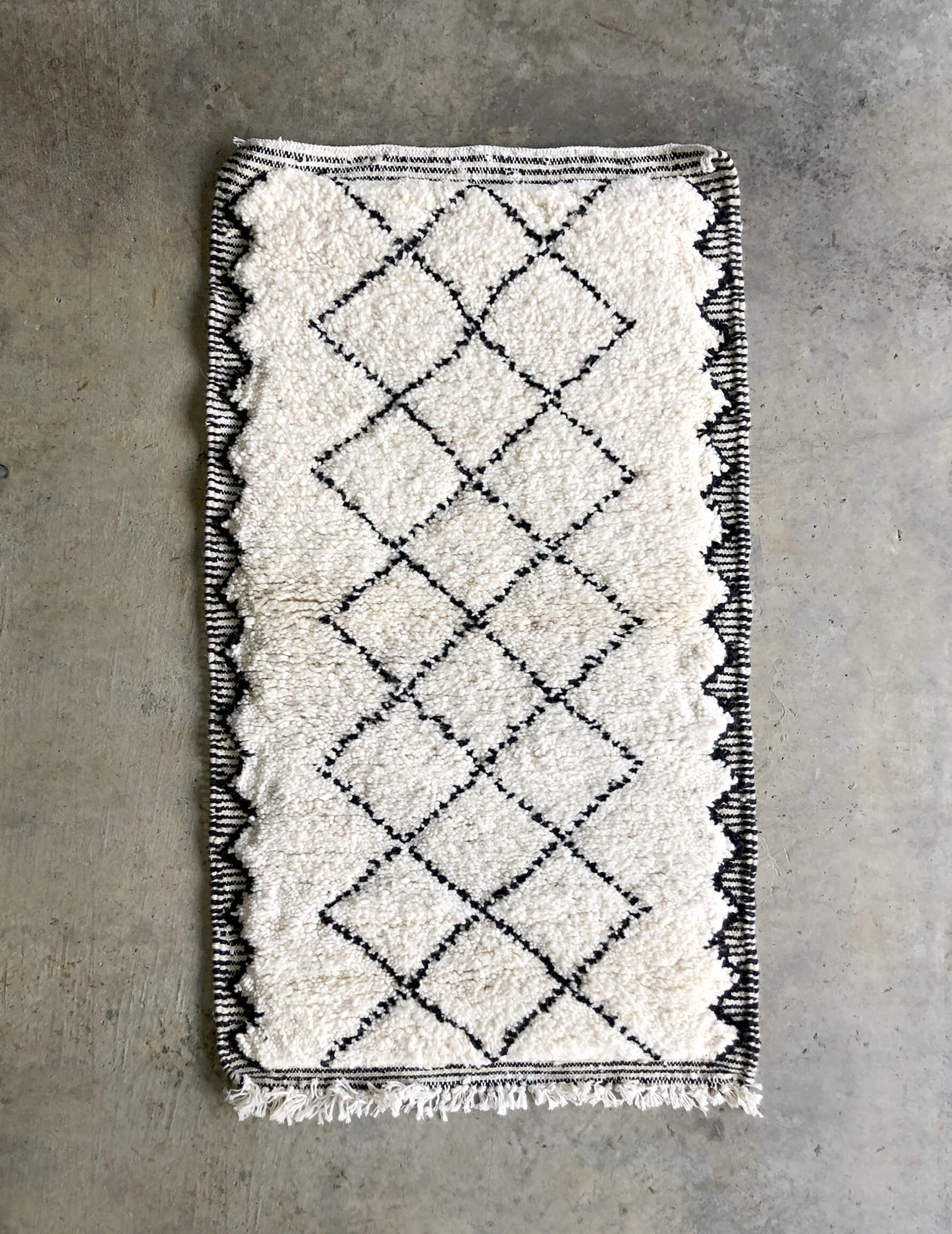 ベニワレンはモロッコのアトラス山脈に住むベルベル人女性によって、一目一目しっかりと結びながら織らているハンドメイドのウールラグです。白を基調とし黒の細いラインで模様が描かれています。触り心地はふわふわと柔らかく長い毛足が特徴です。白を基調としたシンプルなデザインとナチュラルな色合いは、コーディネートの幅も広く他のインテリアとも調和しやすいです。
