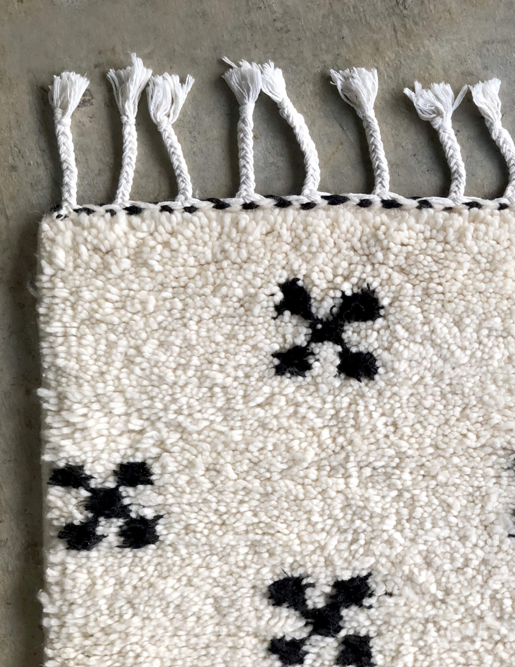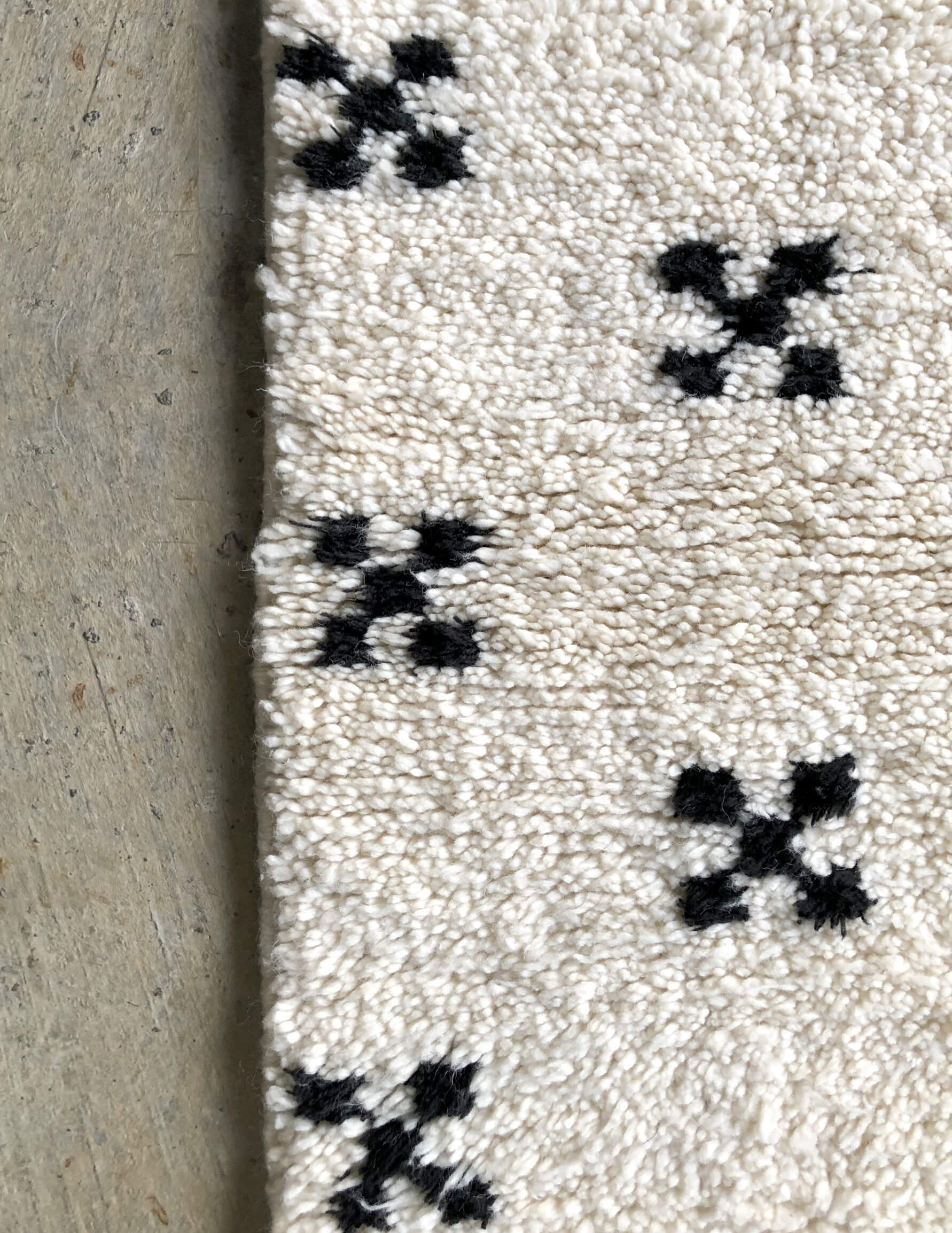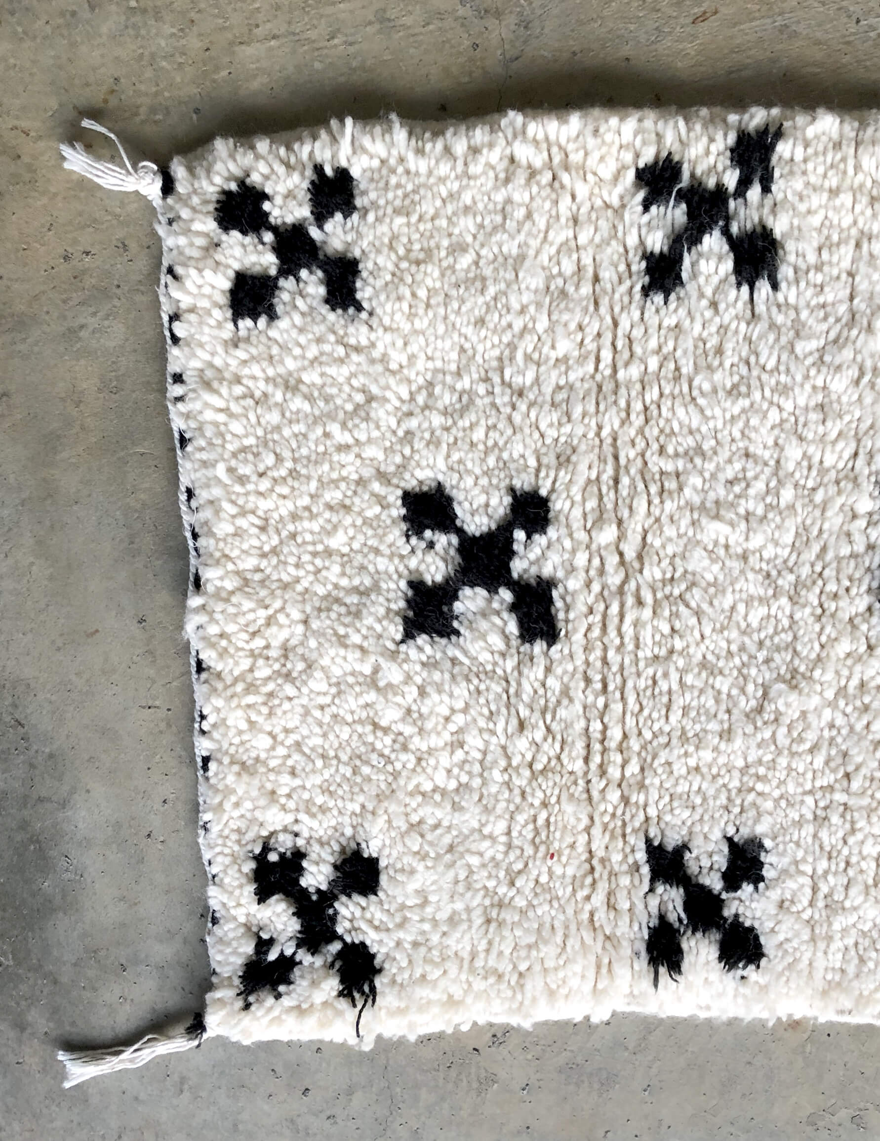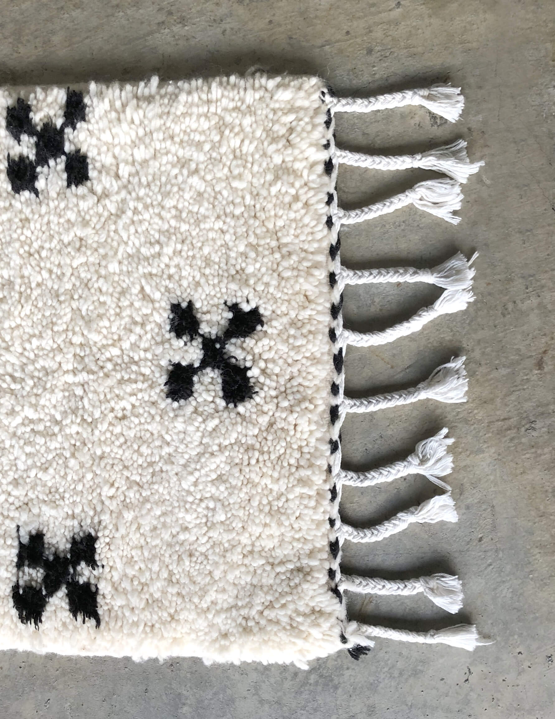 ベニワレンはモロッコのアトラス山脈に住むベルベル人女性によって、一目一目しっかりと結びながら織らているハンドメイドのウールラグです。白を基調とし黒の細いラインで模様が描かれています。触り心地はふわふわと柔らかく長い毛足が特徴です。白を基調としたシンプルなデザインとナチュラルな色合いは、コーディネートの幅も広く他のインテリアとも調和しやすいです。
