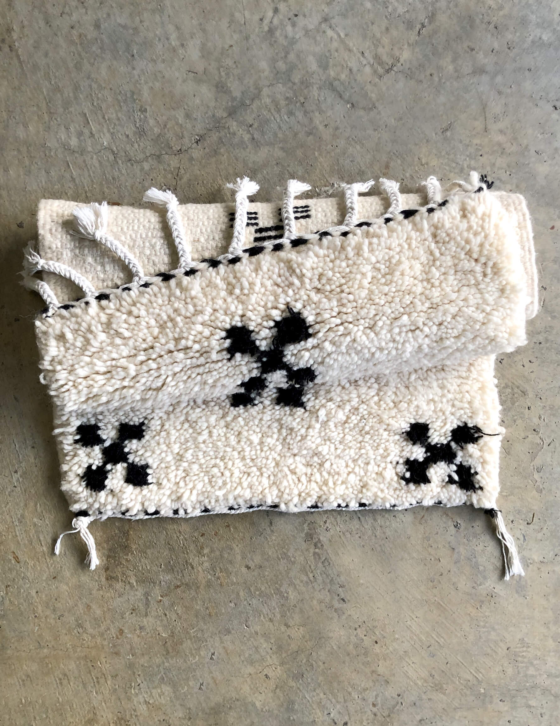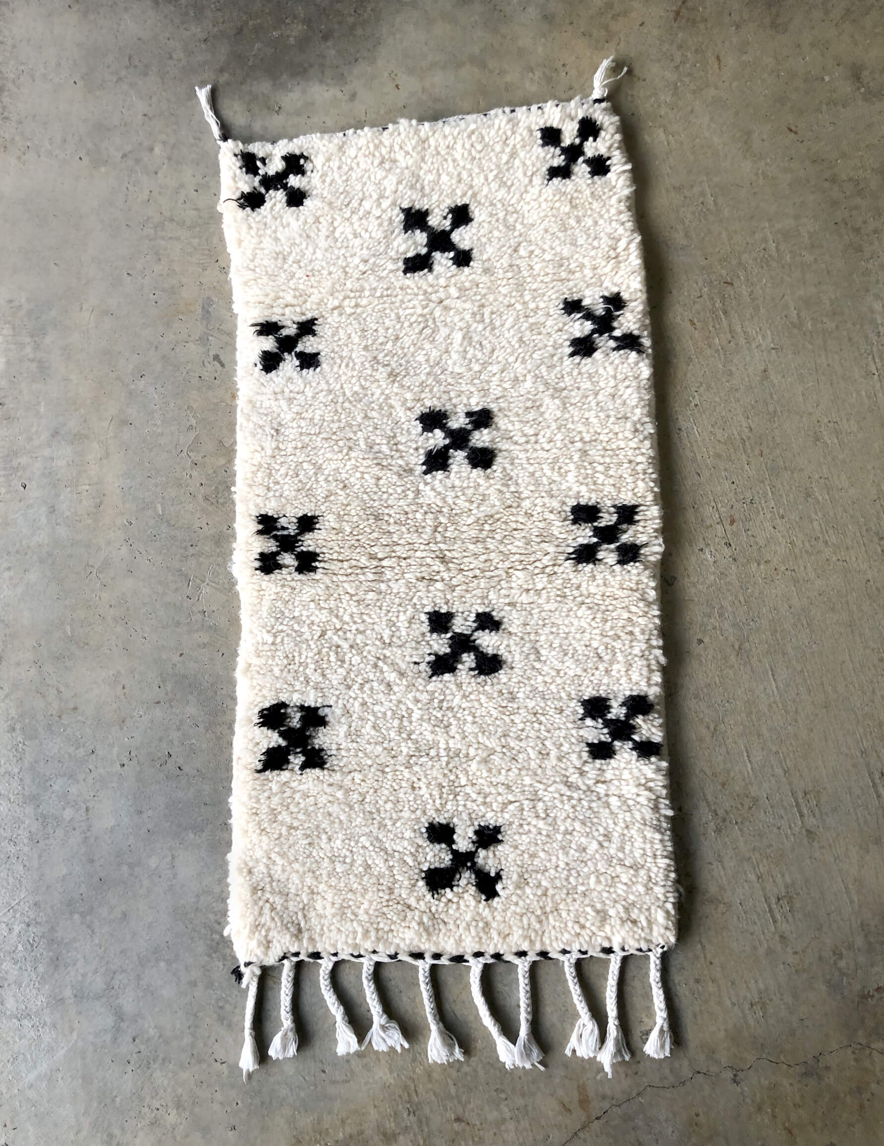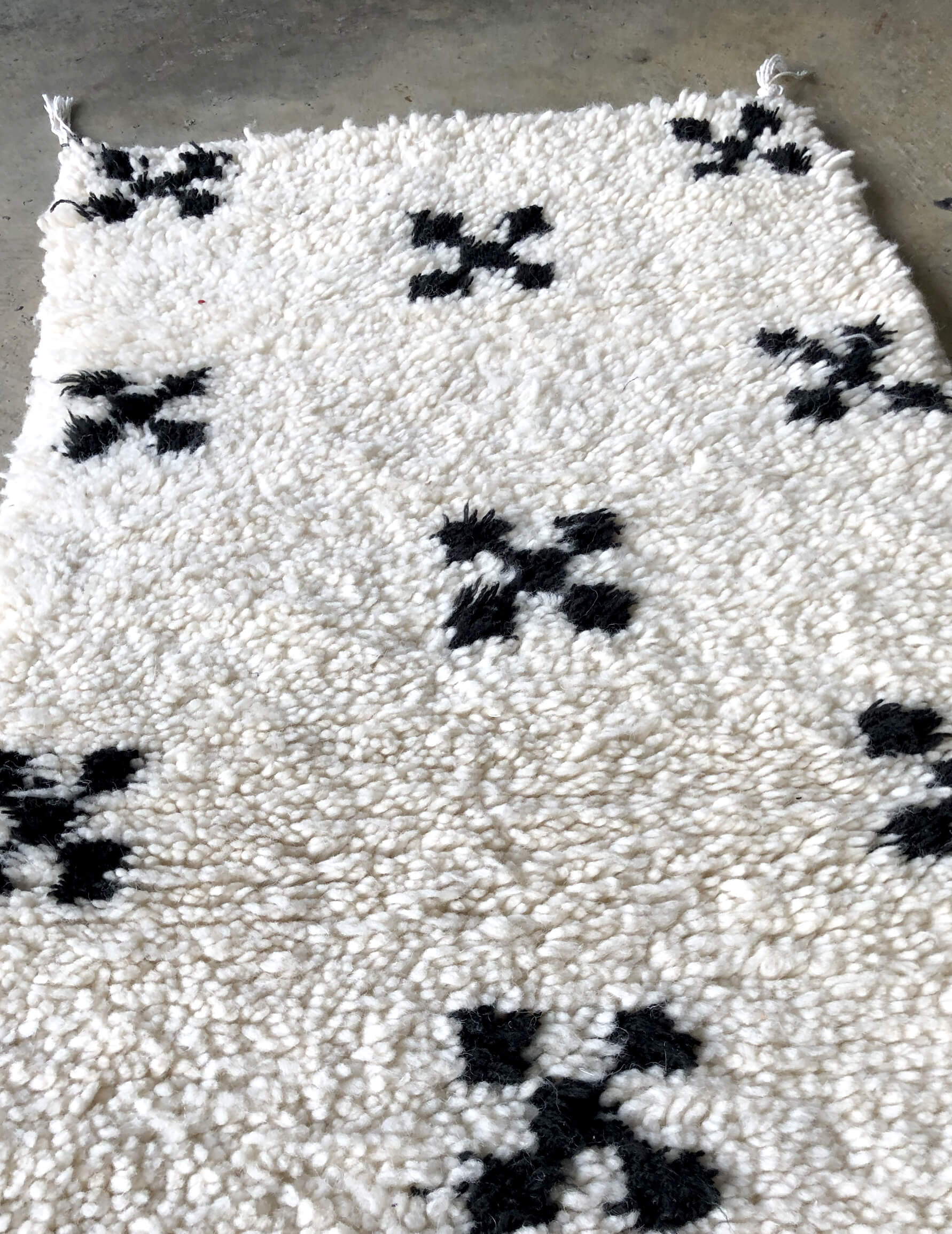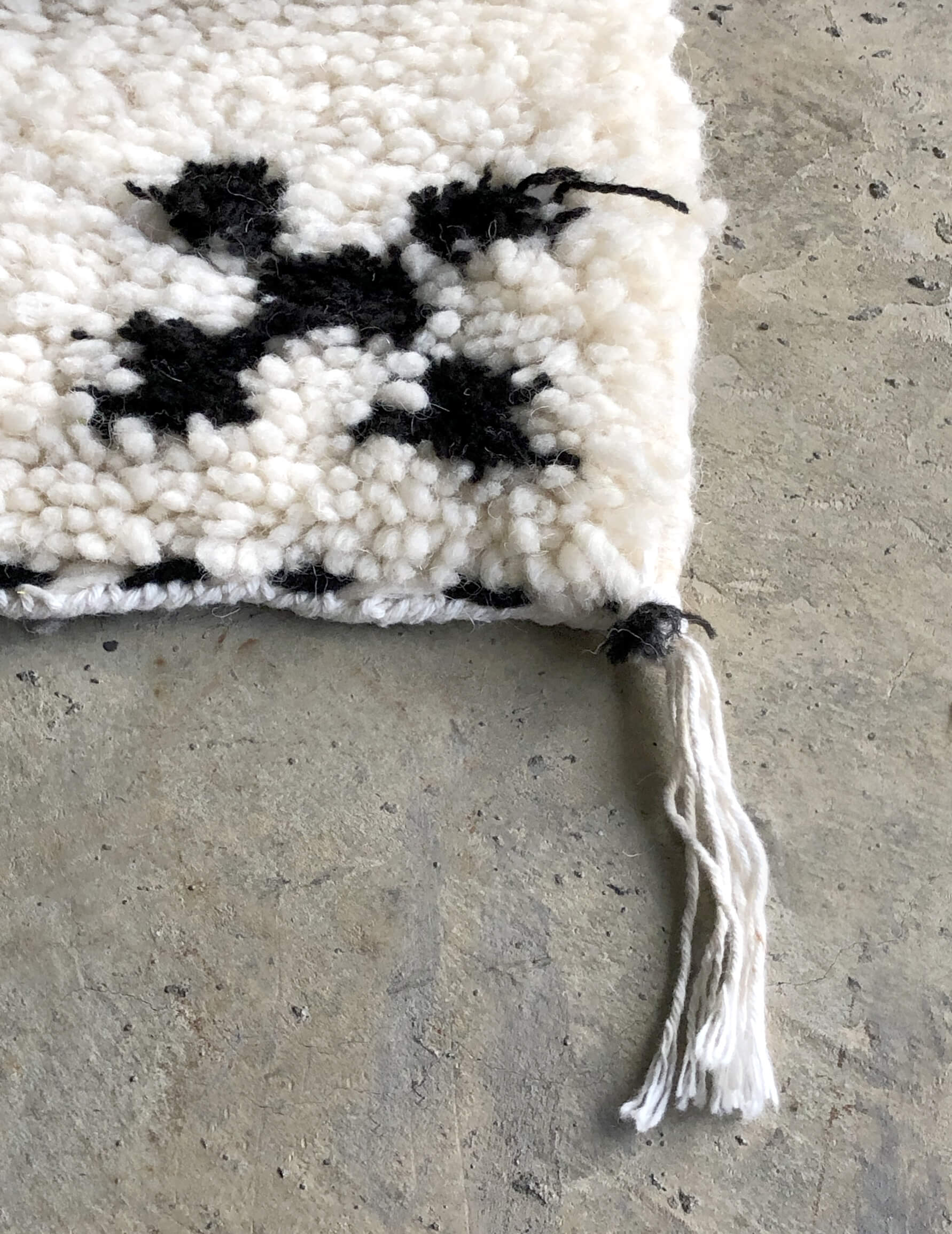ベニワレンはモロッコのアトラス山脈に住むベルベル人女性によって、一目一目しっかりと結びながら織らているハンドメイドのウールラグです。白を基調とし黒の細いラインで模様が描かれています。触り心地はふわふわと柔らかく長い毛足が特徴です。白を基調としたシンプルなデザインとナチュラルな色合いは、コーディネートの幅も広く他のインテリアとも調和しやすいです。