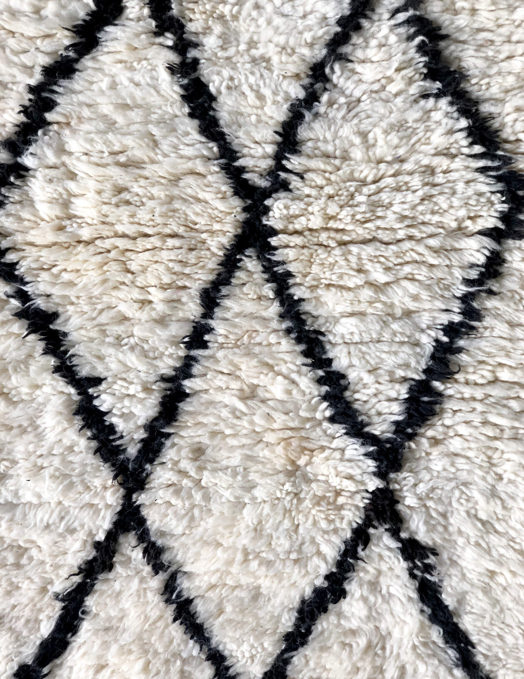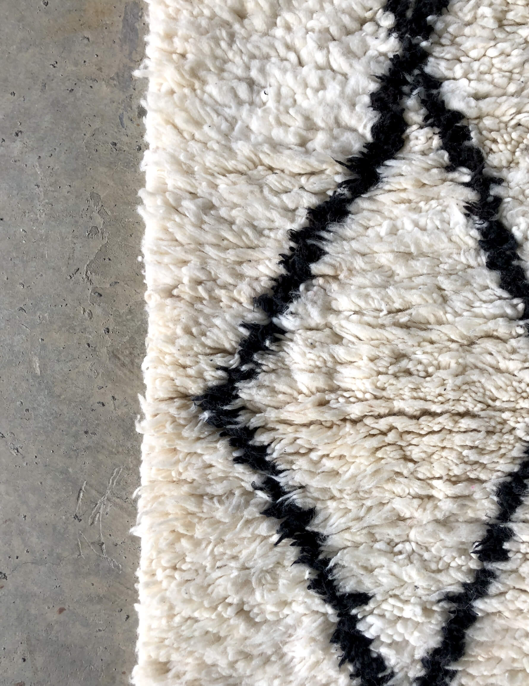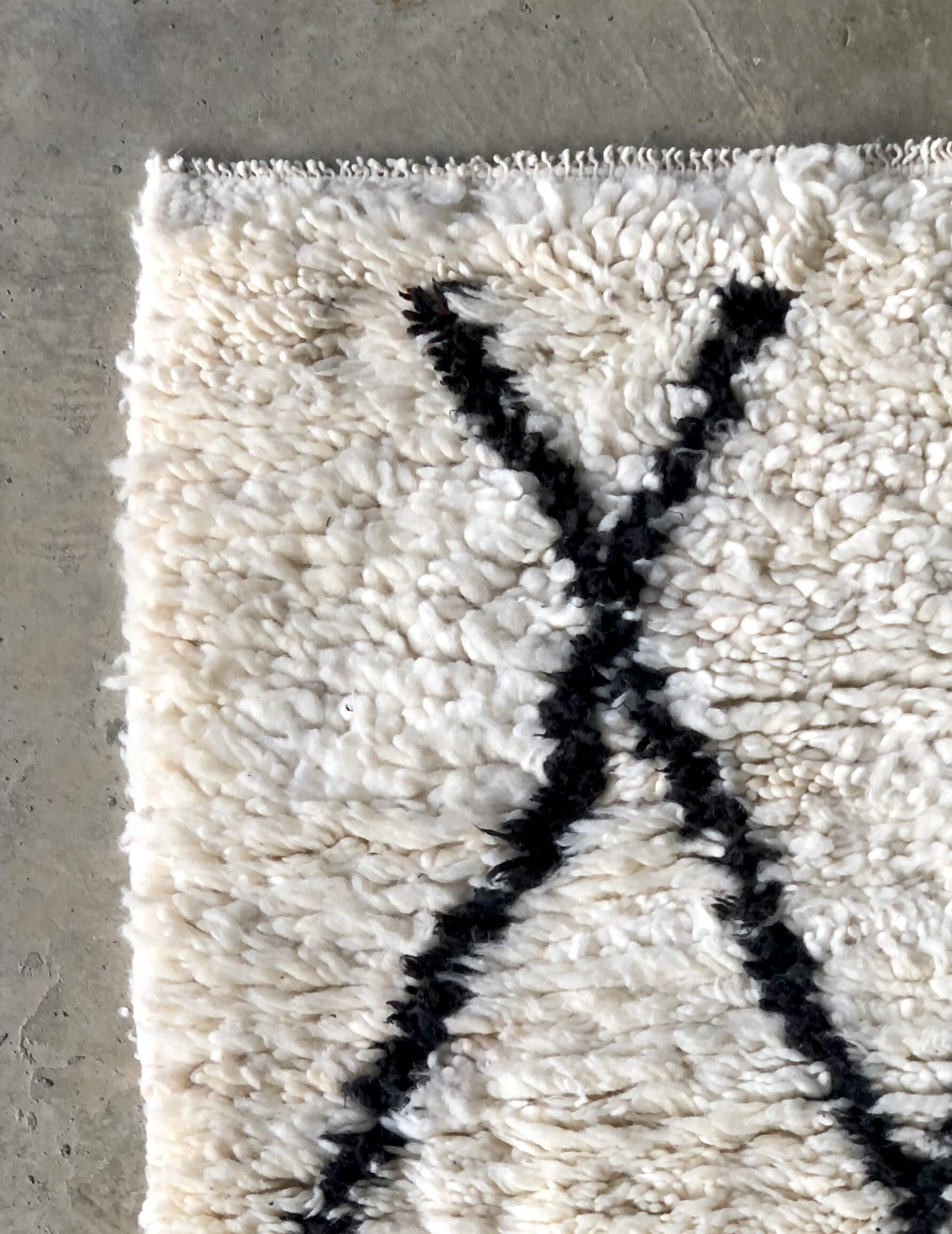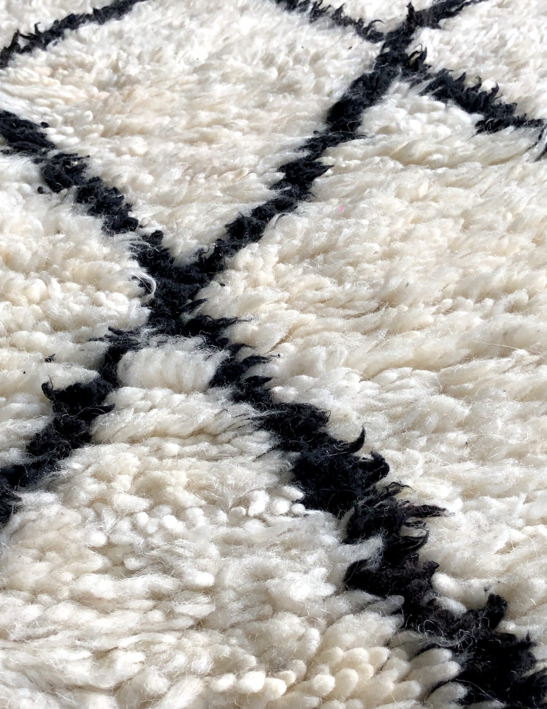 ベニワレンはモロッコのアトラス山脈に住むベルベル人女性によって、一目一目しっかりと結びながら織らているハンドメイドのウールラグです。白を基調とし黒の細いラインで模様が描かれています。触り心地はふわふわと柔らかく長い毛足が特徴です。白を基調としたシンプルなデザインとナチュラルな色合いは、コーディネートの幅も広く他のインテリアとも調和しやすいです。