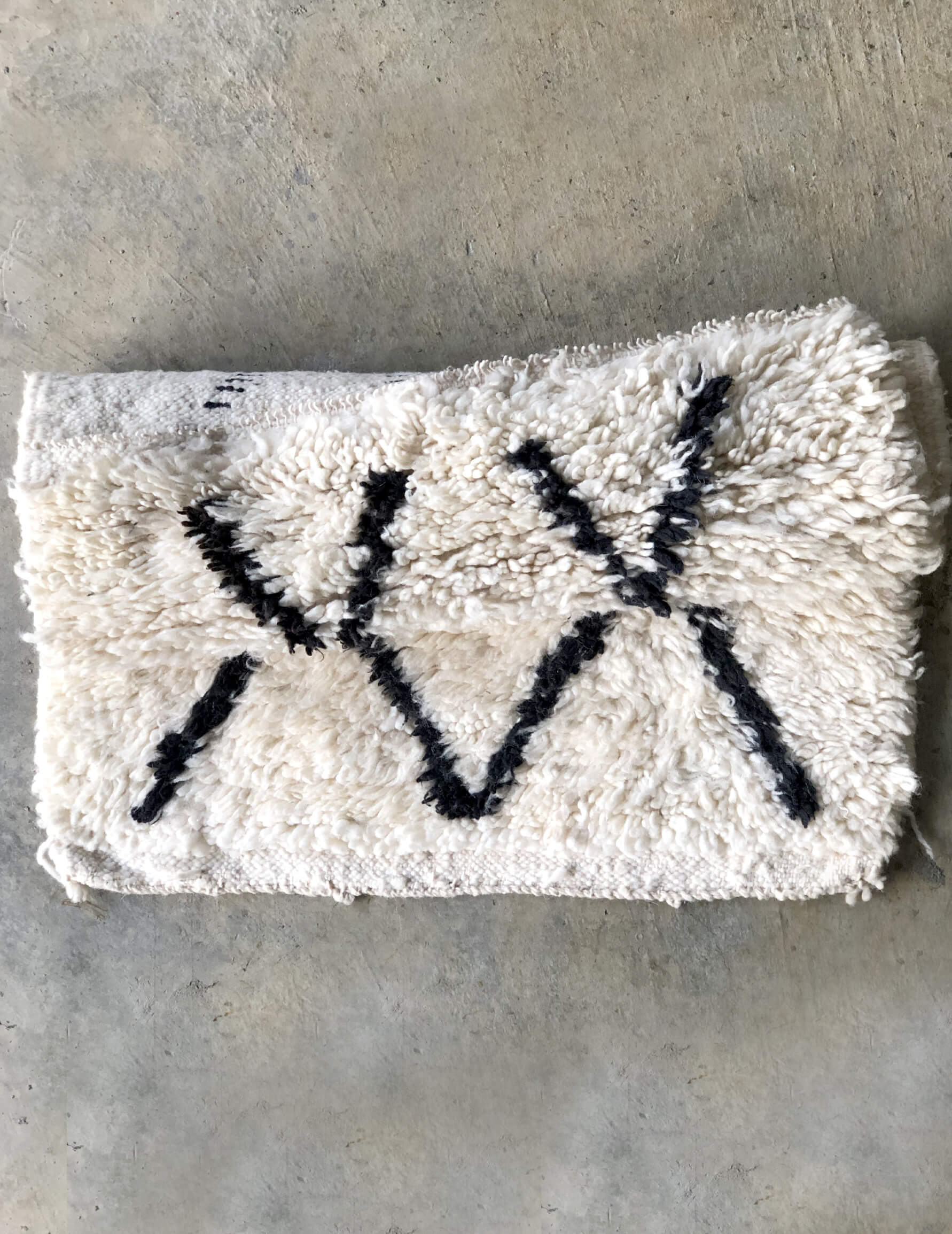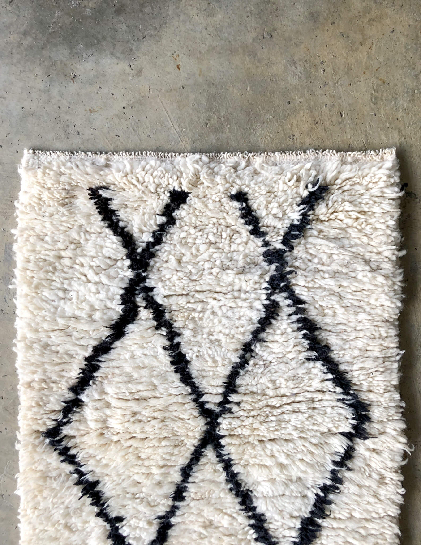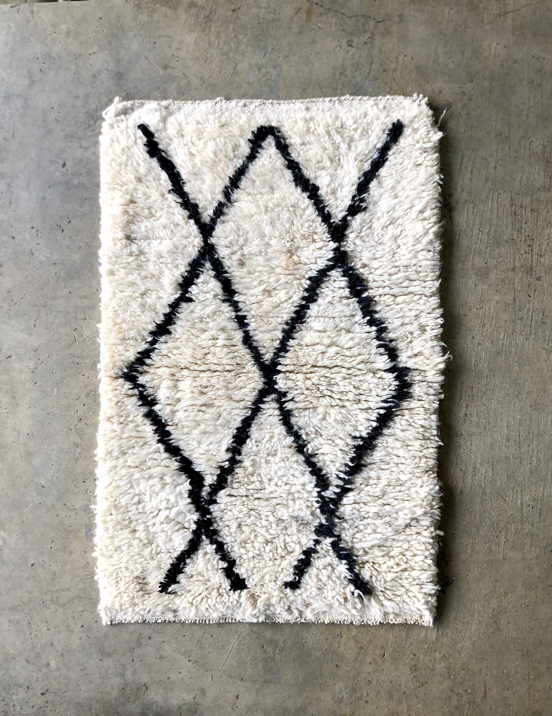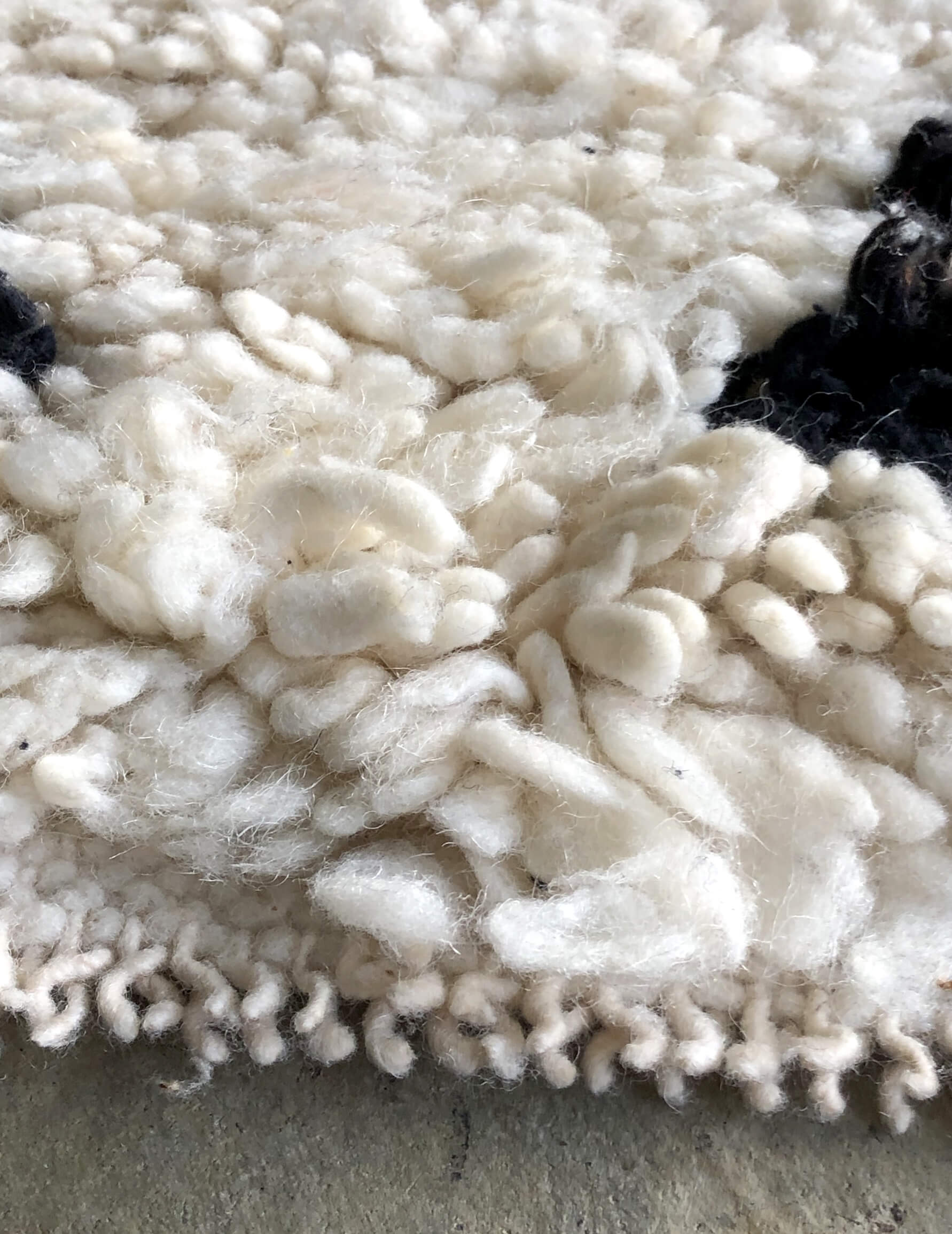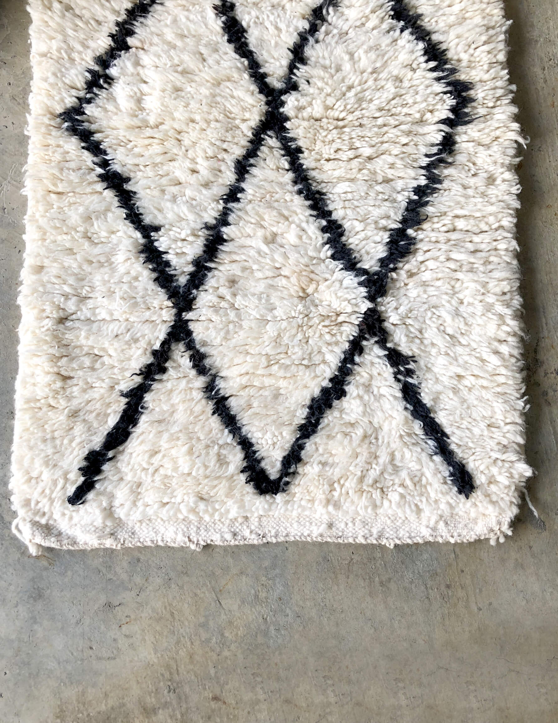 ベニワレンはモロッコのアトラス山脈に住むベルベル人女性によって、一目一目しっかりと結びながら織らているハンドメイドのウールラグです。白を基調とし黒の細いラインで模様が描かれています。触り心地はふわふわと柔らかく長い毛足が特徴です。白を基調としたシンプルなデザインとナチュラルな色合いは、コーディネートの幅も広く他のインテリアとも調和しやすいです。