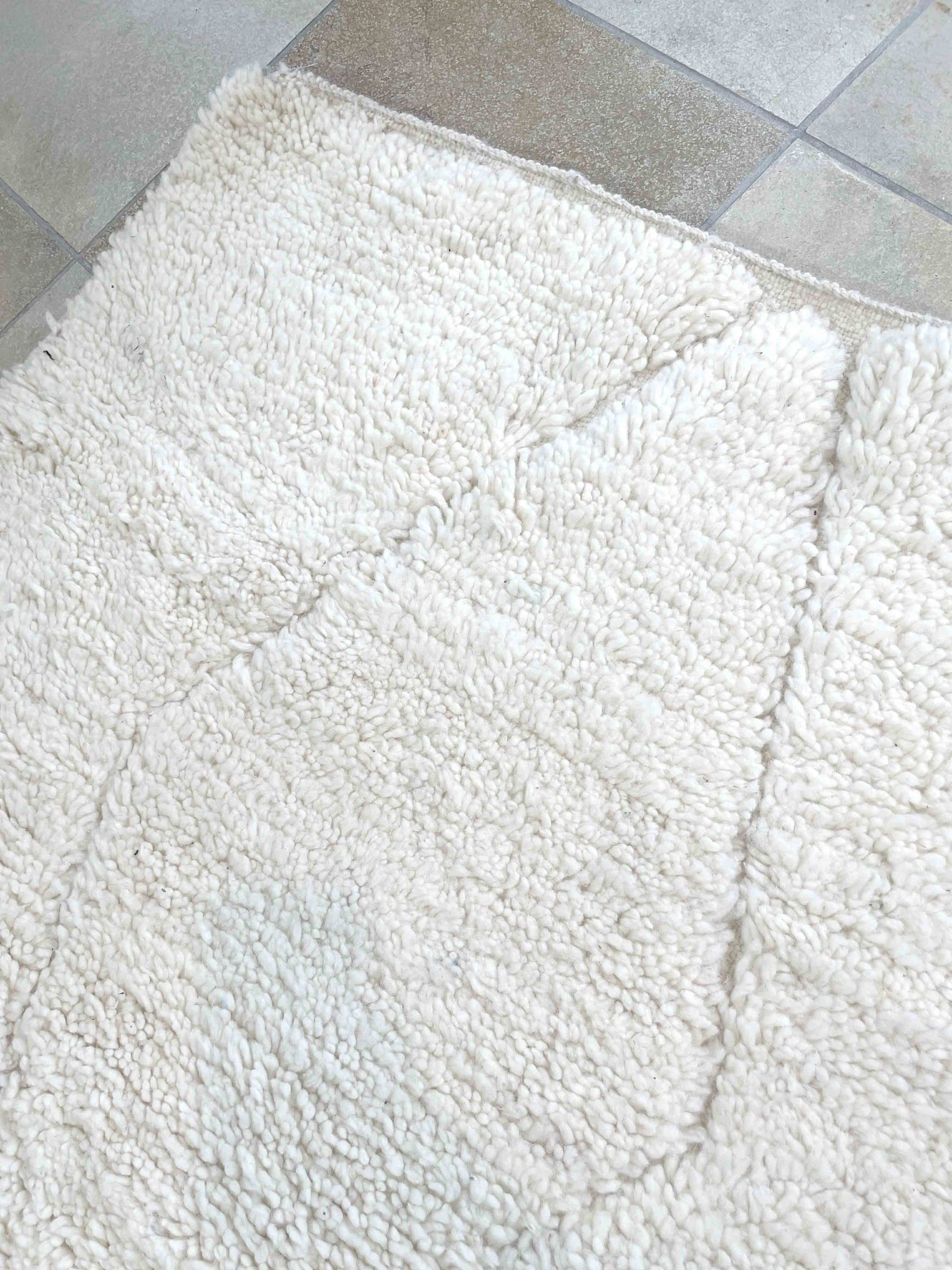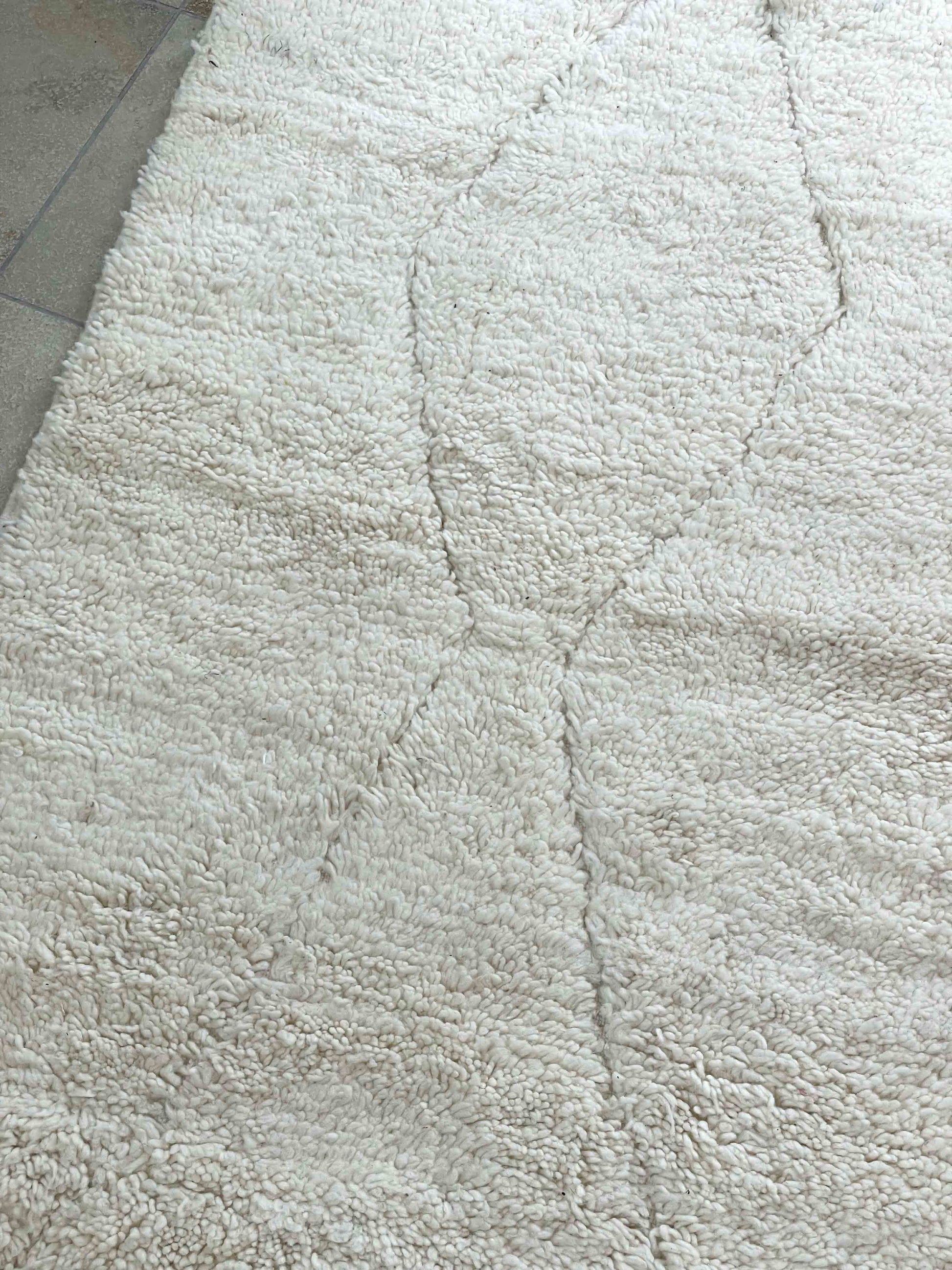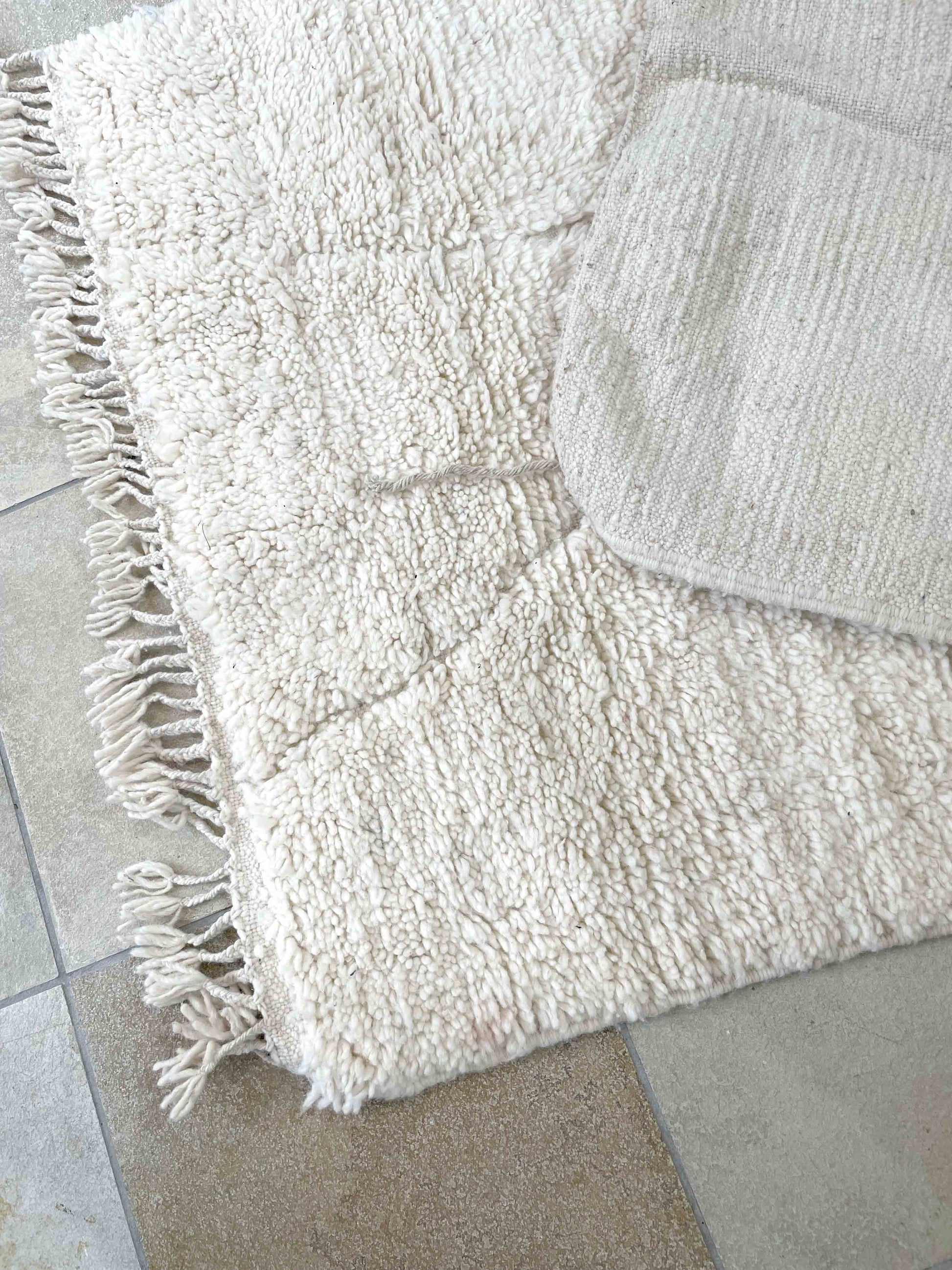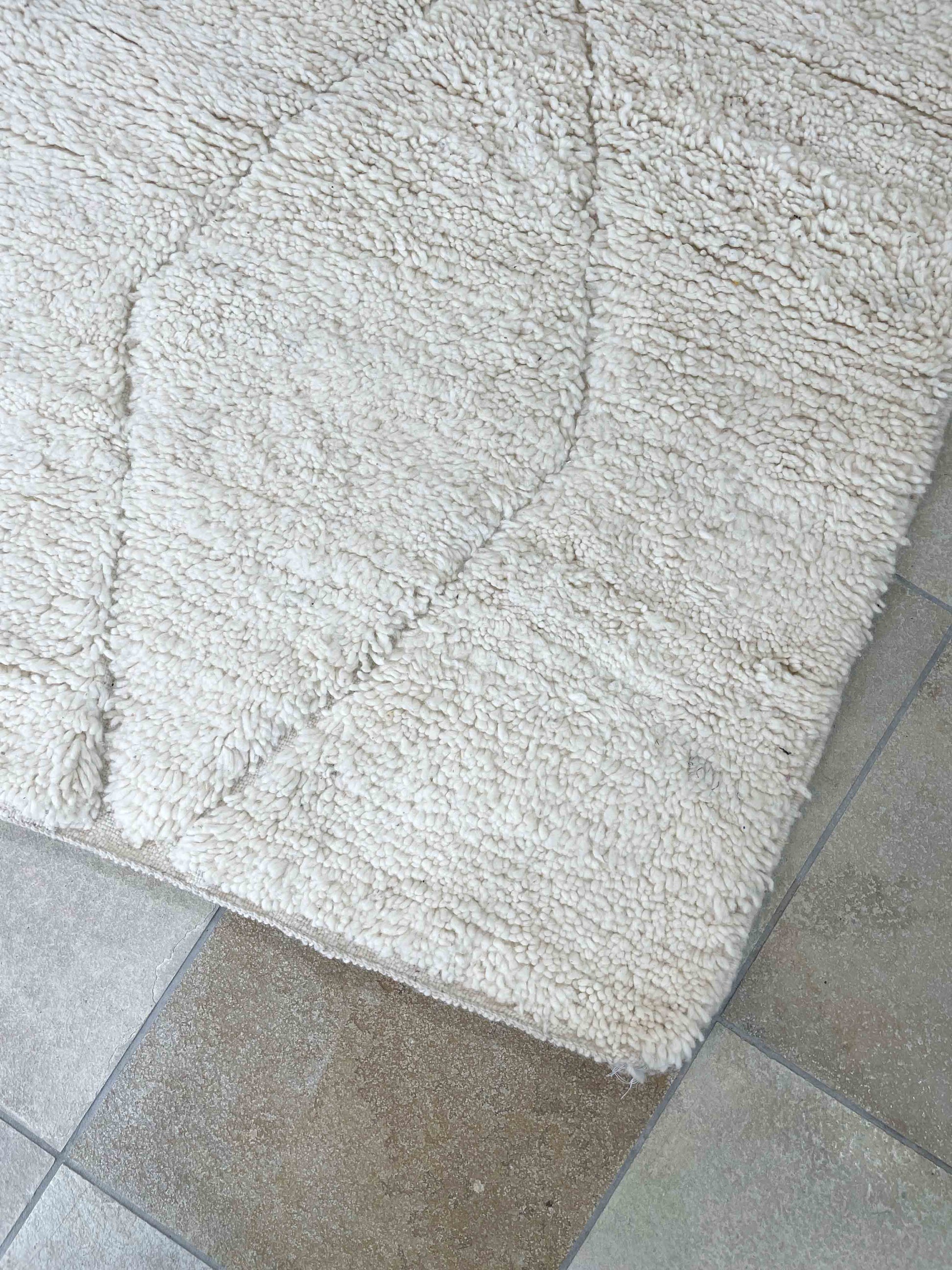 ベニワレンはモロッコのアトラス山脈に住むベルベル人女性によって、一目一目しっかりと結びながら織らているハンドメイドのウールラグです。白を基調とし黒の細いラインで模様が描かれています。触り心地はふわふわと柔らかく長い毛足が特徴です。白を基調としたシンプルなデザインとナチュラルな色合いは、コーディネートの幅も広く他のインテリアとも調和しやすいです。