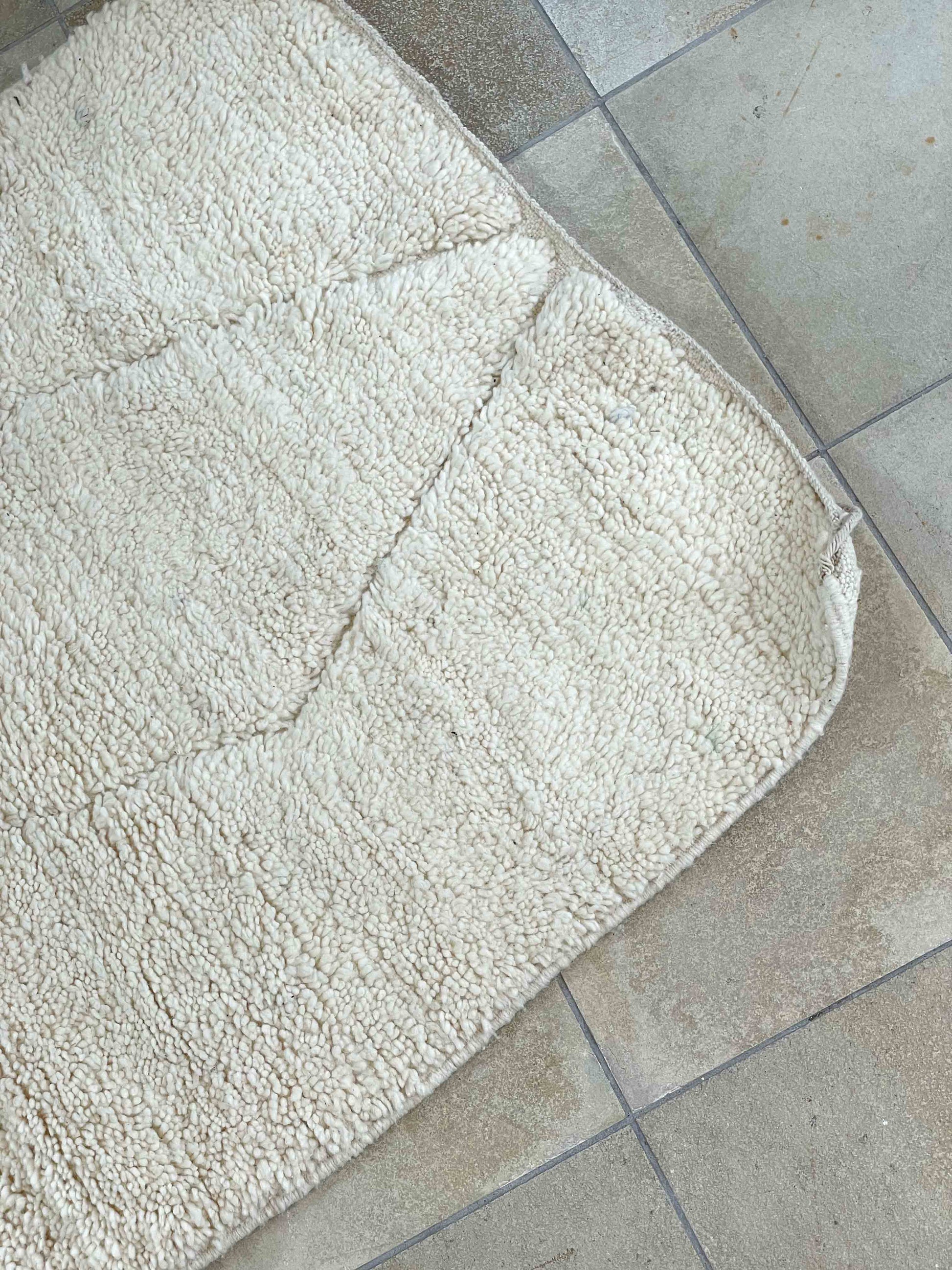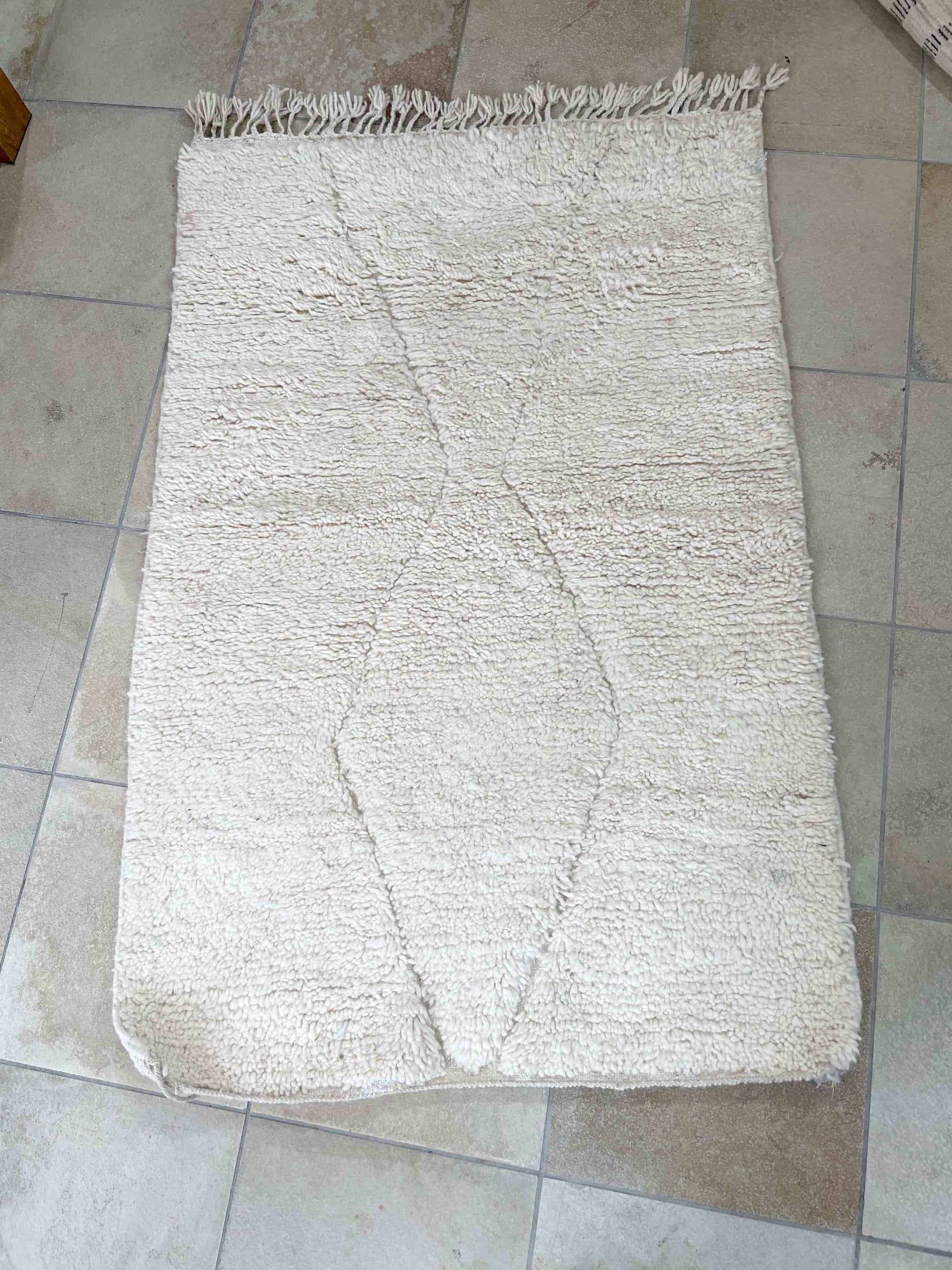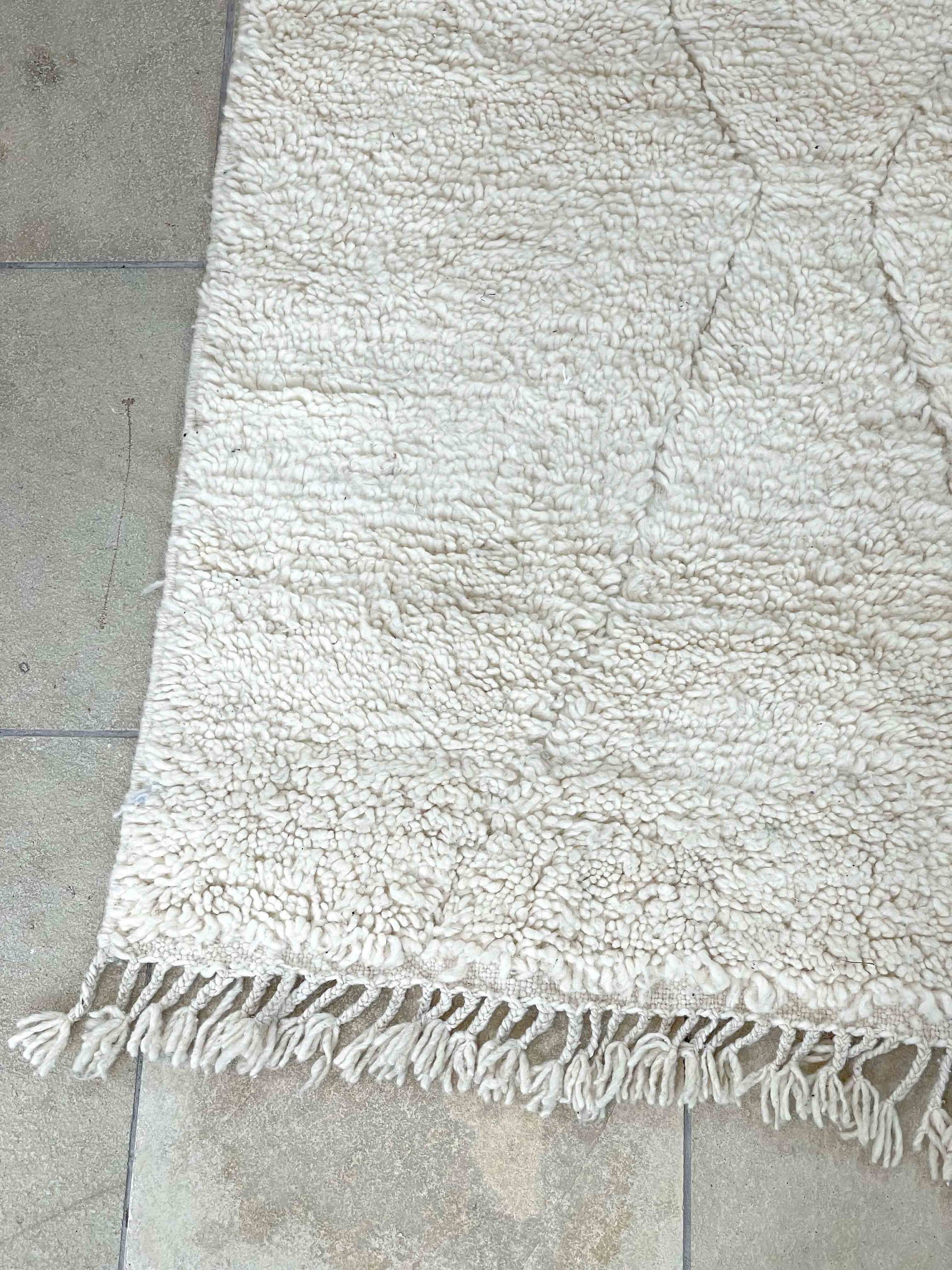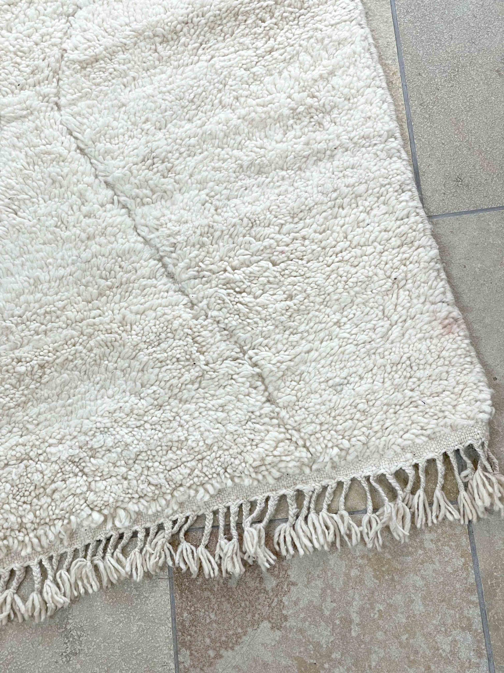 ベニワレンはモロッコのアトラス山脈に住むベルベル人女性によって、一目一目しっかりと結びながら織らているハンドメイドのウールラグです。白を基調とし黒の細いラインで模様が描かれています。触り心地はふわふわと柔らかく長い毛足が特徴です。白を基調としたシンプルなデザインとナチュラルな色合いは、コーディネートの幅も広く他のインテリアとも調和しやすいです。
