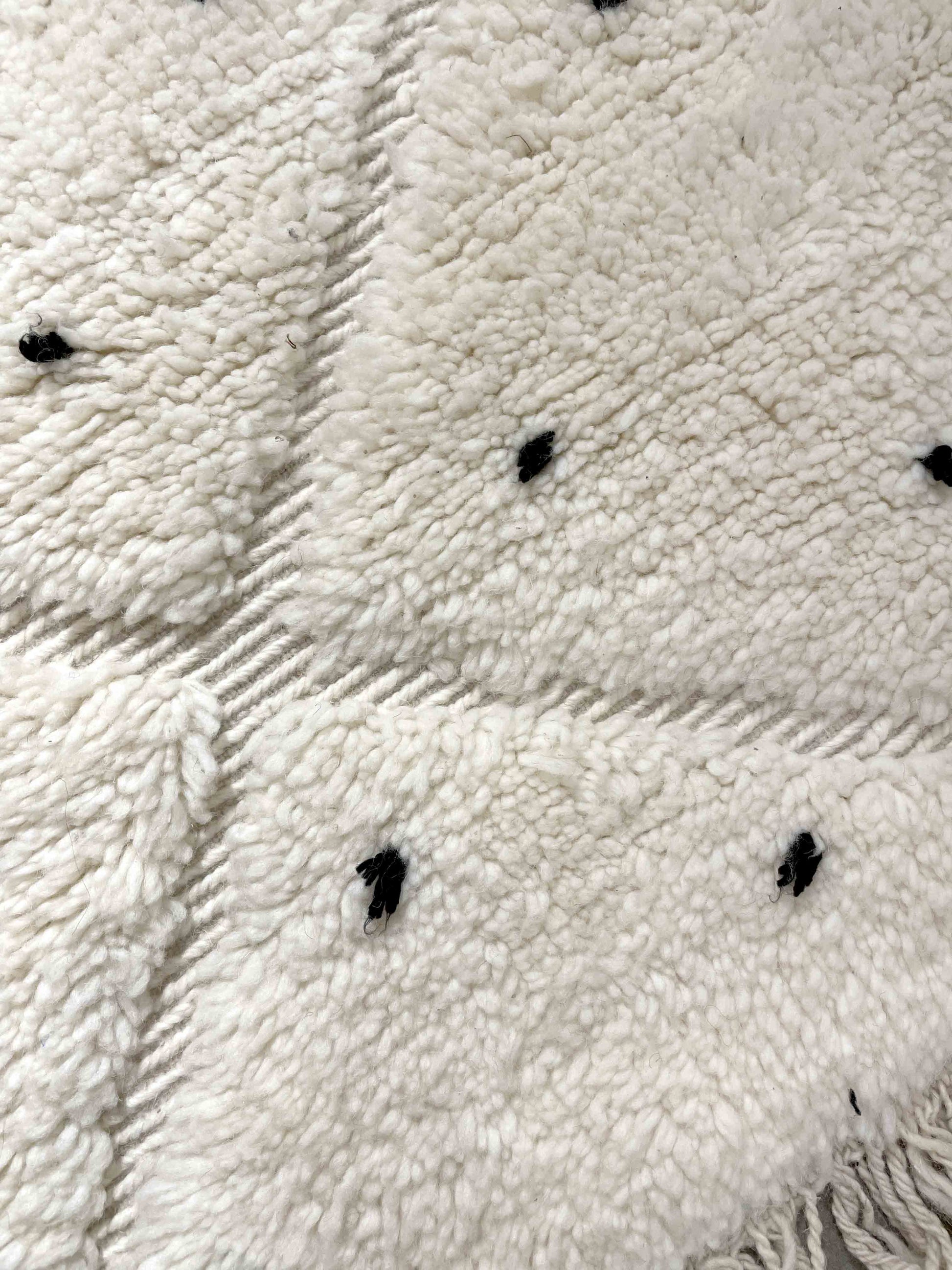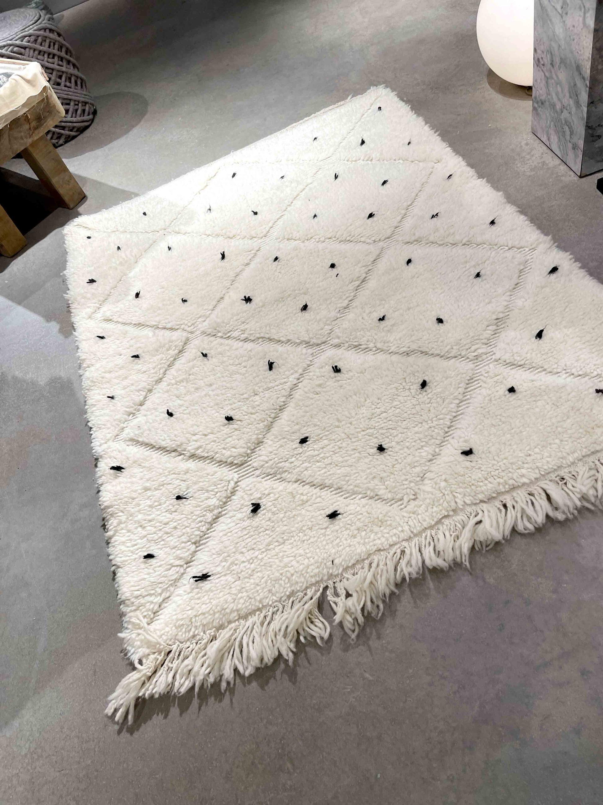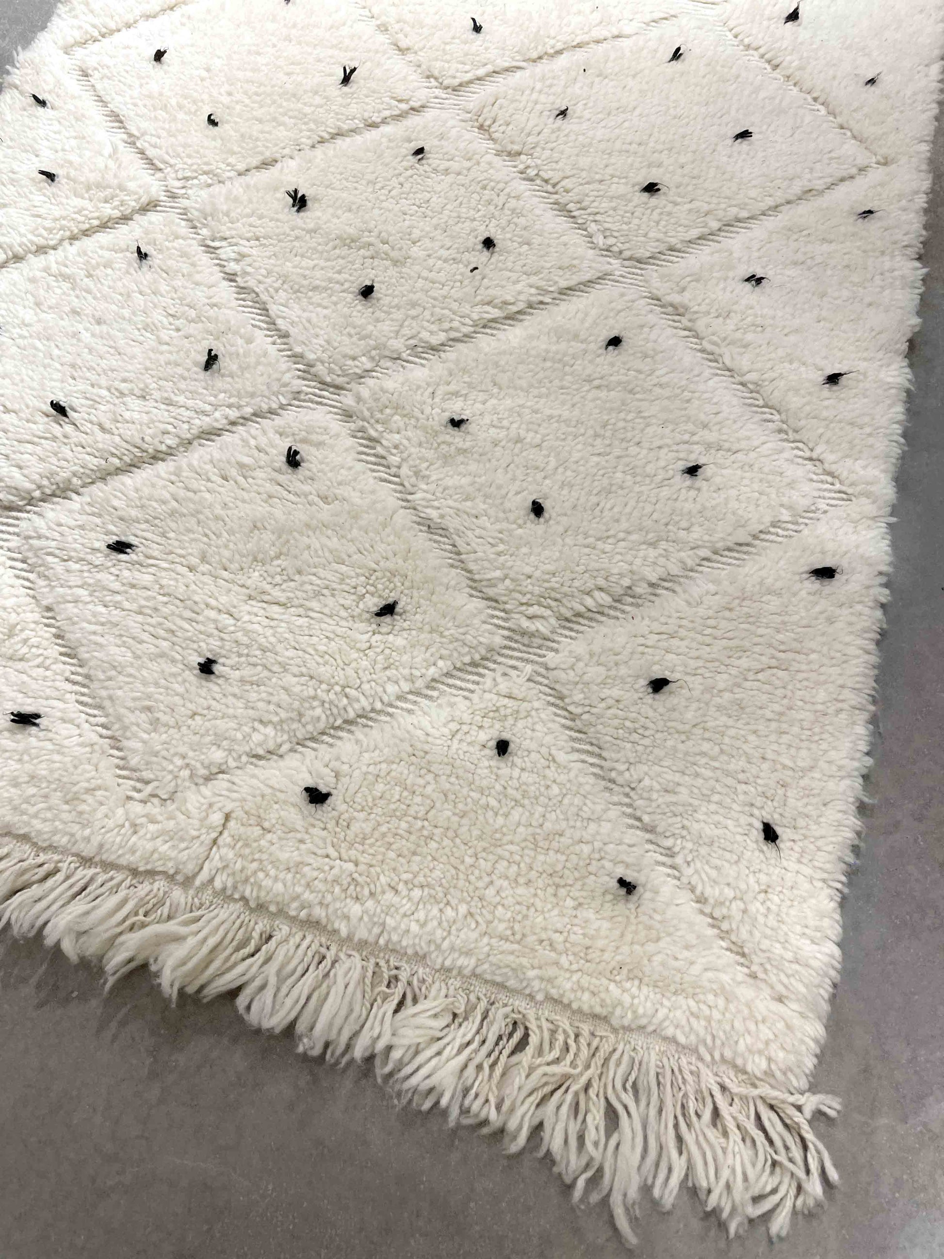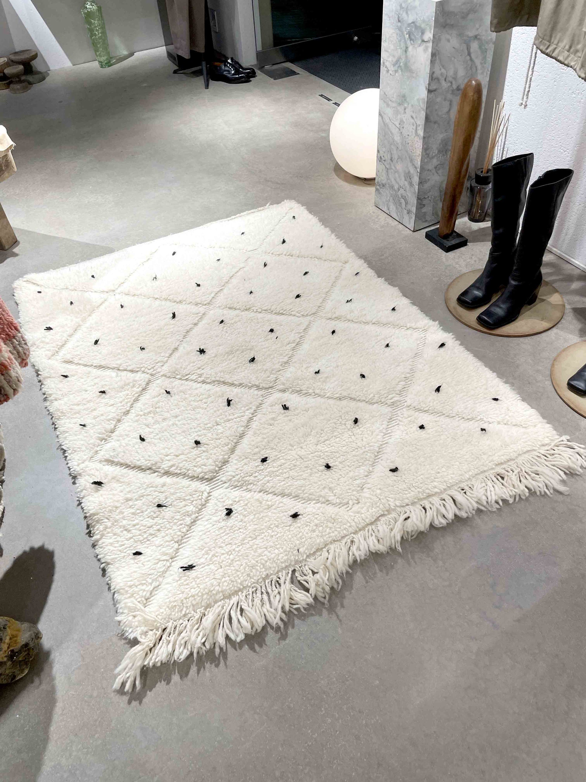 ベニワレンはモロッコのアトラス山脈に住むベルベル人女性によって、一目一目しっかりと結びながら織らているハンドメイドのウールラグです。白を基調とし黒の細いラインで模様が描かれています。触り心地はふわふわと柔らかく長い毛足が特徴です。白を基調としたシンプルなデザインとナチュラルな色合いは、コーディネートの幅も広く他のインテリアとも調和しやすいです。