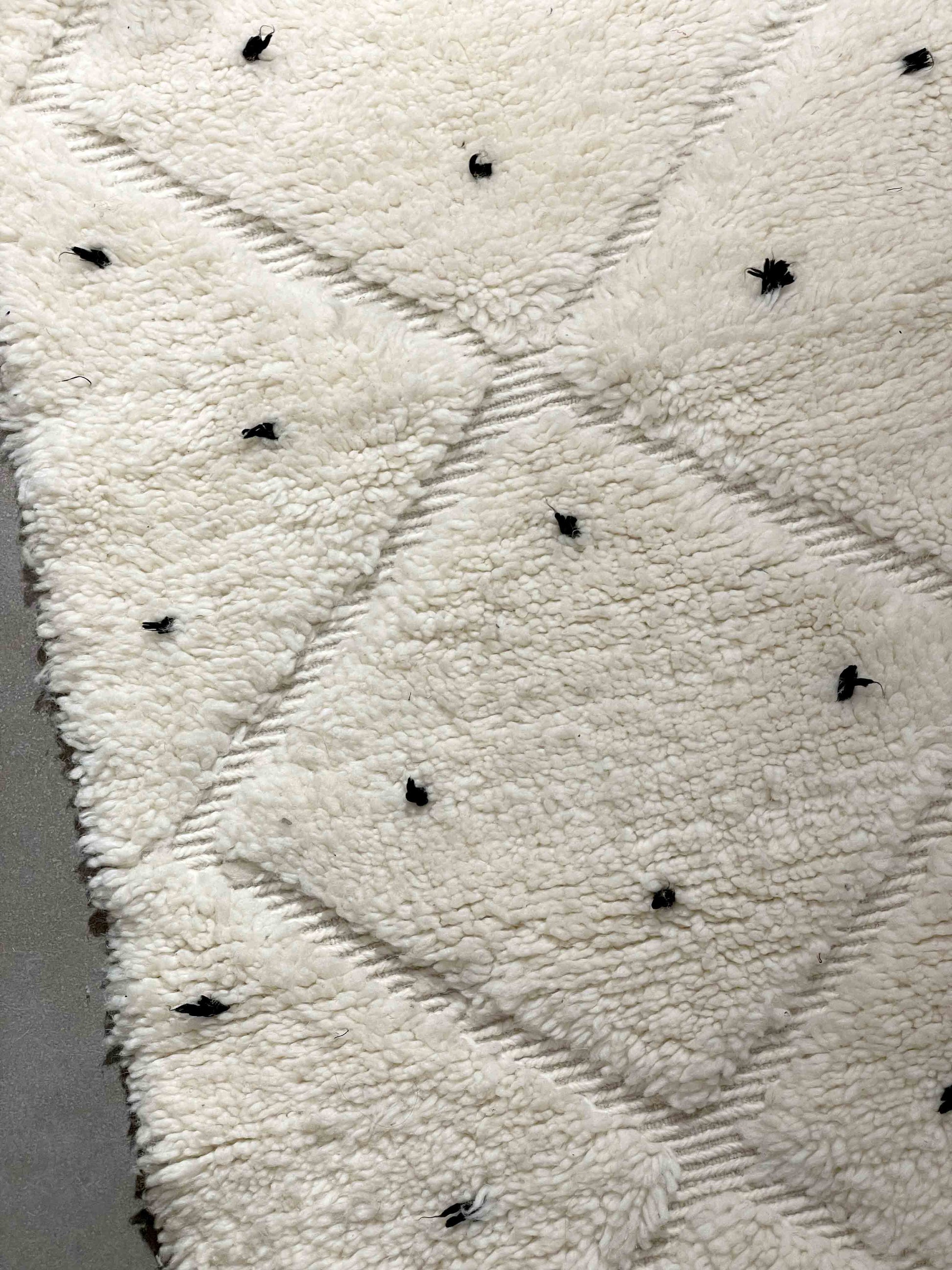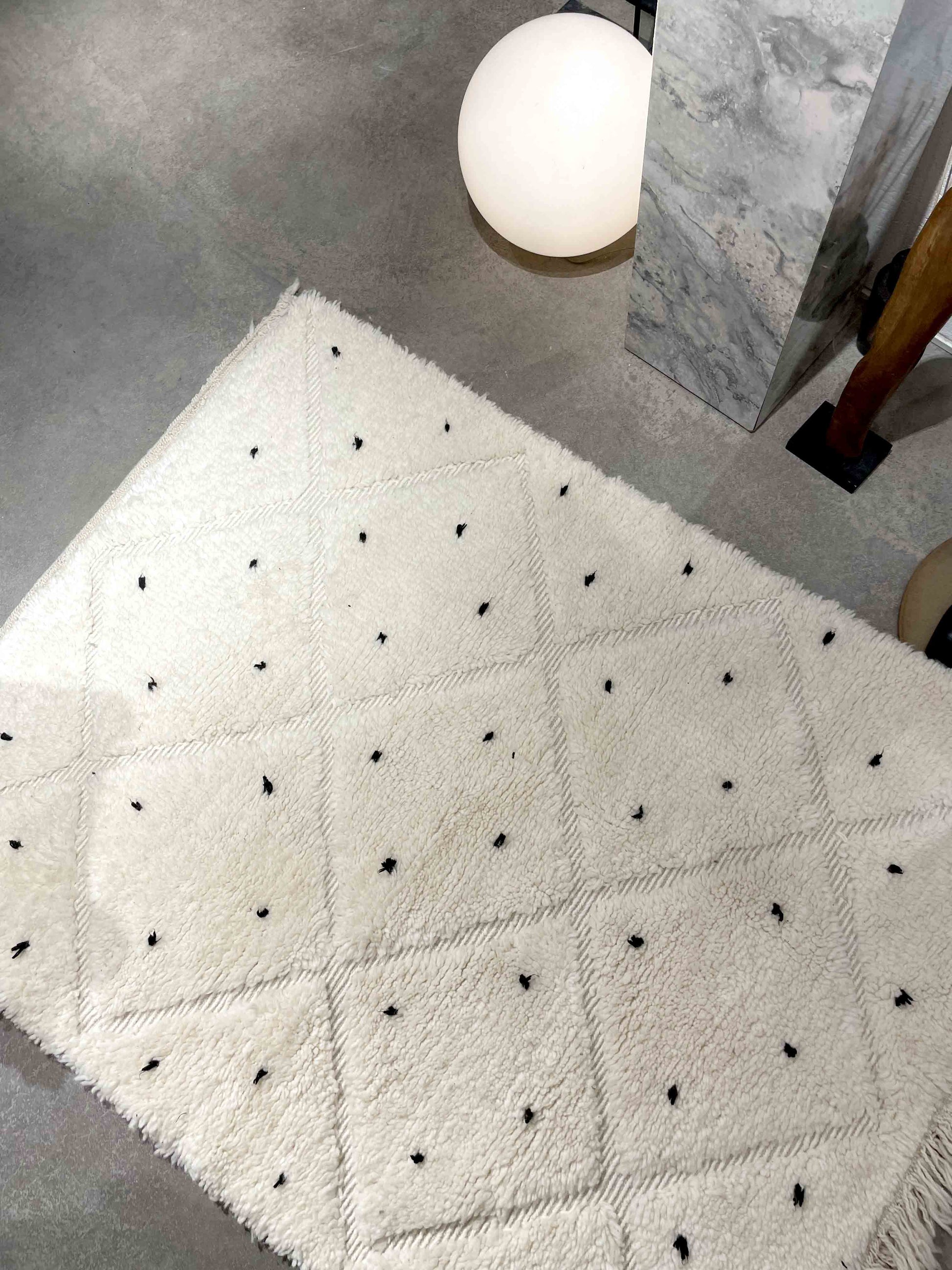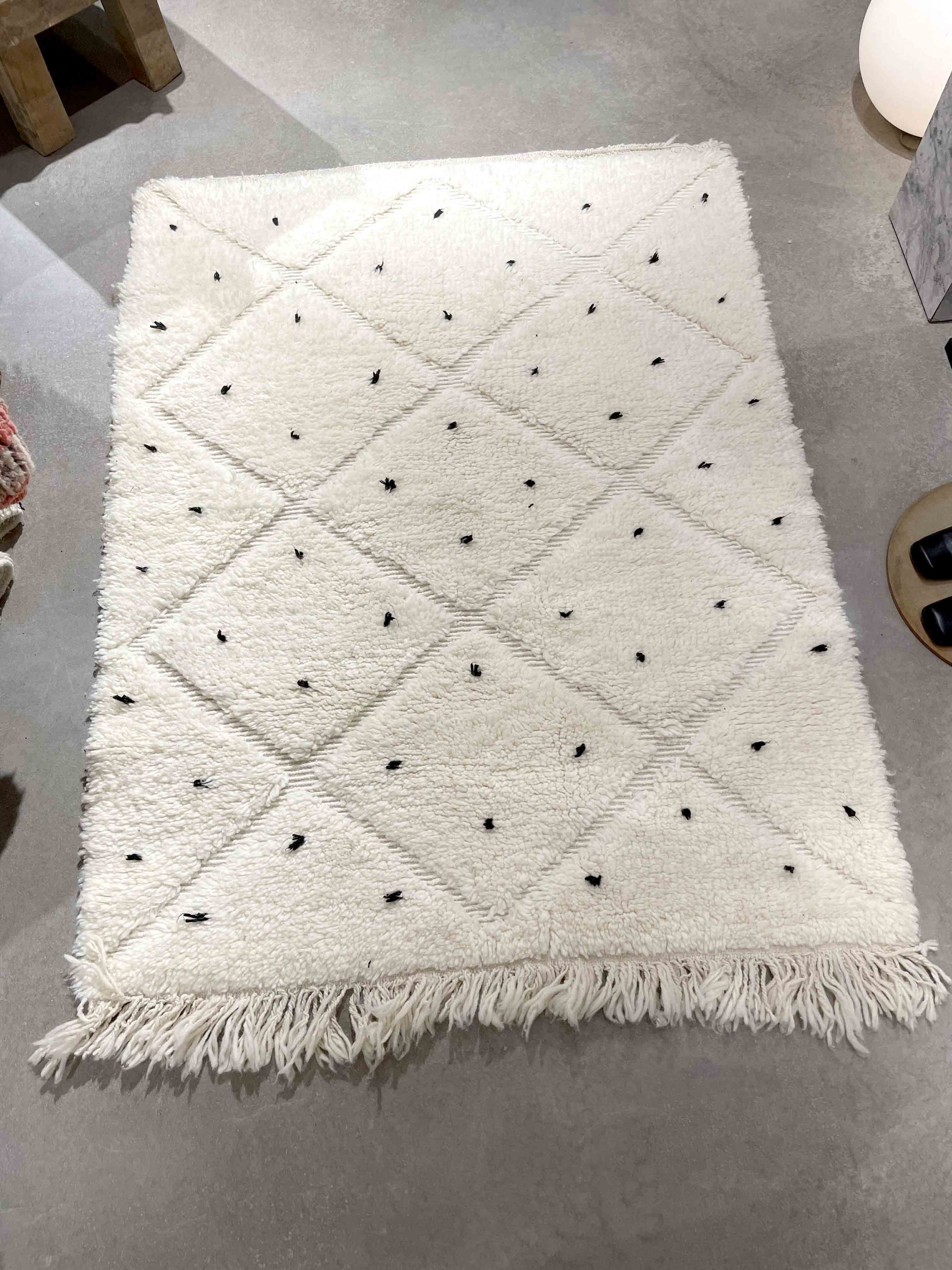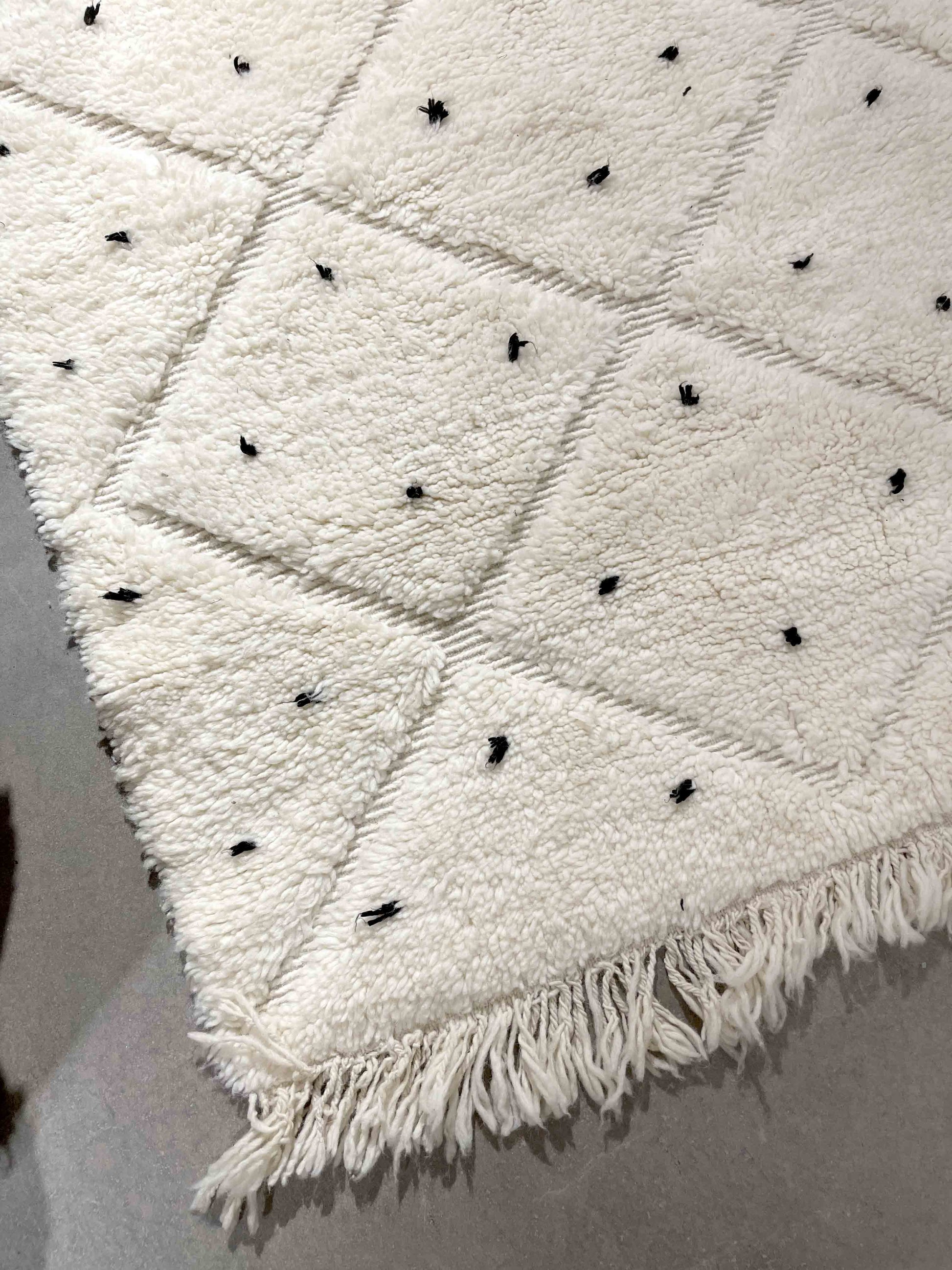 ベニワレンはモロッコのアトラス山脈に住むベルベル人女性によって、一目一目しっかりと結びながら織らているハンドメイドのウールラグです。白を基調とし黒の細いラインで模様が描かれています。触り心地はふわふわと柔らかく長い毛足が特徴です。白を基調としたシンプルなデザインとナチュラルな色合いは、コーディネートの幅も広く他のインテリアとも調和しやすいです。
