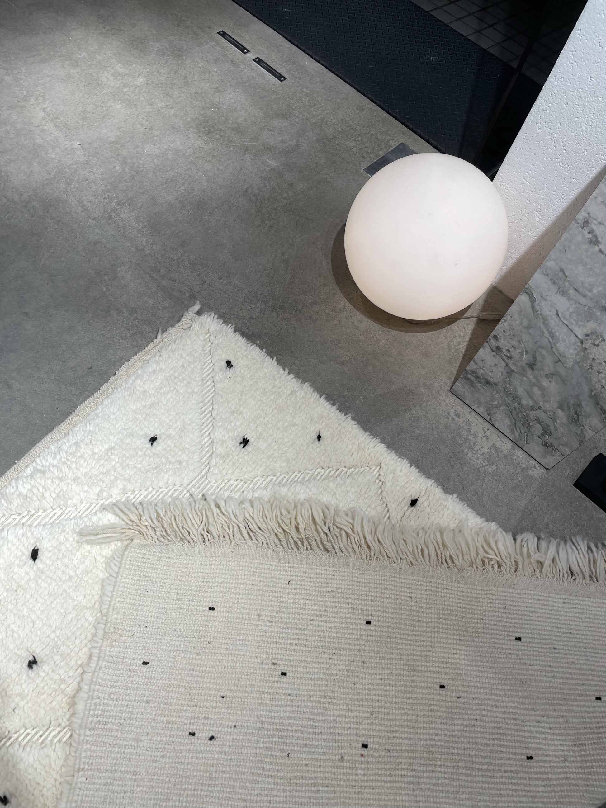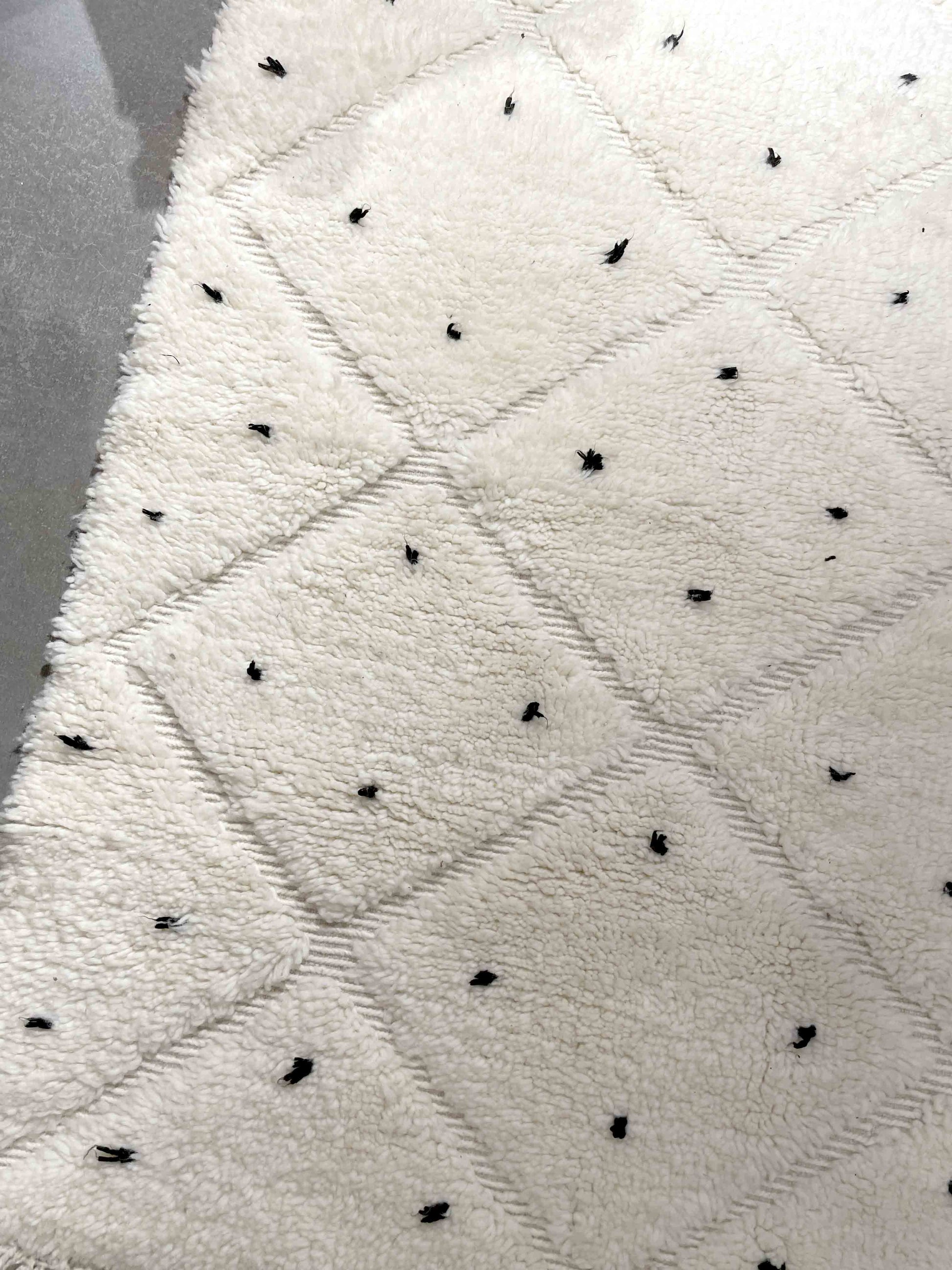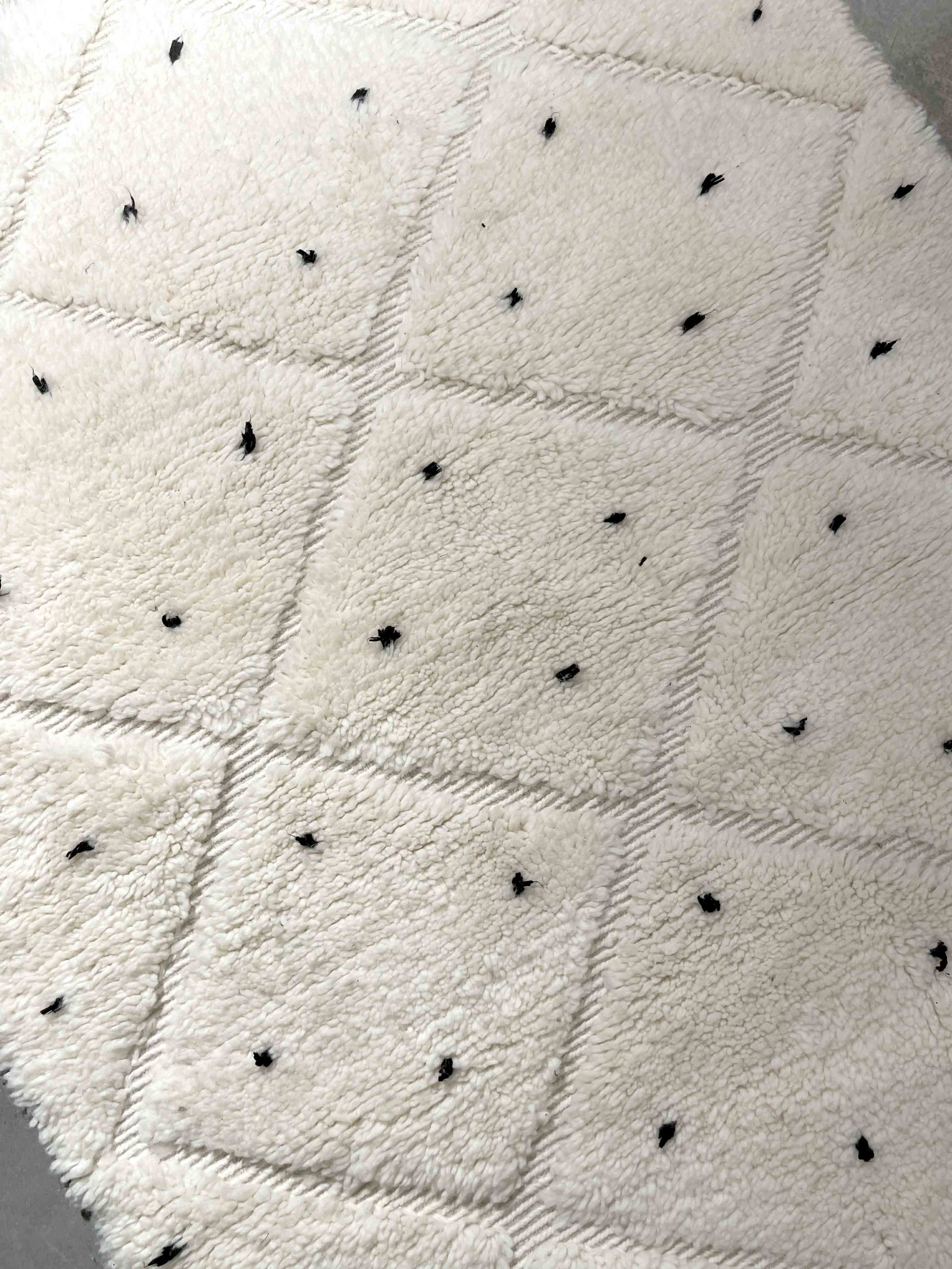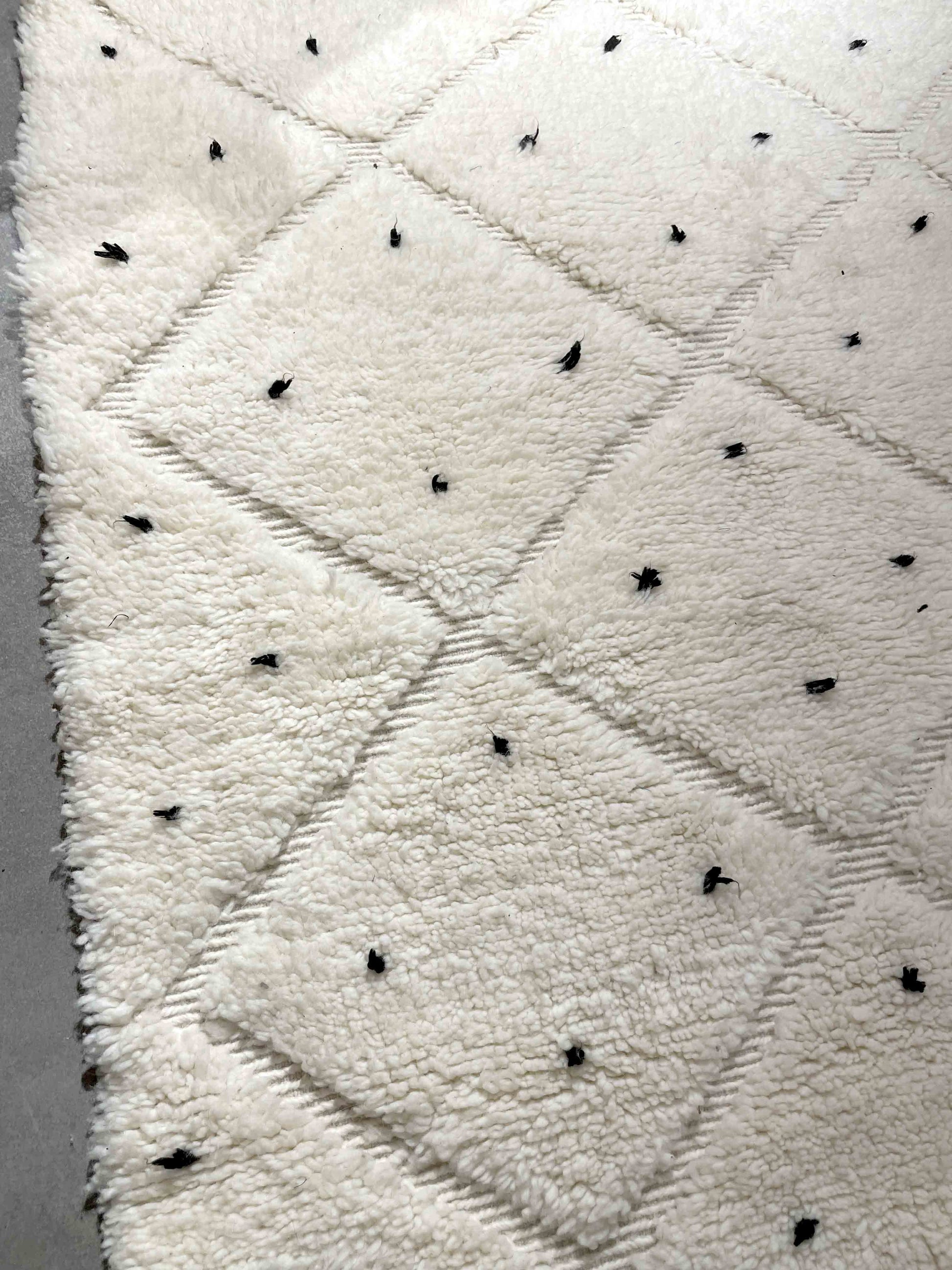 ベニワレンはモロッコのアトラス山脈に住むベルベル人女性によって、一目一目しっかりと結びながら織らているハンドメイドのウールラグです。白を基調とし黒の細いラインで模様が描かれています。触り心地はふわふわと柔らかく長い毛足が特徴です。白を基調としたシンプルなデザインとナチュラルな色合いは、コーディネートの幅も広く他のインテリアとも調和しやすいです。