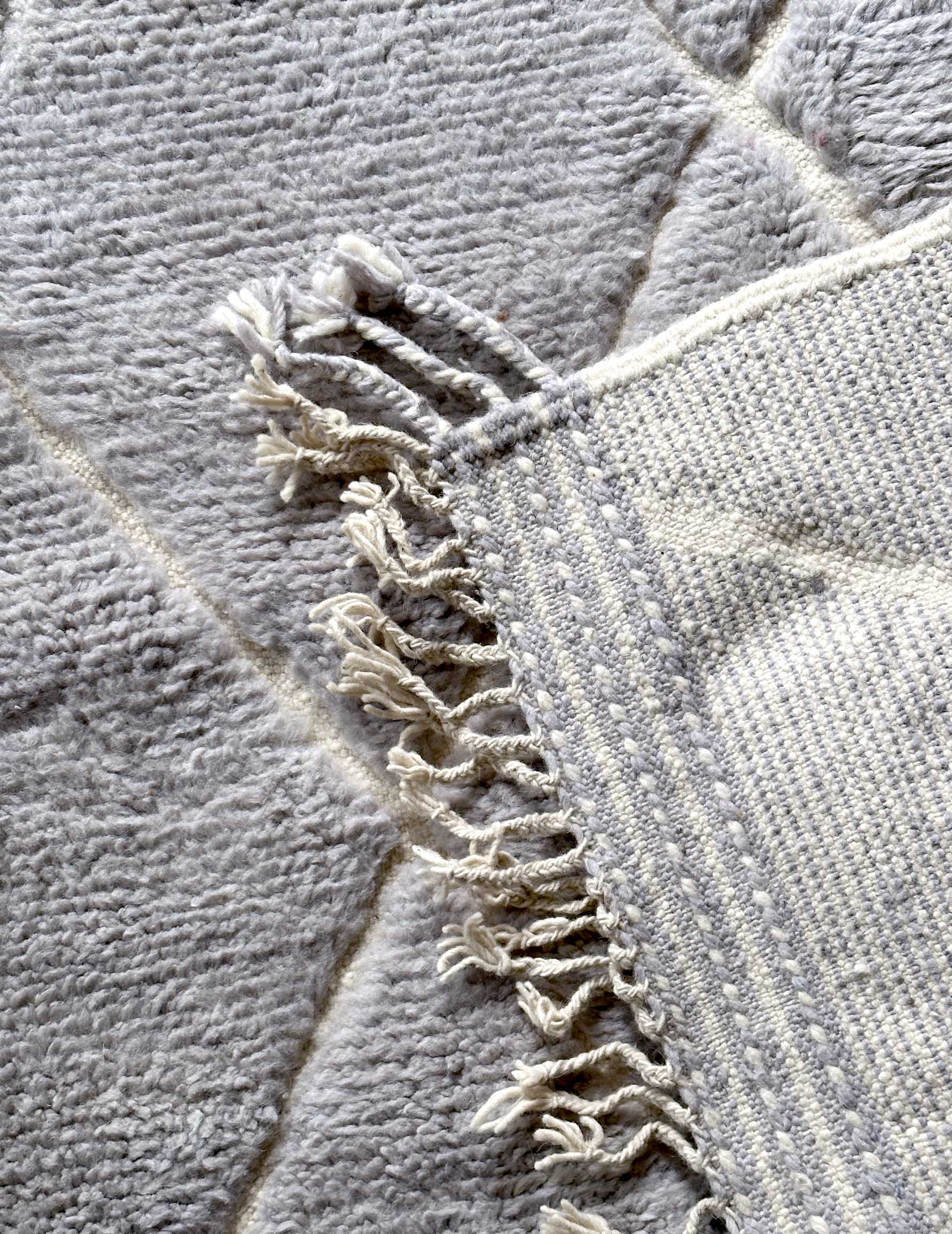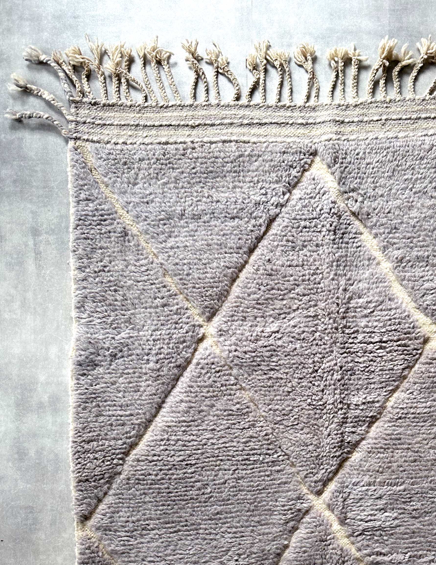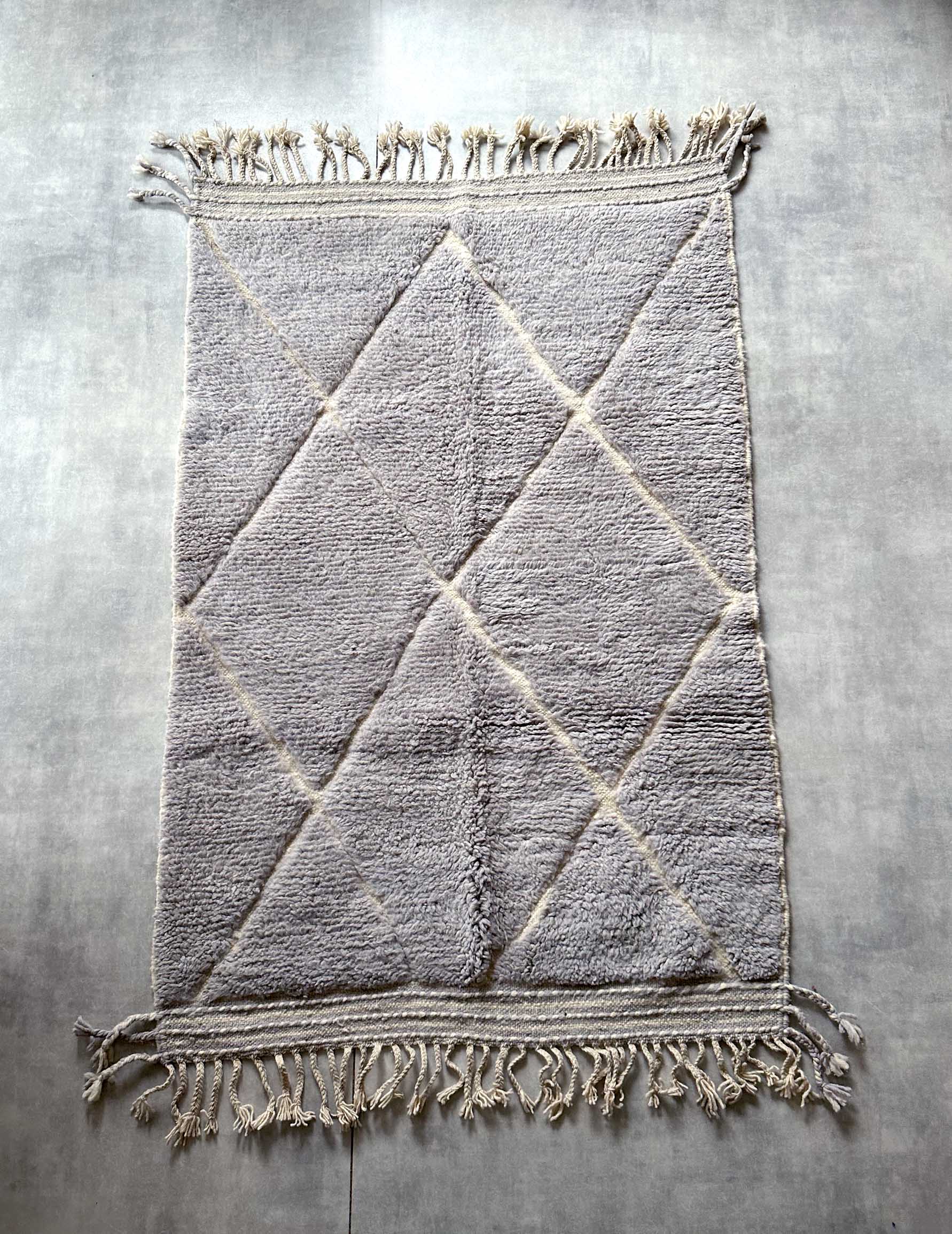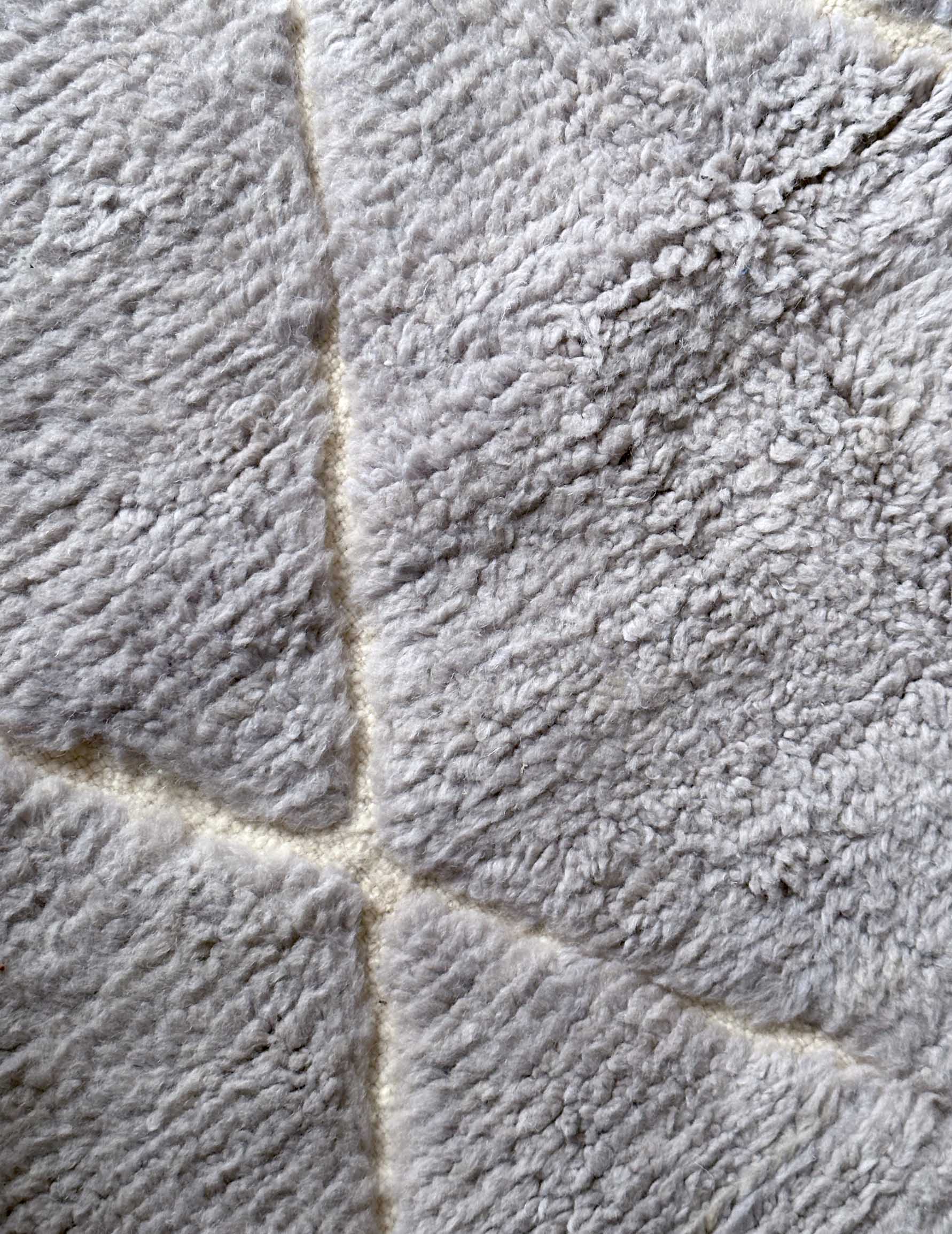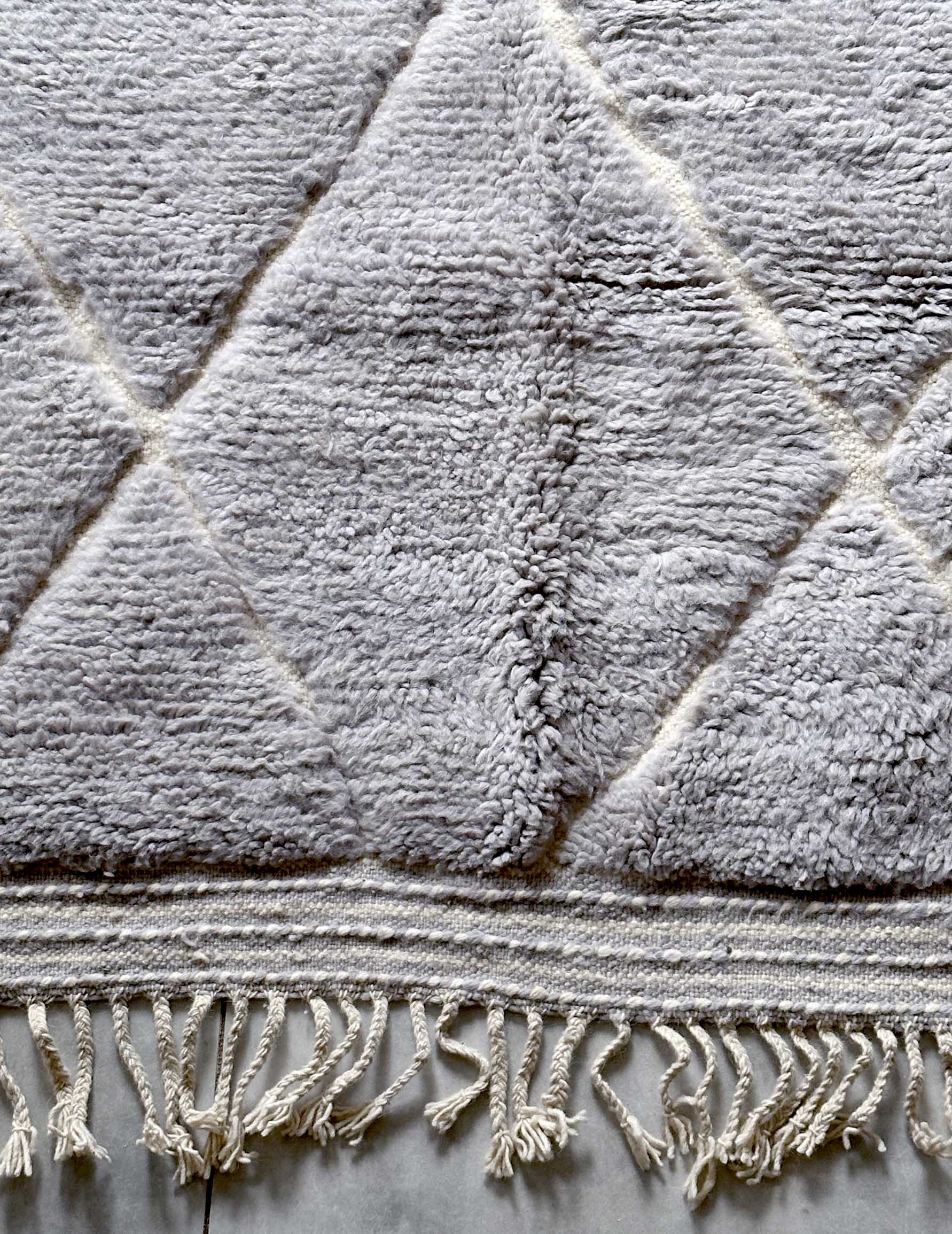 ベニワレンはモロッコのアトラス山脈に住むベルベル人女性によって、一目一目しっかりと結びながら織らているハンドメイドのウールラグ。 ライン部分をフラットに編み 模様を描くタイプのデザインとなっています。 触り心地はふわふわと柔らかく長い毛足が特徴です。白を基調としたシンプルなデザインとナチュラルな色合いは、コーディネートの幅も広く他のインテリアとも調和しやすいです。