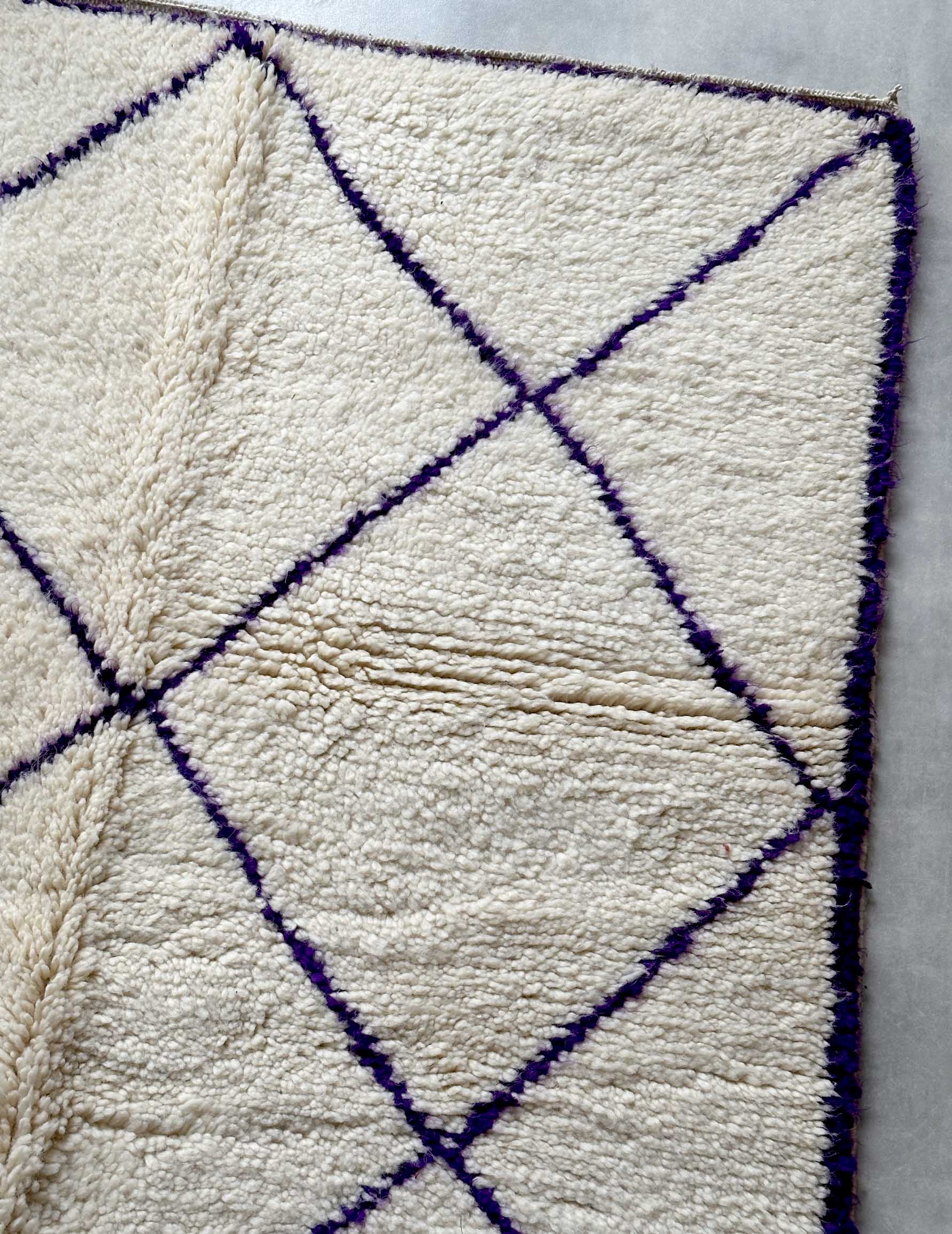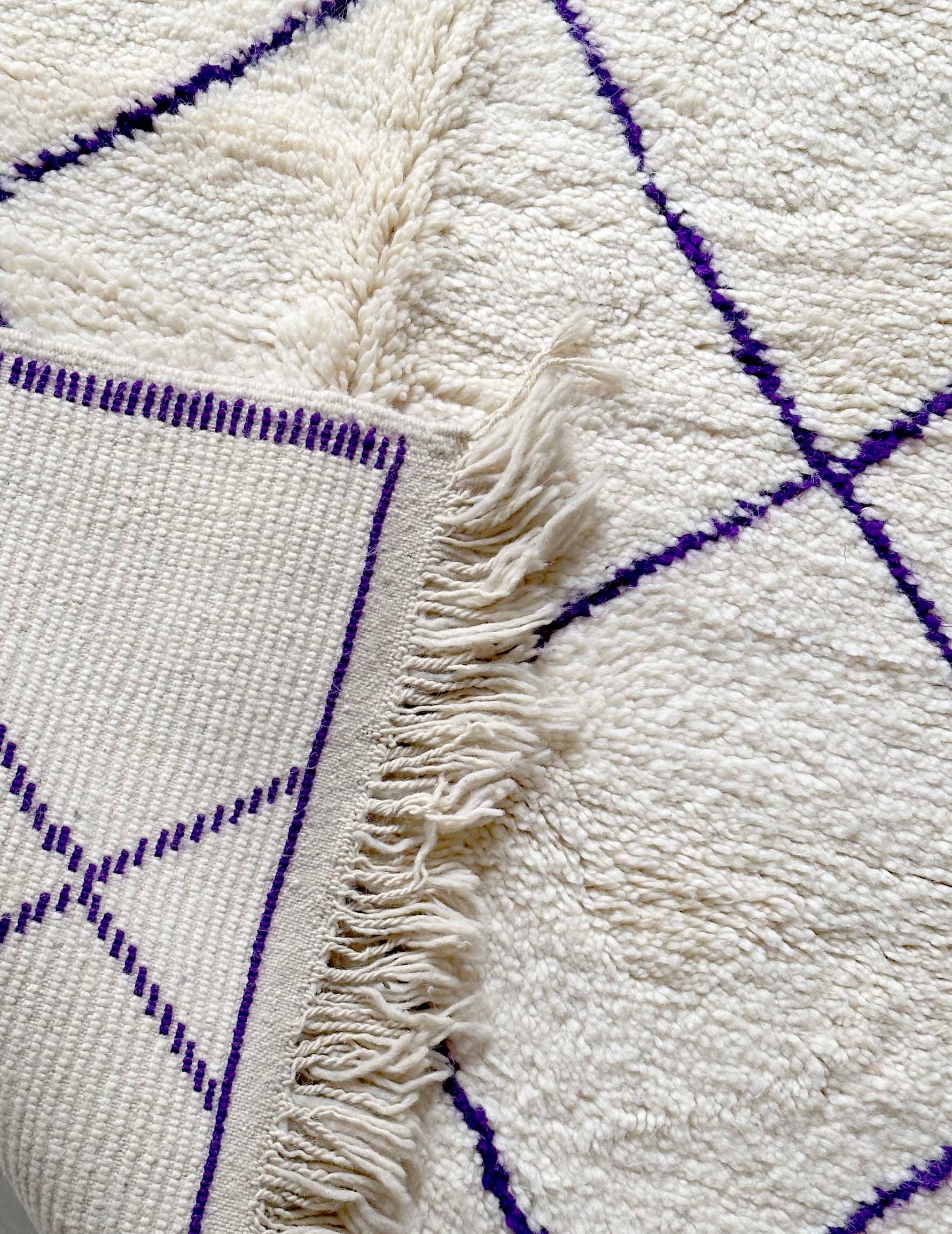 ベニワレンはモロッコのアトラス山脈に住むベルベル人女性によって、一目一目しっかりと結びながら織らているハンドメイドのウールラグです。白を基調とし黒の細いラインで模様が描かれています。触り心地はふわふわと柔らかく長い毛足が特徴です。白を基調としたシンプルなデザインとナチュラルな色合いは、コーディネートの幅も広く他のインテリアとも調和しやすいです。