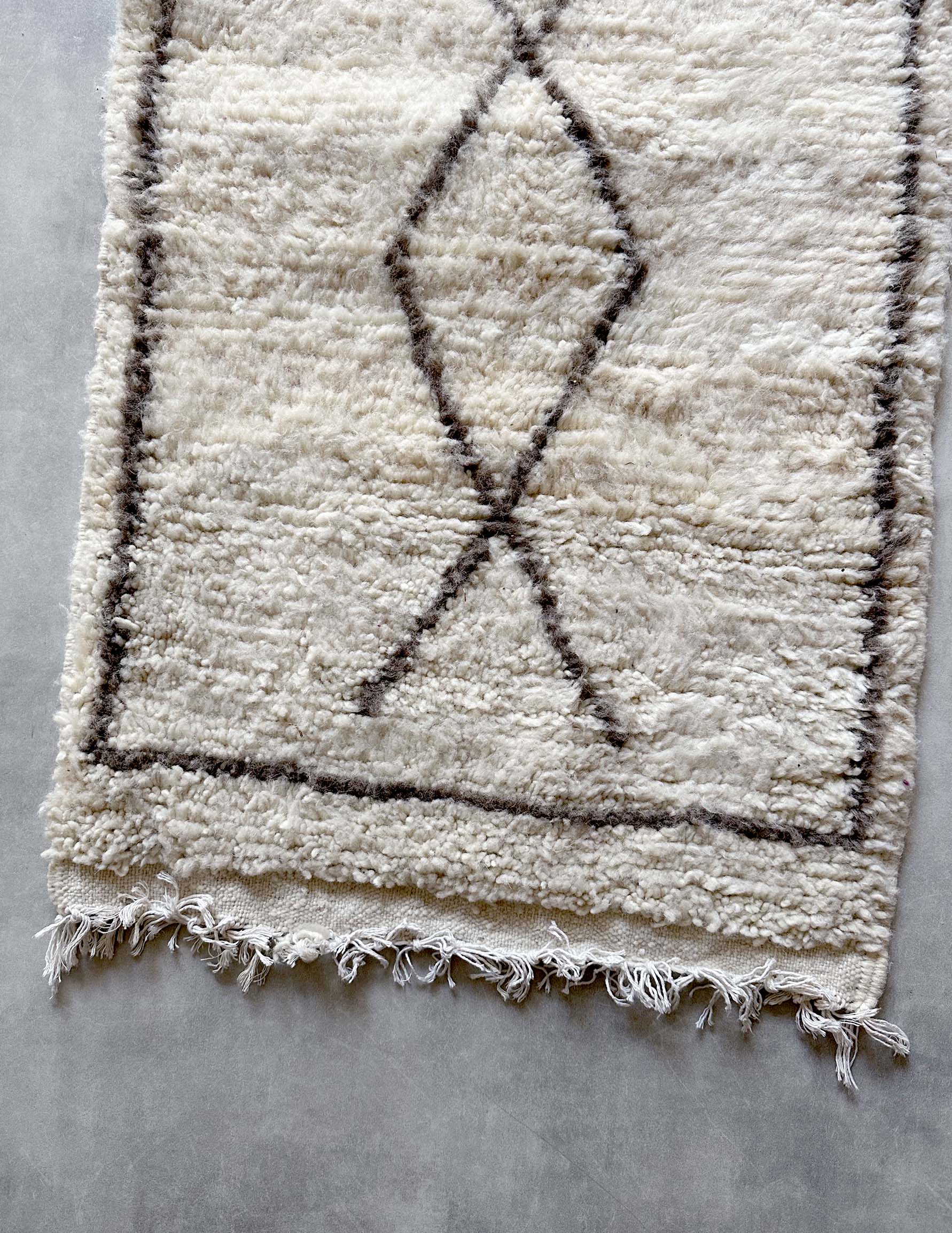 ベニワレンはモロッコのアトラス山脈に住むベルベル人女性によって、一目一目しっかりと結びながら織らているハンドメイドのウールラグです。白を基調とし黒の細いラインで模様が描かれています。触り心地はふわふわと柔らかく長い毛足が特徴です。白を基調としたシンプルなデザインとナチュラルな色合いは、コーディネートの幅も広く他のインテリアとも調和しやすいです。