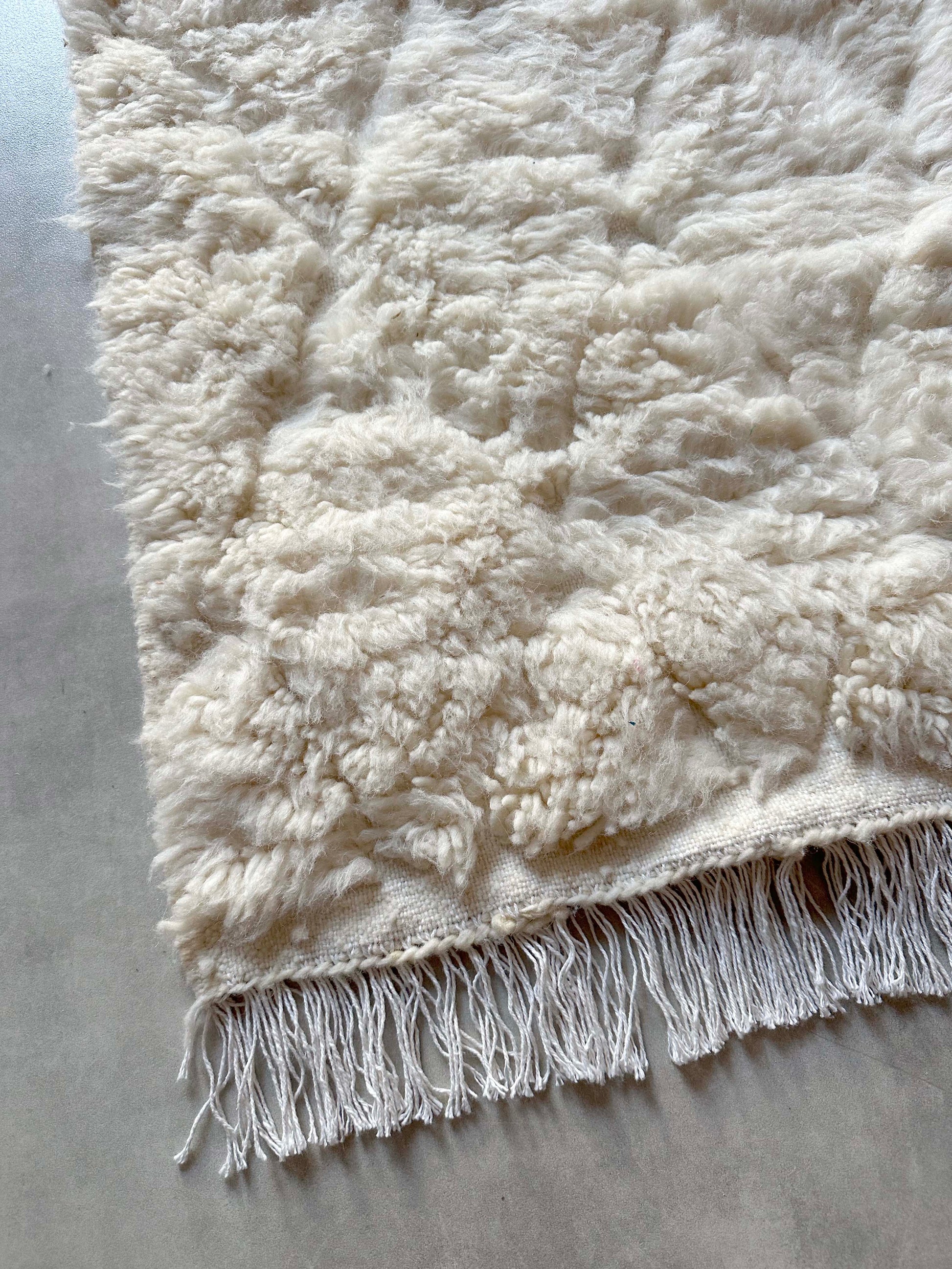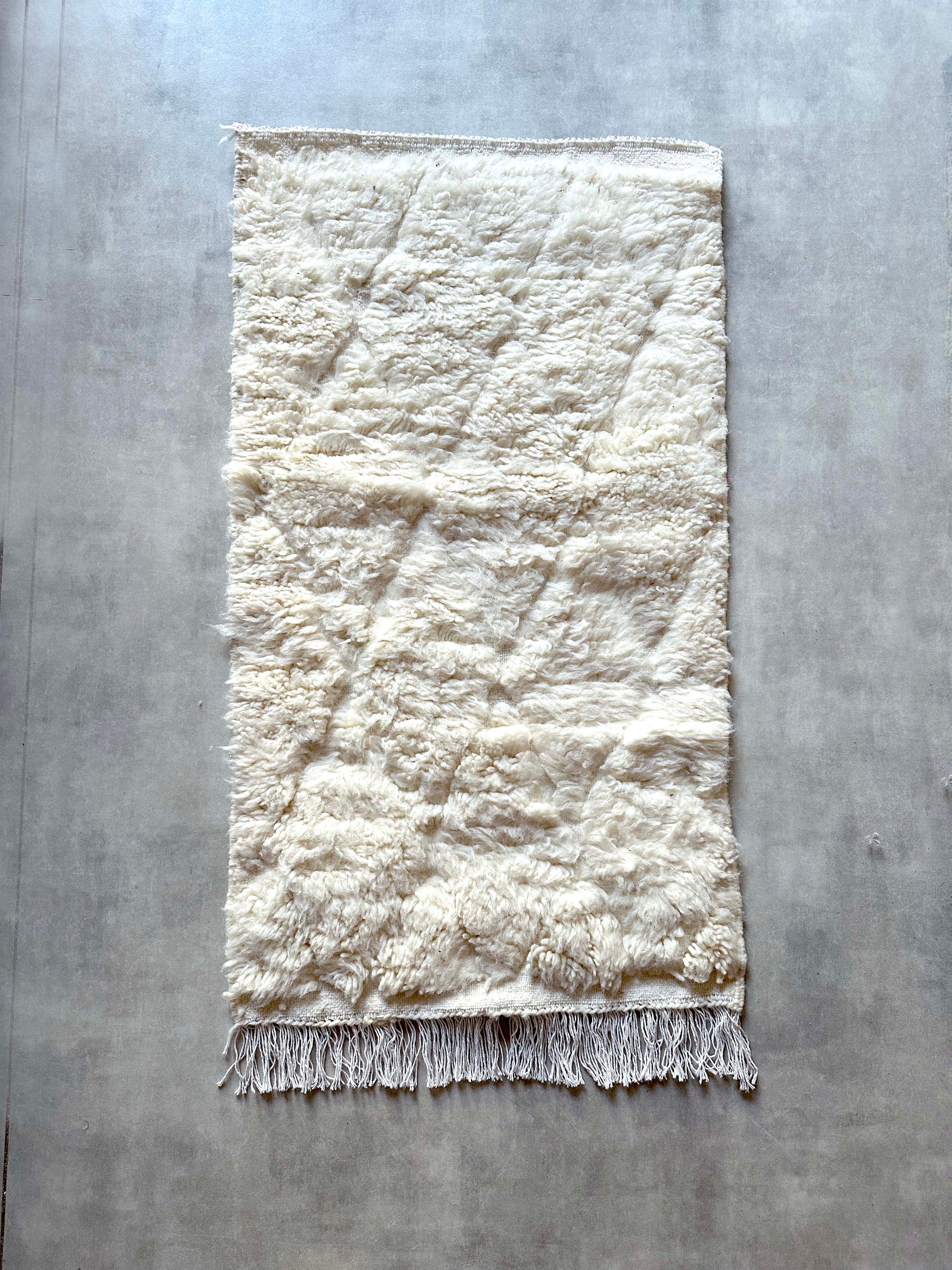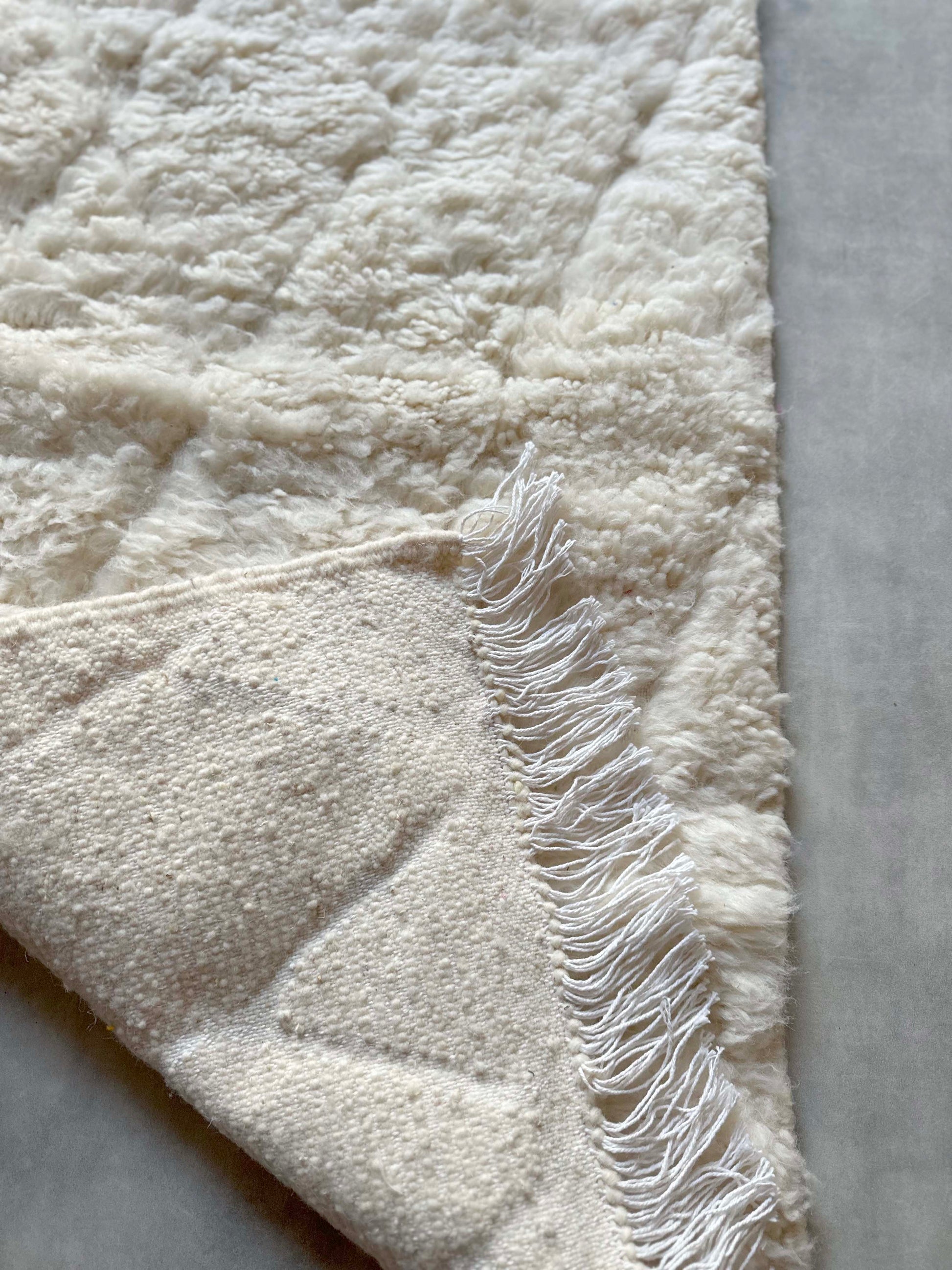 ベニワレンはモロッコのアトラス山脈に住むベルベル人女性によって、一目一目しっかりと結びながら織らているハンドメイドのウールラグです。白を基調とし黒の細いラインで模様が描かれています。触り心地はふわふわと柔らかく長い毛足が特徴です。白を基調としたシンプルなデザインとナチュラルな色合いは、コーディネートの幅も広く他のインテリアとも調和しやすいです。