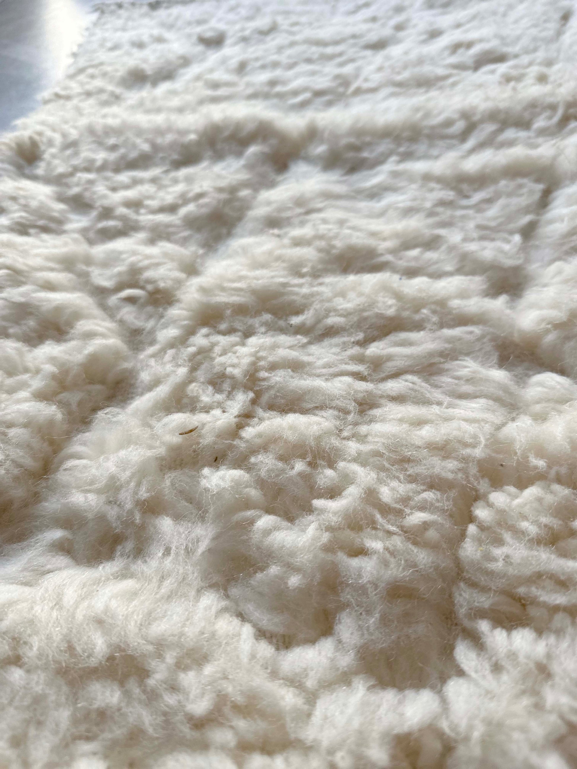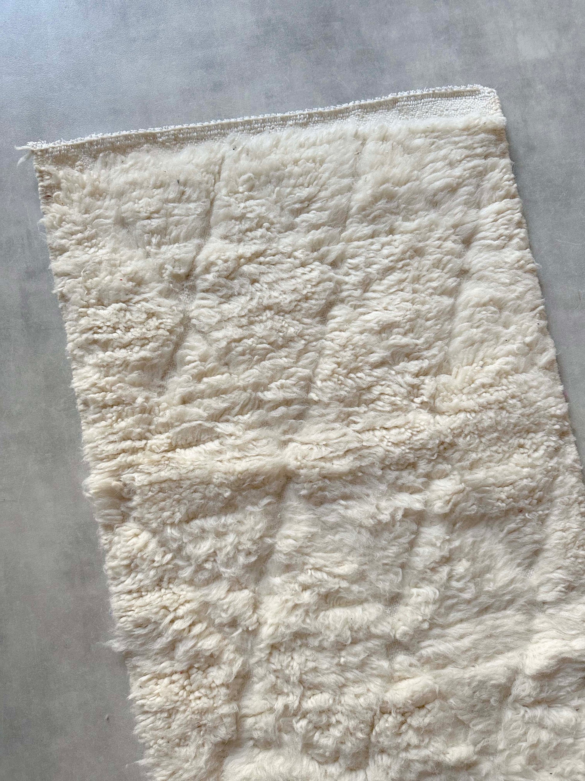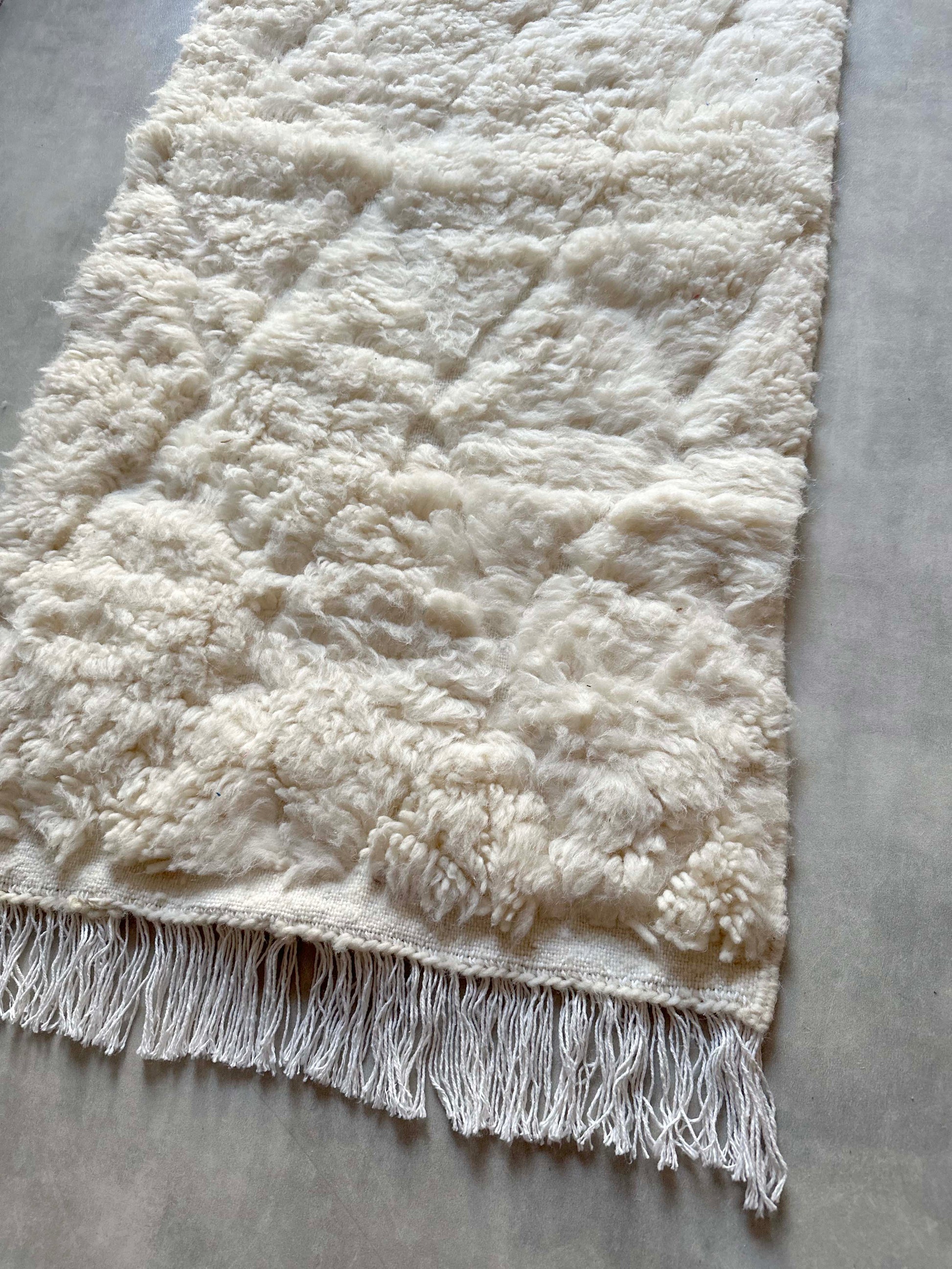 ベニワレンはモロッコのアトラス山脈に住むベルベル人女性によって、一目一目しっかりと結びながら織らているハンドメイドのウールラグです。白を基調とし黒の細いラインで模様が描かれています。触り心地はふわふわと柔らかく長い毛足が特徴です。白を基調としたシンプルなデザインとナチュラルな色合いは、コーディネートの幅も広く他のインテリアとも調和しやすいです。