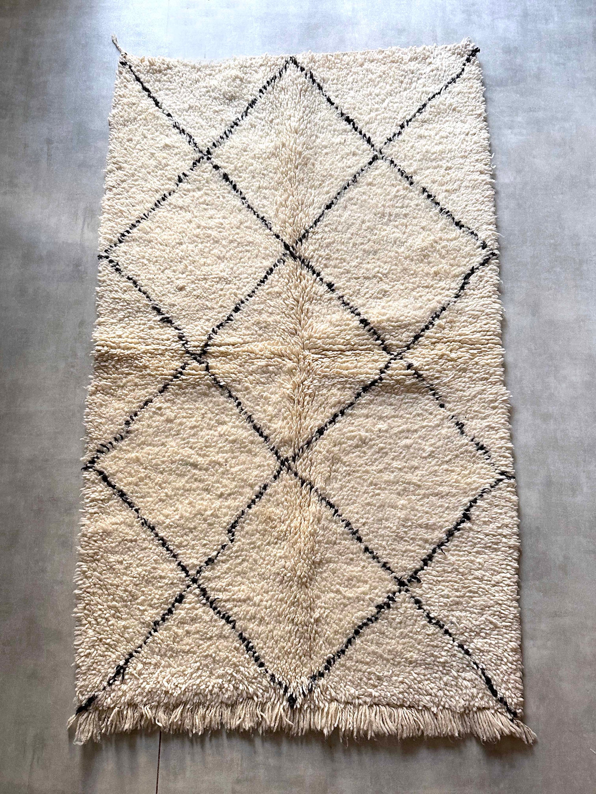 ベニワレンはモロッコのアトラス山脈に住むベルベル人女性によって、一目一目しっかりと結びながら織らているハンドメイドのウールラグです。白を基調とし黒の細いラインで模様が描かれています。触り心地はふわふわと柔らかく長い毛足が特徴です。白を基調としたシンプルなデザインとナチュラルな色合いは、コーディネートの幅も広く他のインテリアとも調和しやすいです。