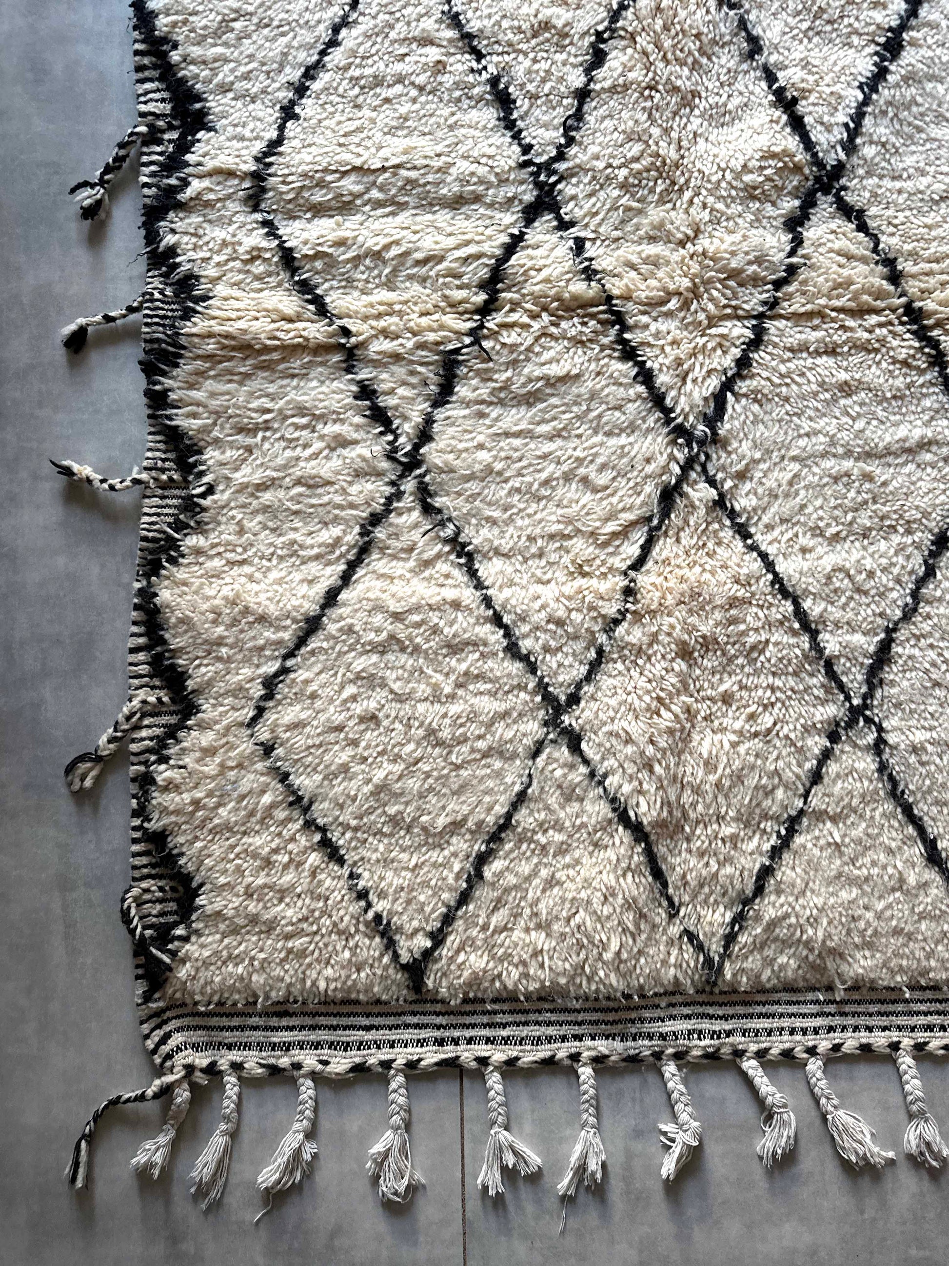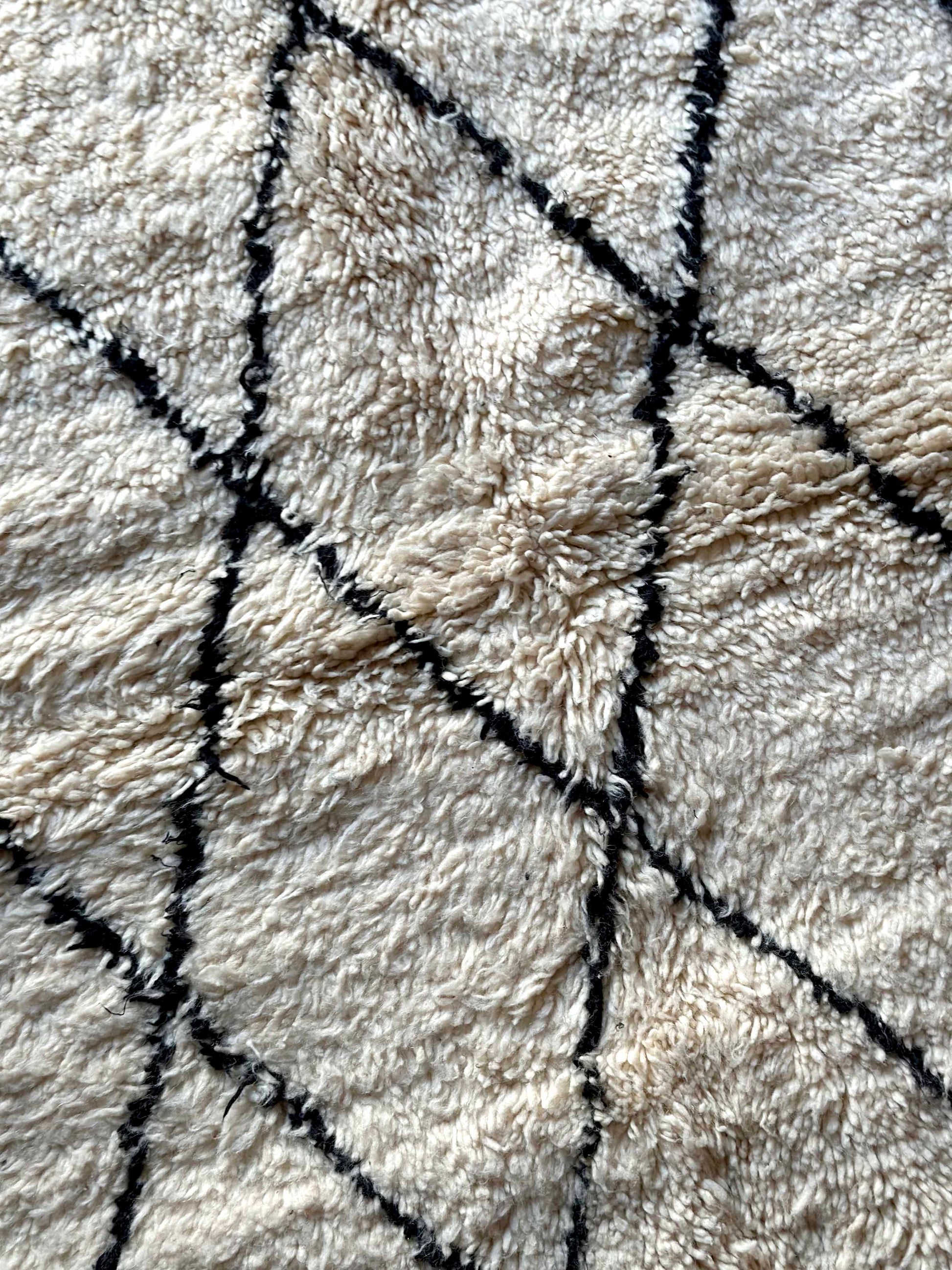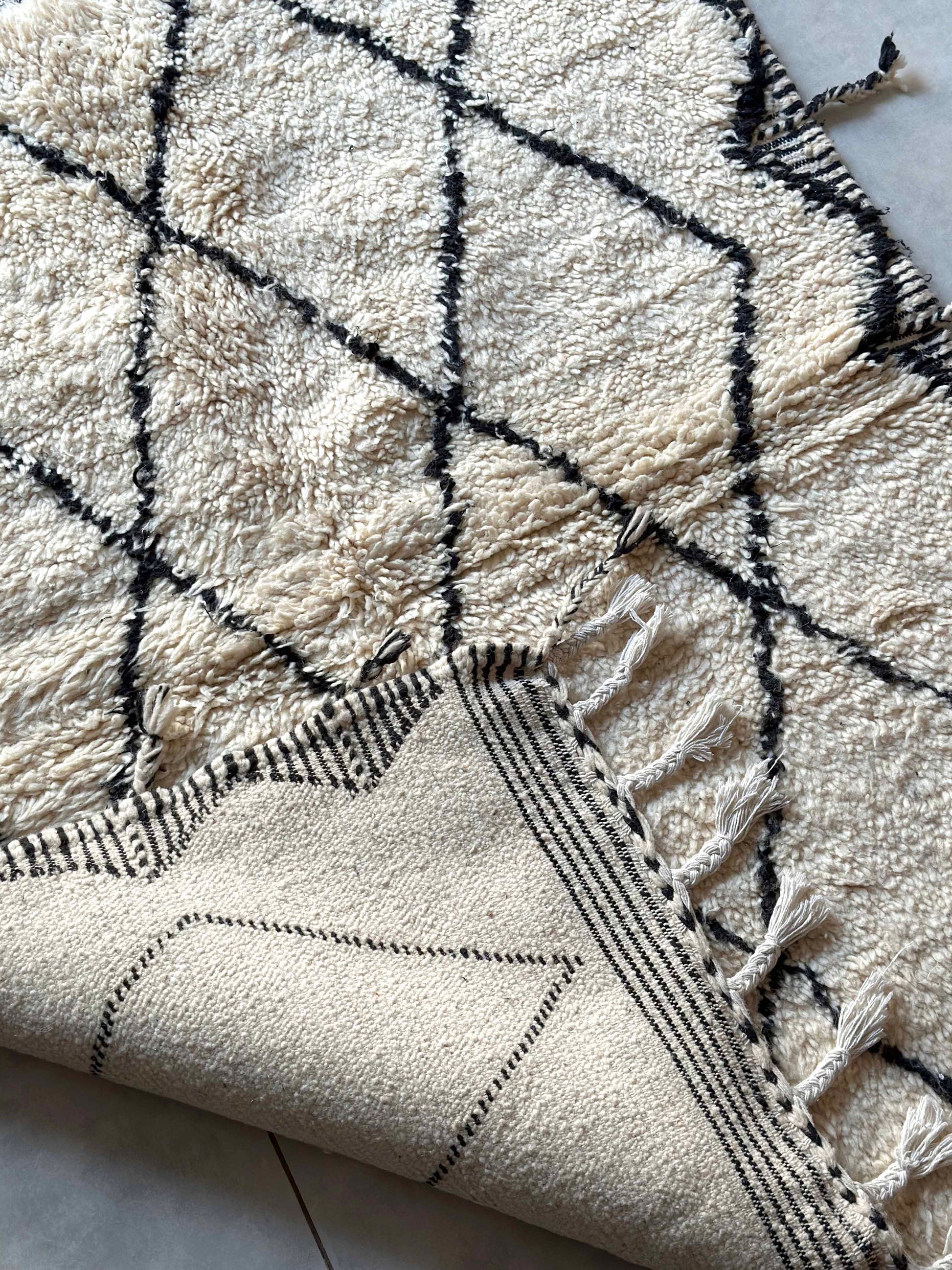ベニワレンはモロッコのアトラス山脈に住むベルベル人女性によって、一目一目しっかりと結びながら織らているハンドメイドのウールラグです。白を基調とし黒の細いラインで模様が描かれています。触り心地はふわふわと柔らかく長い毛足が特徴です。白を基調としたシンプルなデザインとナチュラルな色合いは、コーディネートの幅も広く他のインテリアとも調和しやすいです。