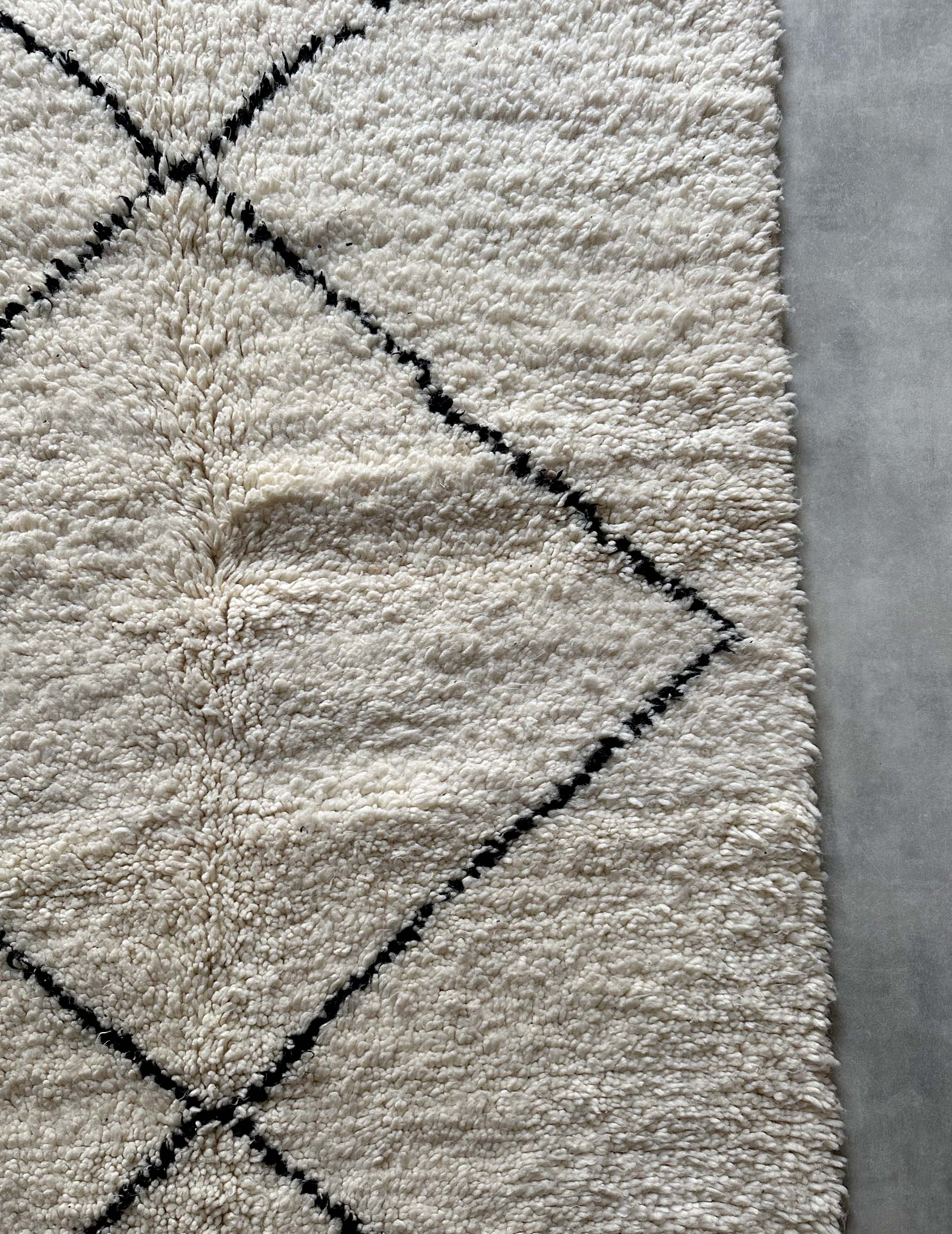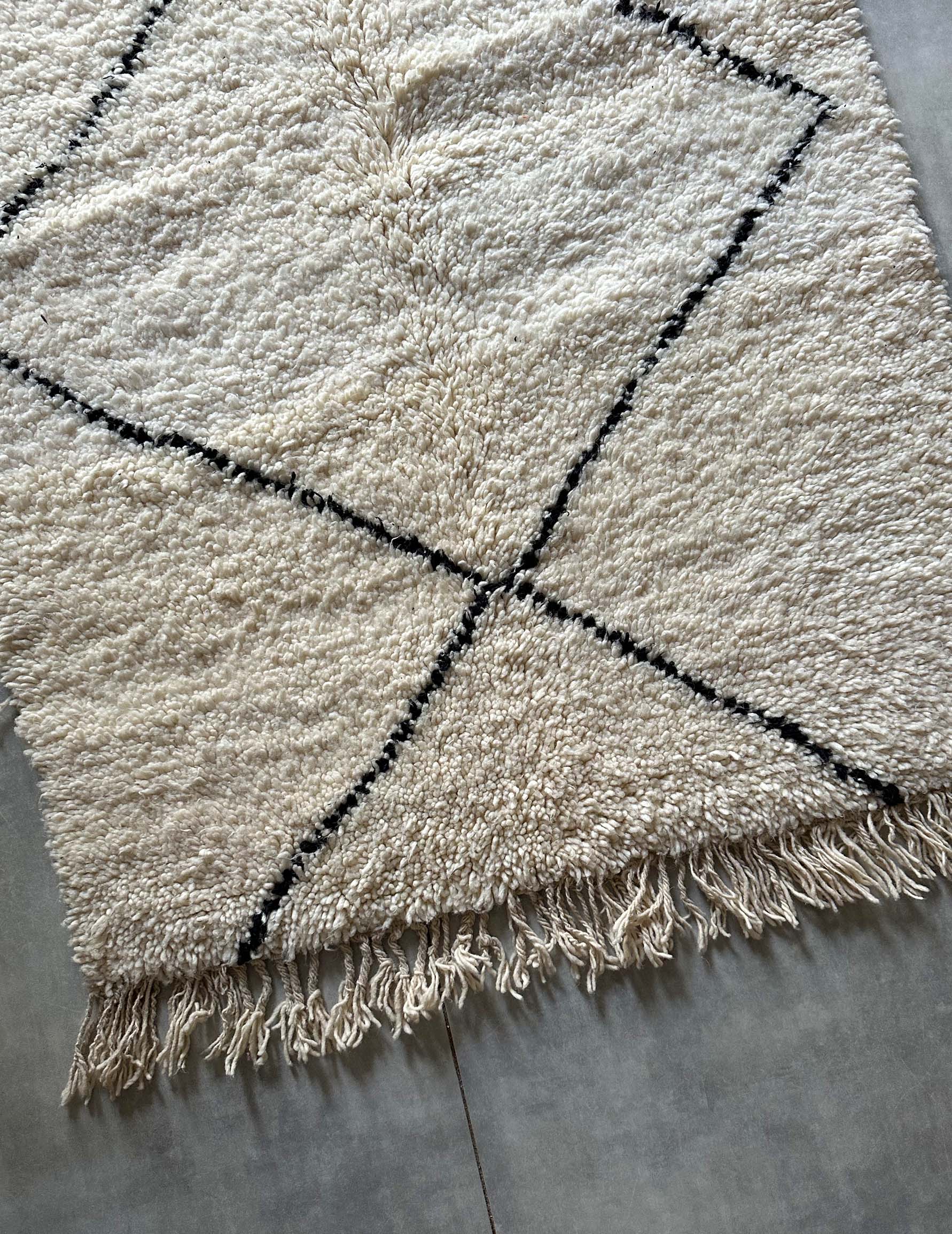ベニワレンはモロッコのアトラス山脈に住むベルベル人女性によって、一目一目しっかりと結びながら織らているハンドメイドのウールラグです。白を基調とし黒の細いラインで模様が描かれています。触り心地はふわふわと柔らかく長い毛足が特徴です。白を基調としたシンプルなデザインとナチュラルな色合いは、コーディネートの幅も広く他のインテリアとも調和しやすいです。