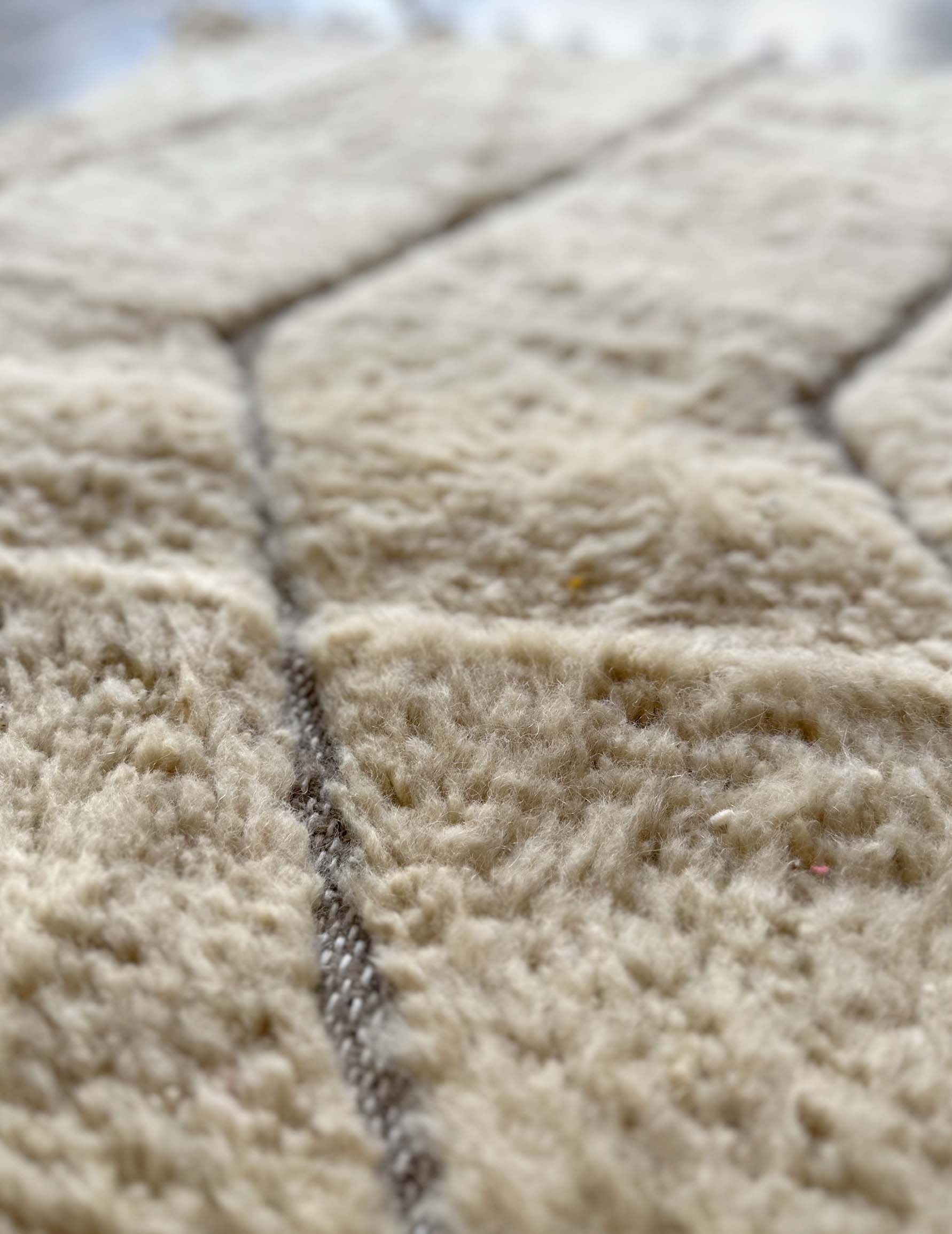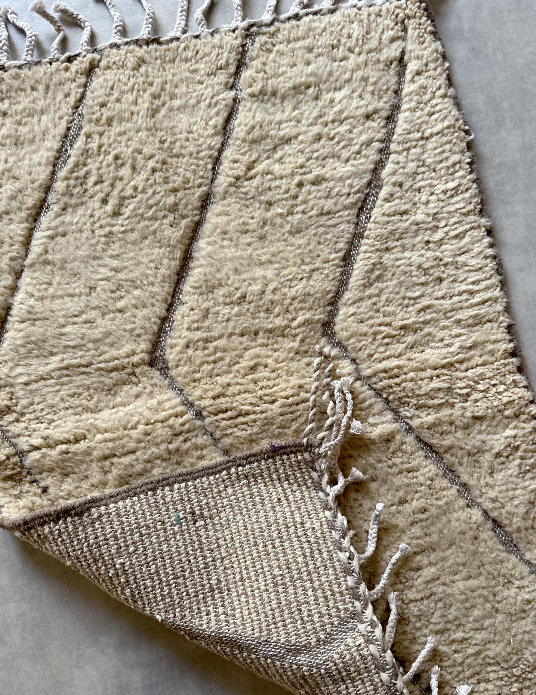 ベニワレンはモロッコのアトラス山脈に住むベルベル人女性によって、一目一目しっかりと結びながら織らているハンドメイドのウールラグです。白を基調とし黒の細いラインで模様が描かれています。触り心地はふわふわと柔らかく長い毛足が特徴です。白を基調としたシンプルなデザインとナチュラルな色合いは、コーディネートの幅も広く他のインテリアとも調和しやすいです。