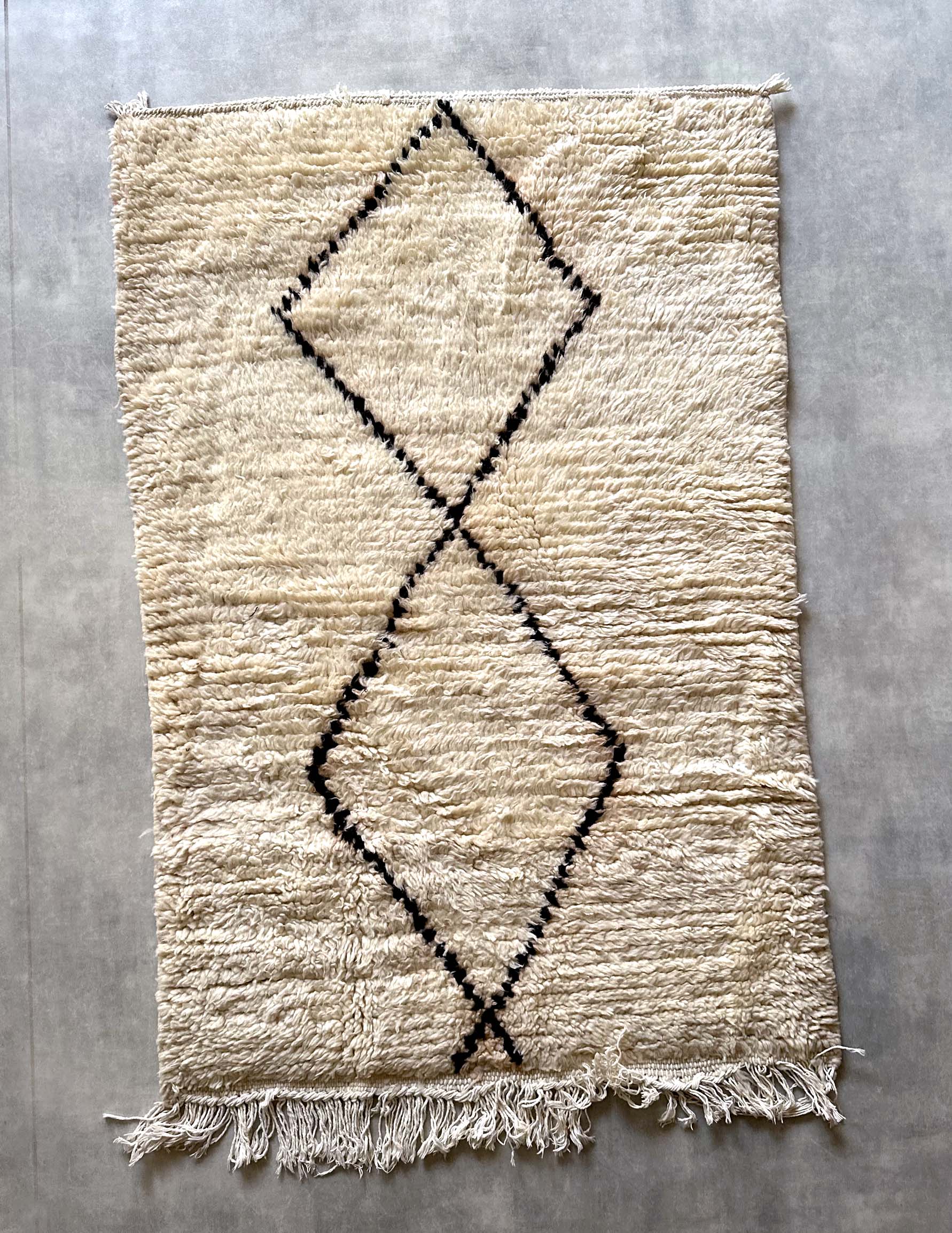 ベニワレンはモロッコのアトラス山脈に住むベルベル人女性によって、一目一目しっかりと結びながら織らているハンドメイドのウールラグです。白を基調とし黒の細いラインで模様が描かれています。触り心地はふわふわと柔らかく長い毛足が特徴です。白を基調としたシンプルなデザインとナチュラルな色合いは、コーディネートの幅も広く他のインテリアとも調和しやすいです。