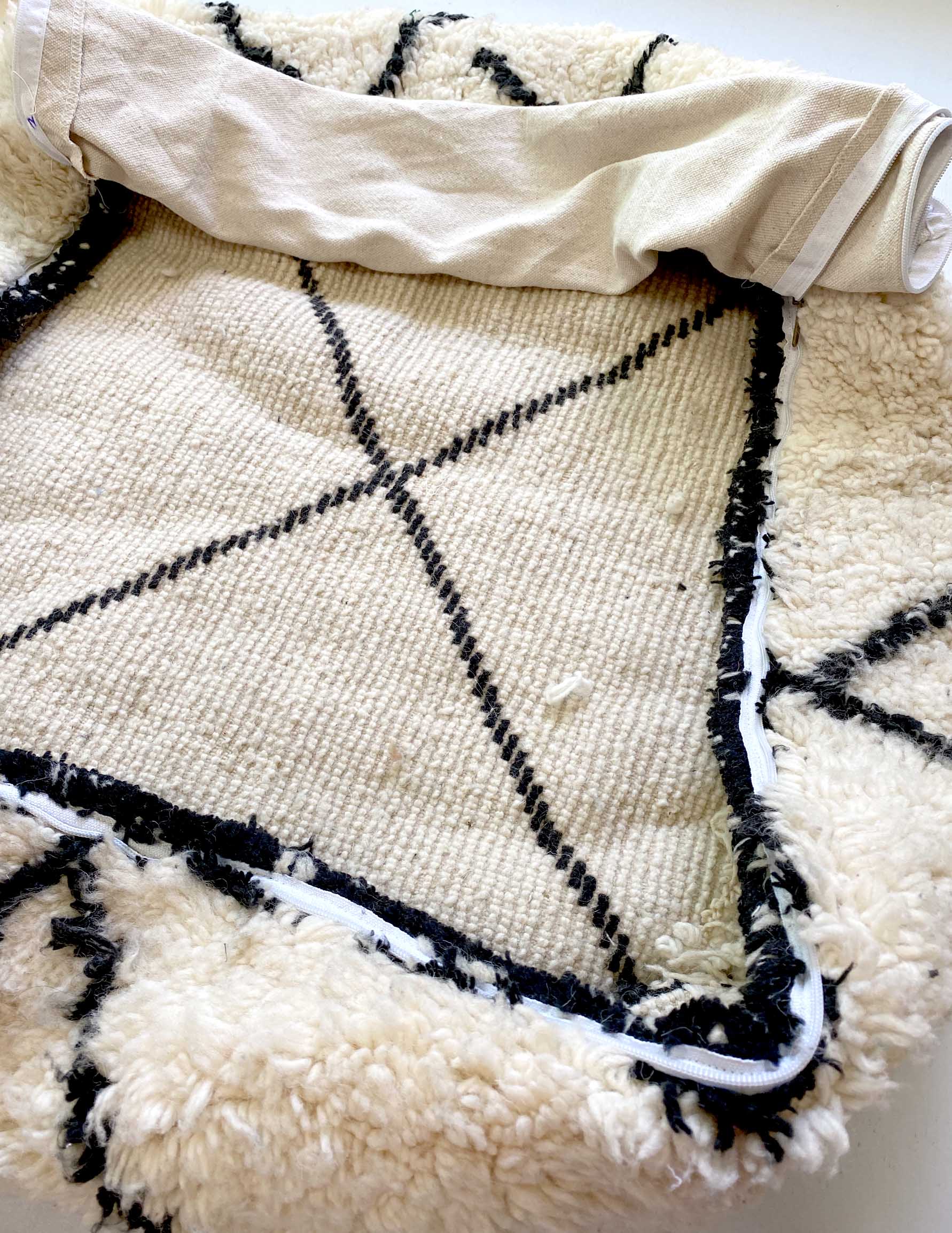 ベニワレンはモロッコのアトラス山脈に住むベルベル人女性によって、一目一目しっかりと結びながら織らているハンドメイドのウールラグです。白を基調とし黒の細いラインで模様が描かれています。触り心地はふわふわと柔らかく長い毛足が特徴です。このラグを使用し作られたプフとなります。