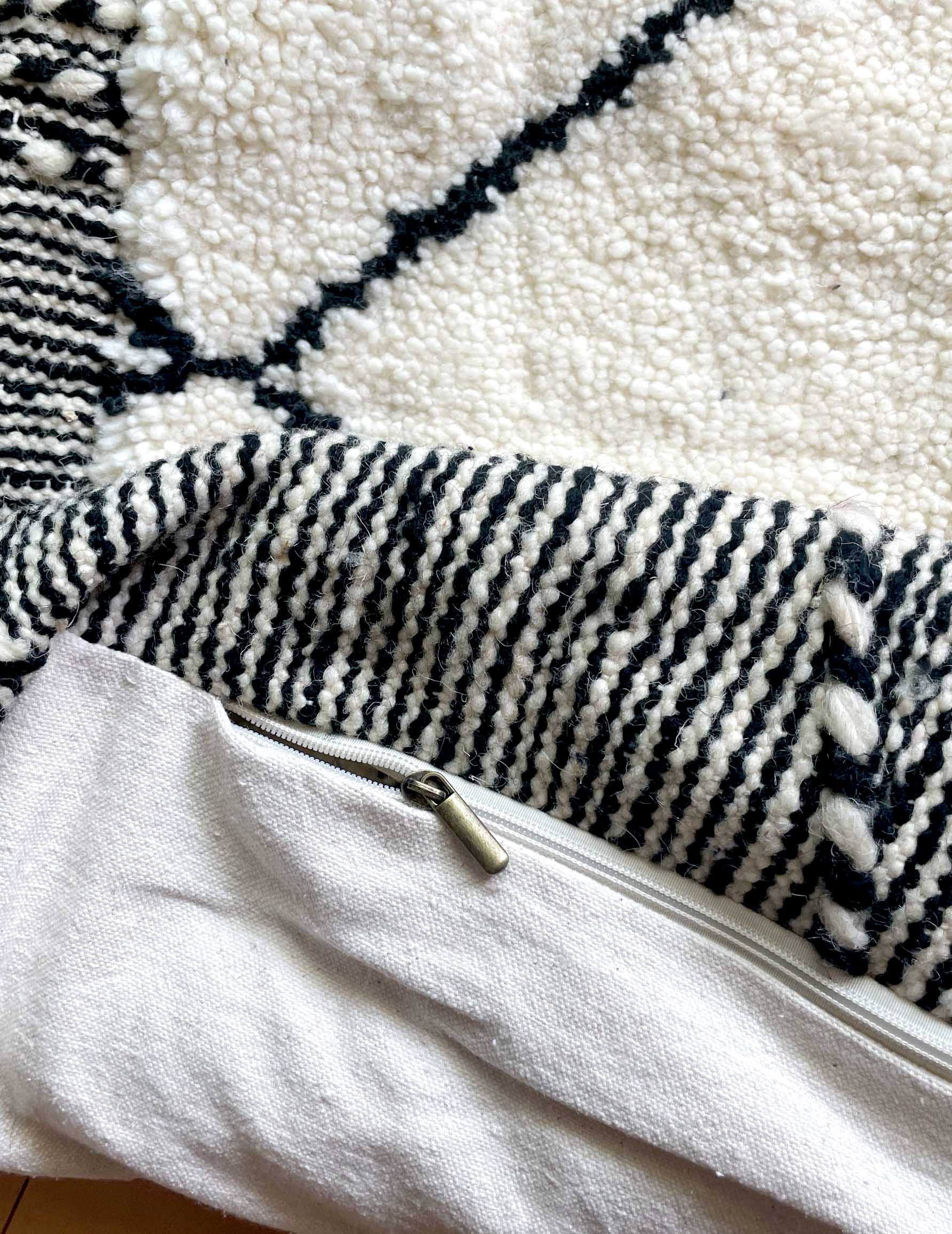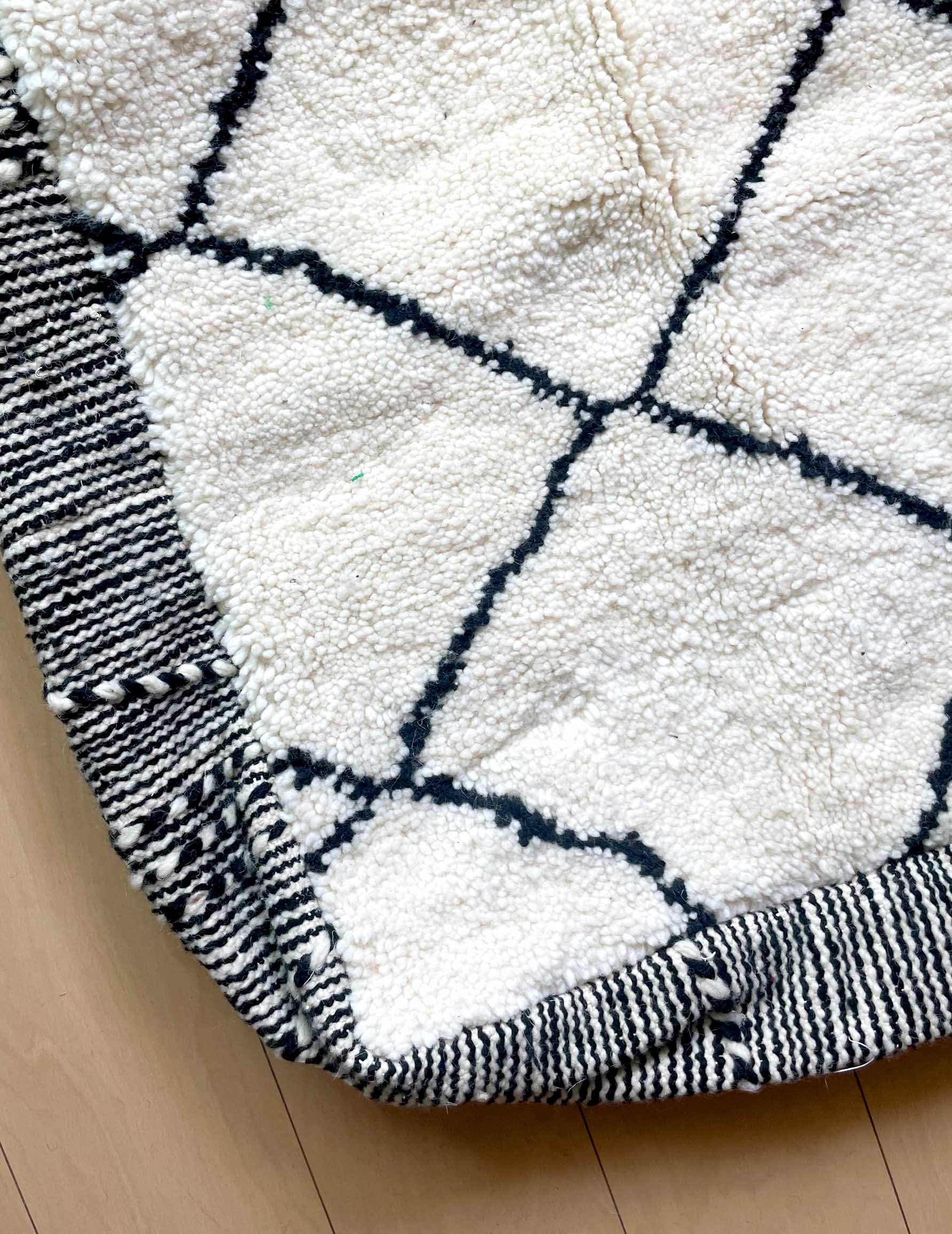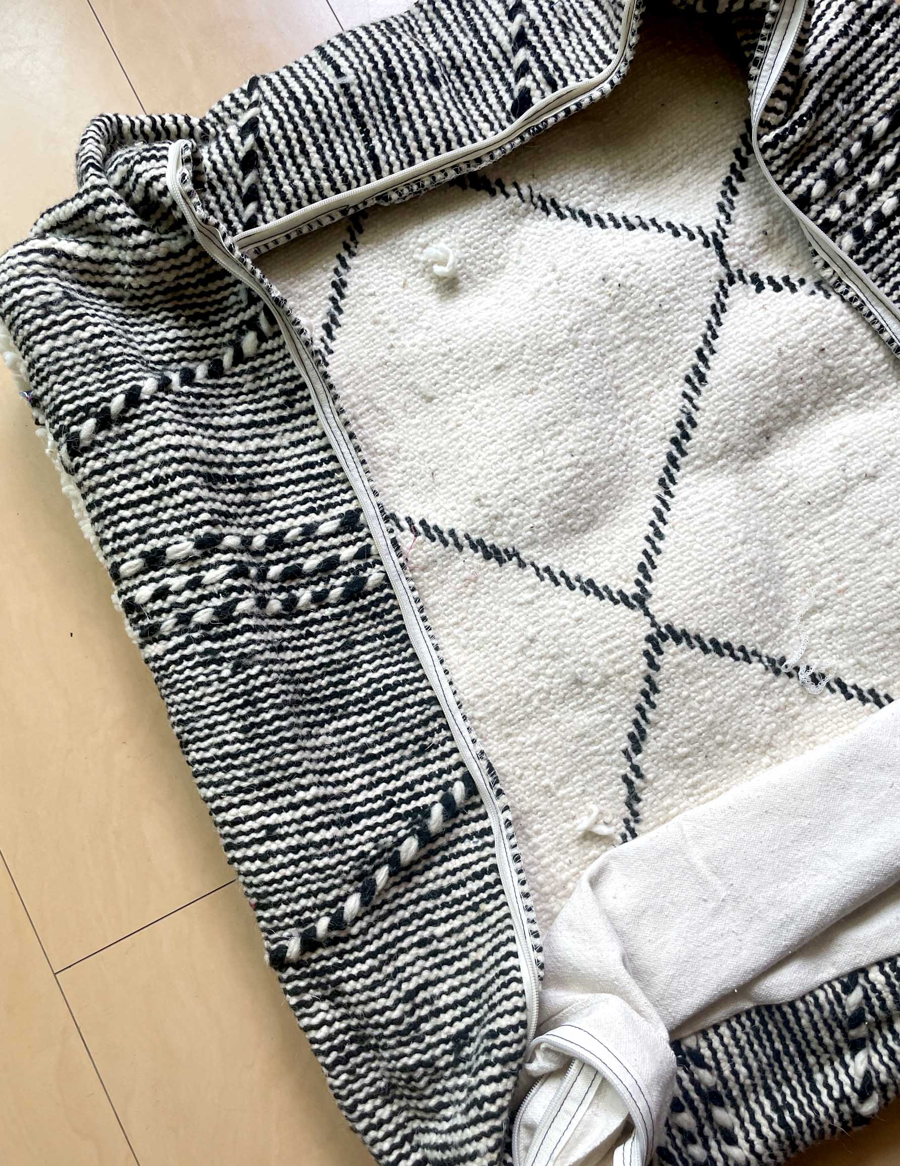 ベニワレンはモロッコのアトラス山脈に住むベルベル人女性によって、一目一目しっかりと結びながら織らているハンドメイドのウールラグです。白を基調とし黒の細いラインで模様が描かれています。触り心地はふわふわと柔らかく長い毛足が特徴です。このラグを使用し作られたプフとなります。