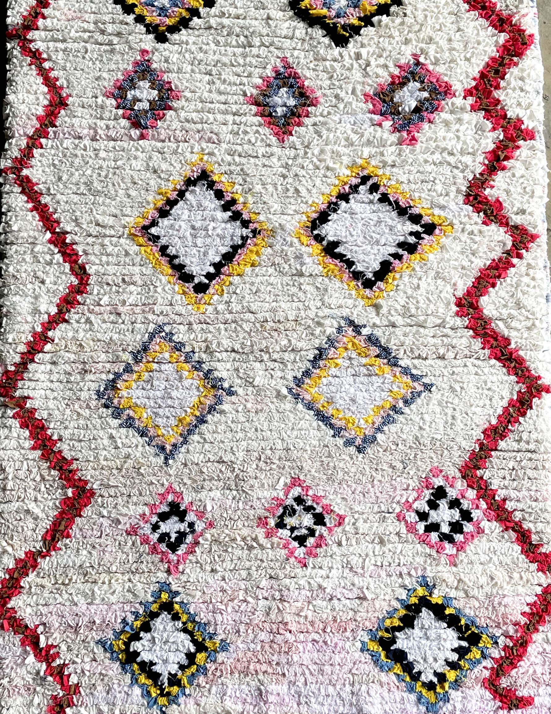 ボシャルウィットはアトラス山脈に住むベルベル人の女性が衣類などの生地を裂いて編み込んだリサイクルモロッカンラグです。全て異なった生地を使用している為、色味の配色や長短が様々で全て1点物となります。またモロッコではラグとして使用されるだけではなく、壁に飾りアートとしても生活に取り入れられています。