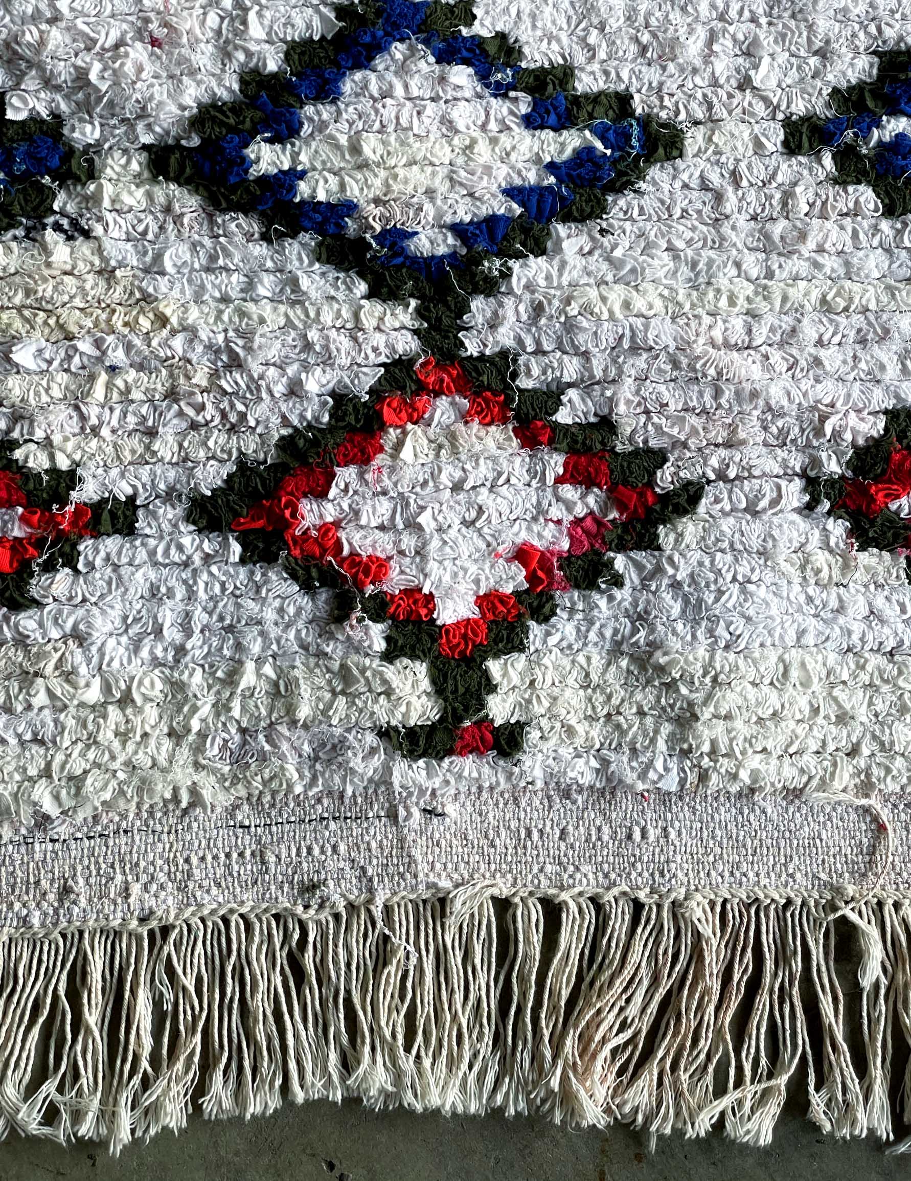 ボシャルウィットはアトラス山脈に住むベルベル人の女性が衣類などの生地を裂いて編み込んだリサイクルモロッカンラグです。全て異なった生地を使用している為、色味の配色や長短が様々で全て1点物となります。またモロッコではラグとして使用されるだけではなく、壁に飾りアートとしても生活に取り入れられています。