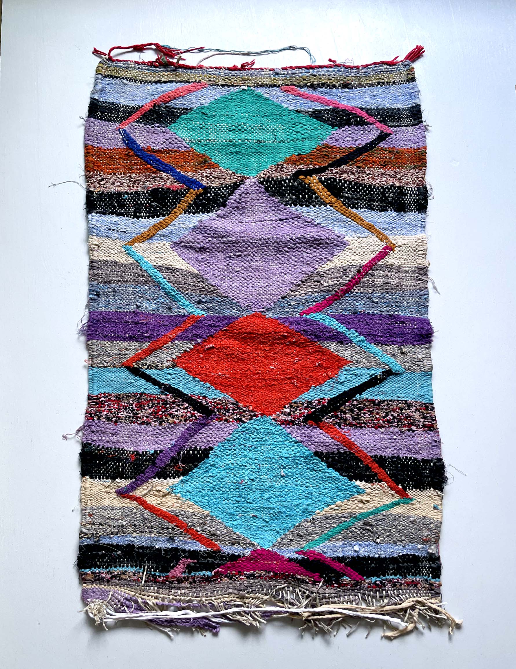ボシャルウィットはアトラス山脈に住むベルベル人の女性が衣類などの生地を裂いて編み込んだリサイクルモロッカンラグです。全て異なった生地を使用している為、色味の配色や長短が様々で全て1点物となります。またモロッコではラグとして使用されるだけではなく、壁に飾りアートとしても生活に取り入れられています。