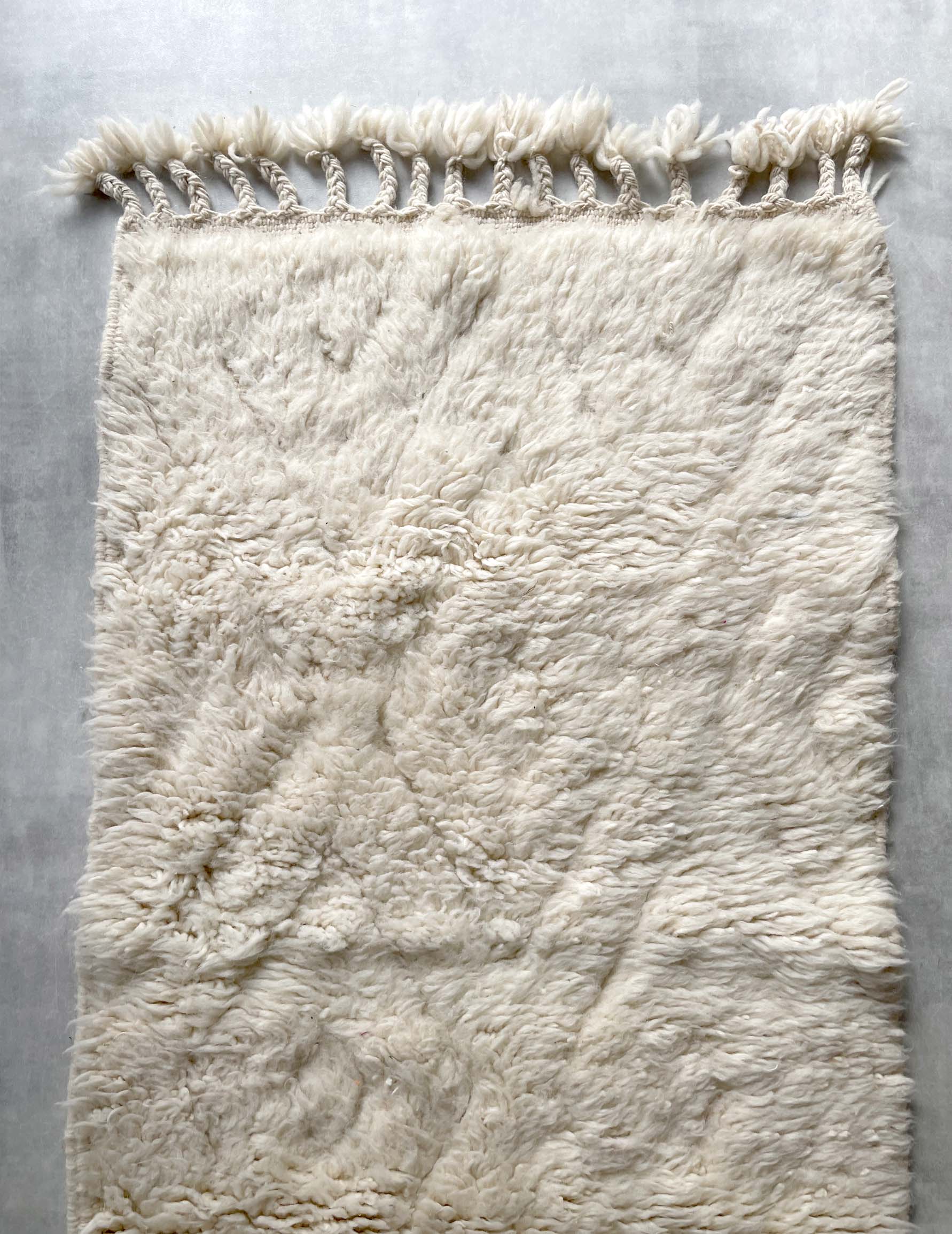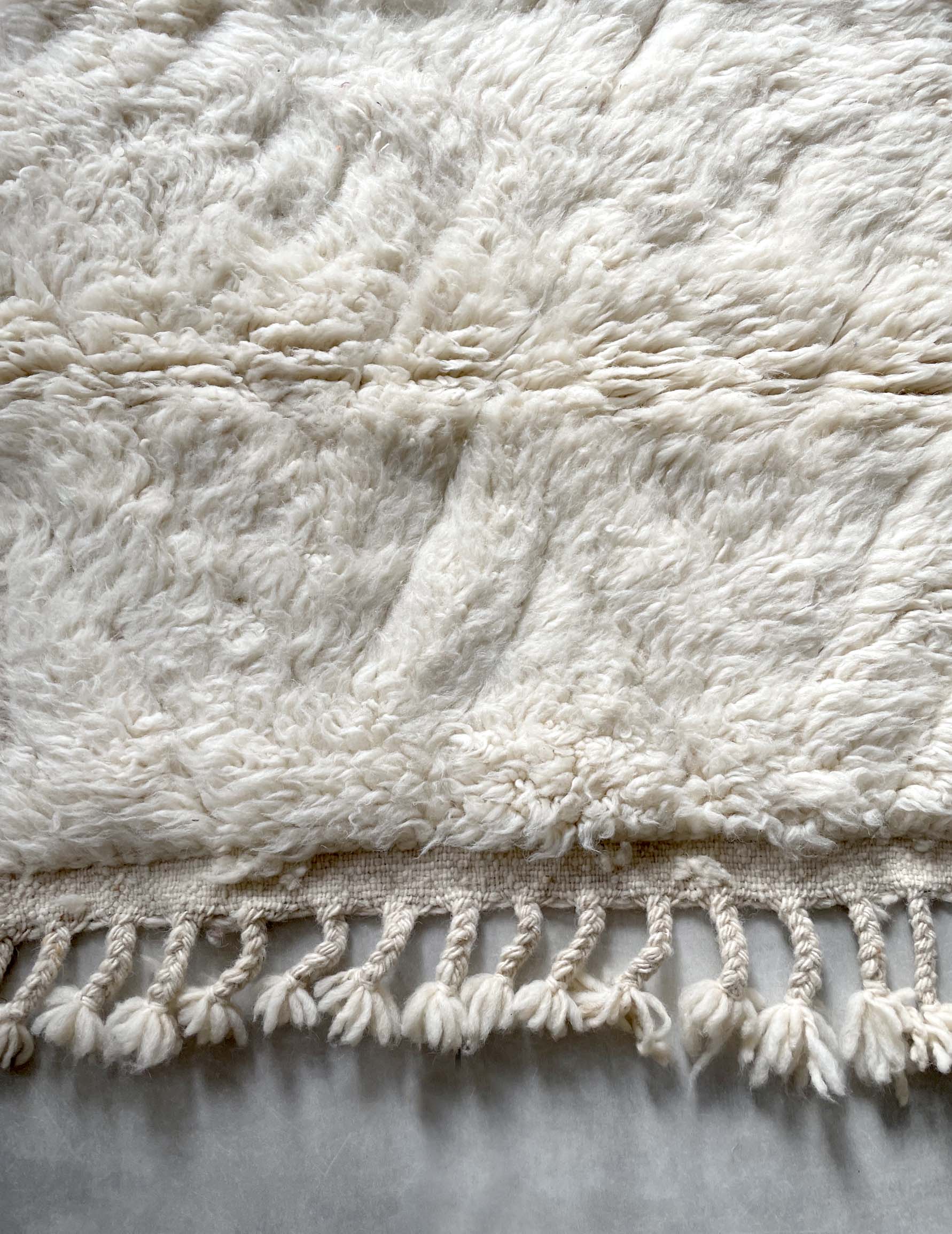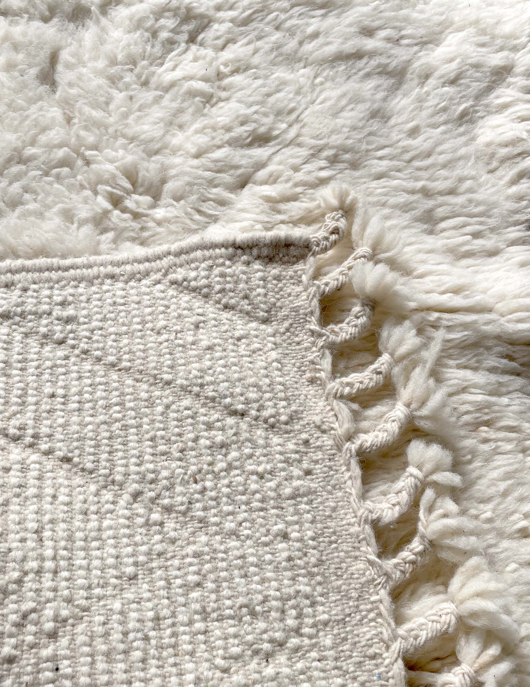 ベニワレンはモロッコのアトラス山脈に住むベルベル人女性によって、一目一目しっかりと結びながら織らているハンドメイドのウールラグ。 ライン部分をフラットに編み 模様を描くタイプのデザインとなっています。 触り心地はふわふわと柔らかく長い毛足が特徴です。白を基調としたシンプルなデザインとナチュラルな色合いは、コーディネートの幅も広く他のインテリアとも調和しやすいです。
