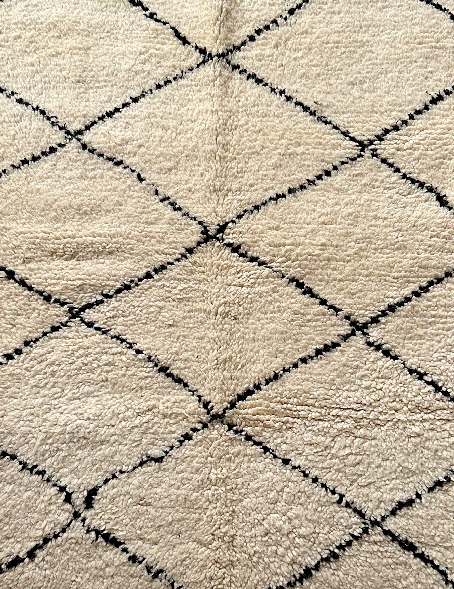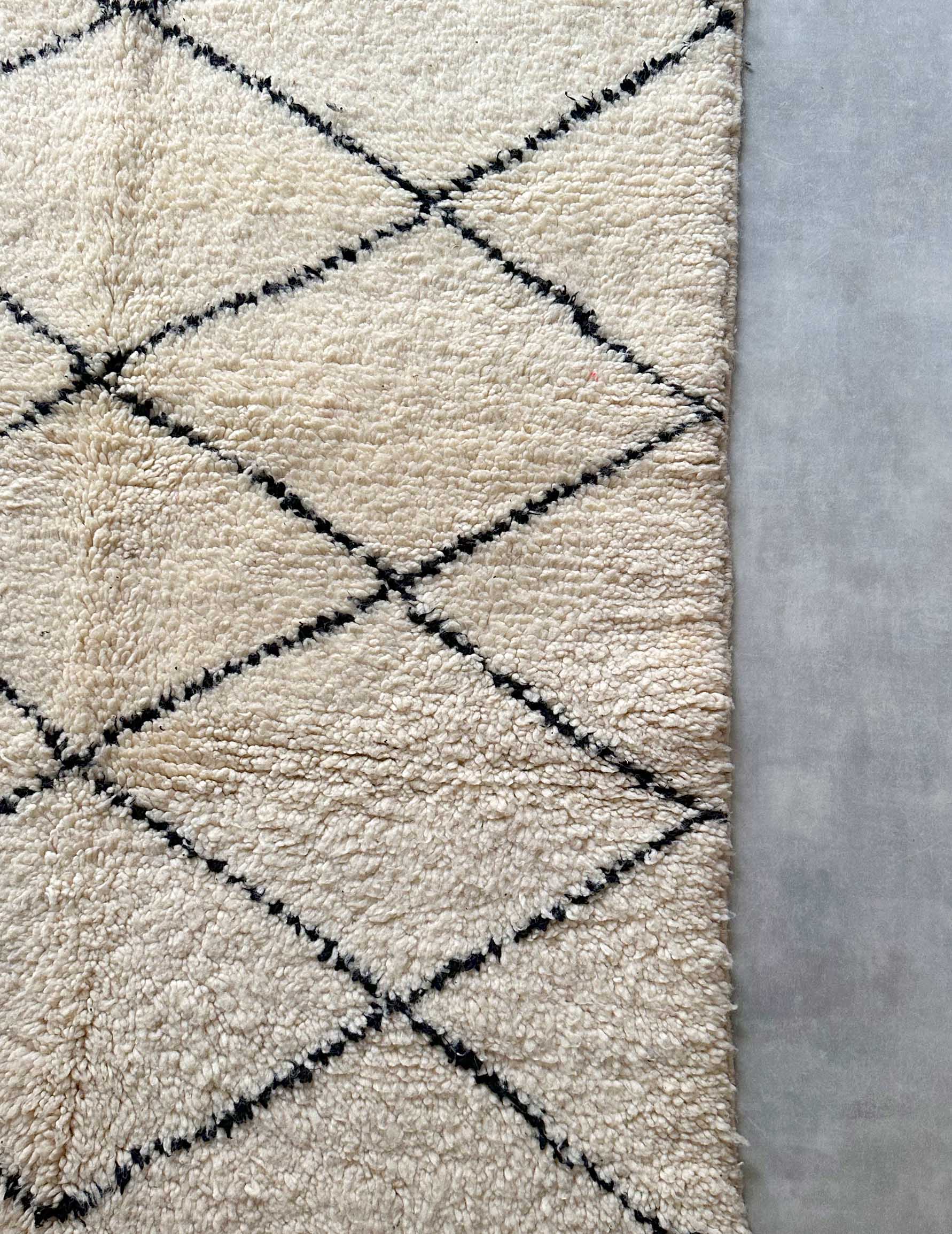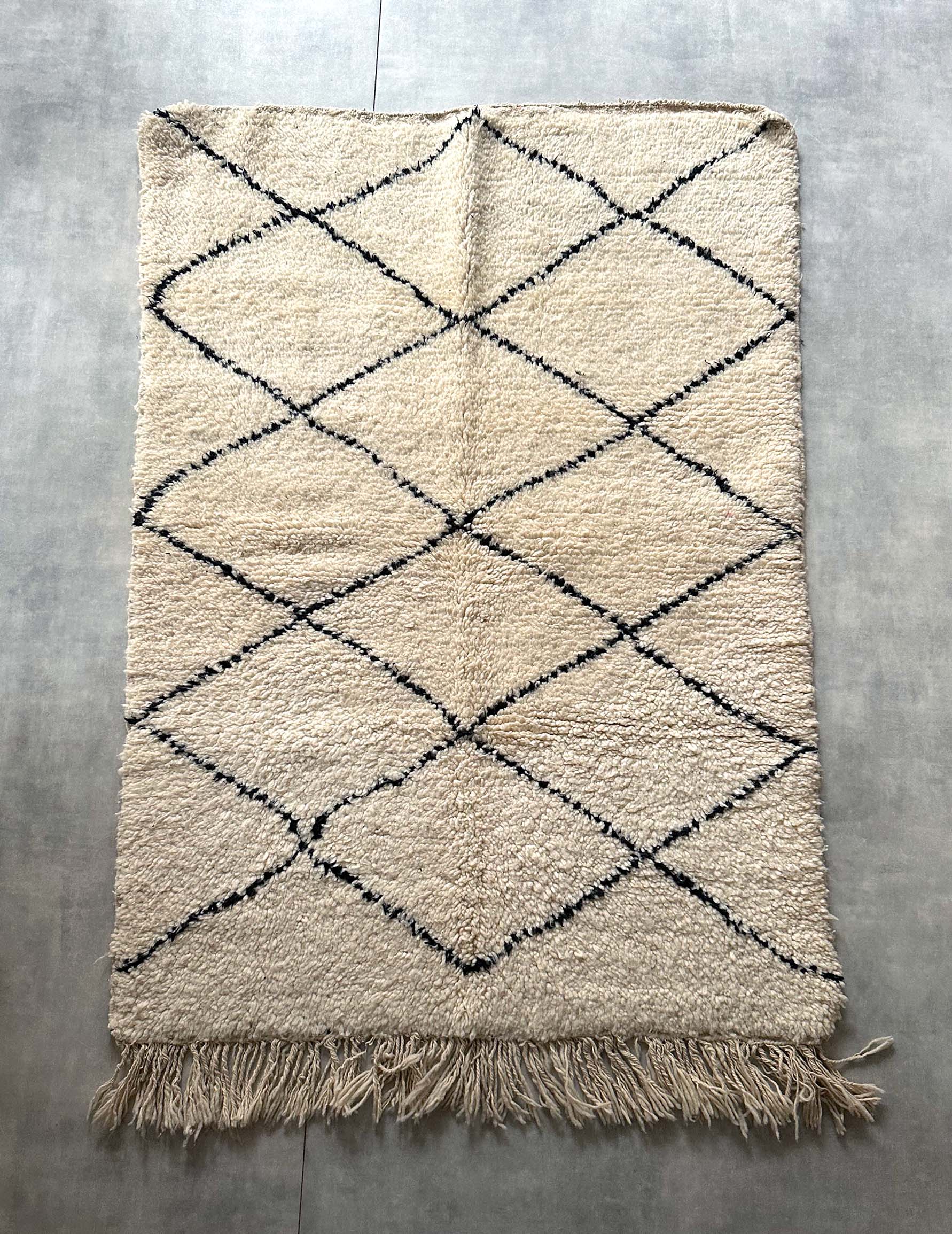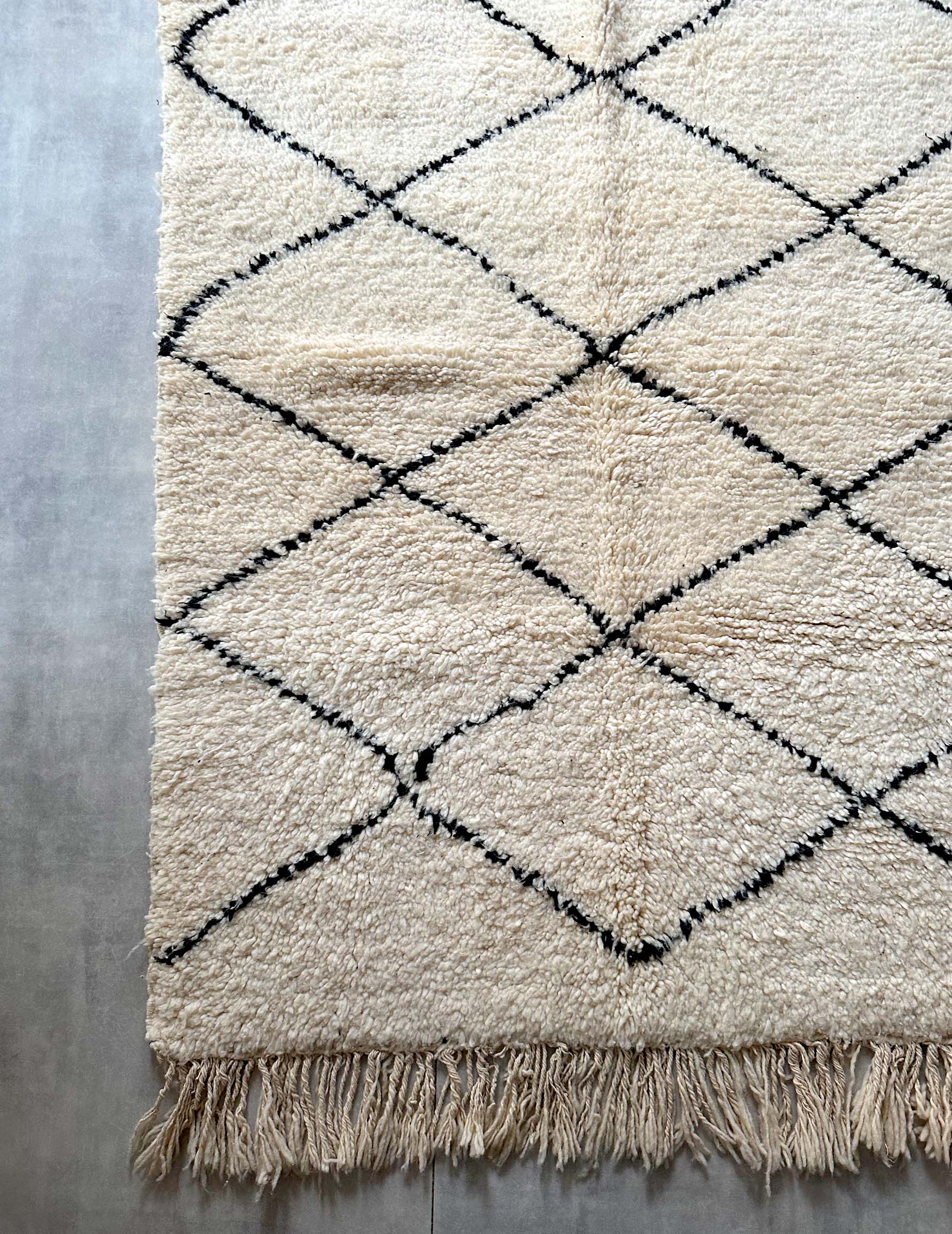 ベニワレンはモロッコのアトラス山脈に住むベルベル人女性によって、一目一目しっかりと結びながら織らているハンドメイドのウールラグです。白を基調とし黒の細いラインで模様が描かれています。触り心地はふわふわと柔らかく長い毛足が特徴です。白を基調としたシンプルなデザインとナチュラルな色合いは、コーディネートの幅も広く他のインテリアとも調和しやすいです。