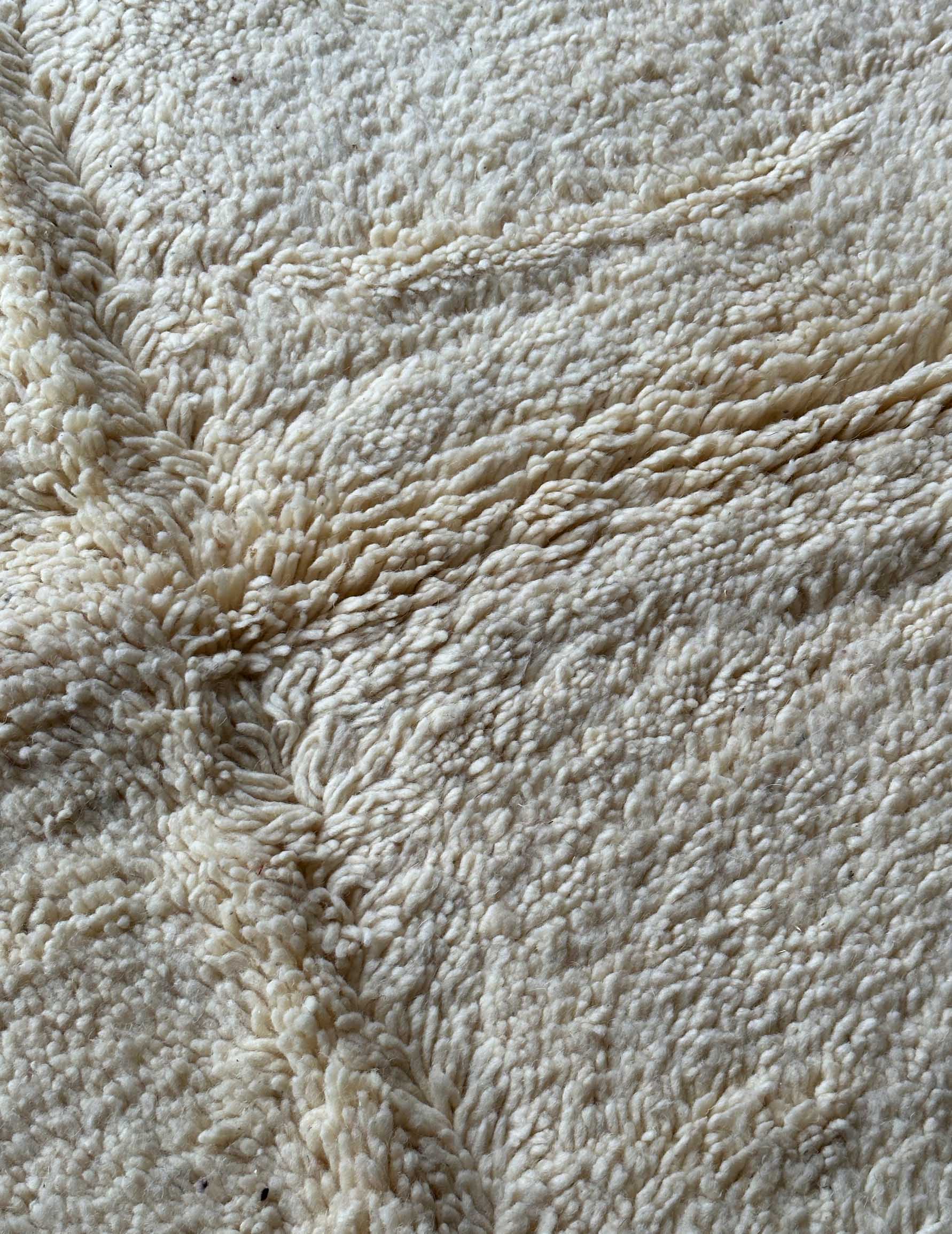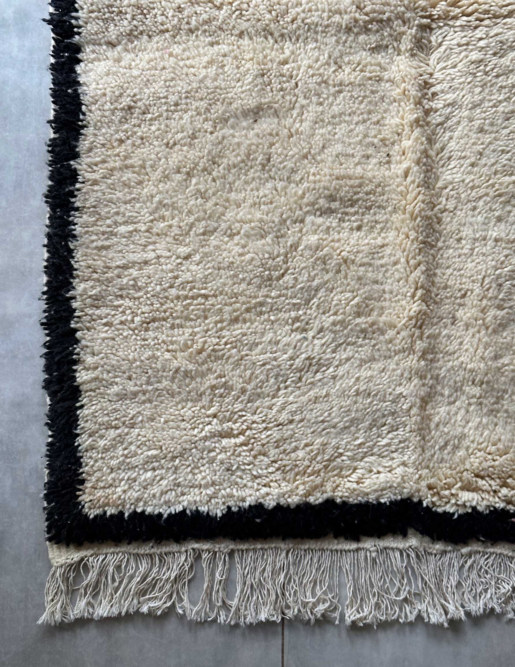 ベニワレンはモロッコのアトラス山脈に住むベルベル人女性によって、一目一目しっかりと結びながら織らているハンドメイドのウールラグです。白を基調とし黒の細いラインで模様が描かれています。触り心地はふわふわと柔らかく長い毛足が特徴です。白を基調としたシンプルなデザインとナチュラルな色合いは、コーディネートの幅も広く他のインテリアとも調和しやすいです。