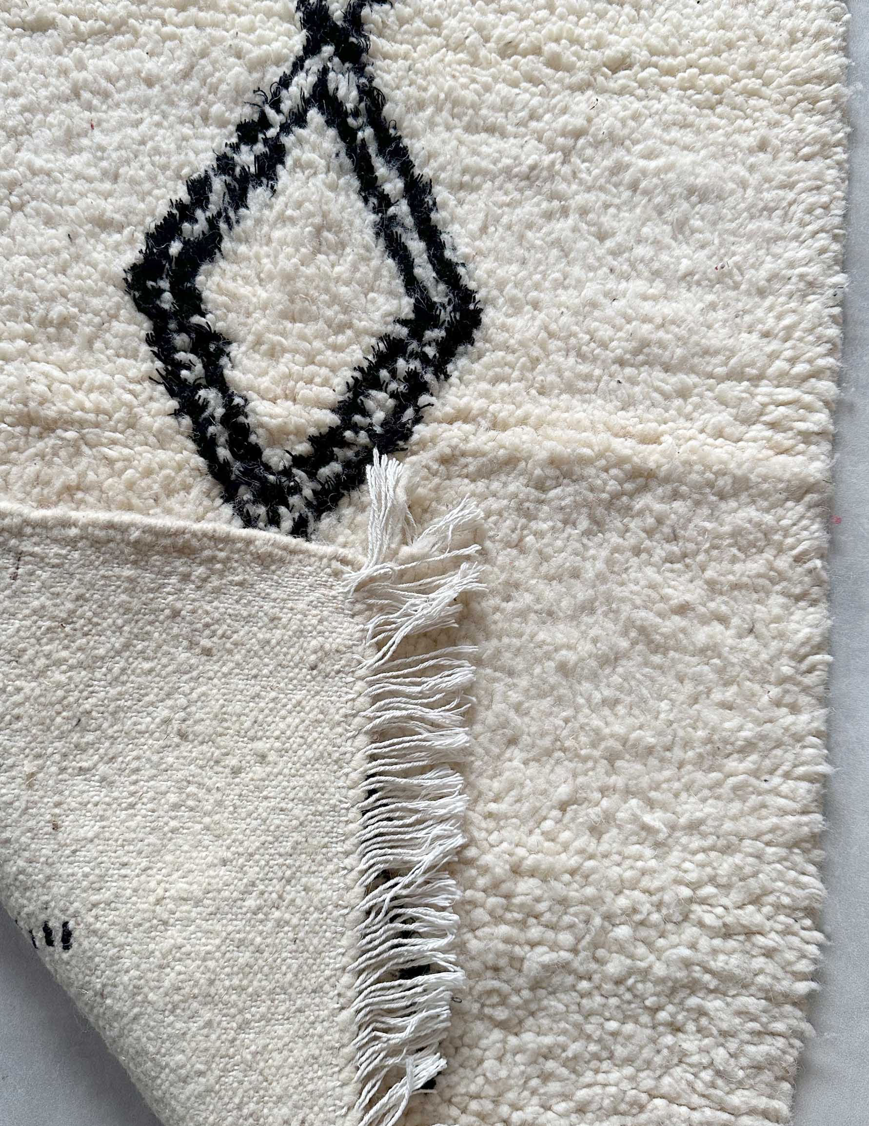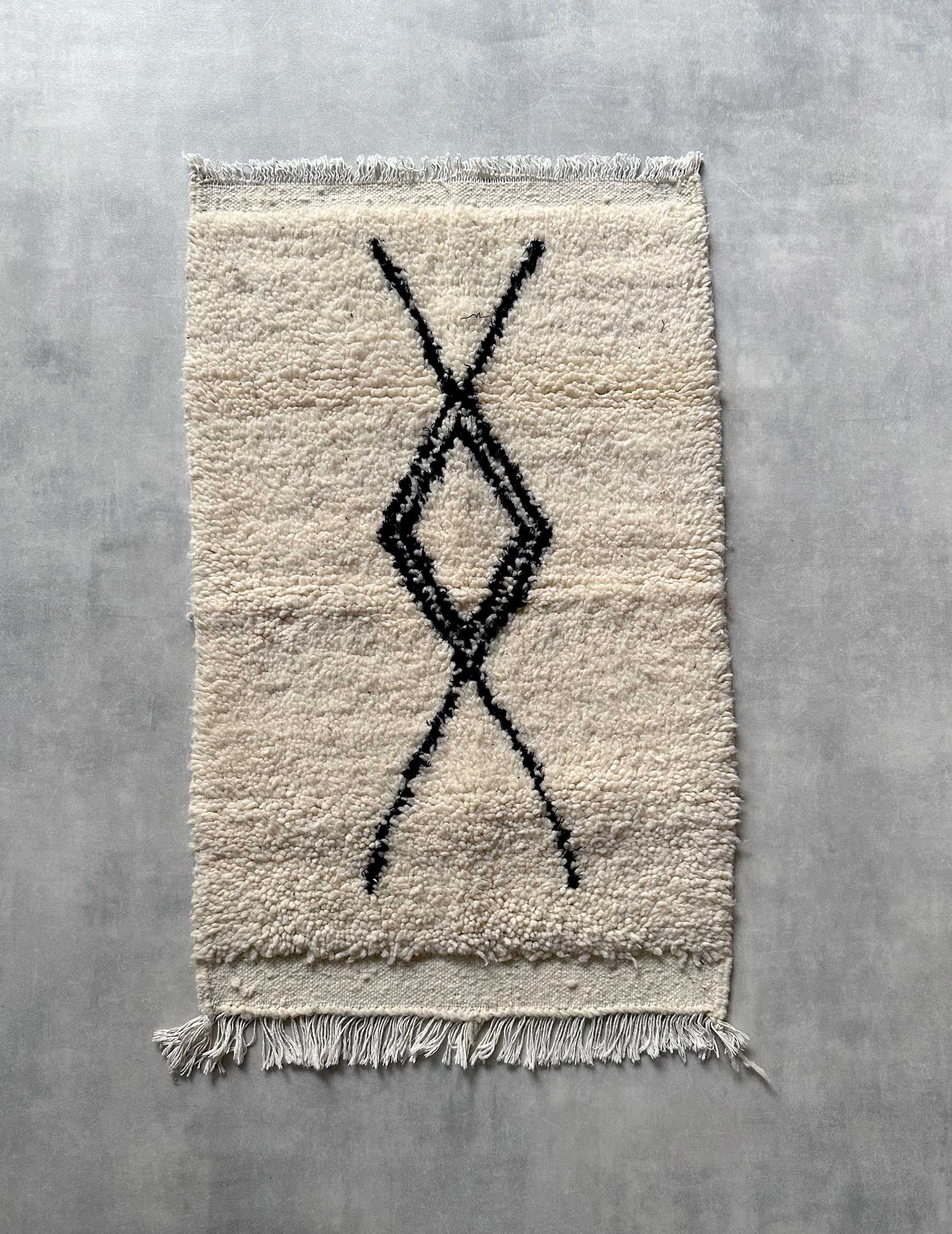 ベニワレンはモロッコのアトラス山脈に住むベルベル人女性によって、一目一目しっかりと結びながら織らているハンドメイドのウールラグです。白を基調とし黒の細いラインで模様が描かれています。触り心地はふわふわと柔らかく長い毛足が特徴です。白を基調としたシンプルなデザインとナチュラルな色合いは、コーディネートの幅も広く他のインテリアとも調和しやすいです。