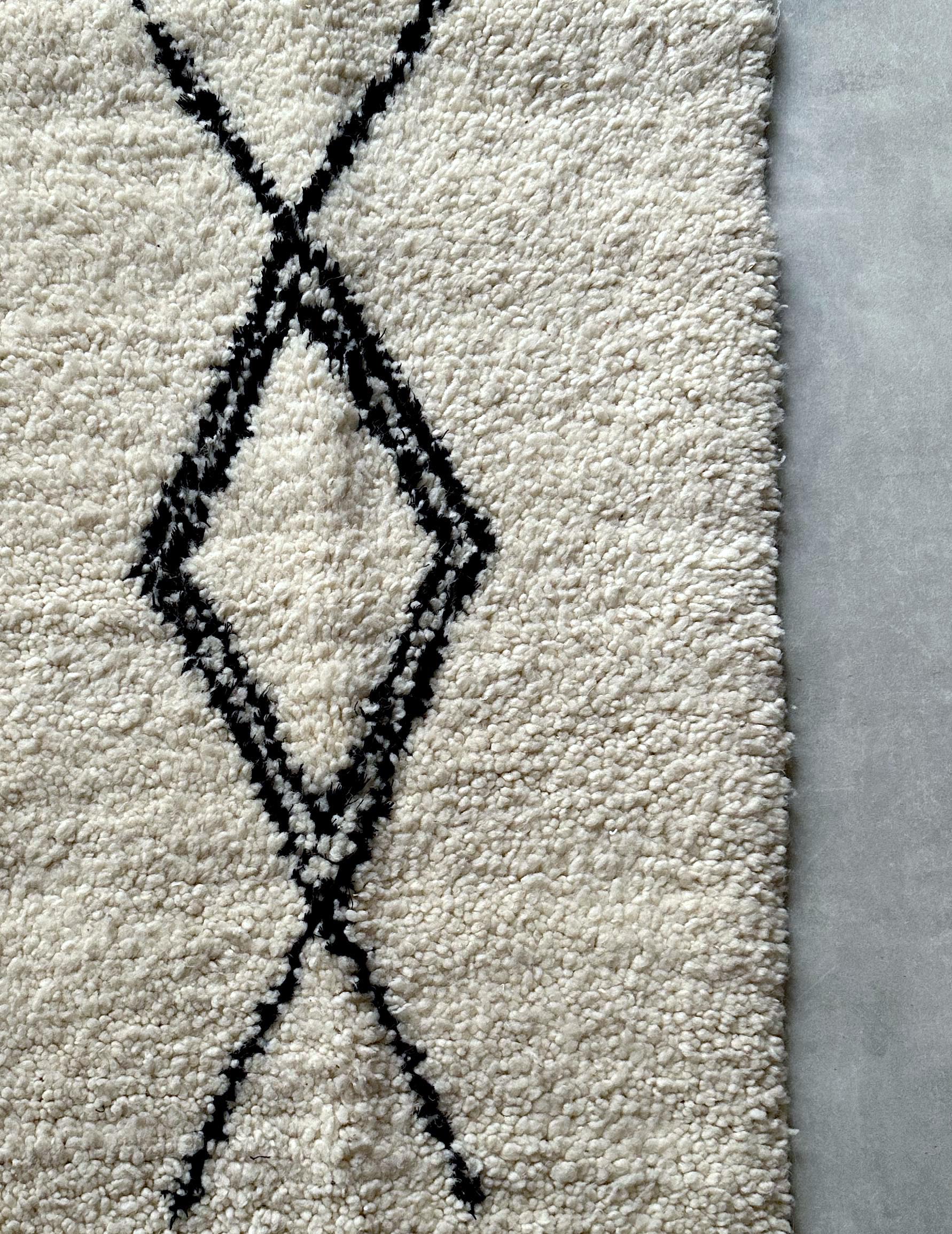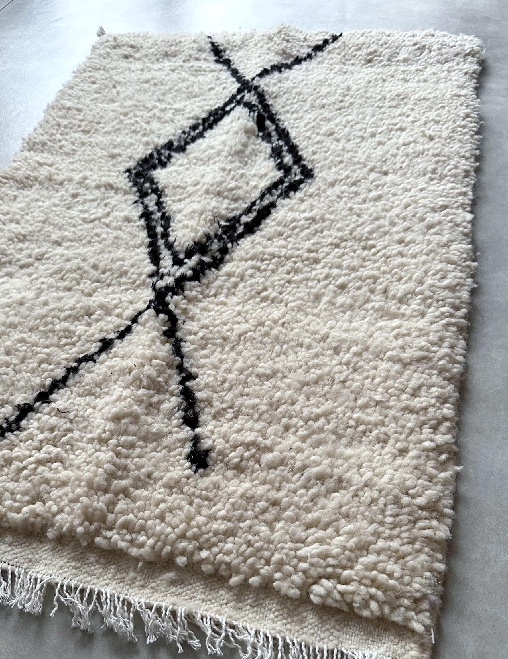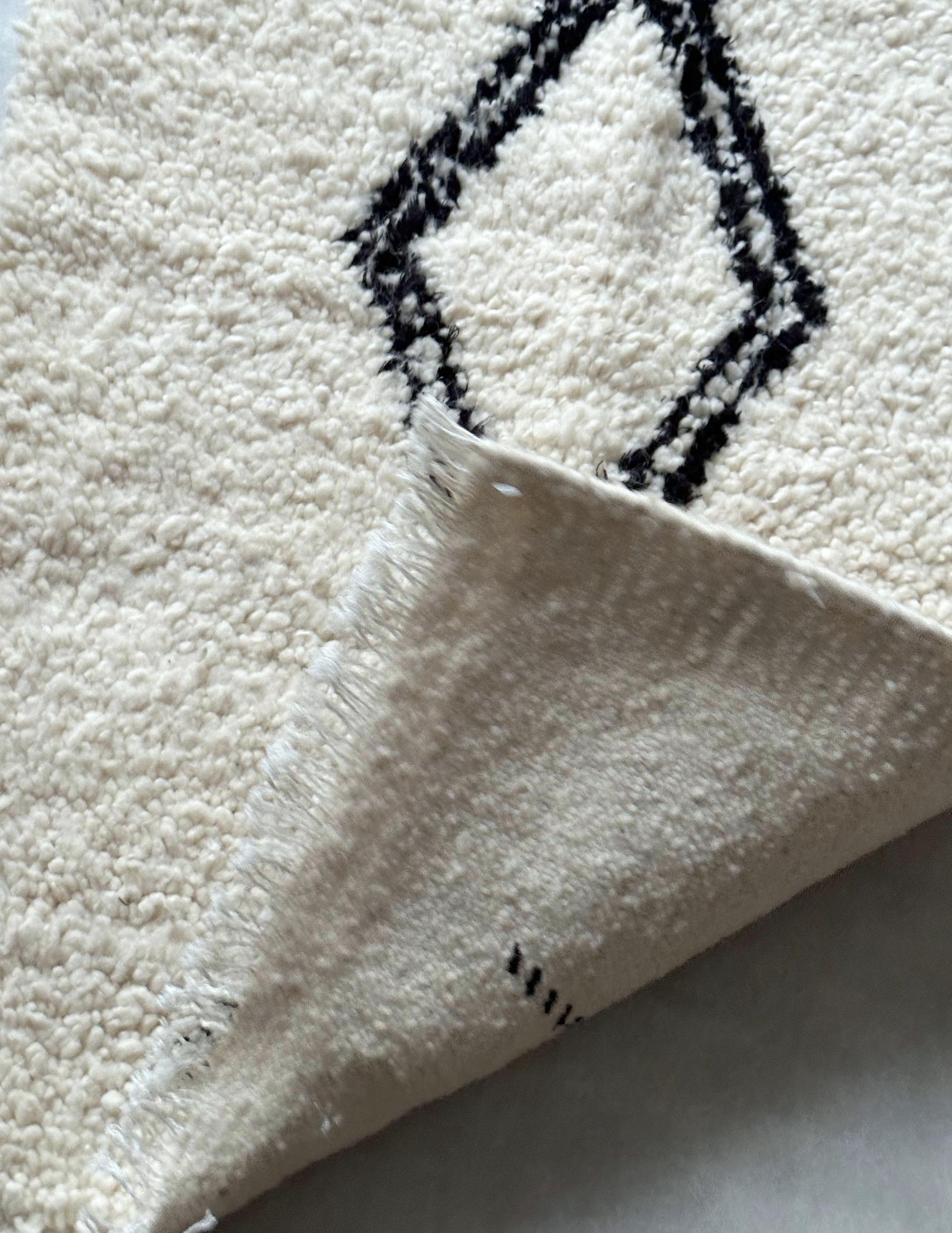 ベニワレンはモロッコのアトラス山脈に住むベルベル人女性によって、一目一目しっかりと結びながら織らているハンドメイドのウールラグです。白を基調とし黒の細いラインで模様が描かれています。触り心地はふわふわと柔らかく長い毛足が特徴です。白を基調としたシンプルなデザインとナチュラルな色合いは、コーディネートの幅も広く他のインテリアとも調和しやすいです。