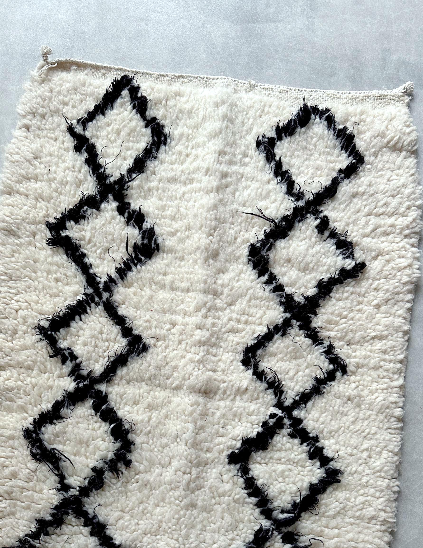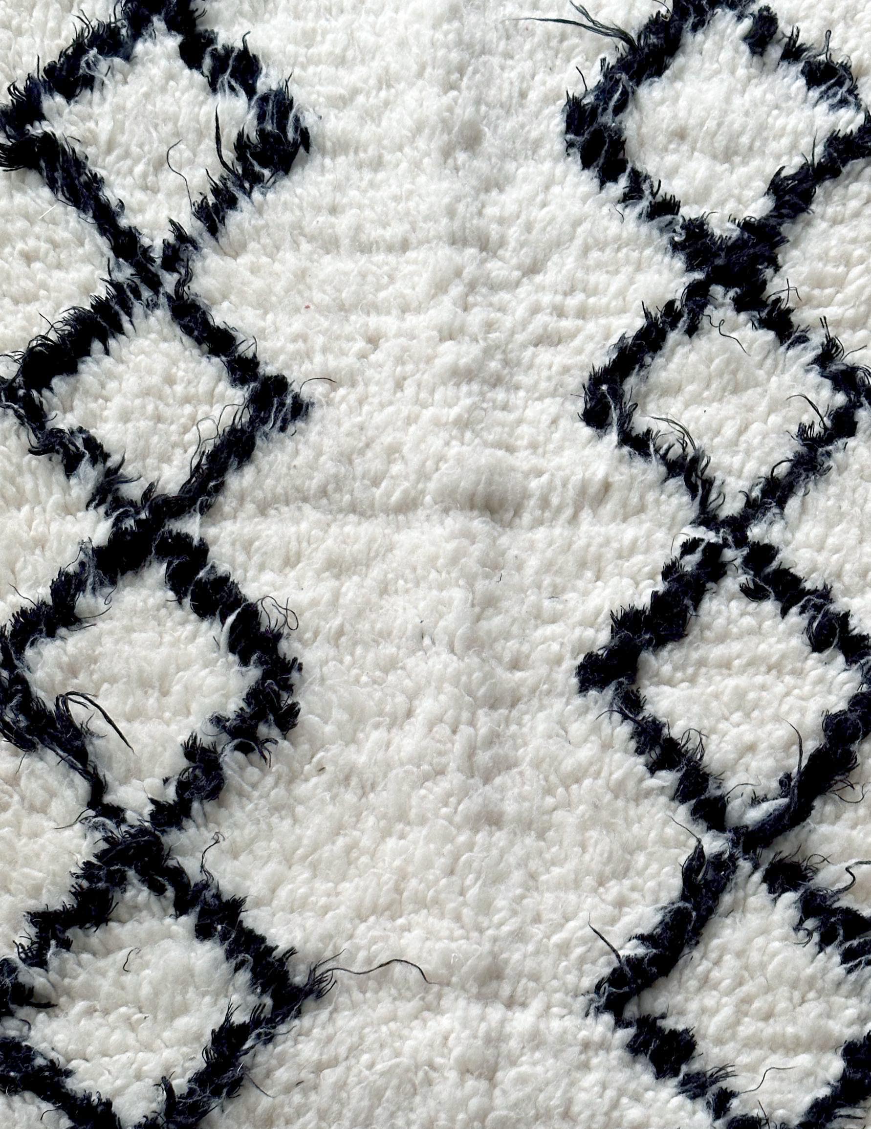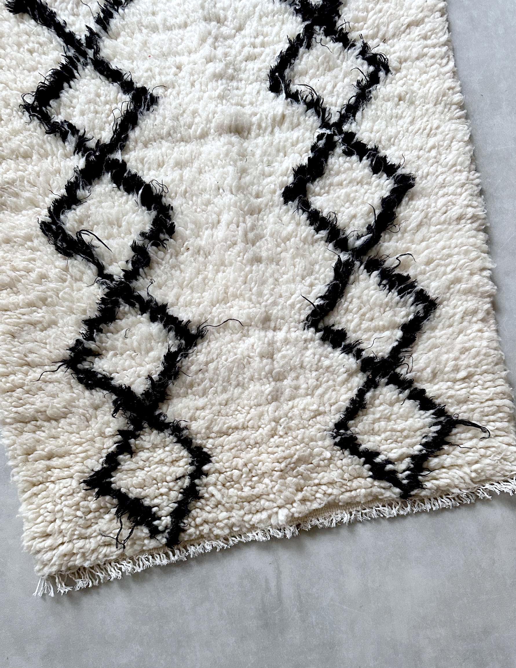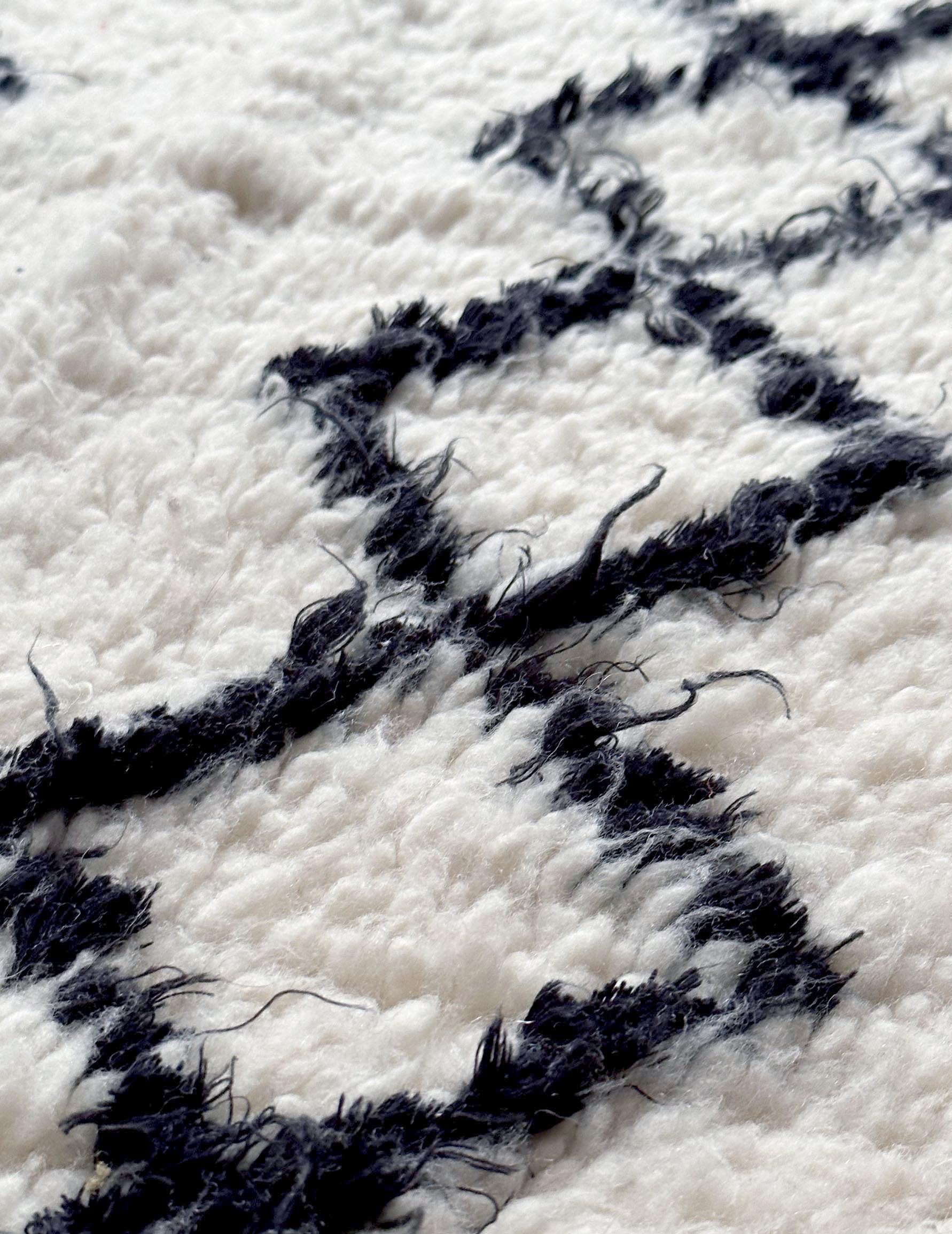 ベニワレンはモロッコのアトラス山脈に住むベルベル人女性によって、一目一目しっかりと結びながら織らているハンドメイドのウールラグです。白を基調とし黒の細いラインで模様が描かれています。触り心地はふわふわと柔らかく長い毛足が特徴です。白を基調としたシンプルなデザインとナチュラルな色合いは、コーディネートの幅も広く他のインテリアとも調和しやすいです。