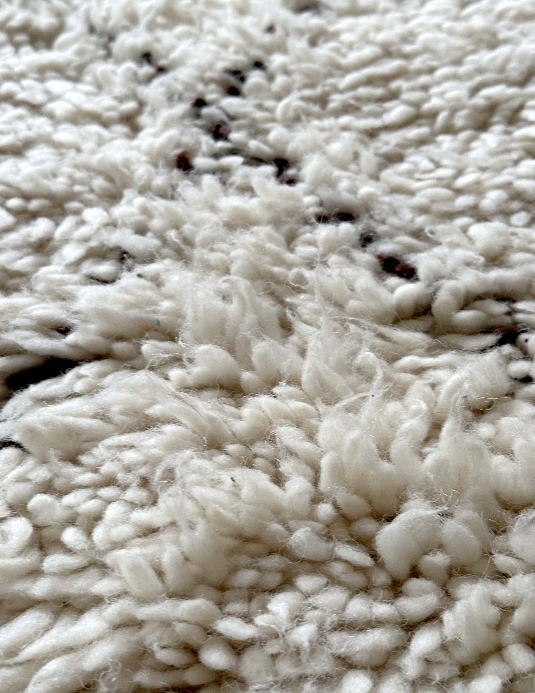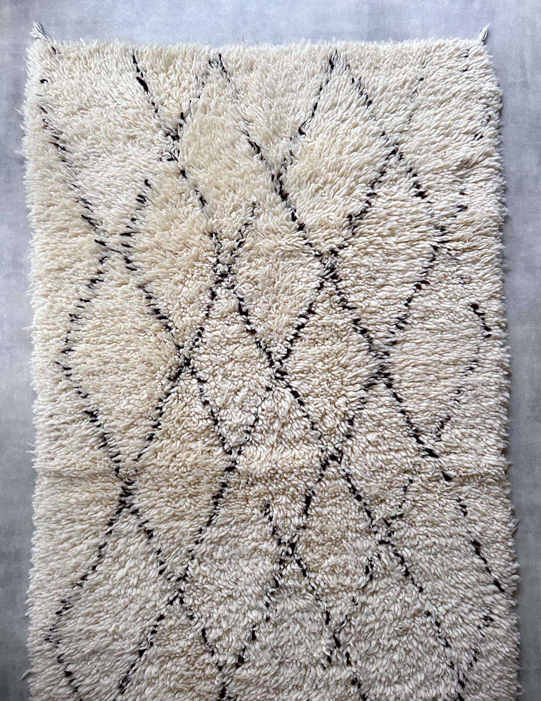 ベニワレンはモロッコのアトラス山脈に住むベルベル人女性によって、一目一目しっかりと結びながら織らているハンドメイドのウールラグです。白を基調とし黒の細いラインで模様が描かれています。触り心地はふわふわと柔らかく長い毛足が特徴です。白を基調としたシンプルなデザインとナチュラルな色合いは、コーディネートの幅も広く他のインテリアとも調和しやすいです。